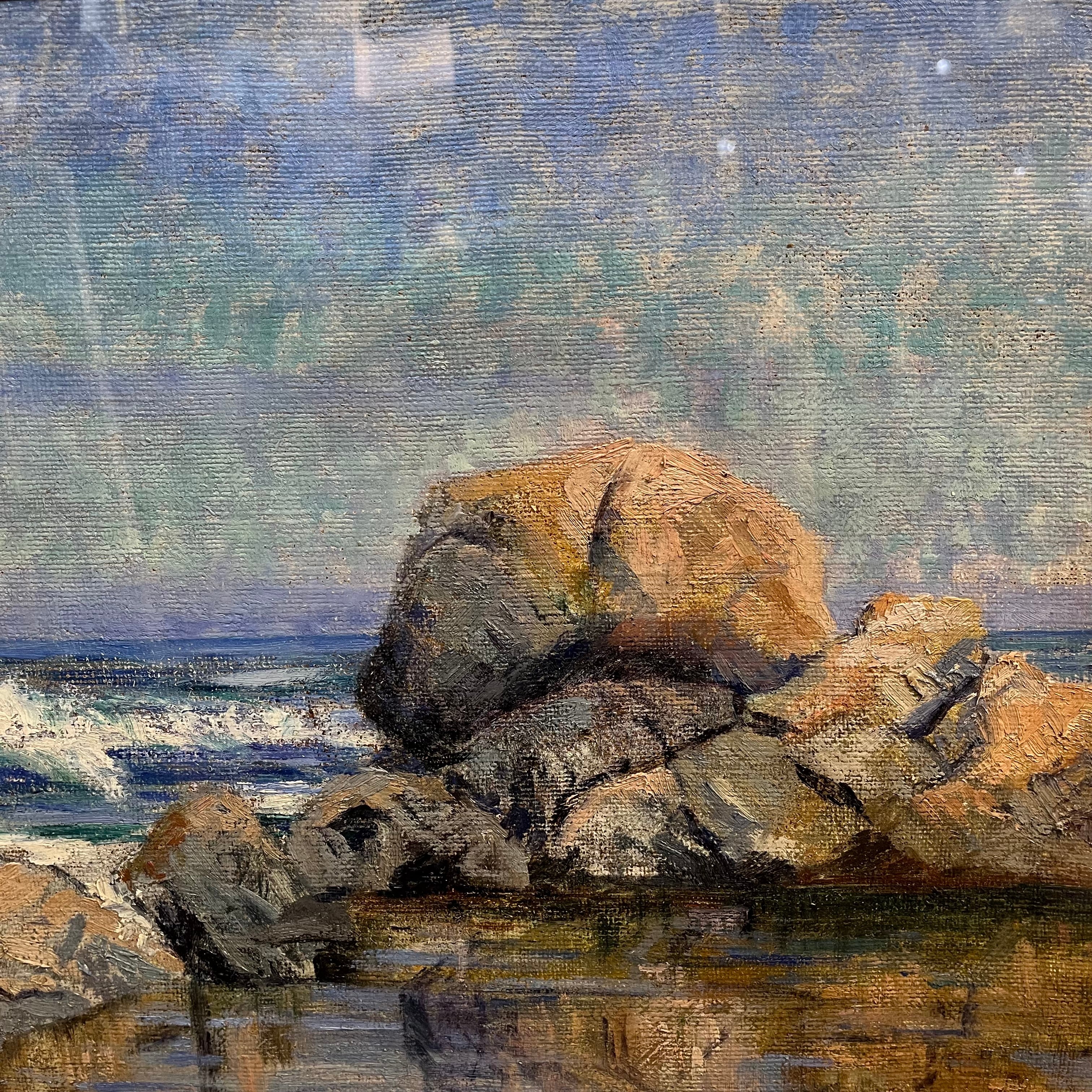 Conmovedora pintura de la artista chilena Humberta Zorrilla (1880-1954) de una costa rocosa. En su pintura podemos destacar la pincelada gruesa característica y empaste. Una gran variedad de tonos azules, propios de la fusión natural del cielo y el mar, acompañado de roqueríos clásicos del territorio nacional. La pintura entrega una textura especial al ser realizada sobre arpillera la que añade más belleza a la escena. La pintora no dejó nada de lado preocupándose incluso del reflejo de las rocas en el agua que tienen frente a ella. El cuadro viene en un precioso marco de madera dorado con tallado de hojas y flores.