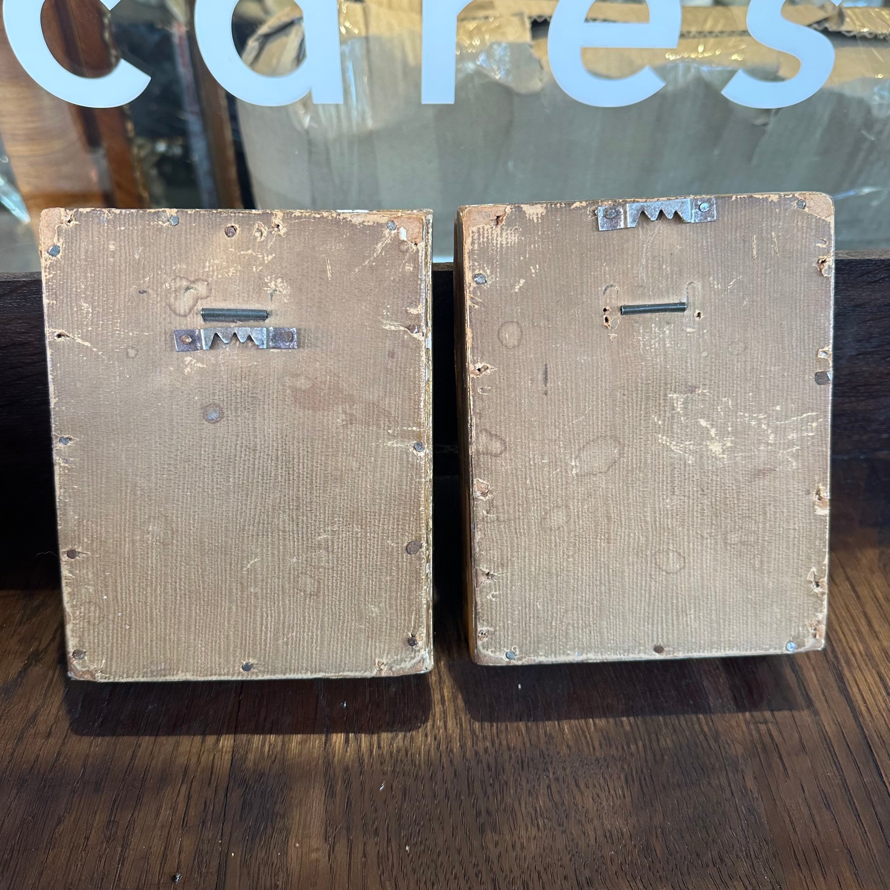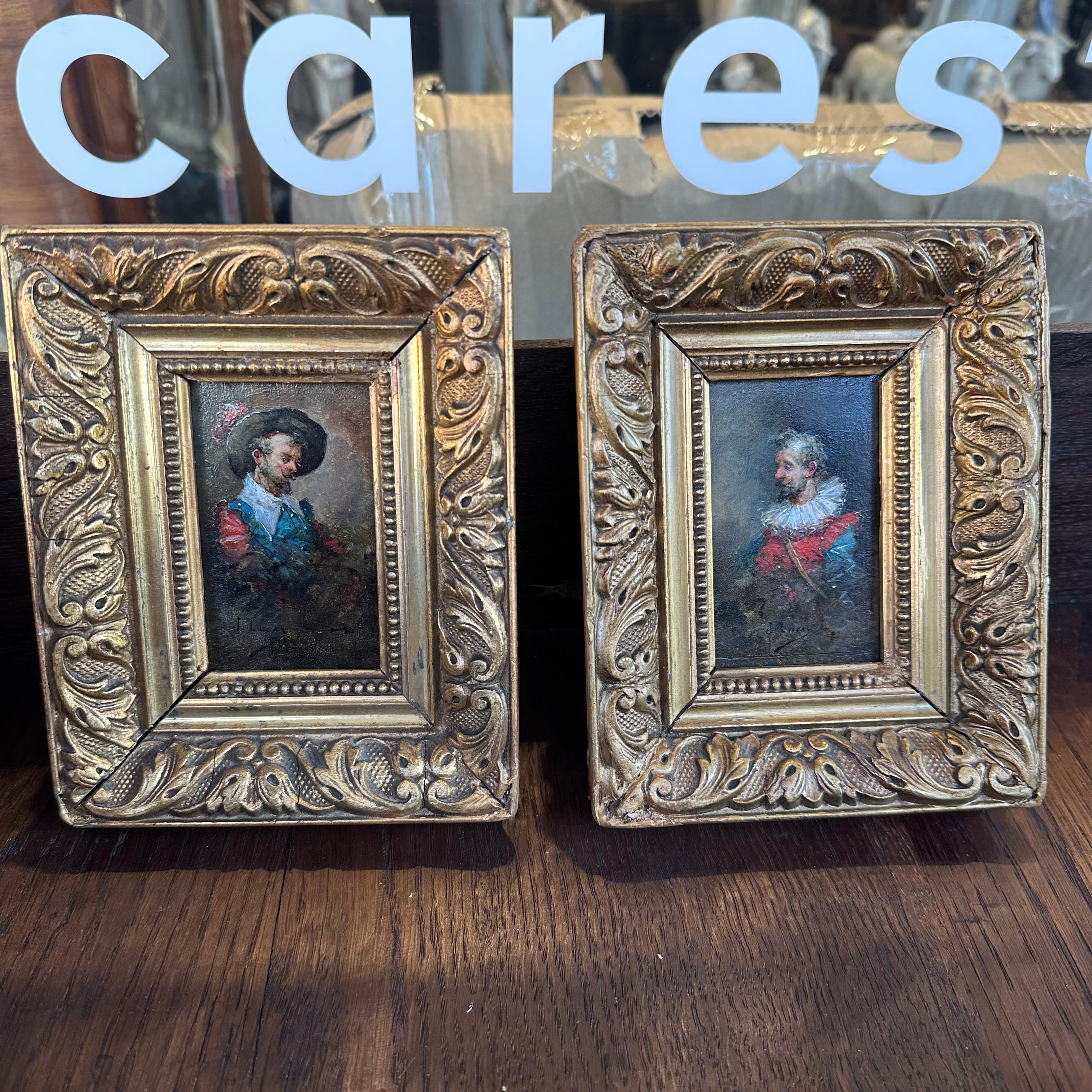 Deux huiles sur bois européennes de petit format, signées J. Lucas, représentant chacune un chevalier médiéval en détail, avec une subtile lumière et des ombres. Chaque œuvre est présentée dans un magnifique cadre en bois sculpté en relief et peint d'une élégante dorure.