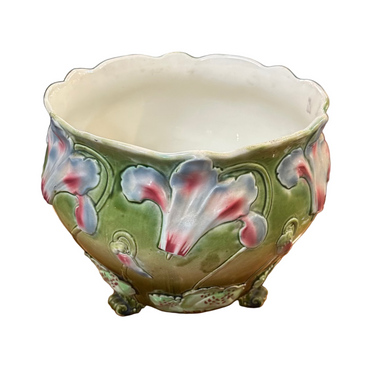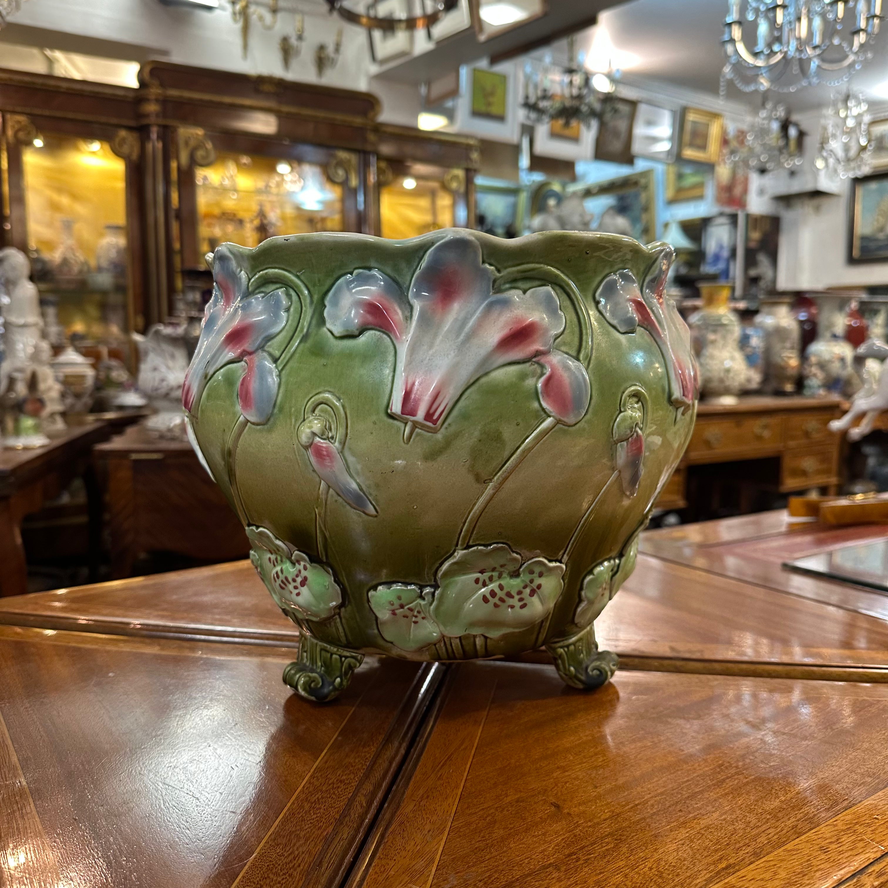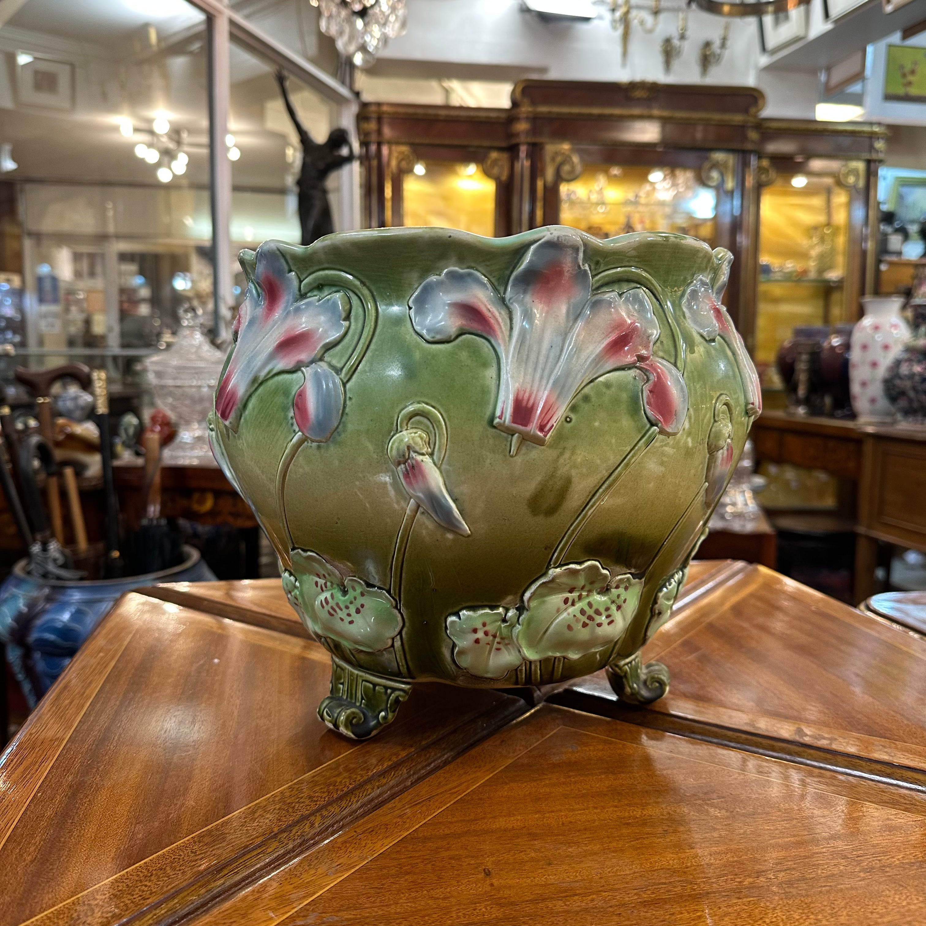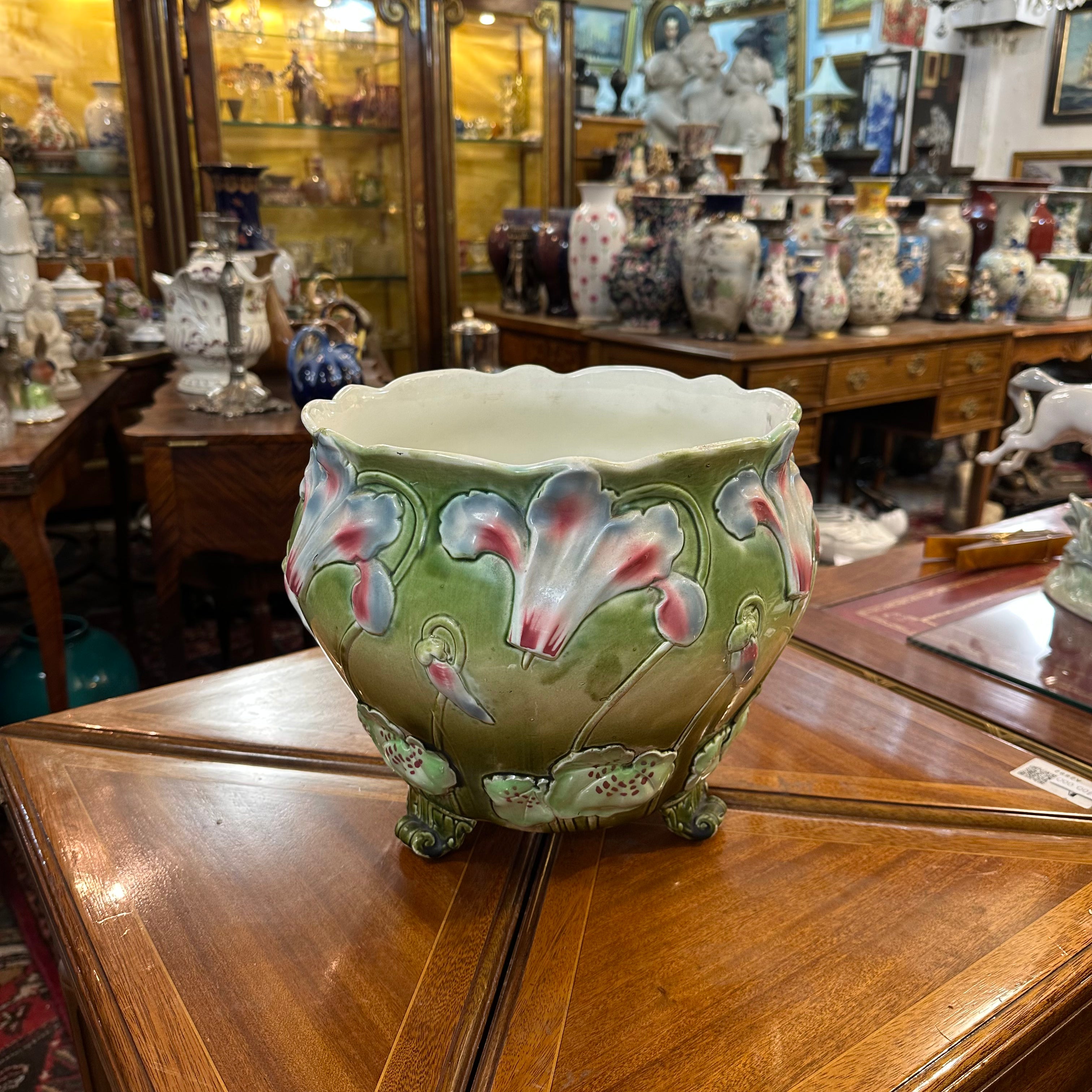 Magnifique cache-pot en majolique de porcelaine française, orné d'un délicat motif floral aux tons lavande, rose et turquoise, rehaussé de touches de rouge, sur fond vert. Ce vase présente des motifs en relief, donnant du volume aux fleurs, et trois pieds décorés à la finition incurvée. L'intérieur est blanc.