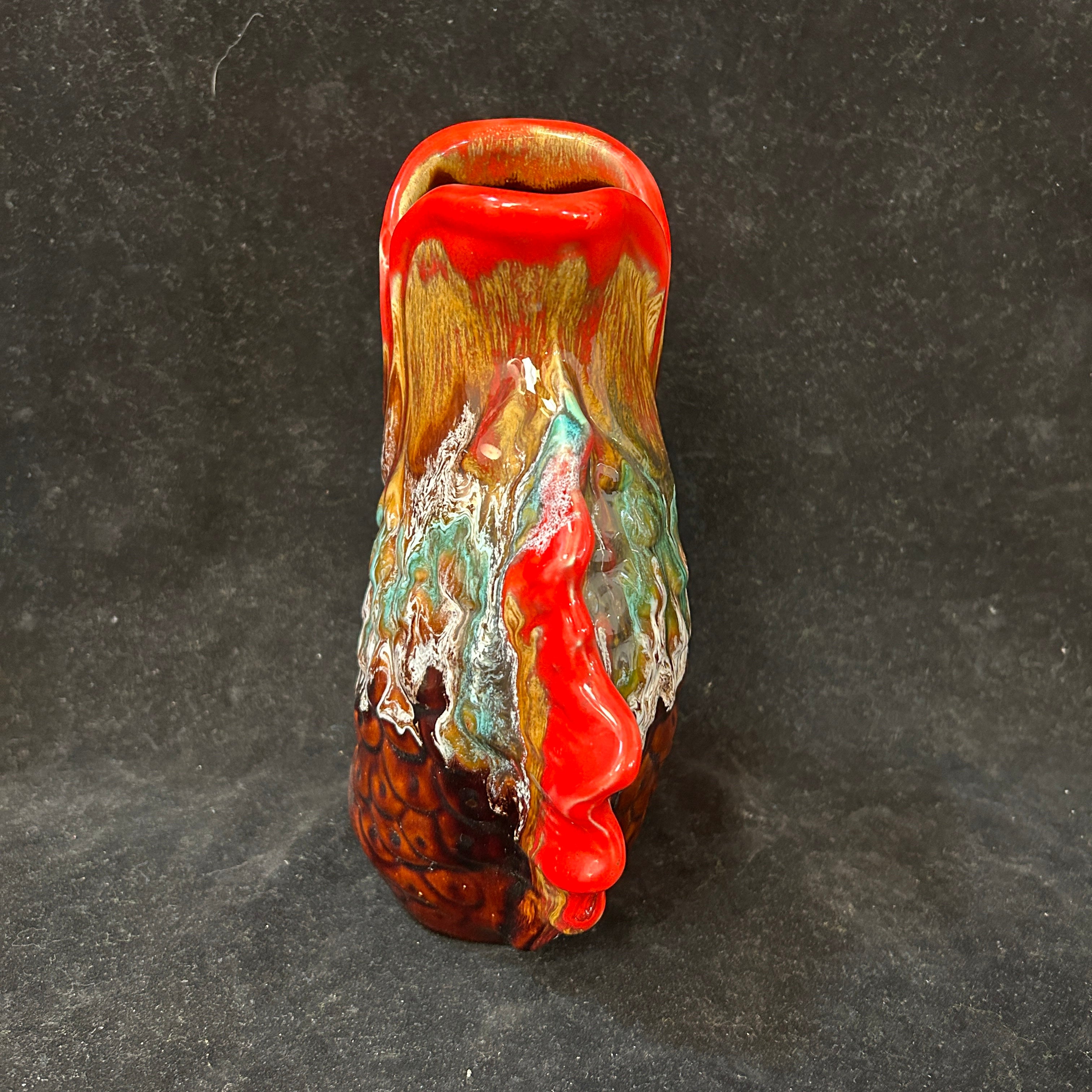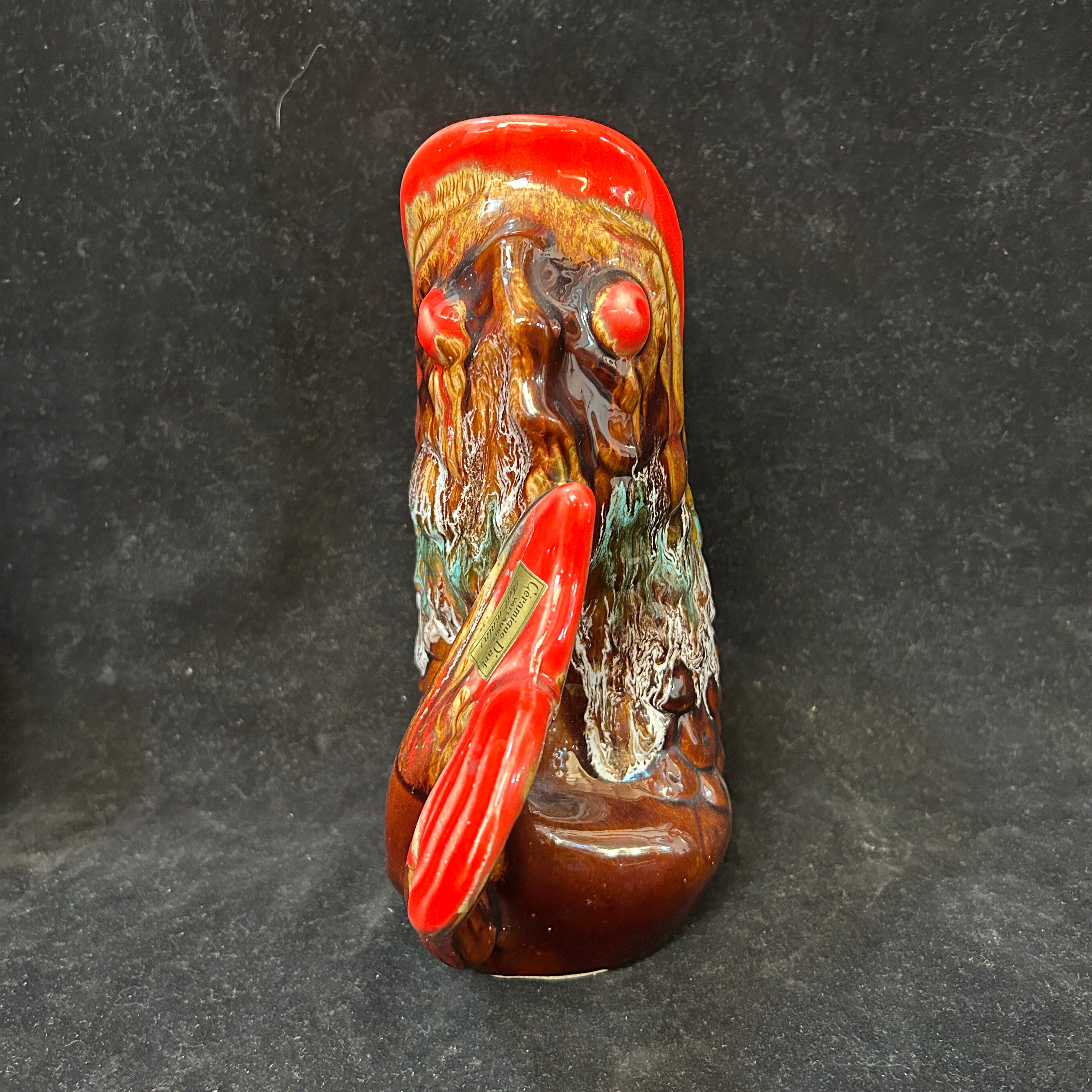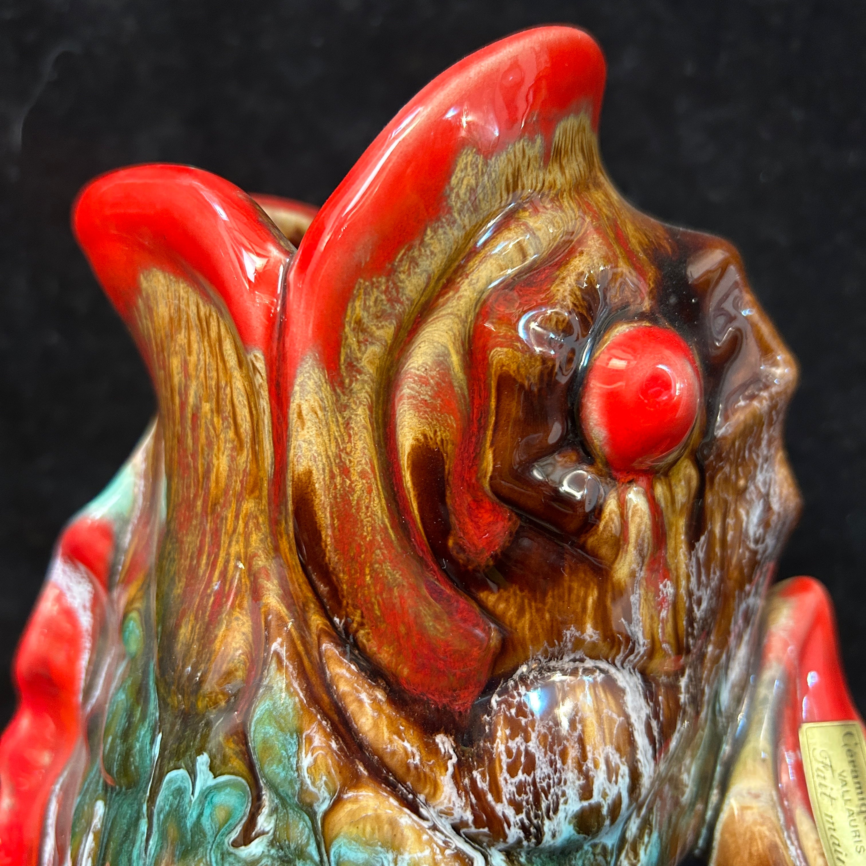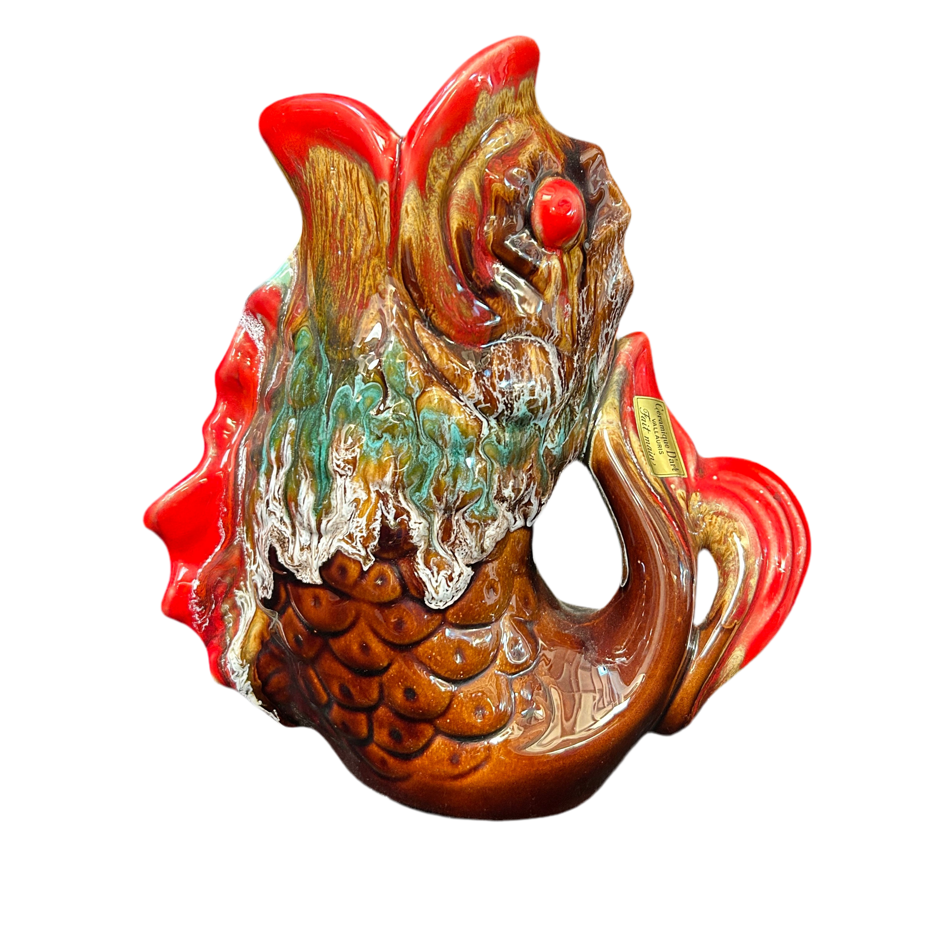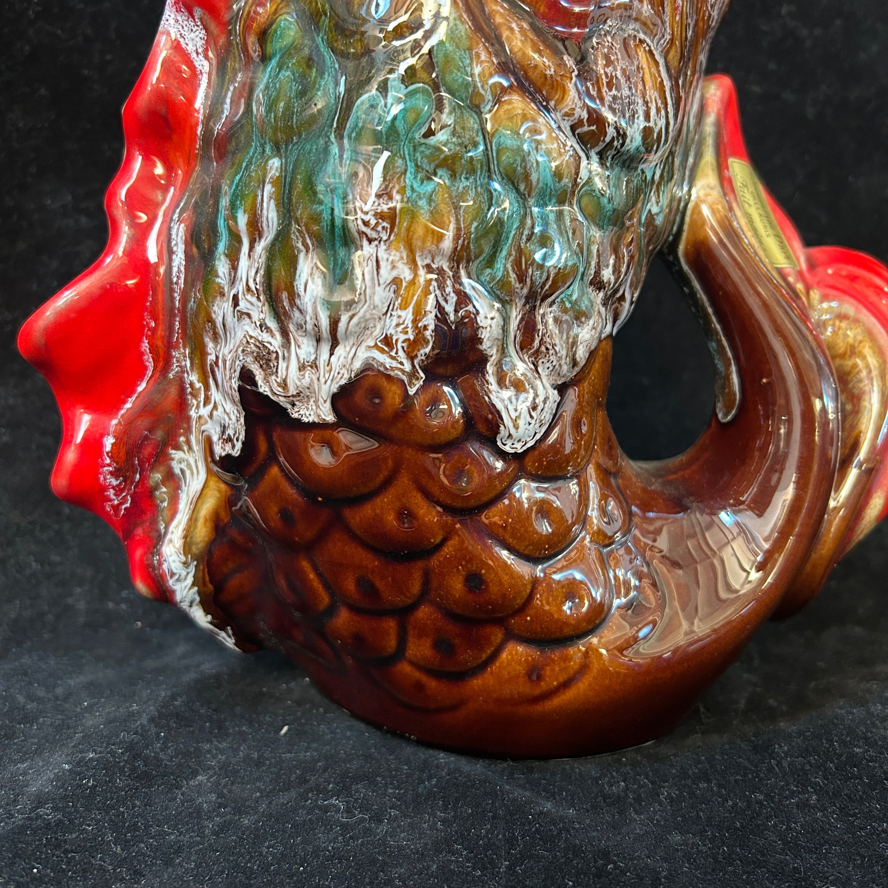 Llamativa jarra de porcelana mayólica francesa de Vallauris con forma de pez. Destacan en ella los tonos rojos y la imponente forma de un pez con su boca abierta.