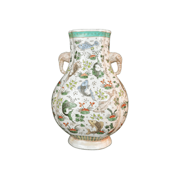 Magnifique vase japonais des années 60-70, finement décoré d'un délicat motif marin. La pièce présente une composition harmonieuse de poissons dans des tons bleus et verts, accompagnés de plantes aquatiques qui ajoutent de la profondeur et du mouvement au design.