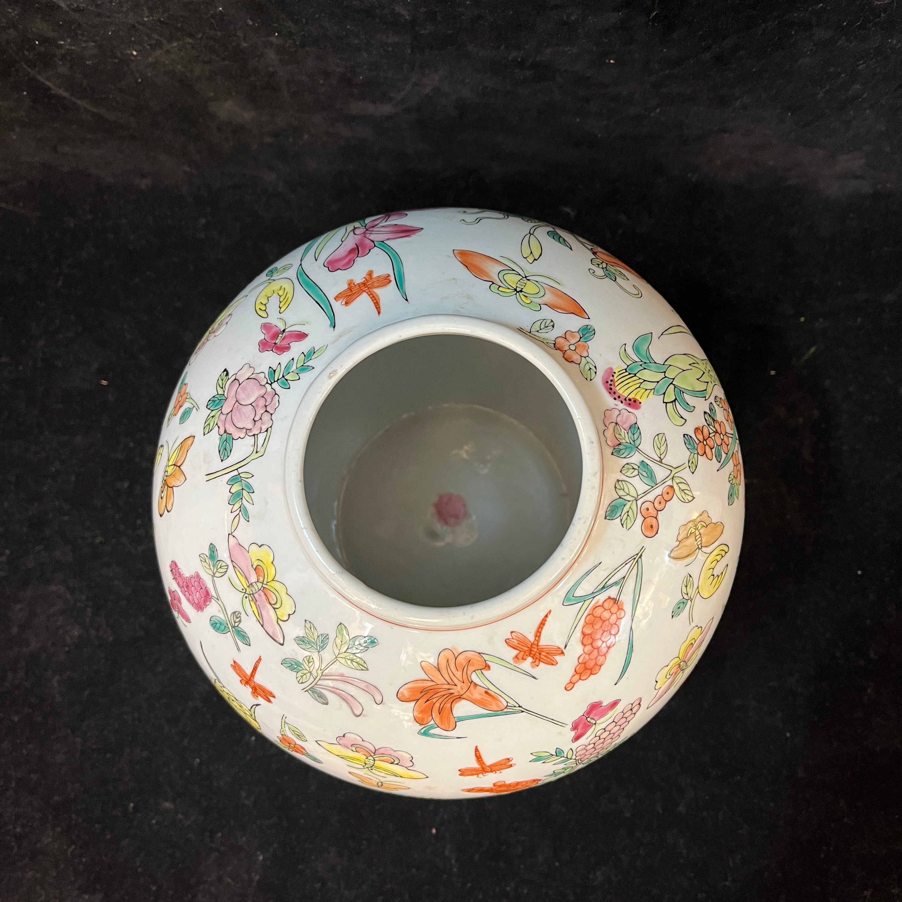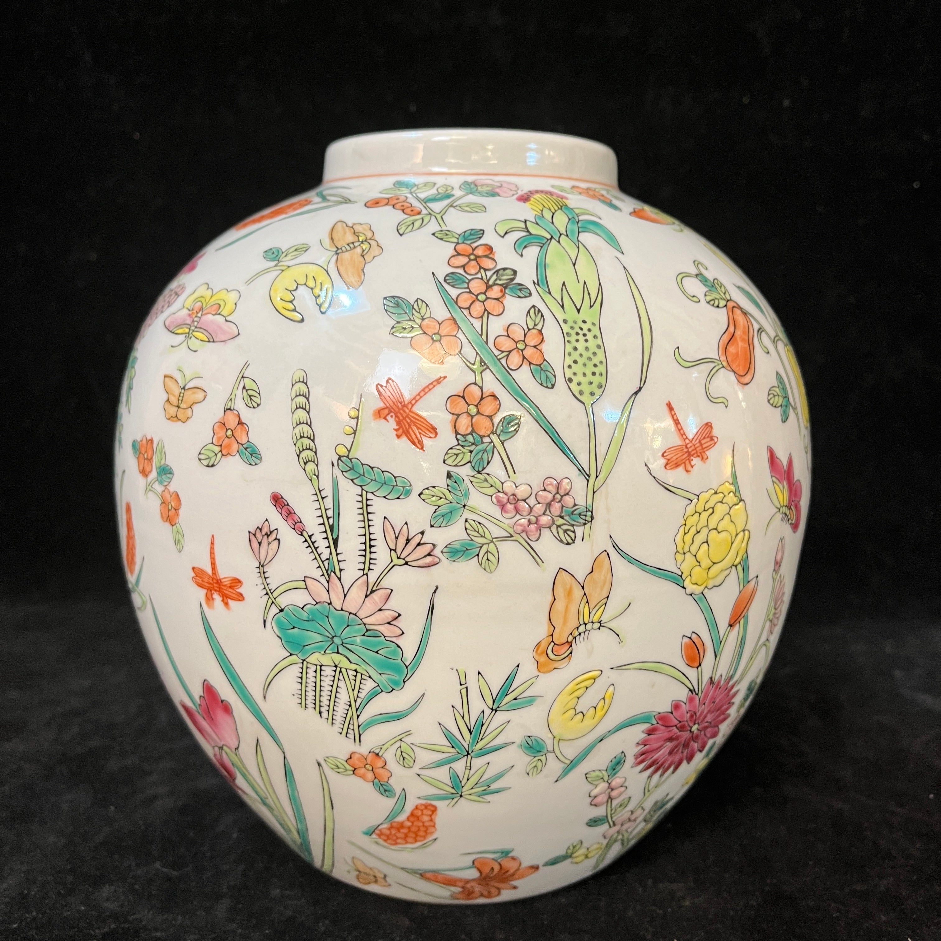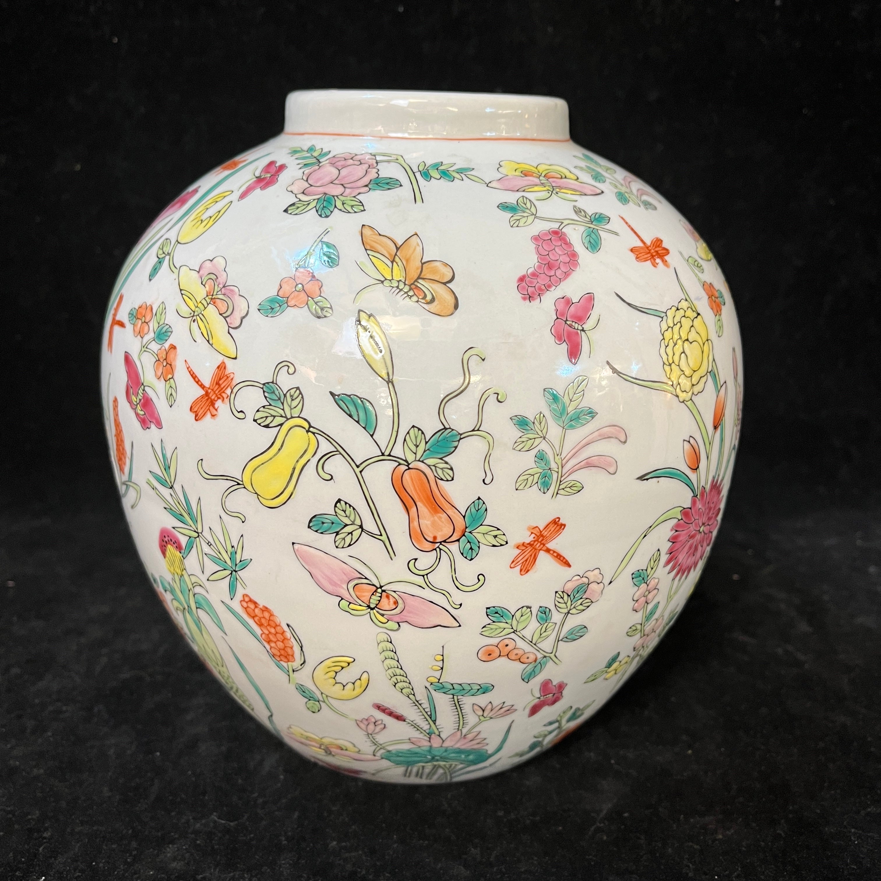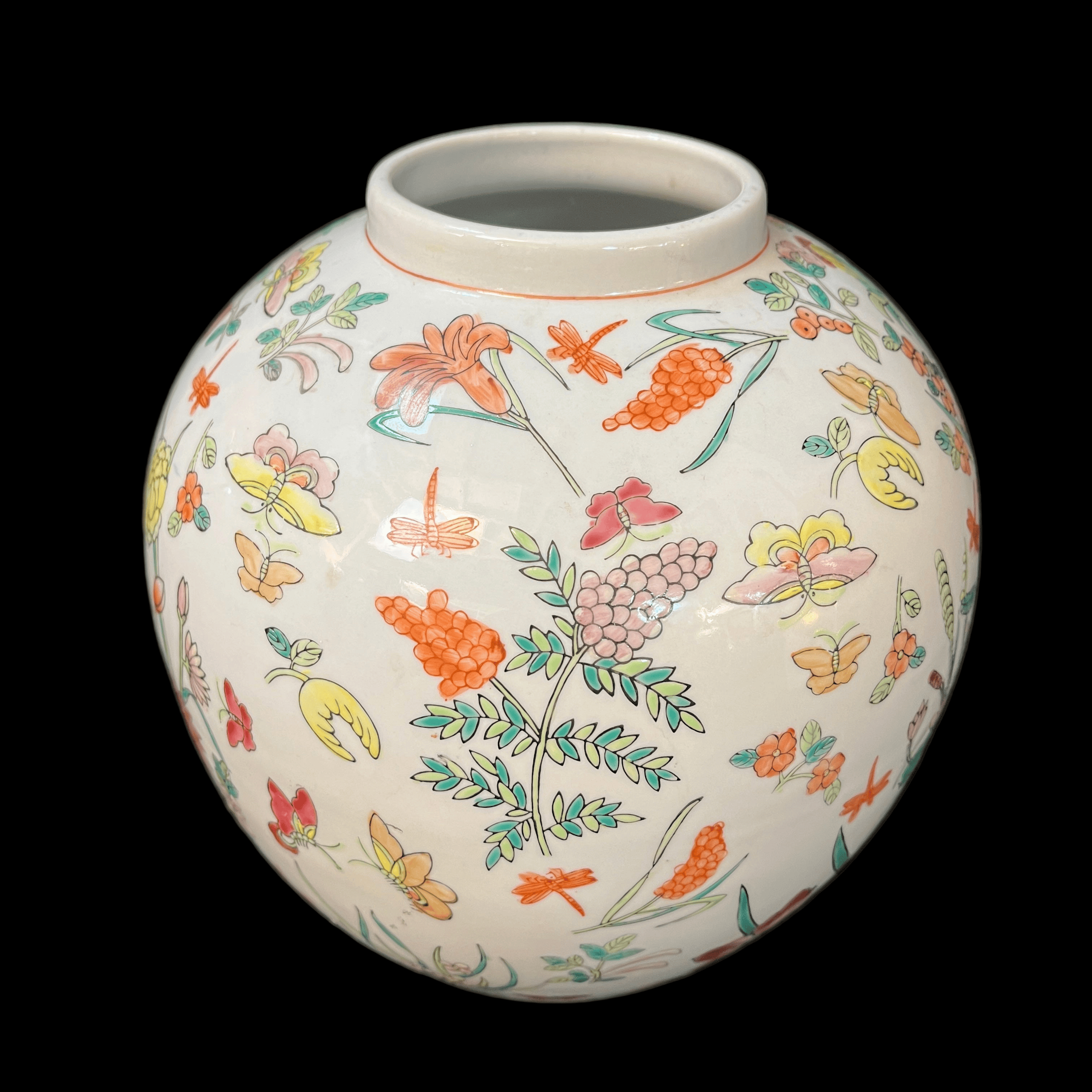 Magnifique vase en porcelaine chinoise au motif représentant un petit monde composé de buissons, de fleurs, d'insectes et de feuilles.