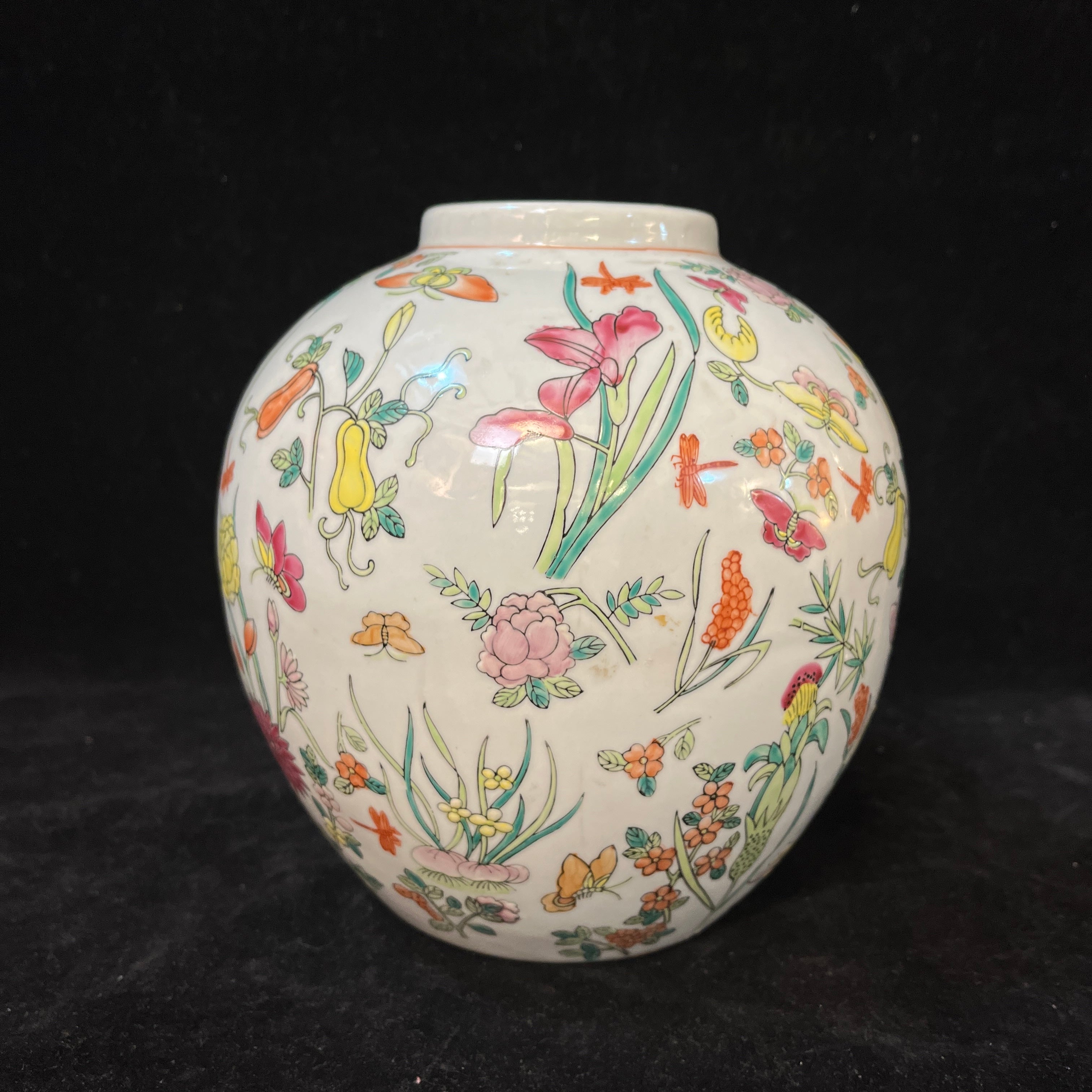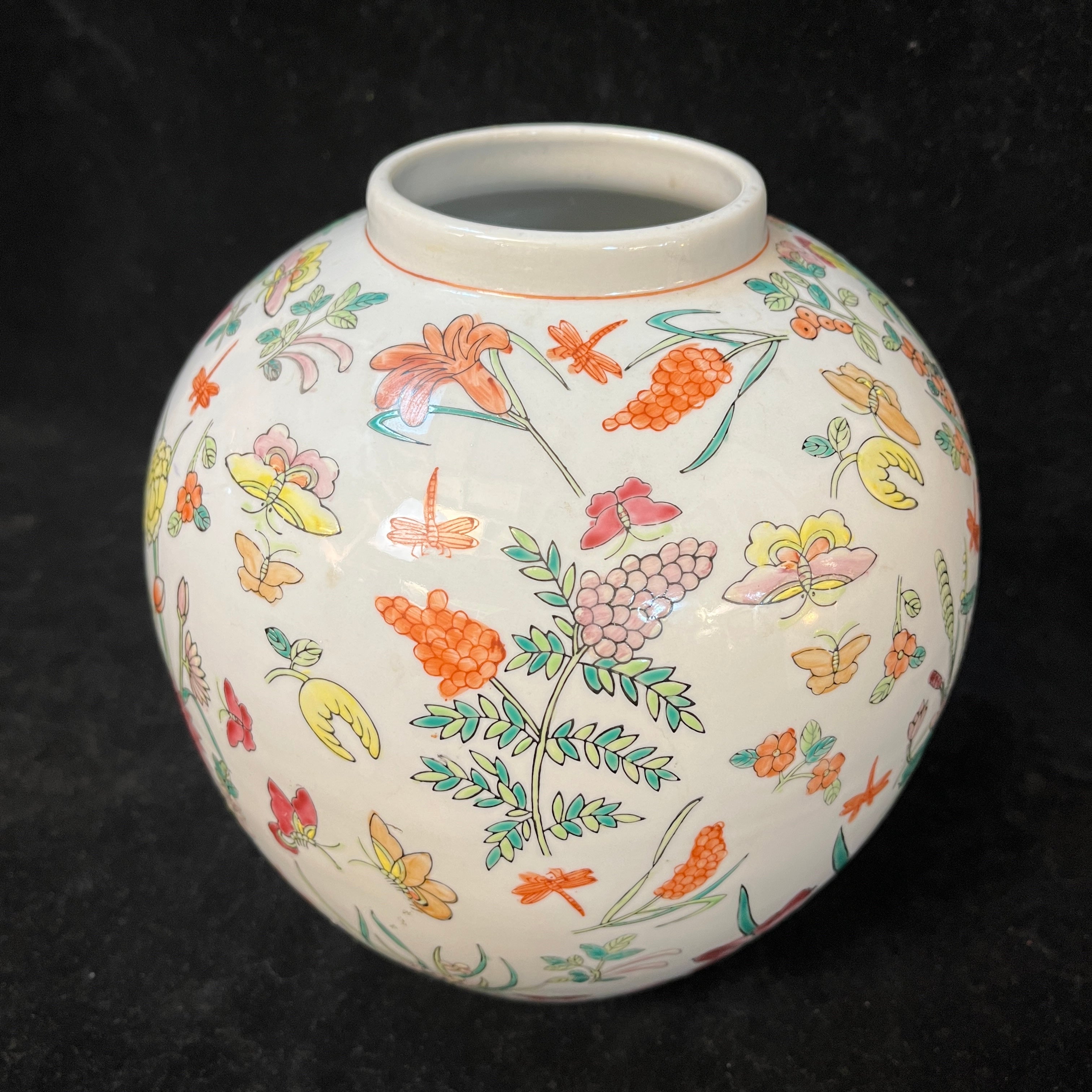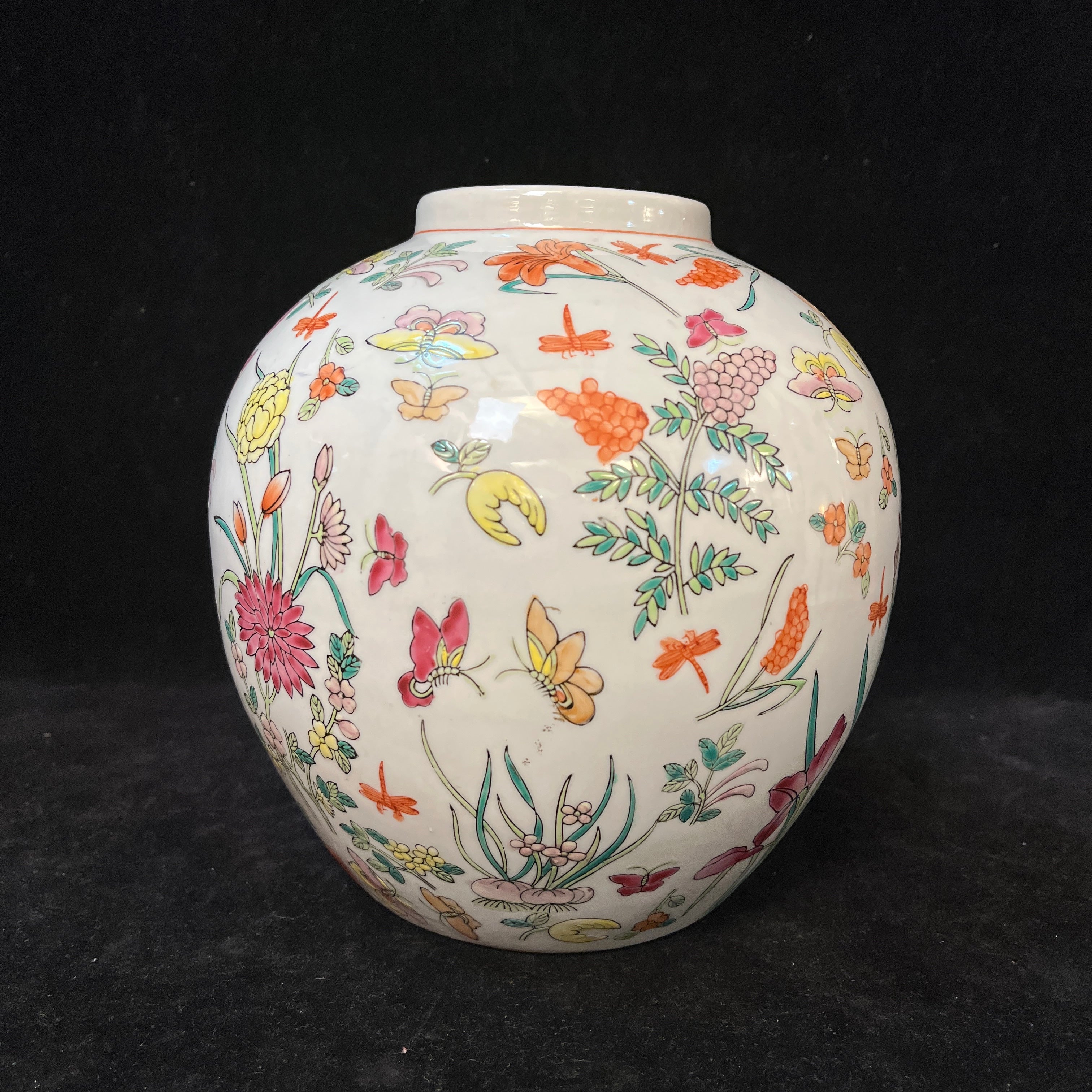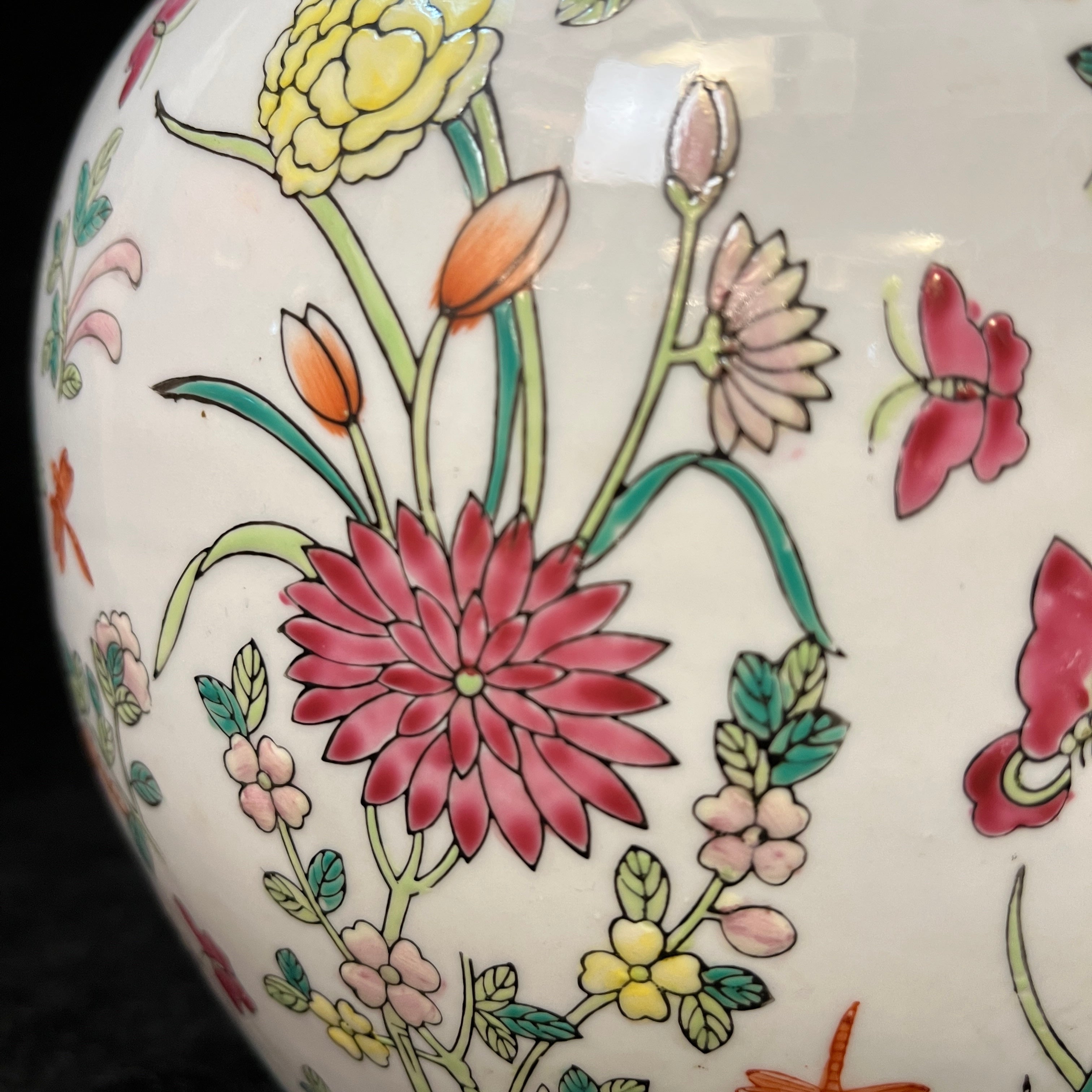 Magnifique vase en porcelaine chinoise au motif représentant un petit monde composé de buissons, de fleurs, d'insectes et de feuilles.