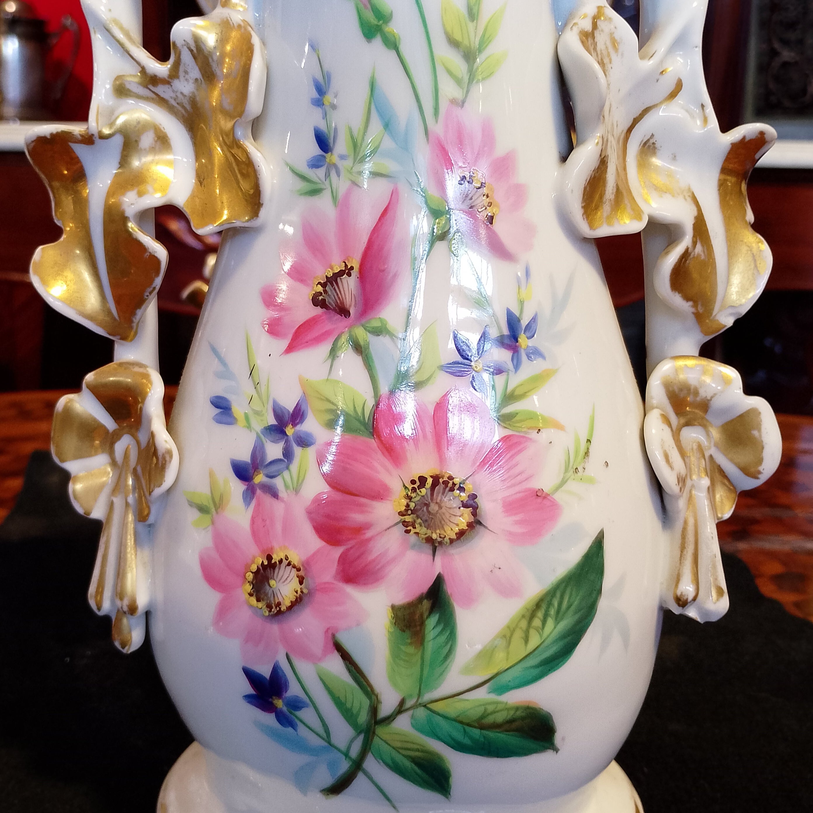 Magnifique vase élisabéthain Vieux Paris peint à la main avec un motif floral dominé par des couleurs vives et de l'or, apportant luminosité et élégance à votre intérieur.