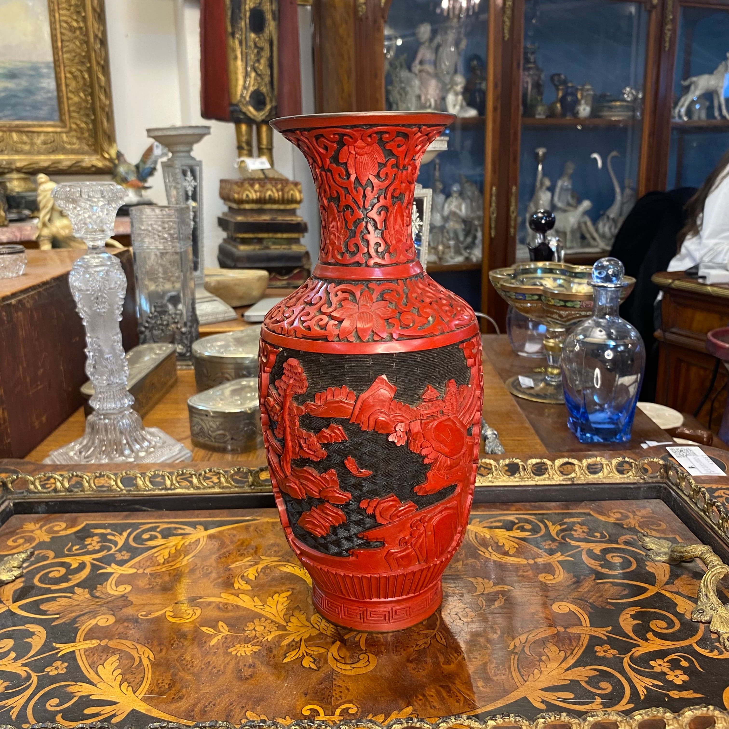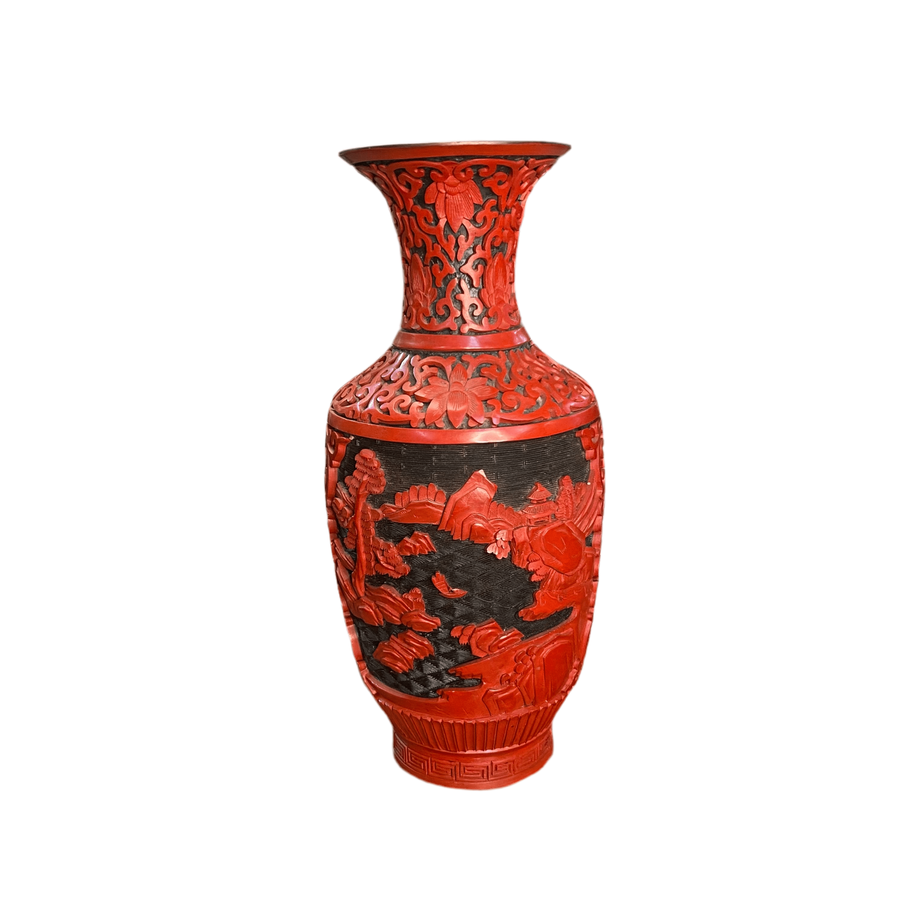 Vase paysage chinois laqué rouge
