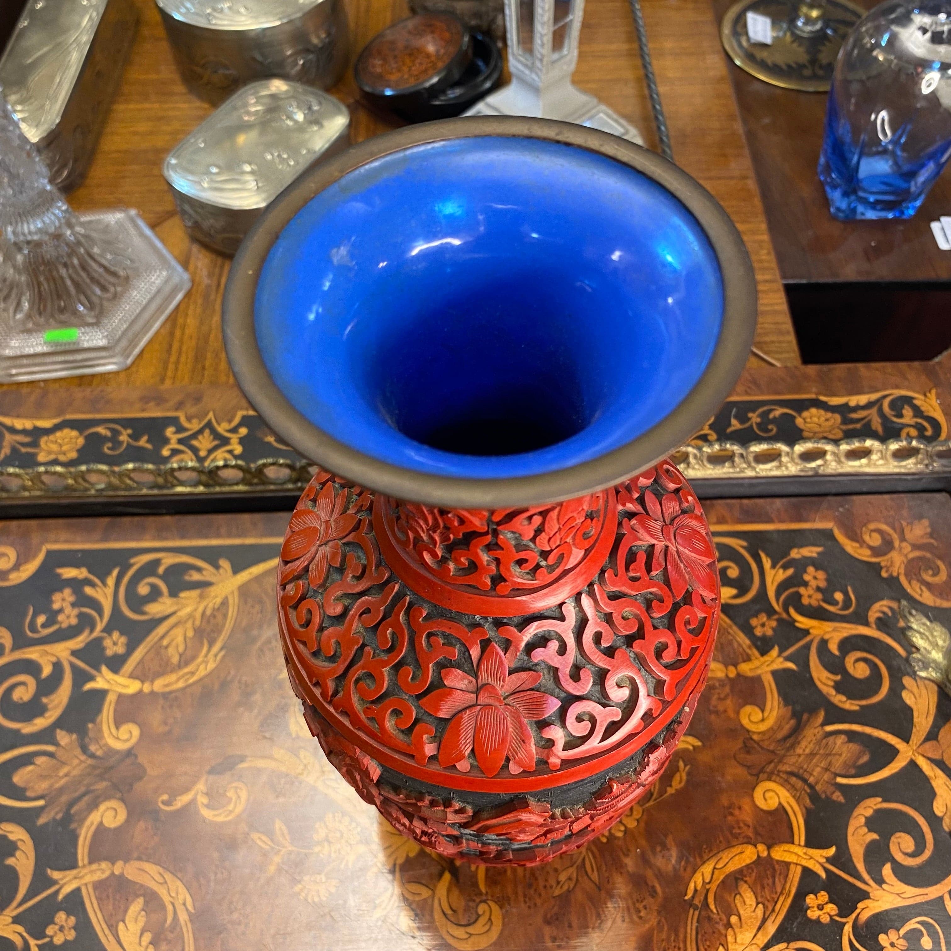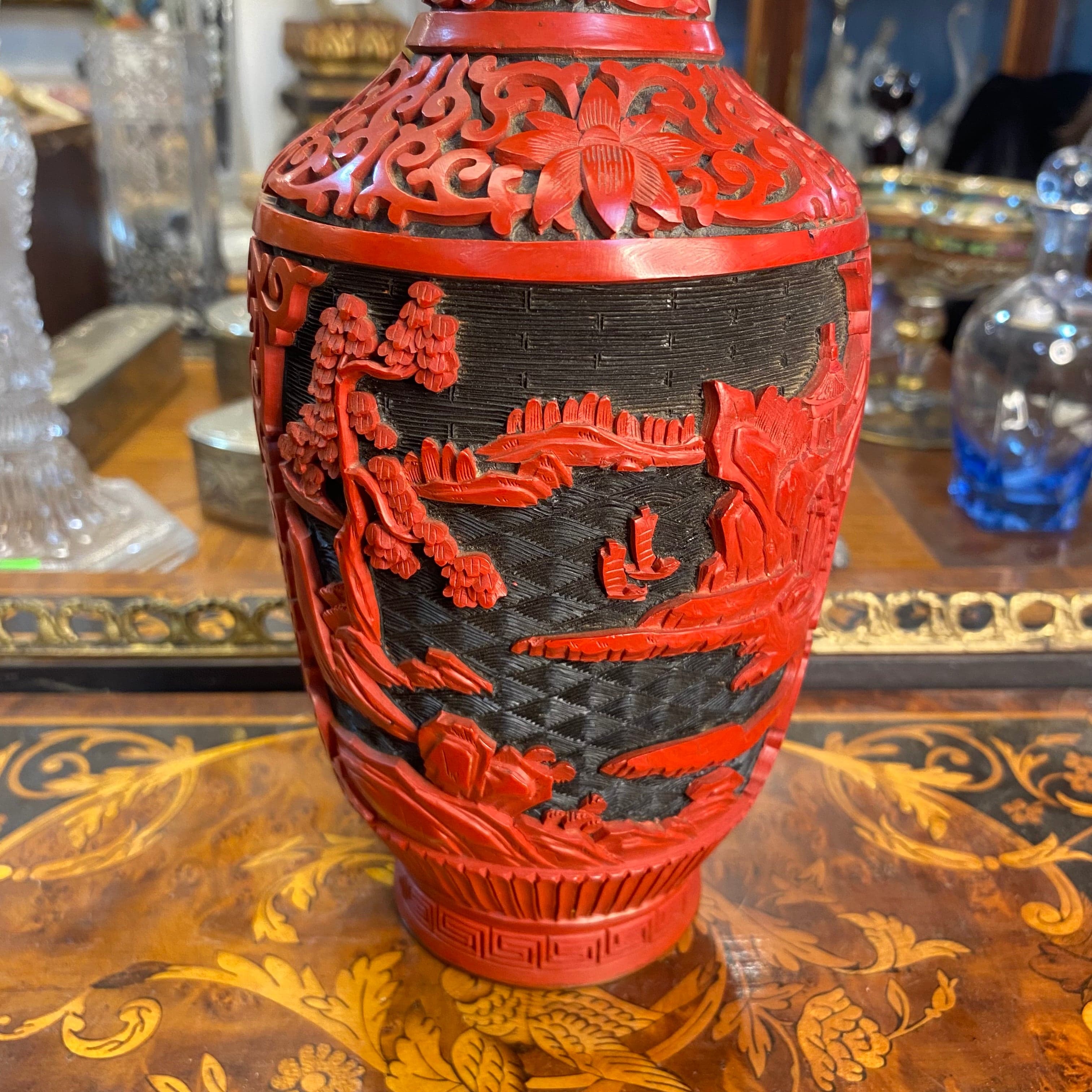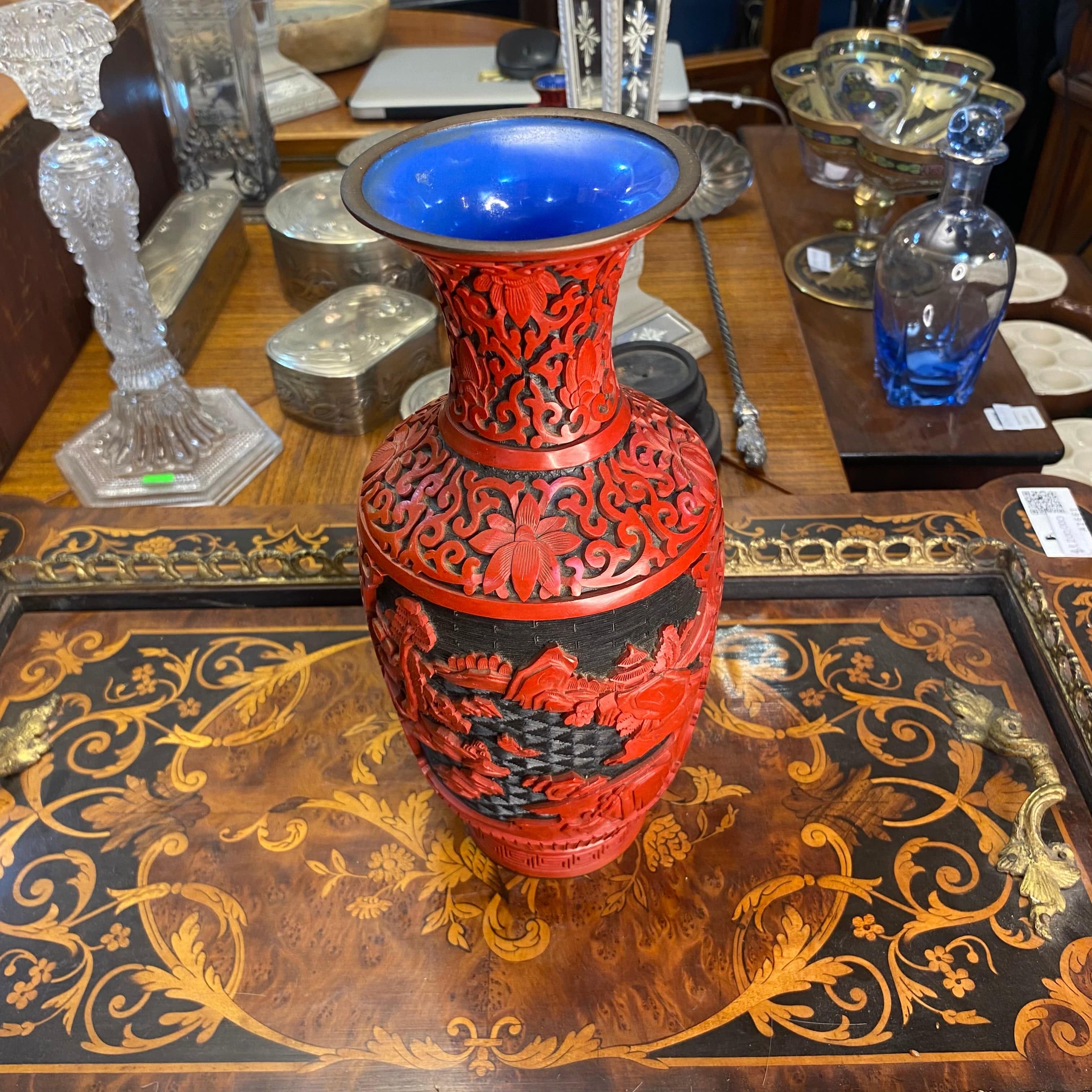 Vase chinois laqué rouge, motif fleurs et paysage, intérieur bleu.