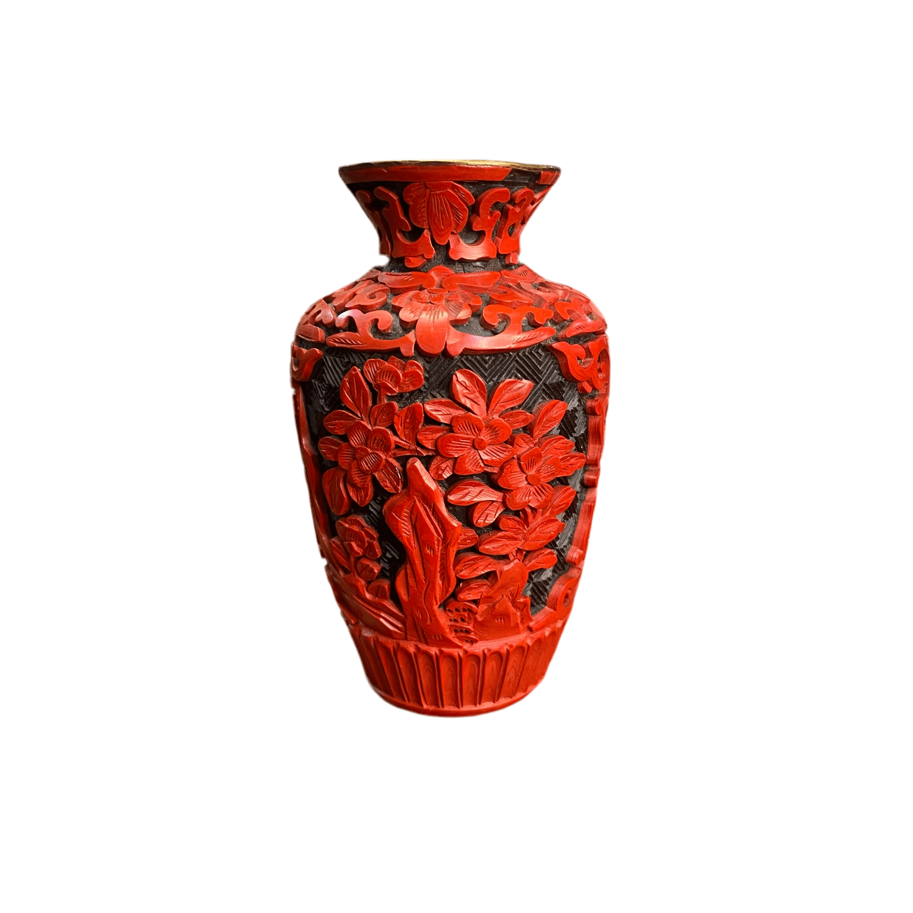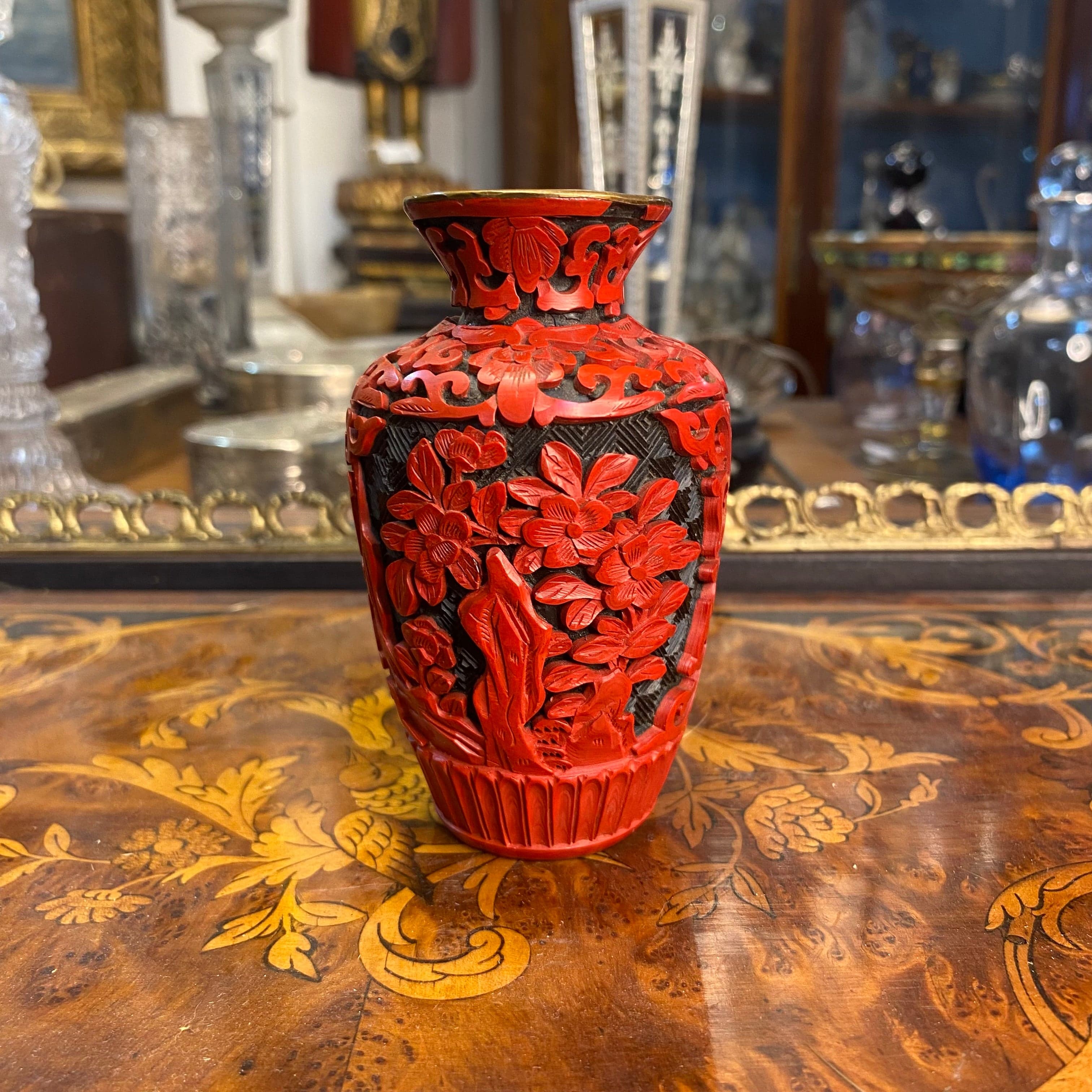 Petit vase chinois laqué rouge à décor de branches fleuries et de paysage