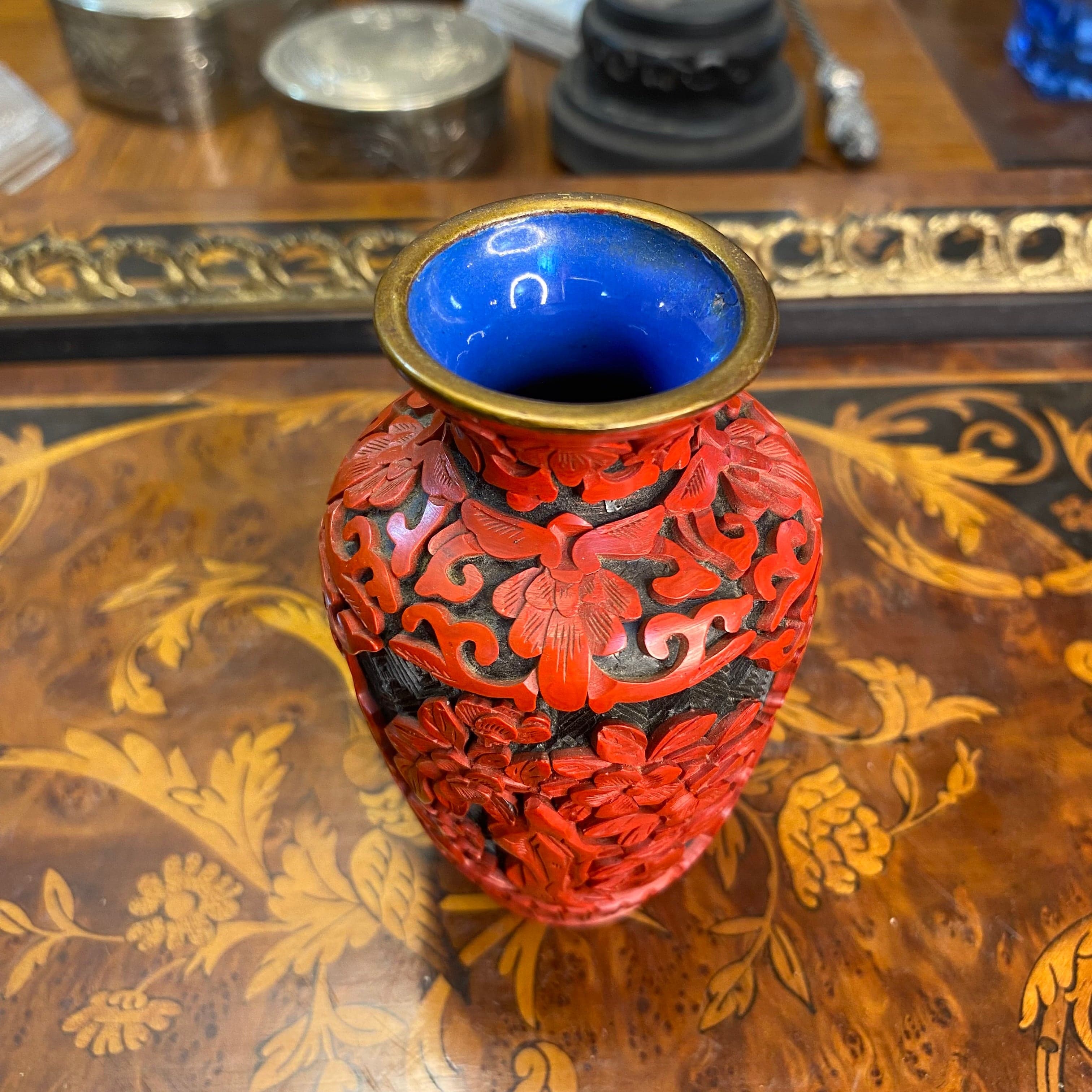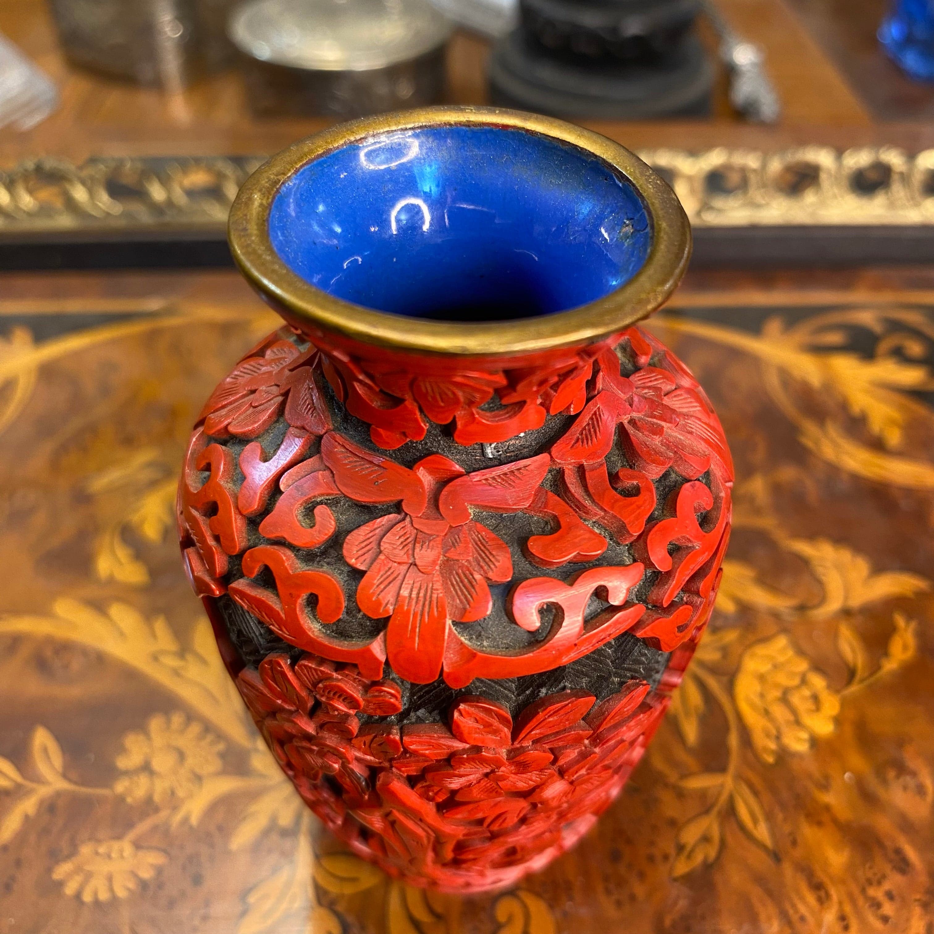 Magnifique petit vase chinois laqué rouge à motif floral et intérieur bleu.