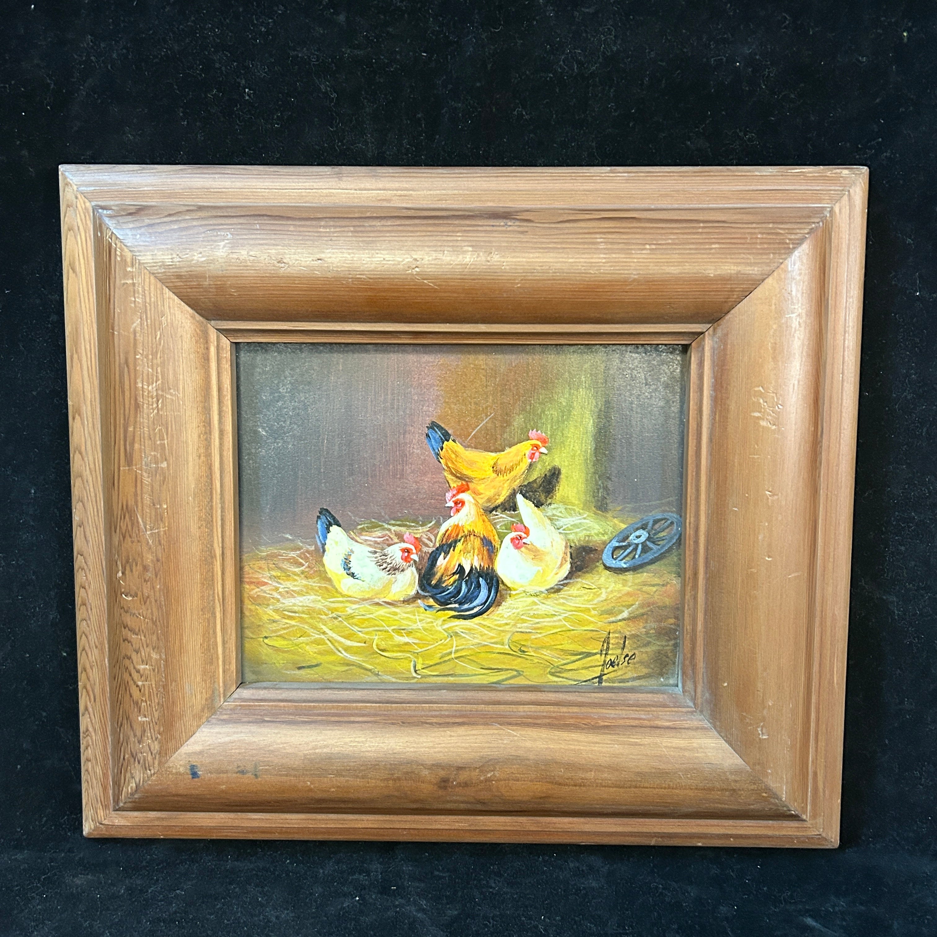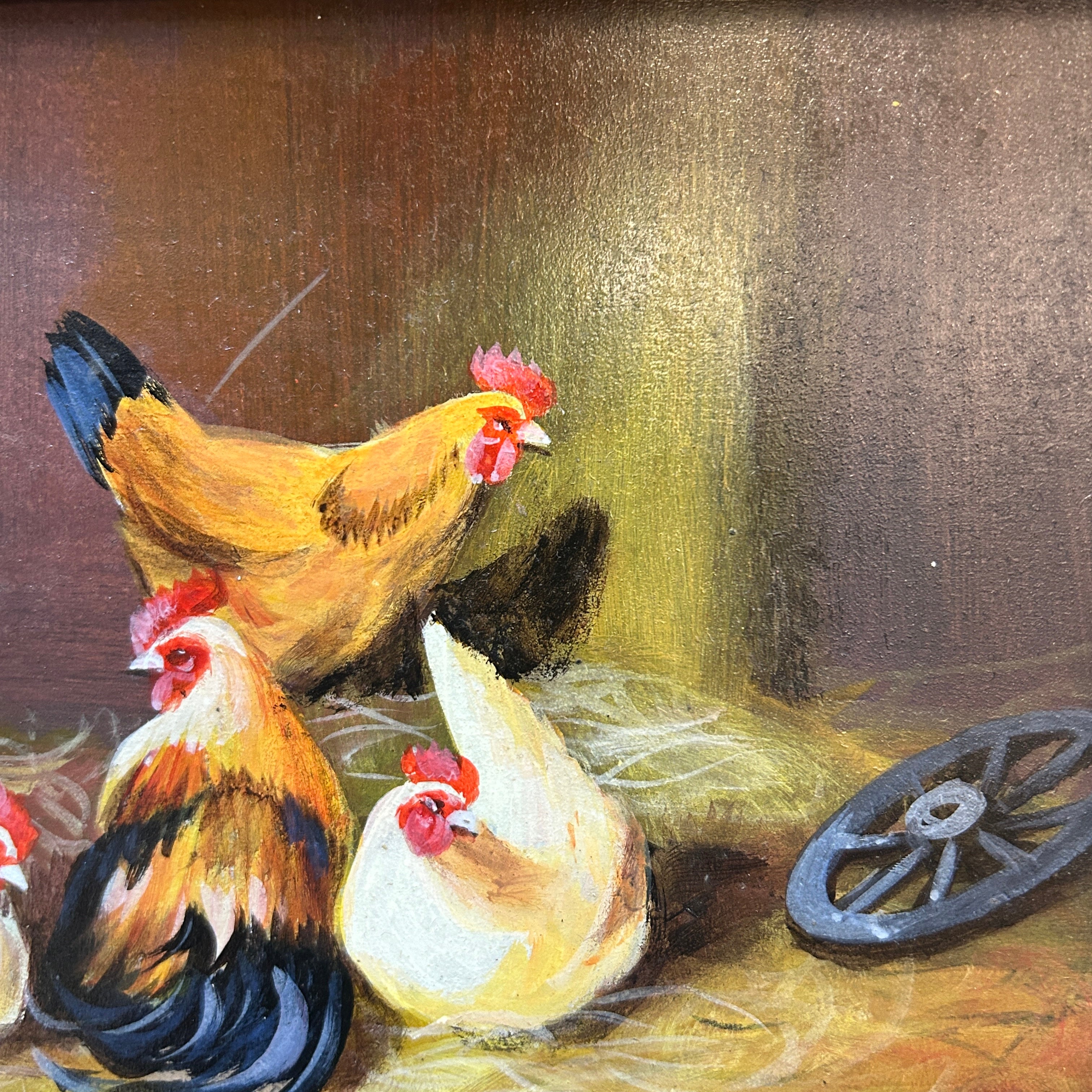 Luminosa pintura del talentoso pintor chileno Joelse que retrata 4 gallinas en lo que puede ser un gallinero. Es un cuadro donde se pueden apreciar los detalles realistas de cada gallina, sus plumas, rostros y movimiento, entregando la sensación de estar presente en una escena viva.