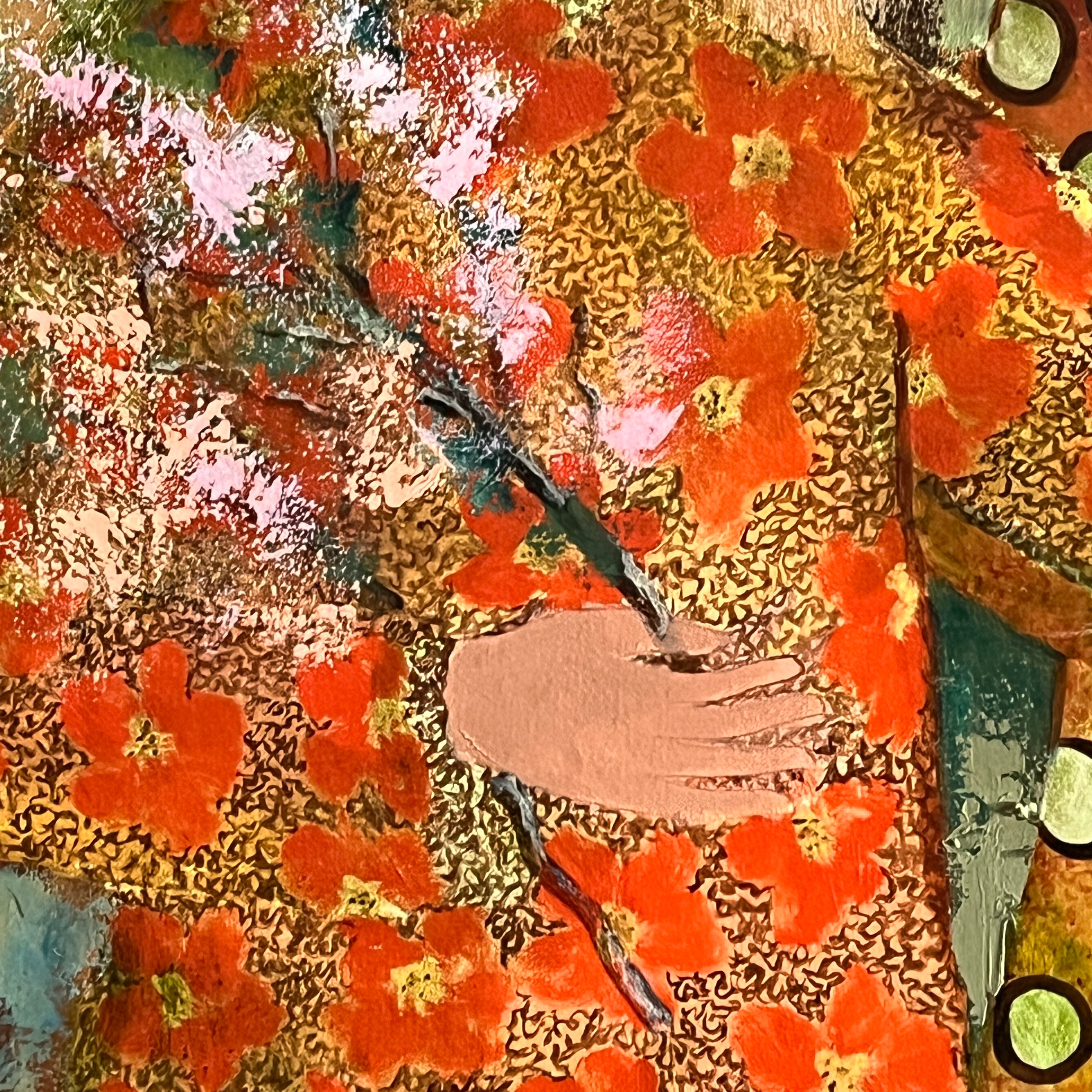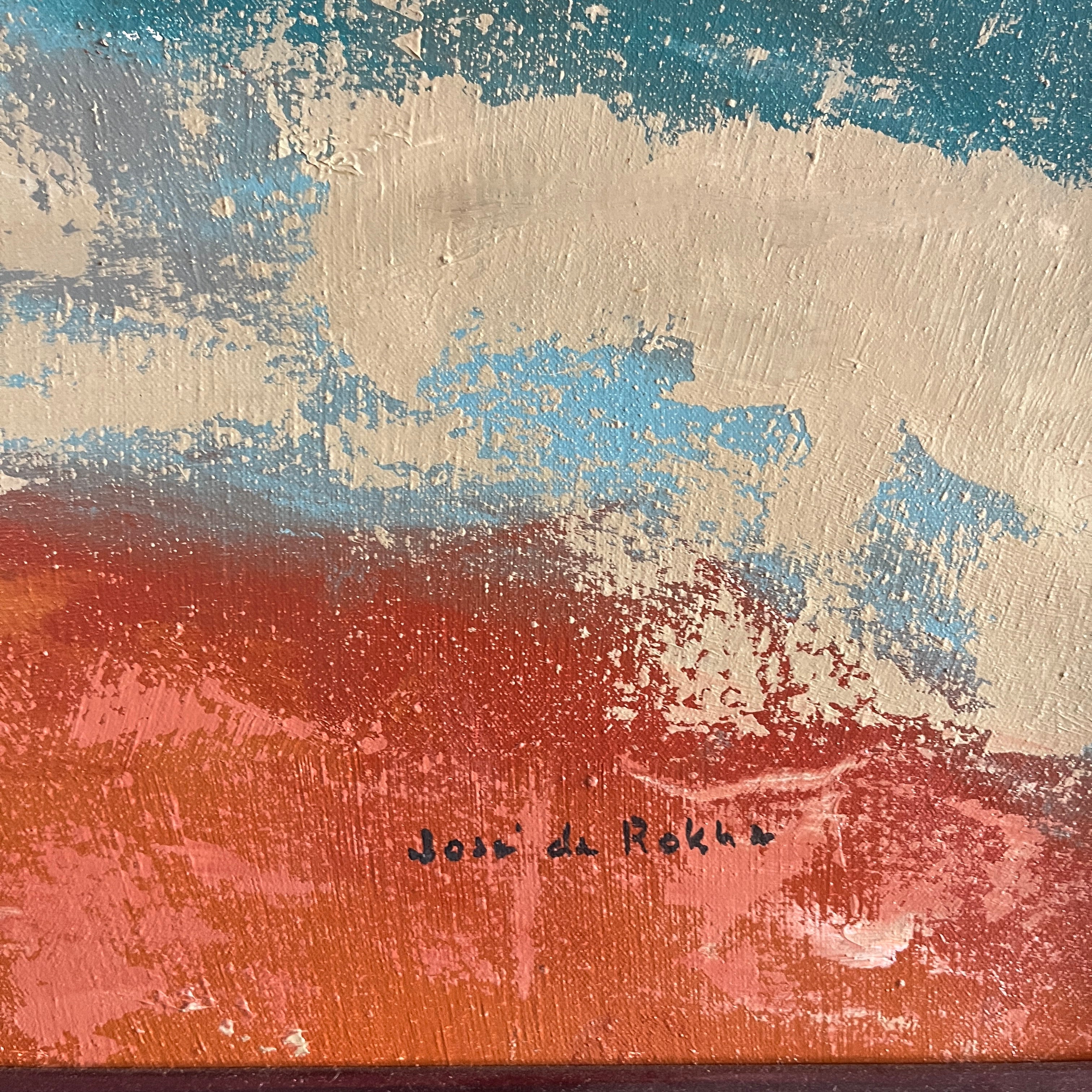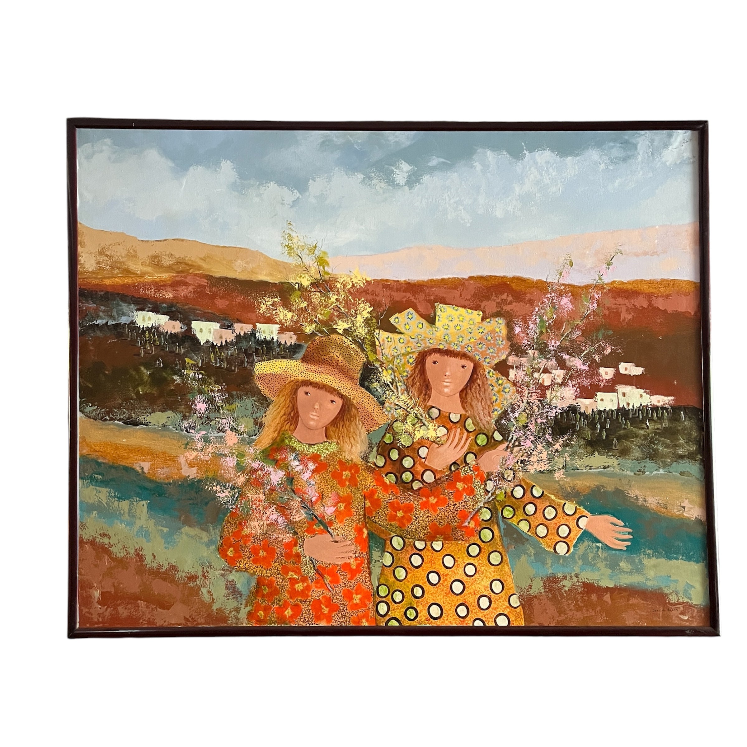 Óleo sobre tela del pintor chileno José de Rokha (1927-1994), representando a dos jóvenes, con coloridos vestidos y sombreros, que llevan ramas con flores en sus manos. De fondo, un paisaje de cerros en tonos cálidos y terrosos, cruzados por una franja celeste que sugiere un río. Sobre los cerros se ven algunas casas blancas y siluetas de personas. Esta figura de las dos jóvenes, presentes en varias obras del artista, va en línea con la búsqueda de José de Rokha de capturar un fragmento de lo latinoamericano, a partir del uso del color, el gesto y el paisaje.