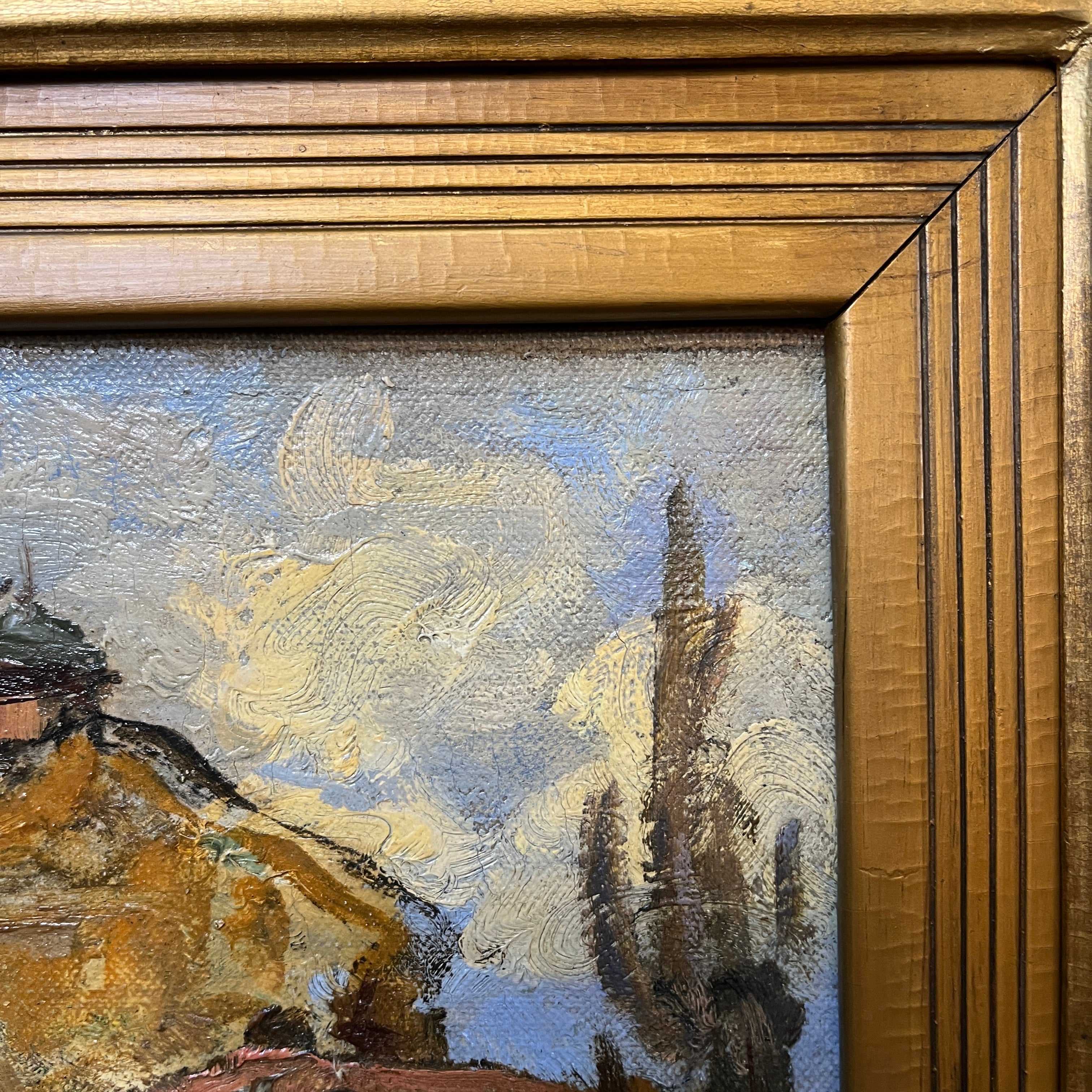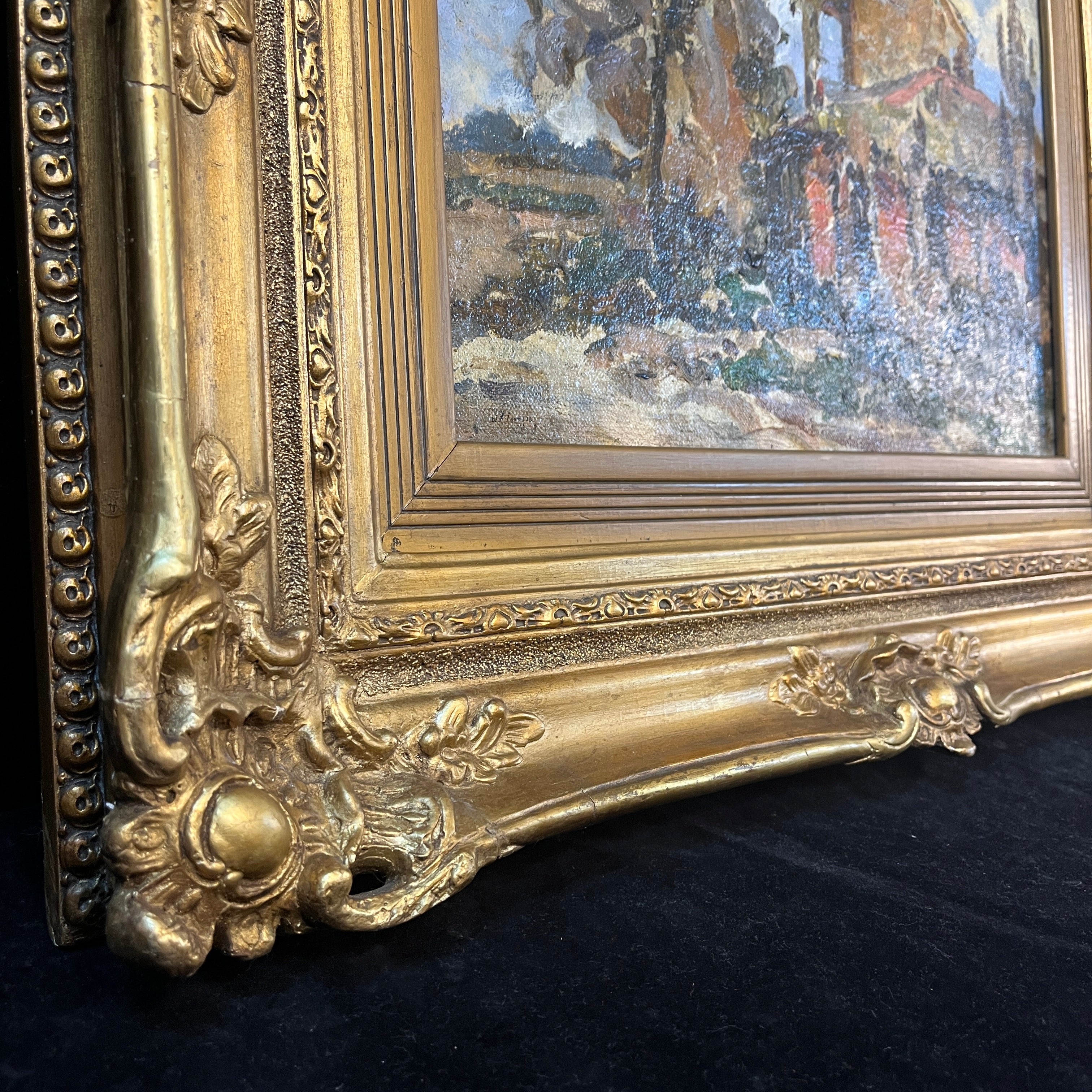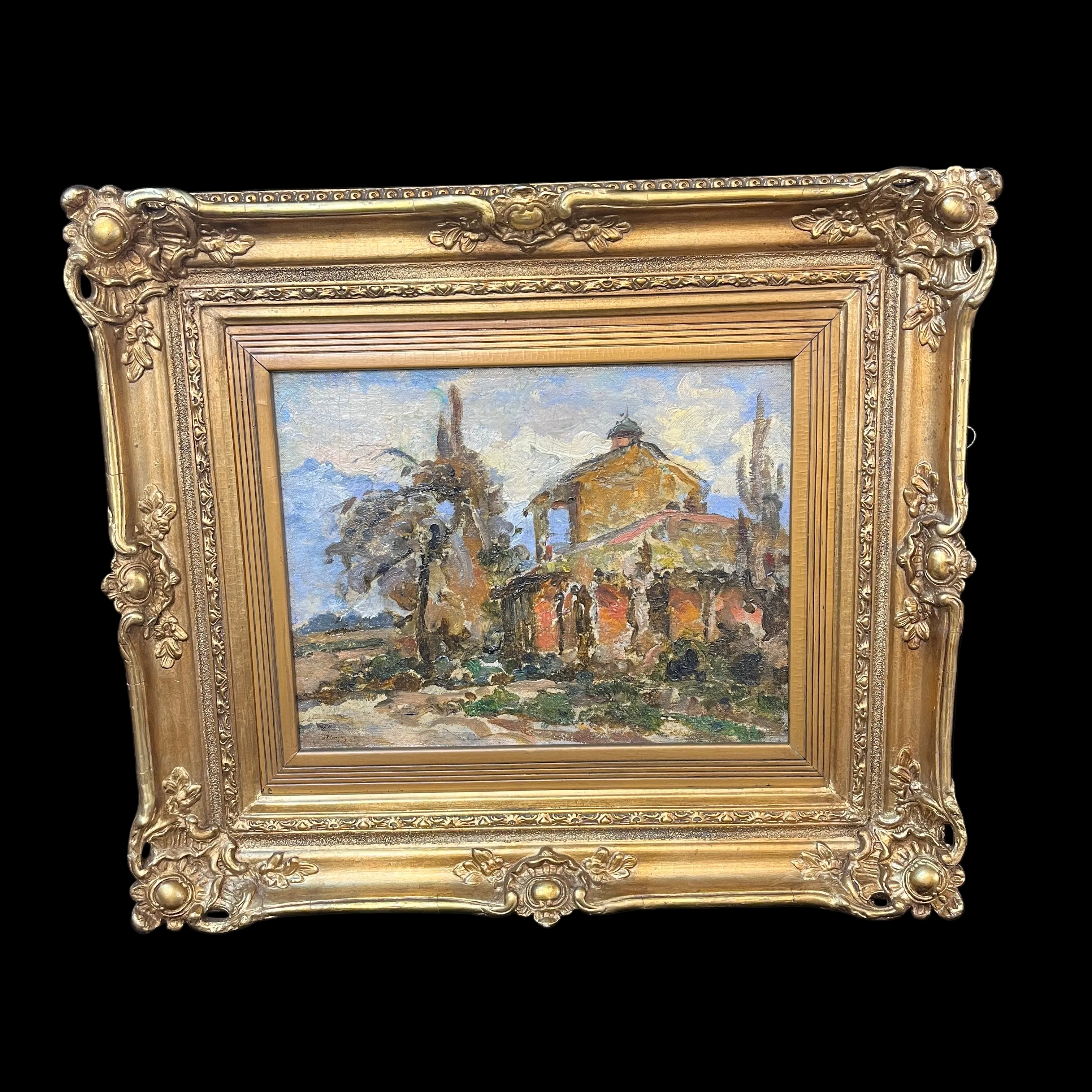 Óleo sobre tela del reconocido pintor chileno Juan Francisco González, representando un paisaje de campo con una casa naranja de arquitectura colonial , su jardín anterior y el cielo celeste con nubes de fondo. La obra tiene un trazo que llena de releva la textura de la vegetación, haciendo énfasis en el color y los distintos tonos de verde y café que componen el paisaje. La obra tiene un espectacular marco de madera tallada en relieves y terminado en elegante dorado.