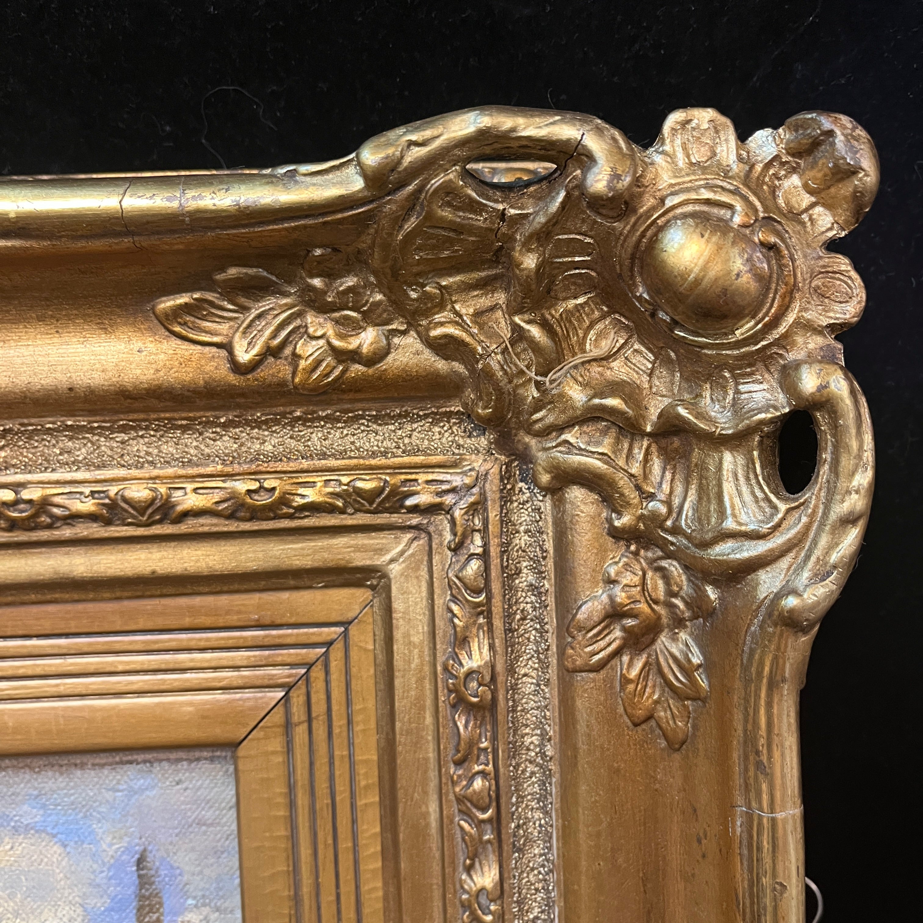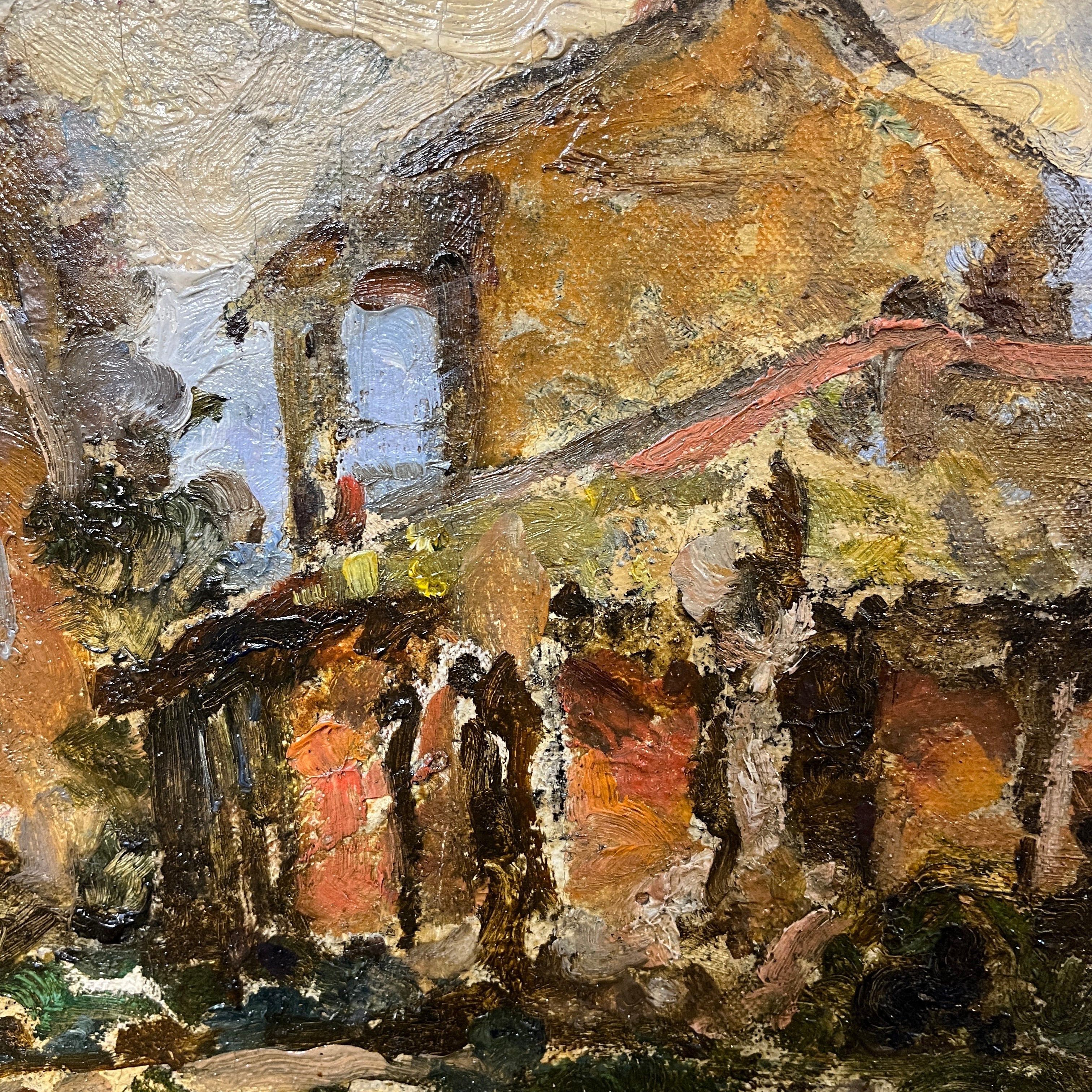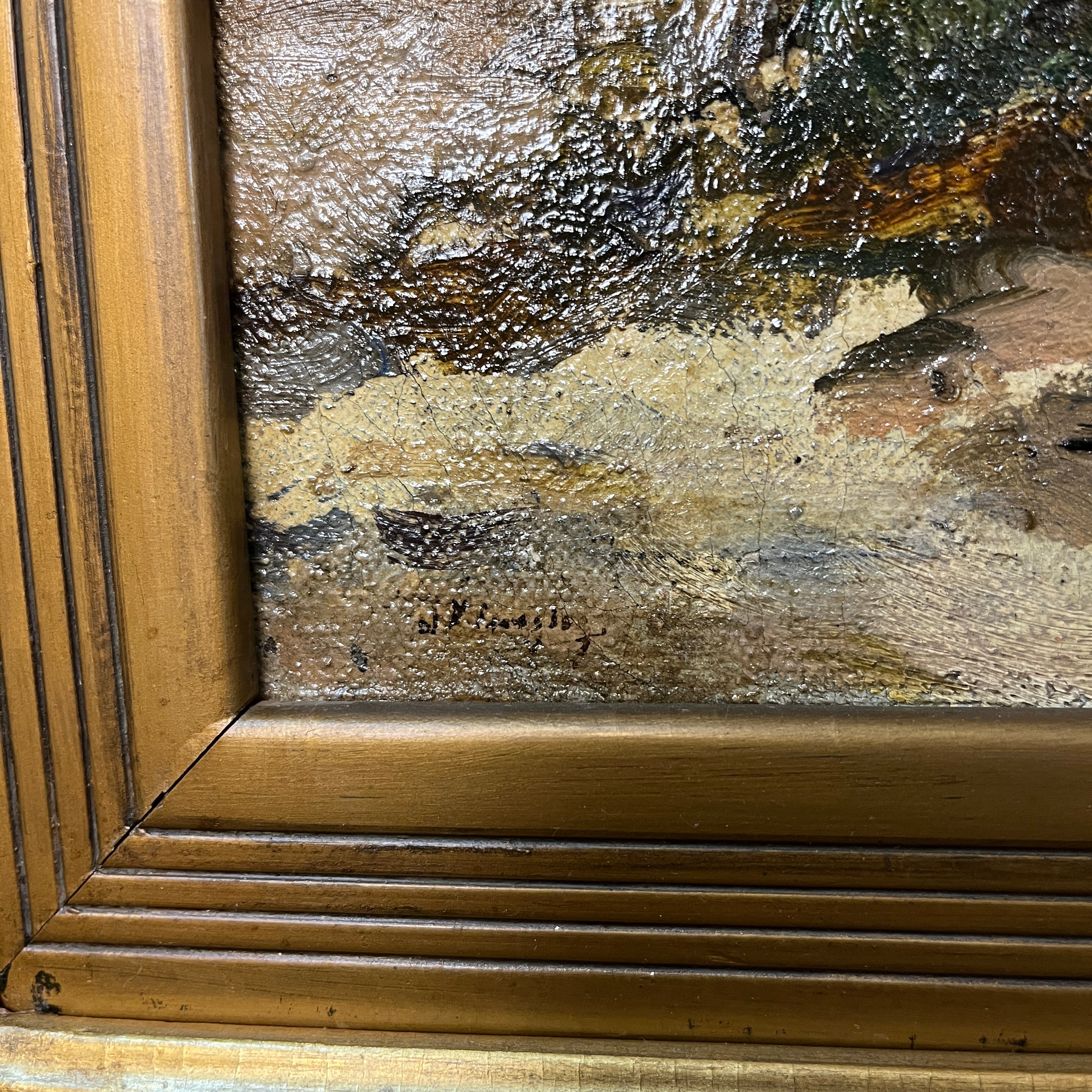 Óleo sobre tela del reconocido pintor chileno Juan Francisco González, representando un paisaje de campo con una casa naranja de arquitectura colonial , su jardín anterior y el cielo celeste con nubes de fondo. La obra tiene un trazo que llena de releva la textura de la vegetación, haciendo énfasis en el color y los distintos tonos de verde y café que componen el paisaje. La obra tiene un espectacular marco de madera tallada en relieves y terminado en elegante dorado.