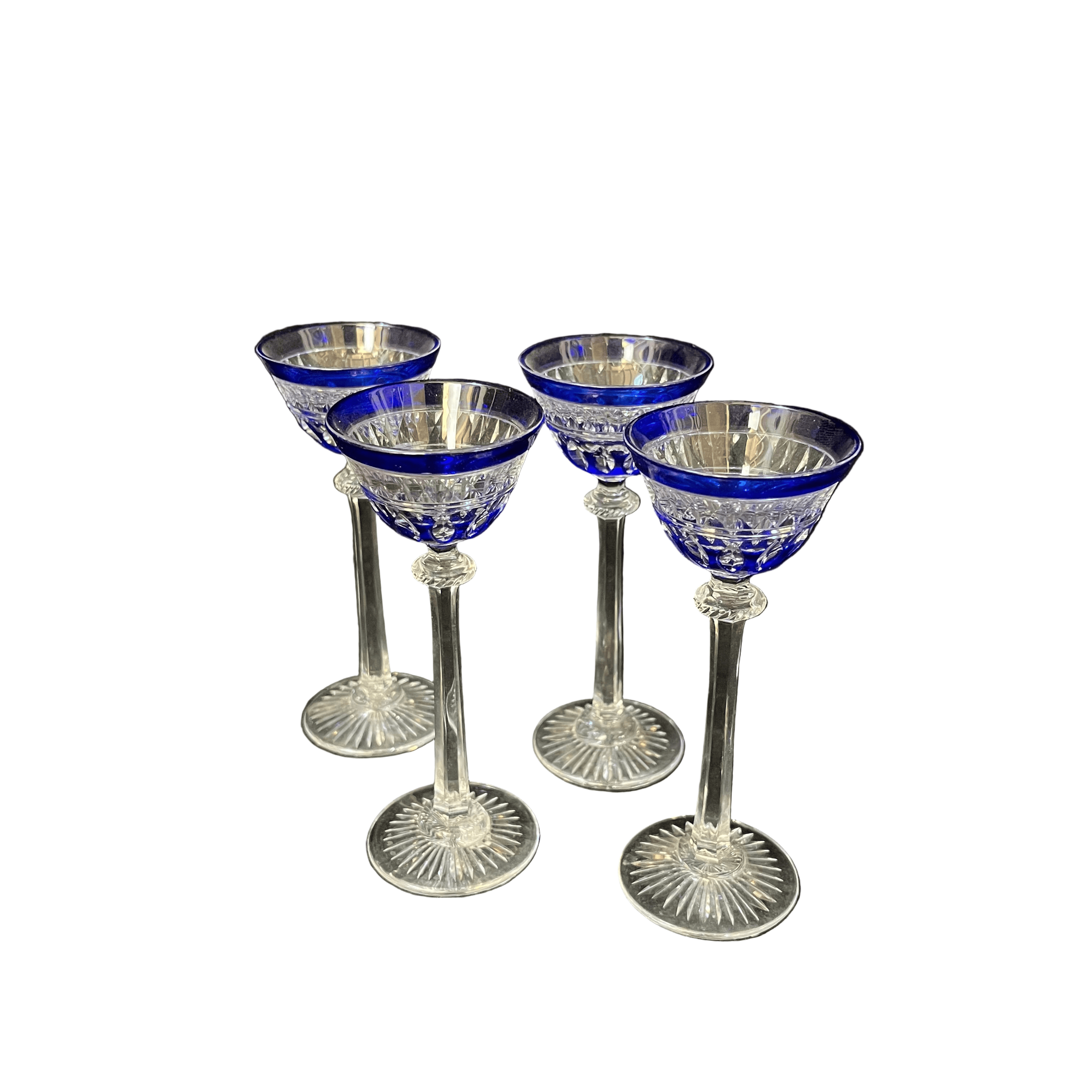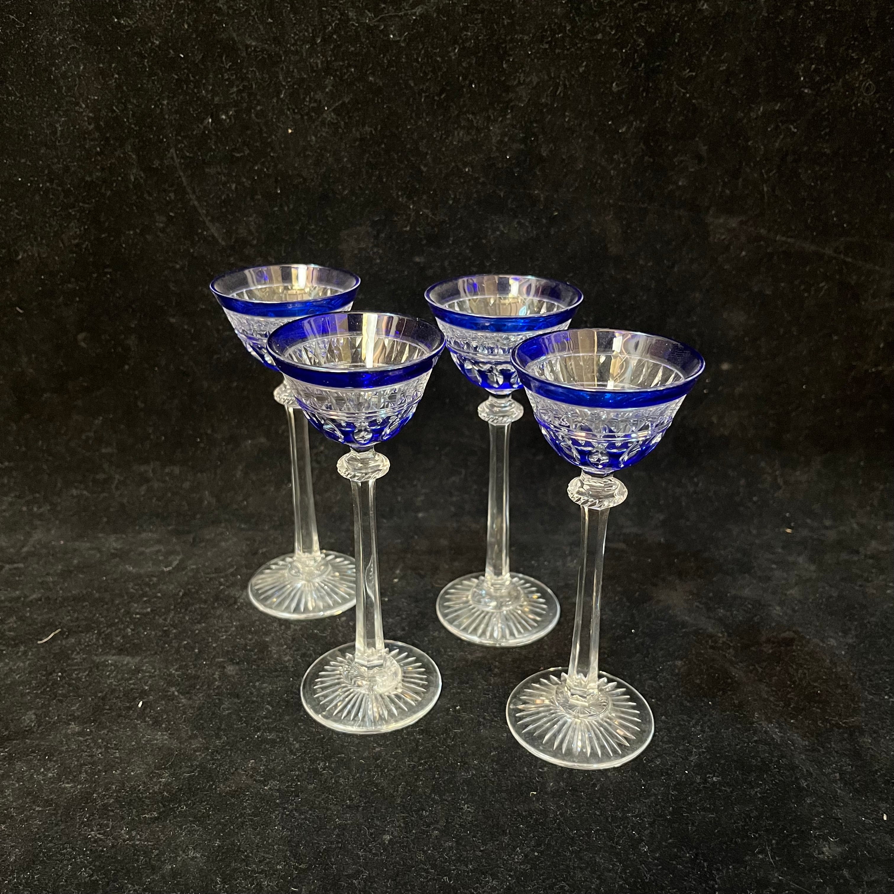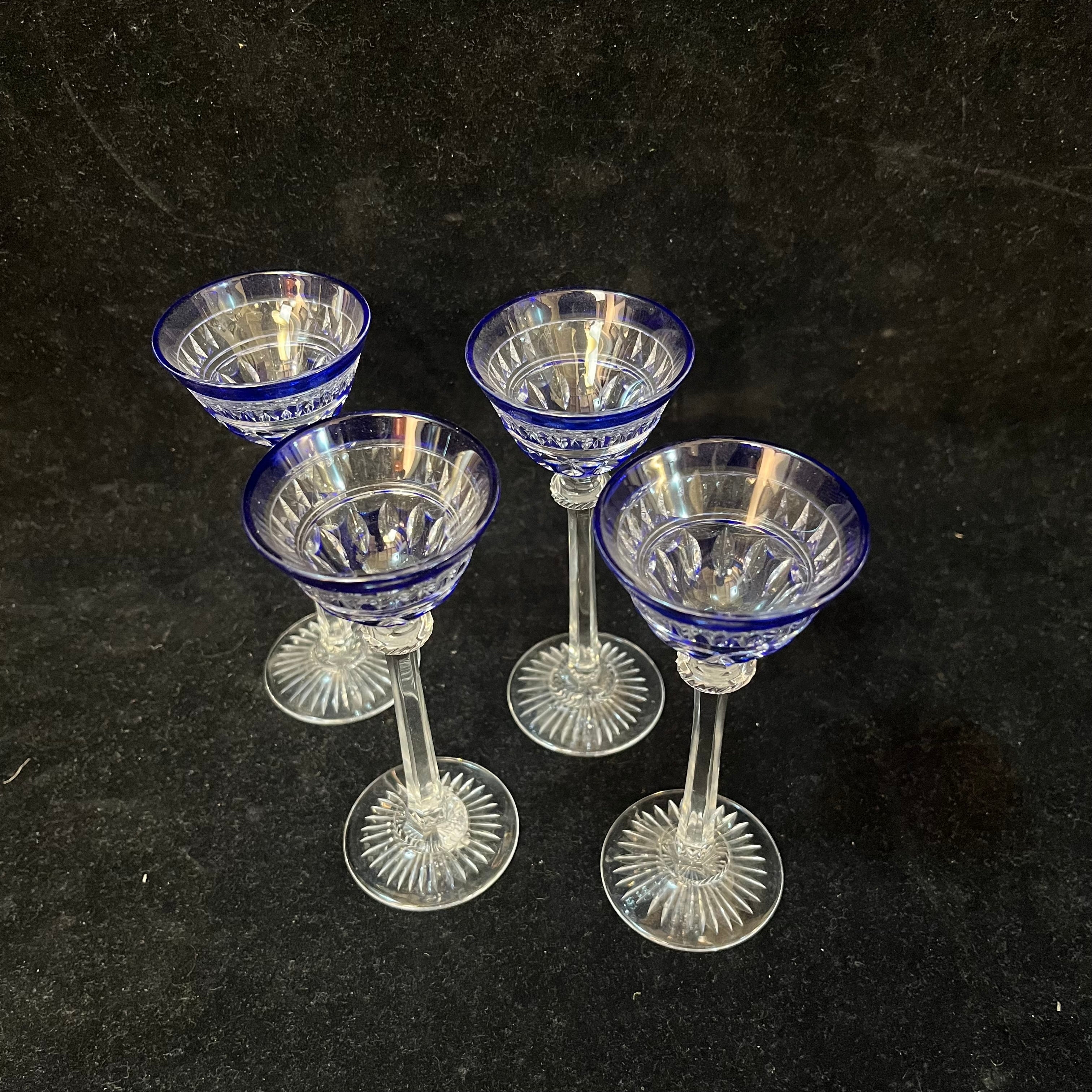 Bellísimo juego de cuatro copitas de cristal de origen europeo, con elegantes tallados y coloreadas en azul cobalto.