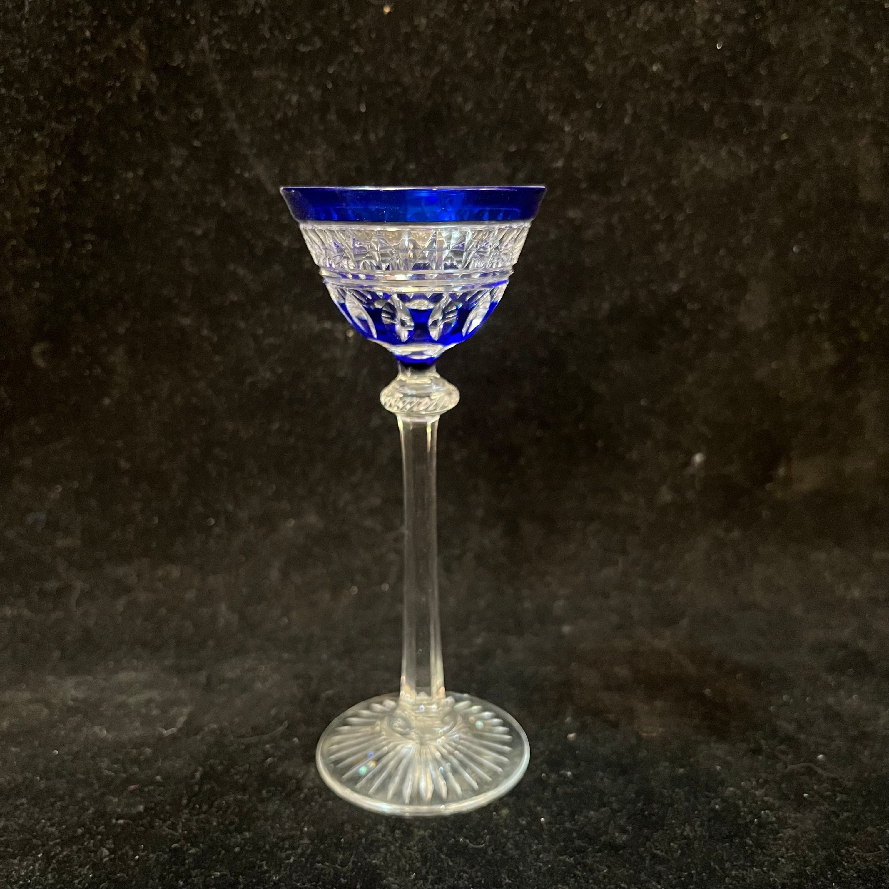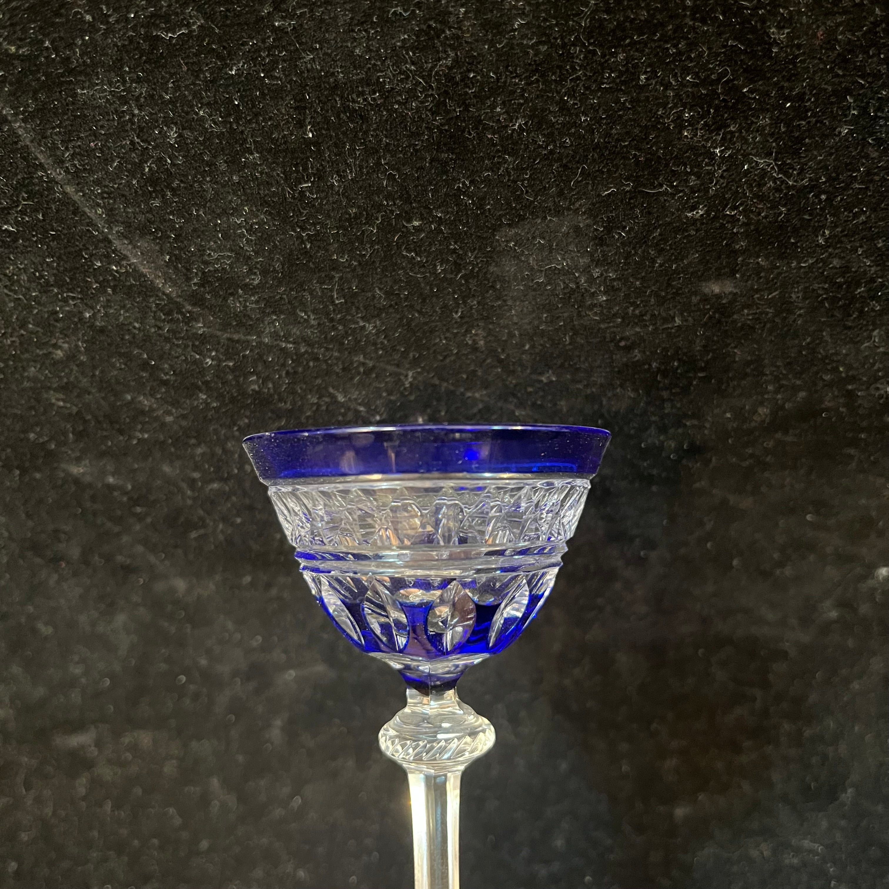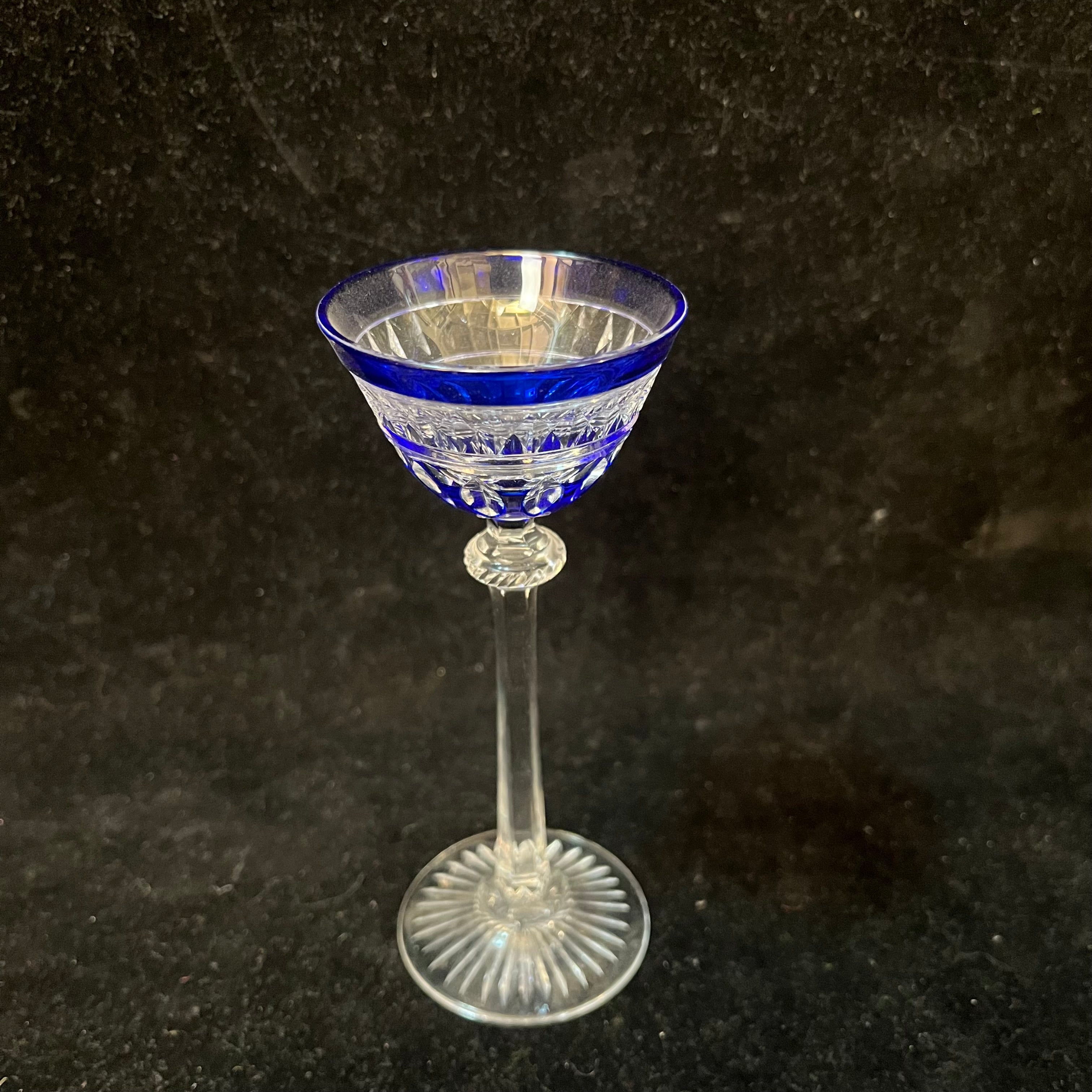 Bellísimo juego de cuatro copitas de cristal de origen europeo, con elegantes tallados y coloreadas en azul cobalto.