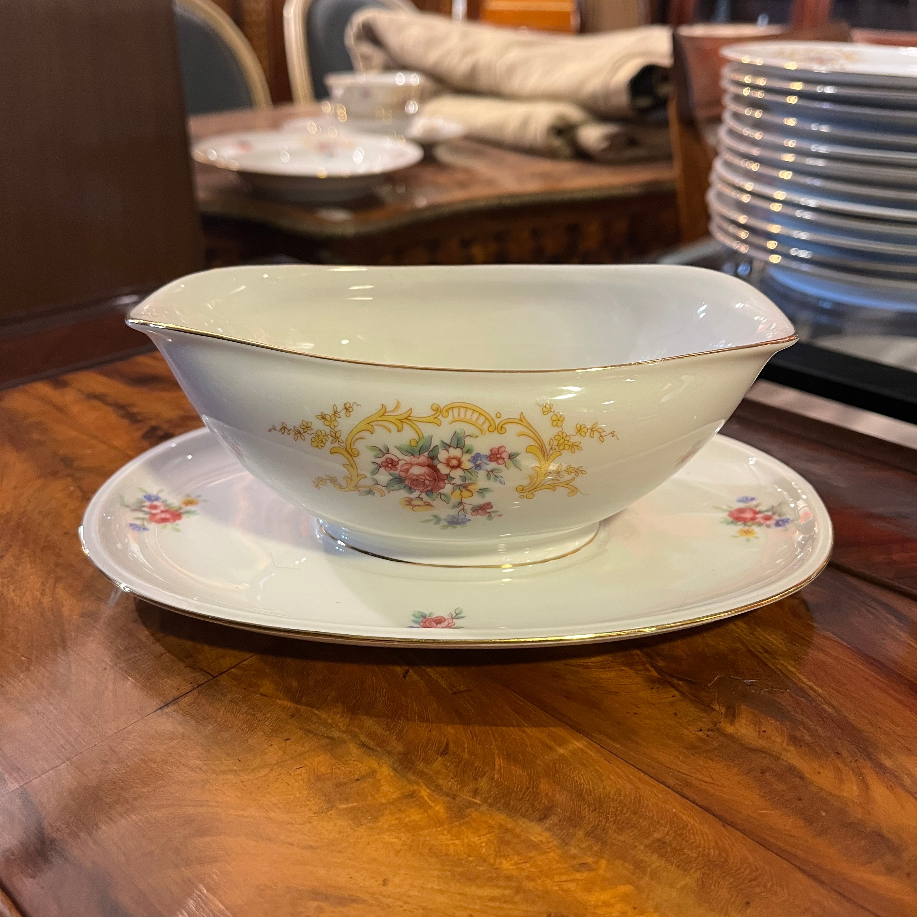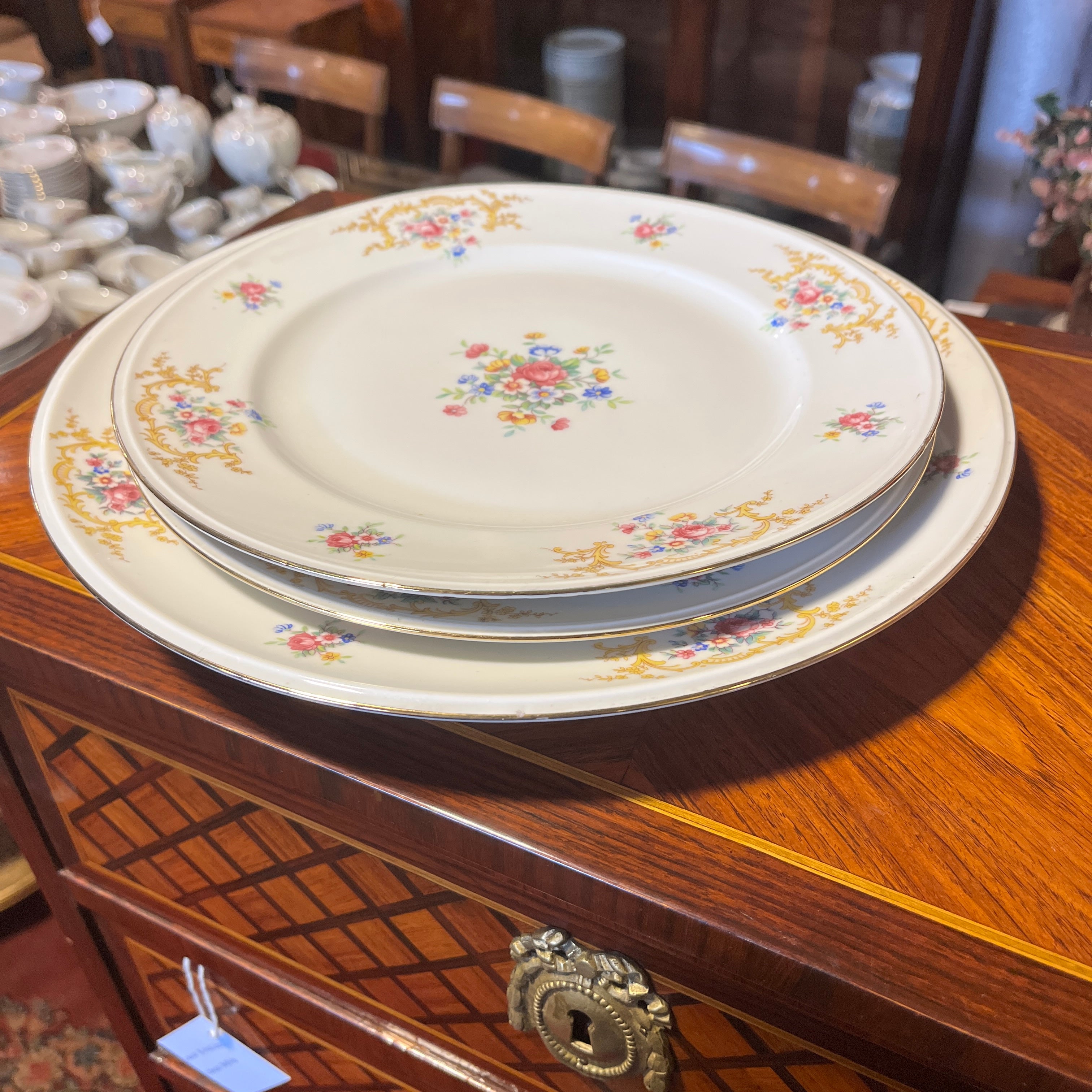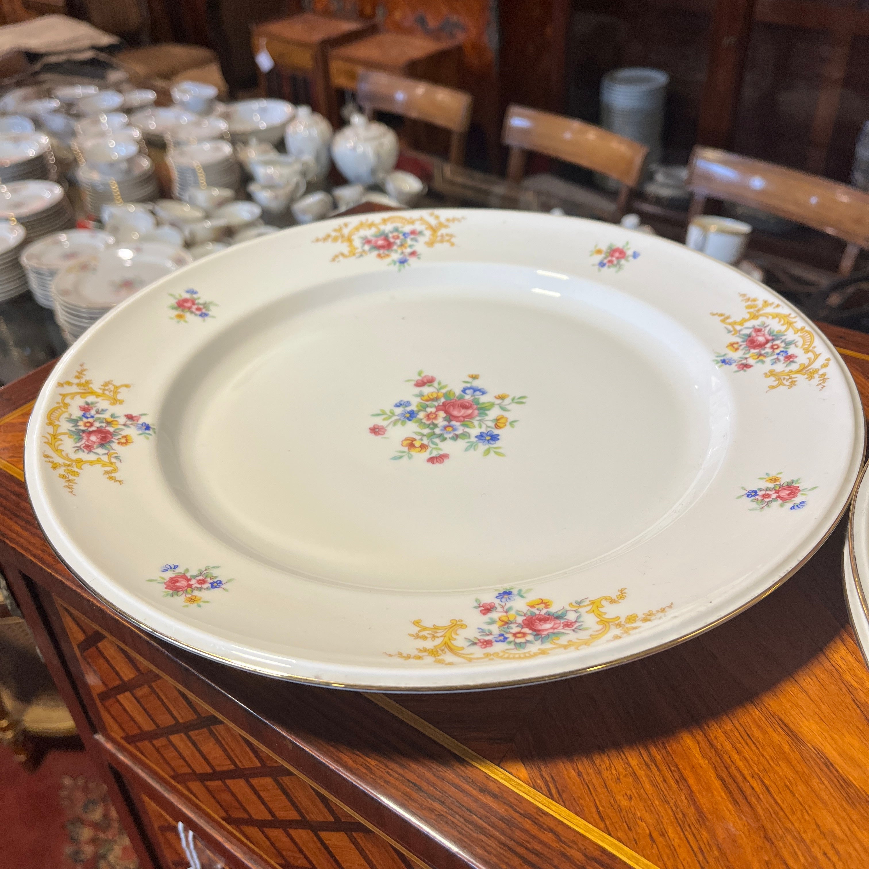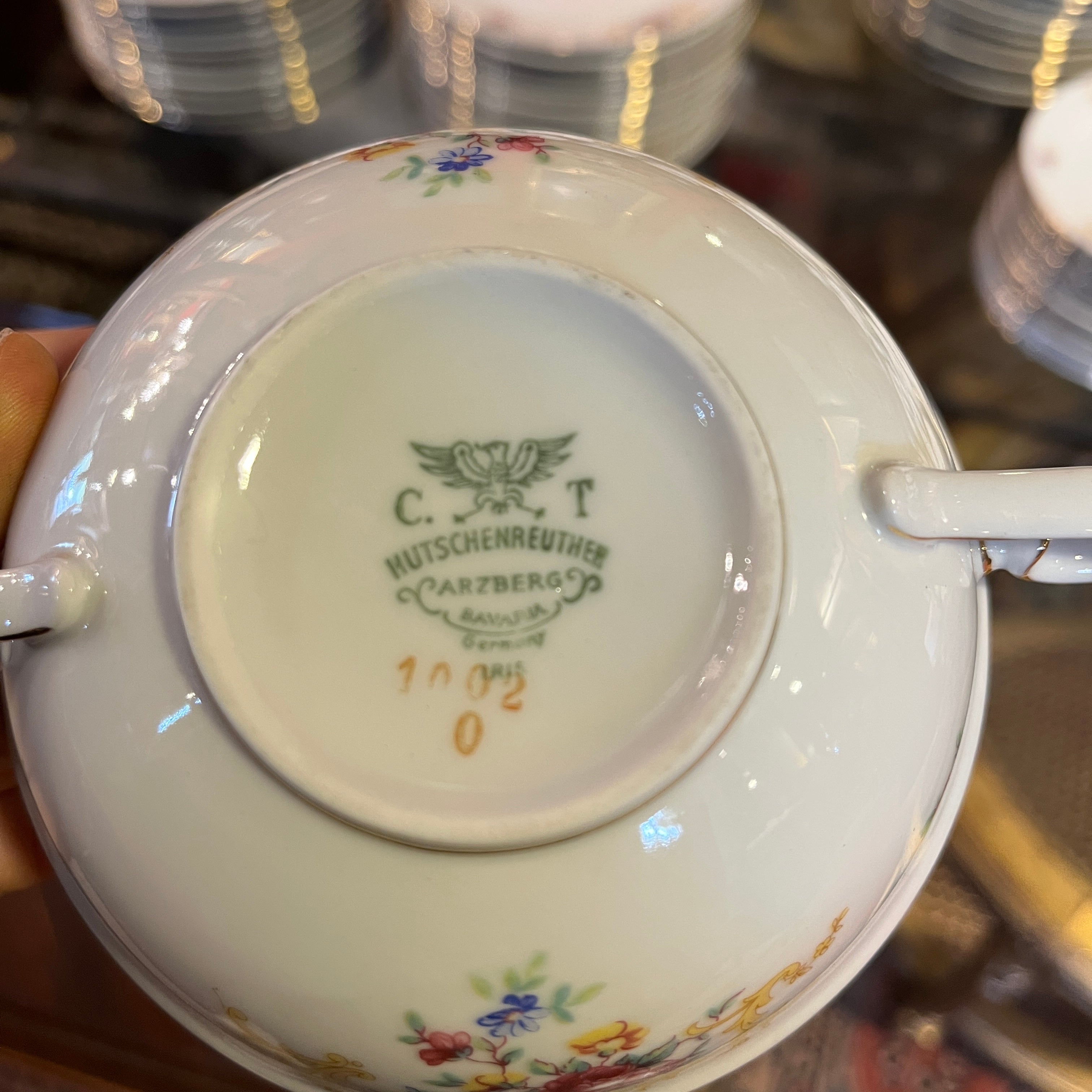 Gran juego de porcelana alemana Hutschenreuter, con un delicado diseño de flores y guirnaldas doradas, con terminaciones en dorado en sus asas y bordes. El juego incluye el juego de mesa, juego de té, café y diversas piezas de servir.