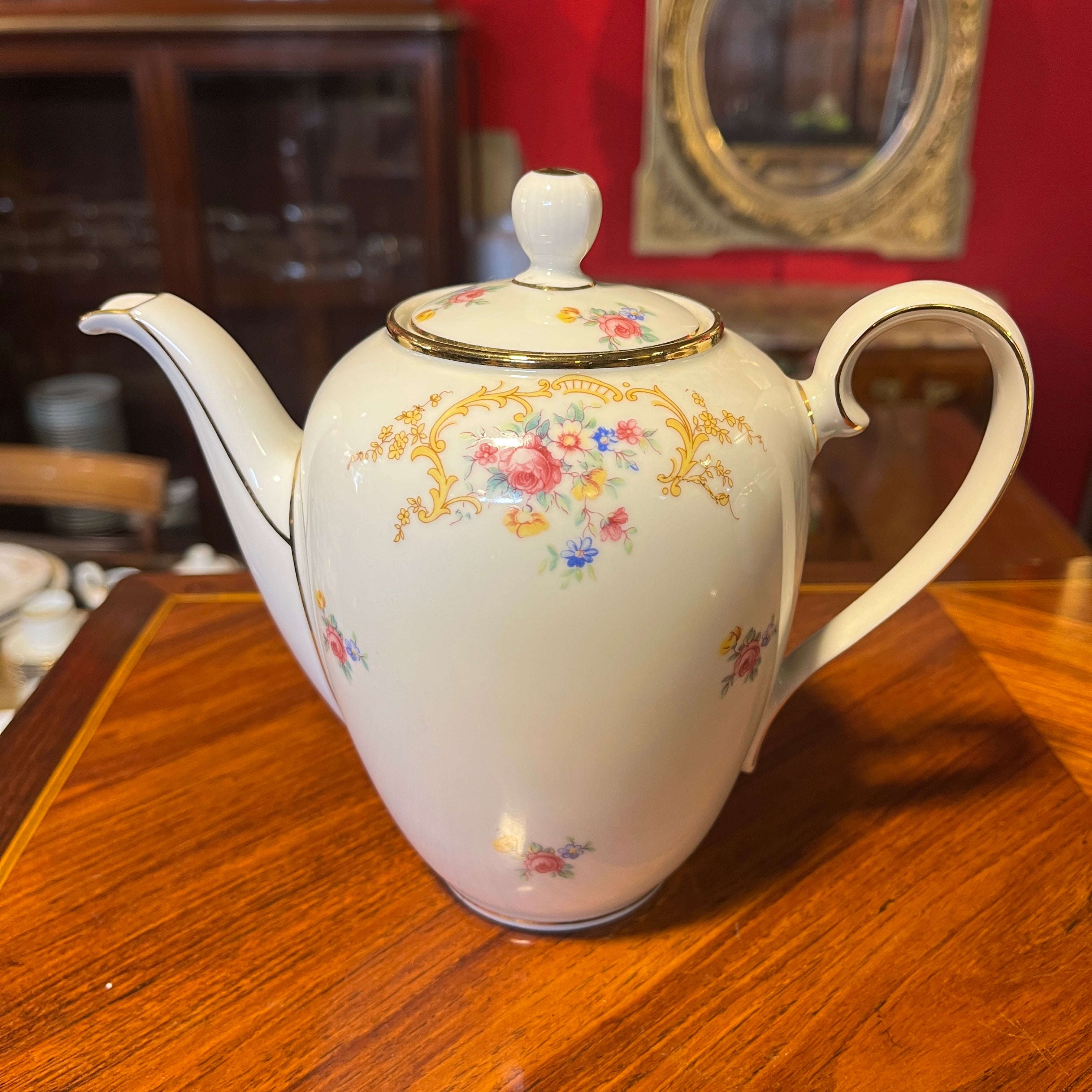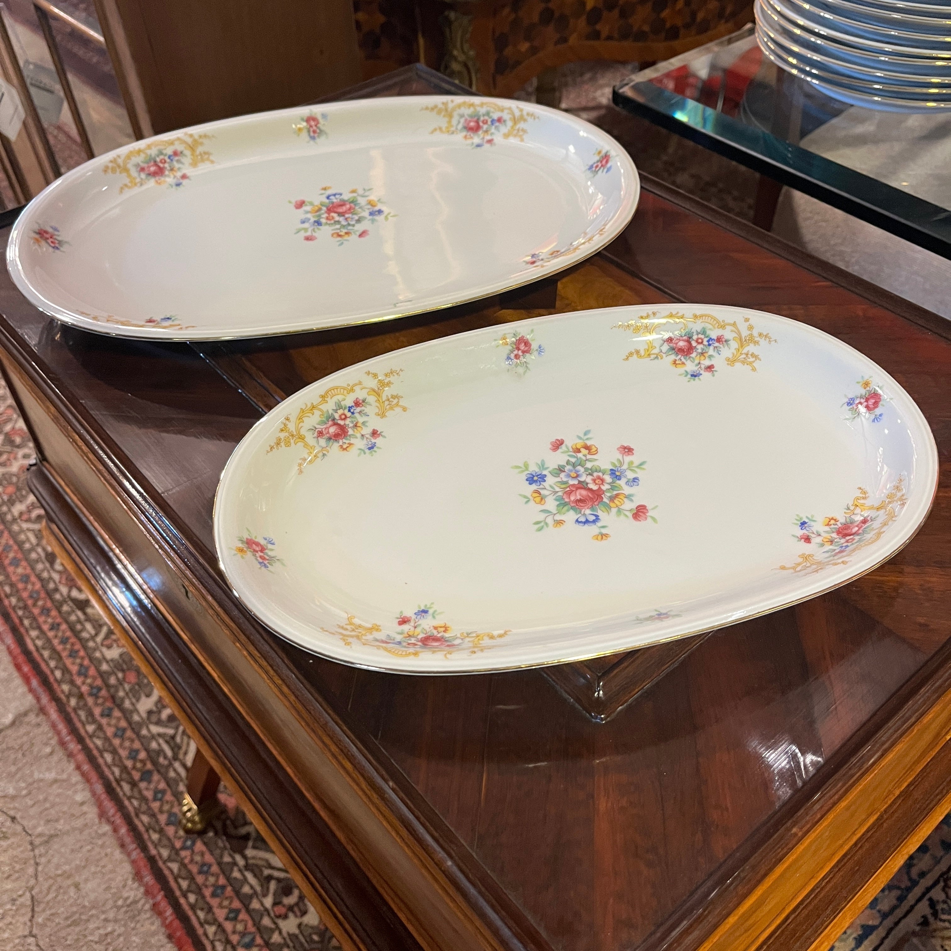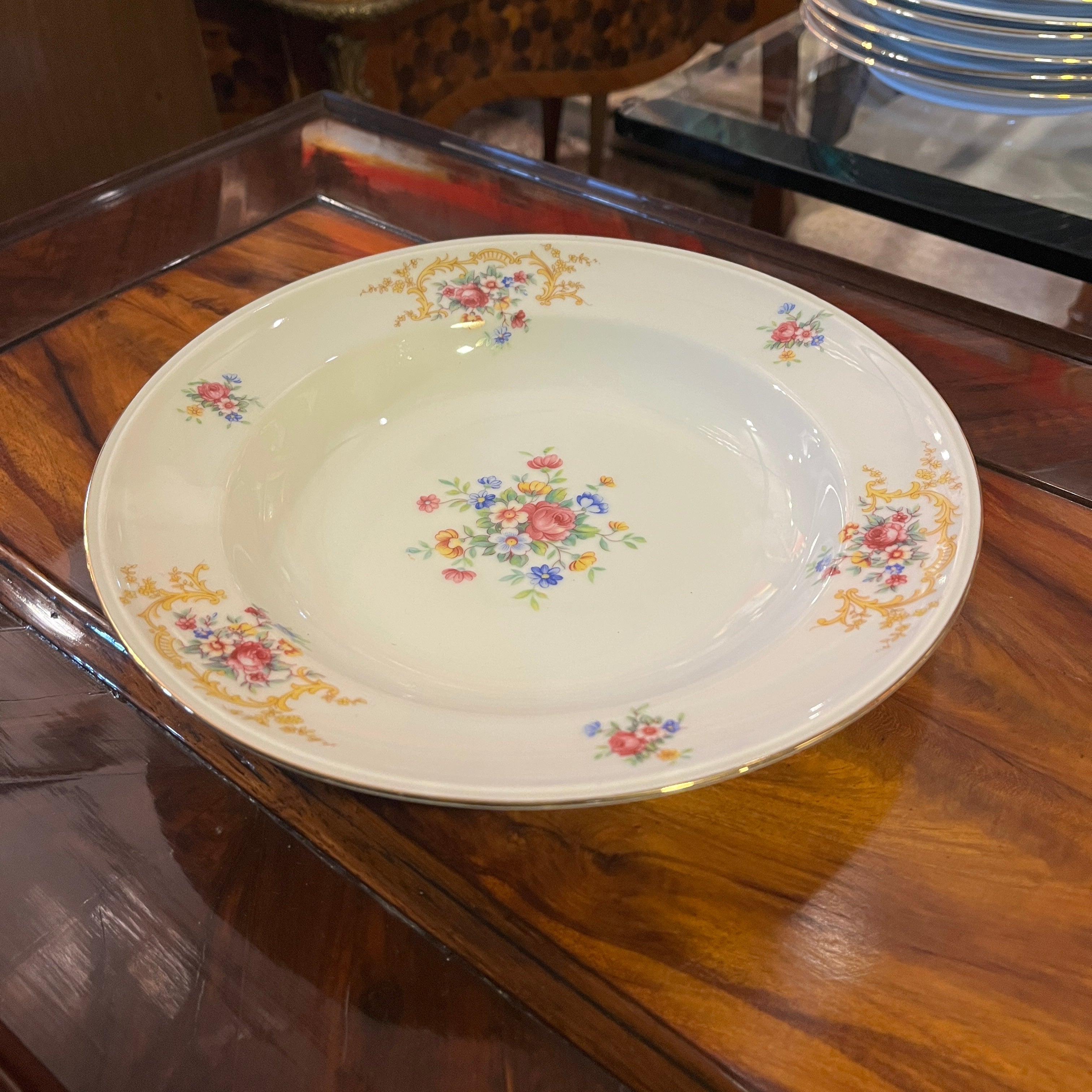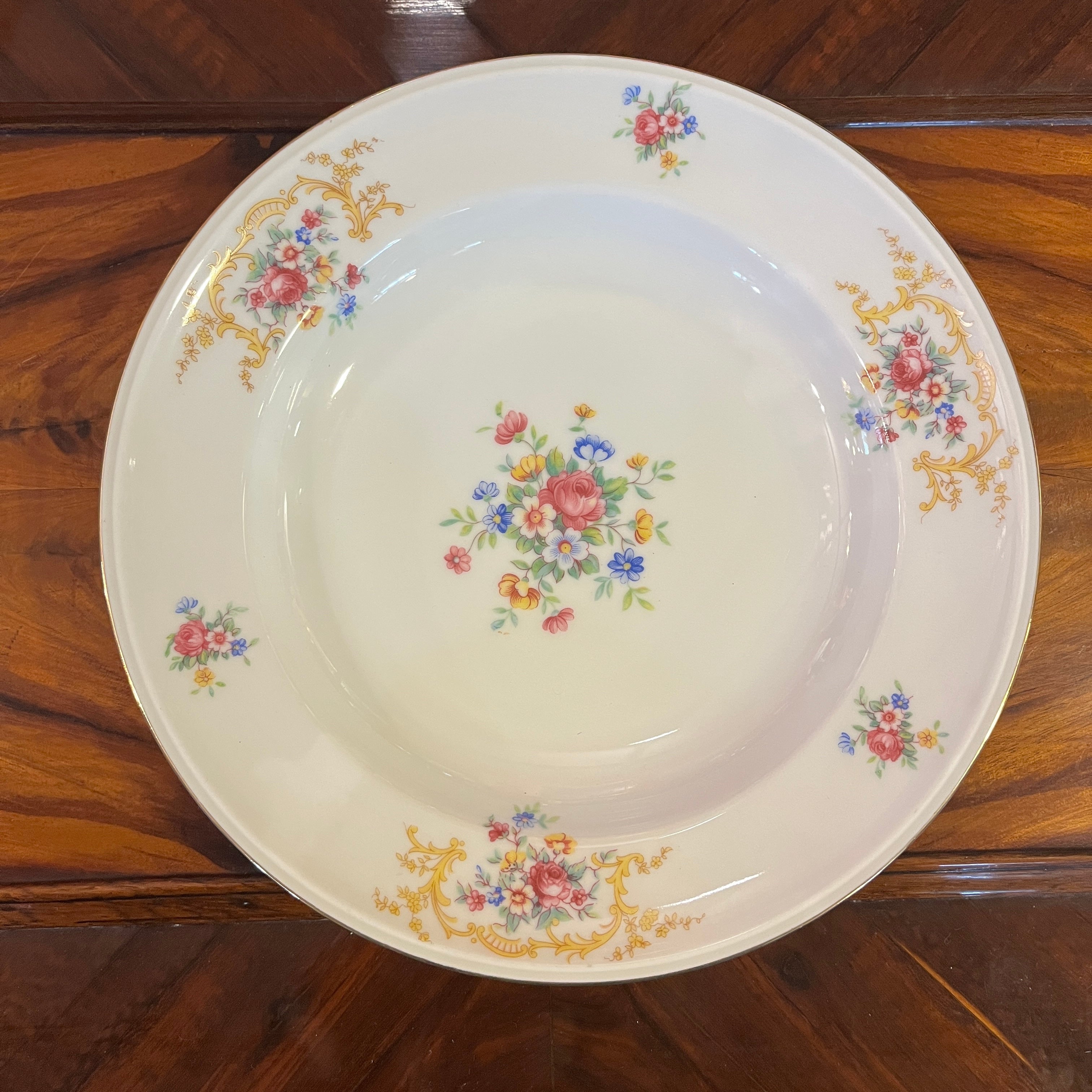 Gran juego de porcelana alemana Hutschenreuter, con un delicado diseño de flores y guirnaldas doradas, con terminaciones en dorado en sus asas y bordes. El juego incluye el juego de mesa, juego de té, café y diversas piezas de servir.