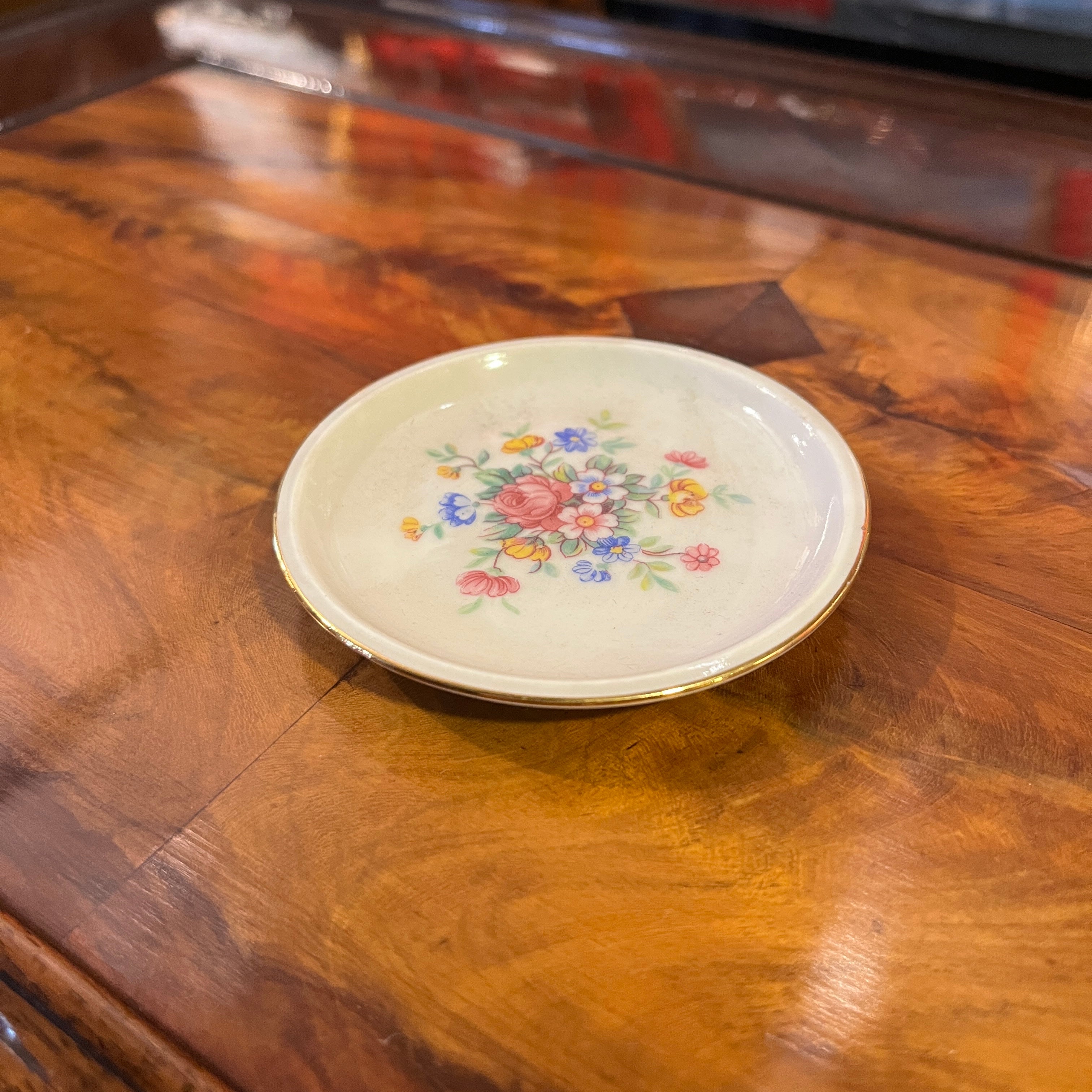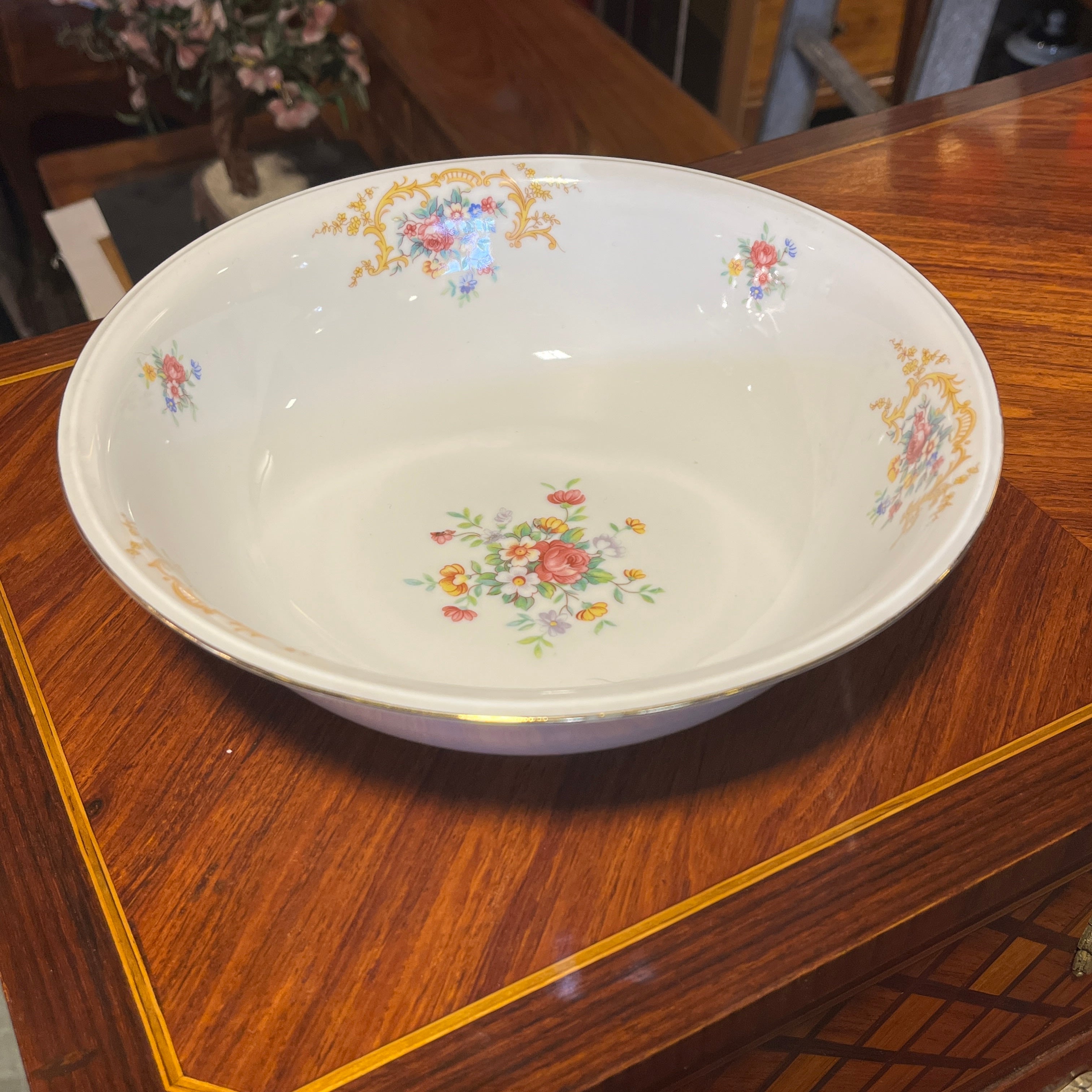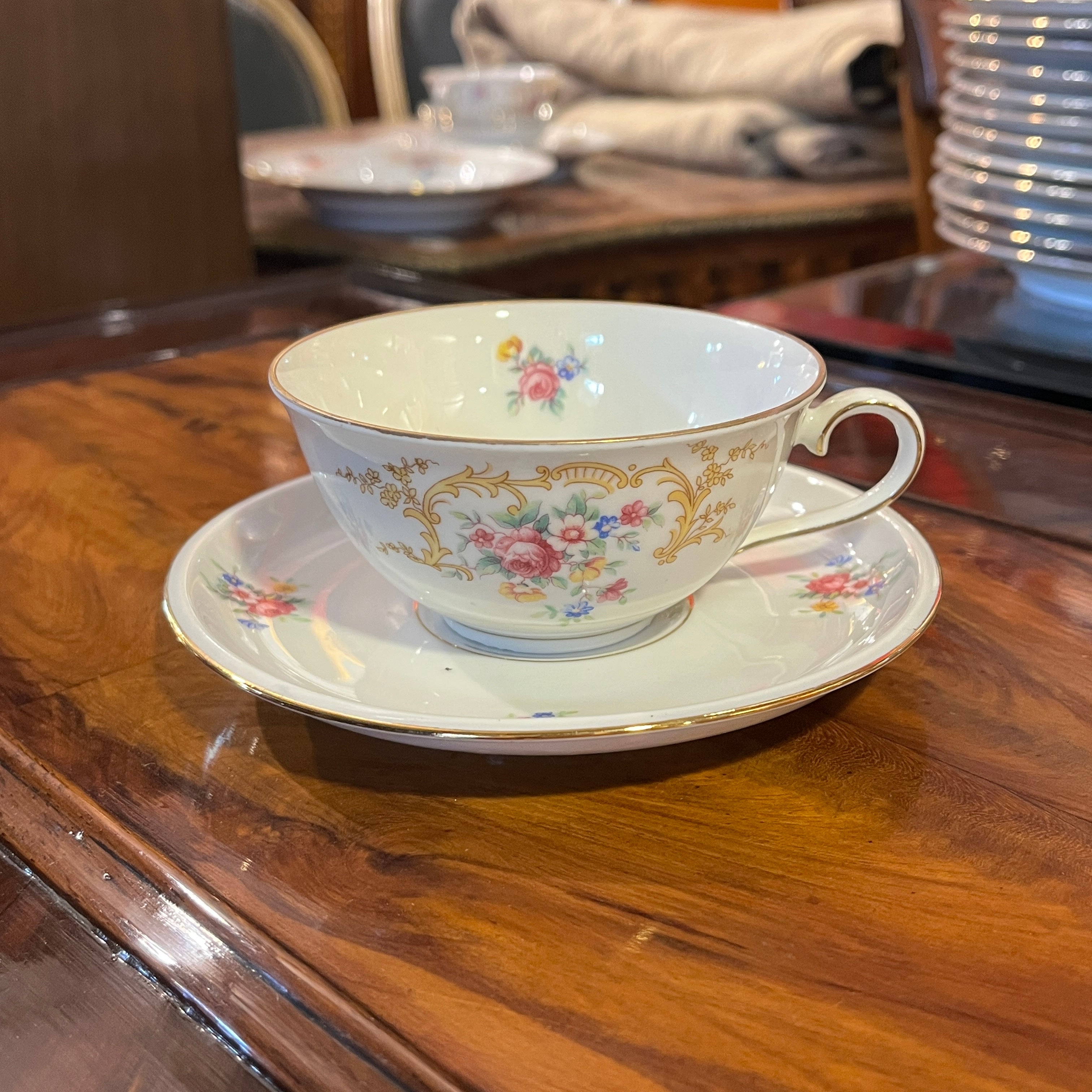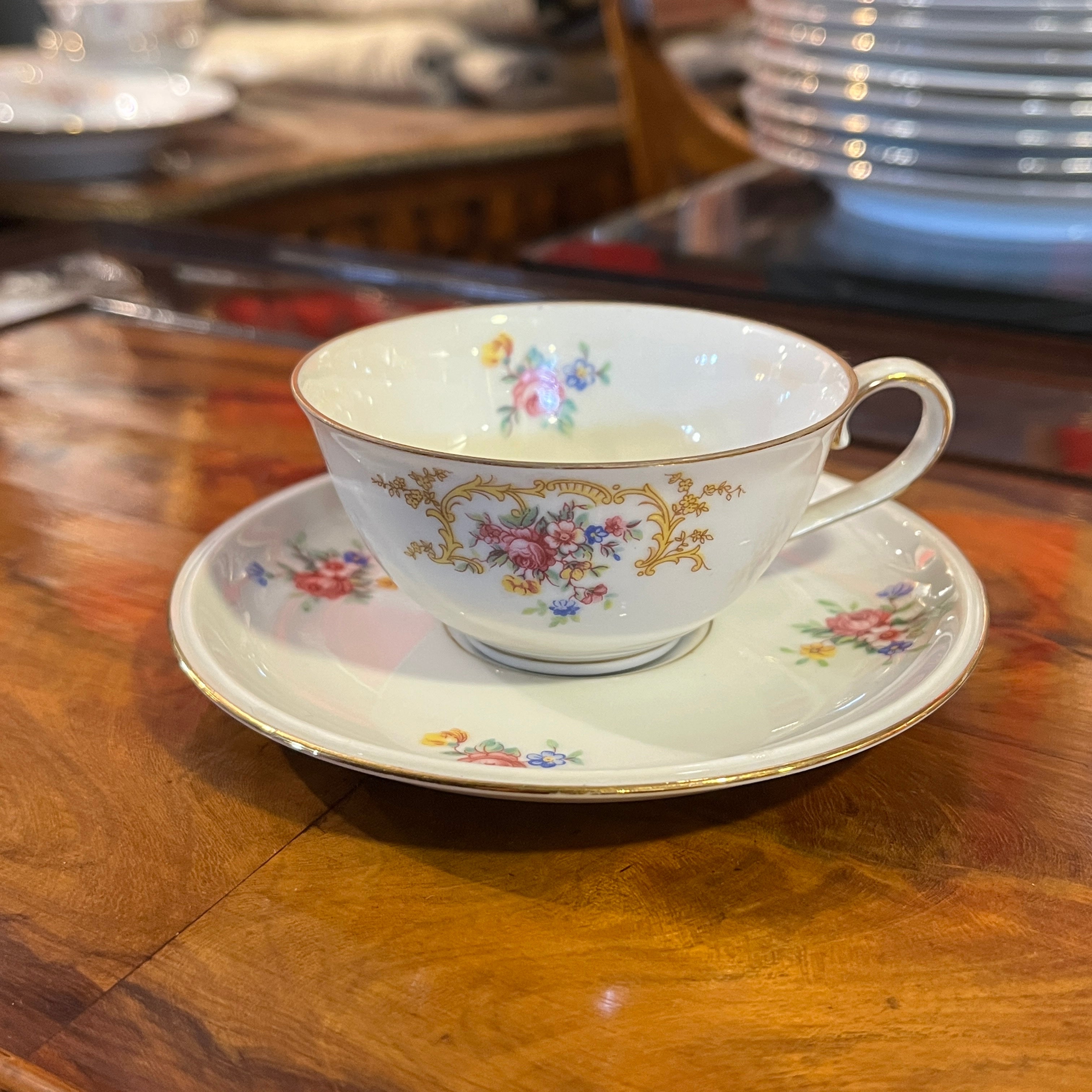 Gran juego de porcelana alemana Hutschenreuter, con un delicado diseño de flores y guirnaldas doradas, con terminaciones en dorado en sus asas y bordes. El juego incluye el juego de mesa, juego de té, café y diversas piezas de servir.