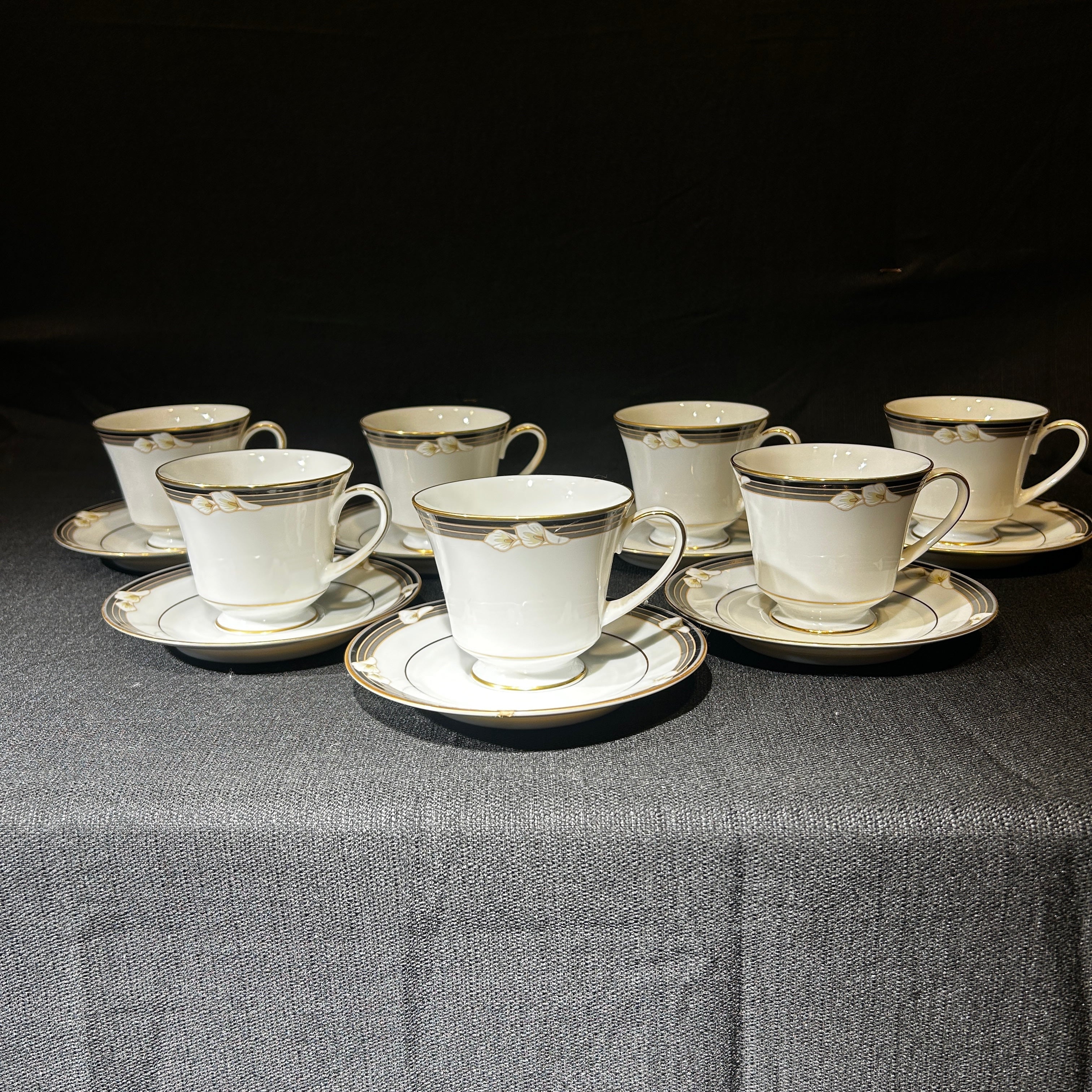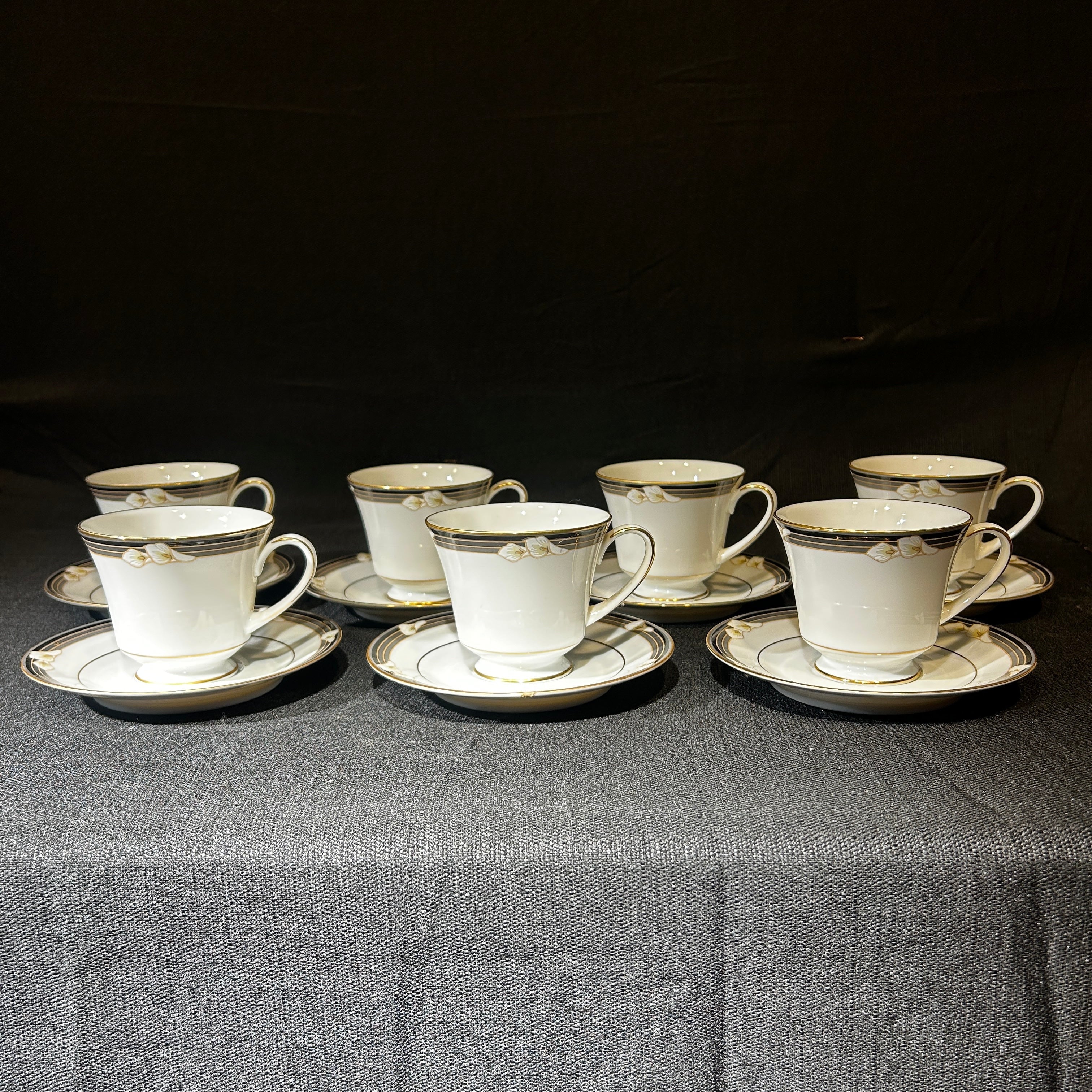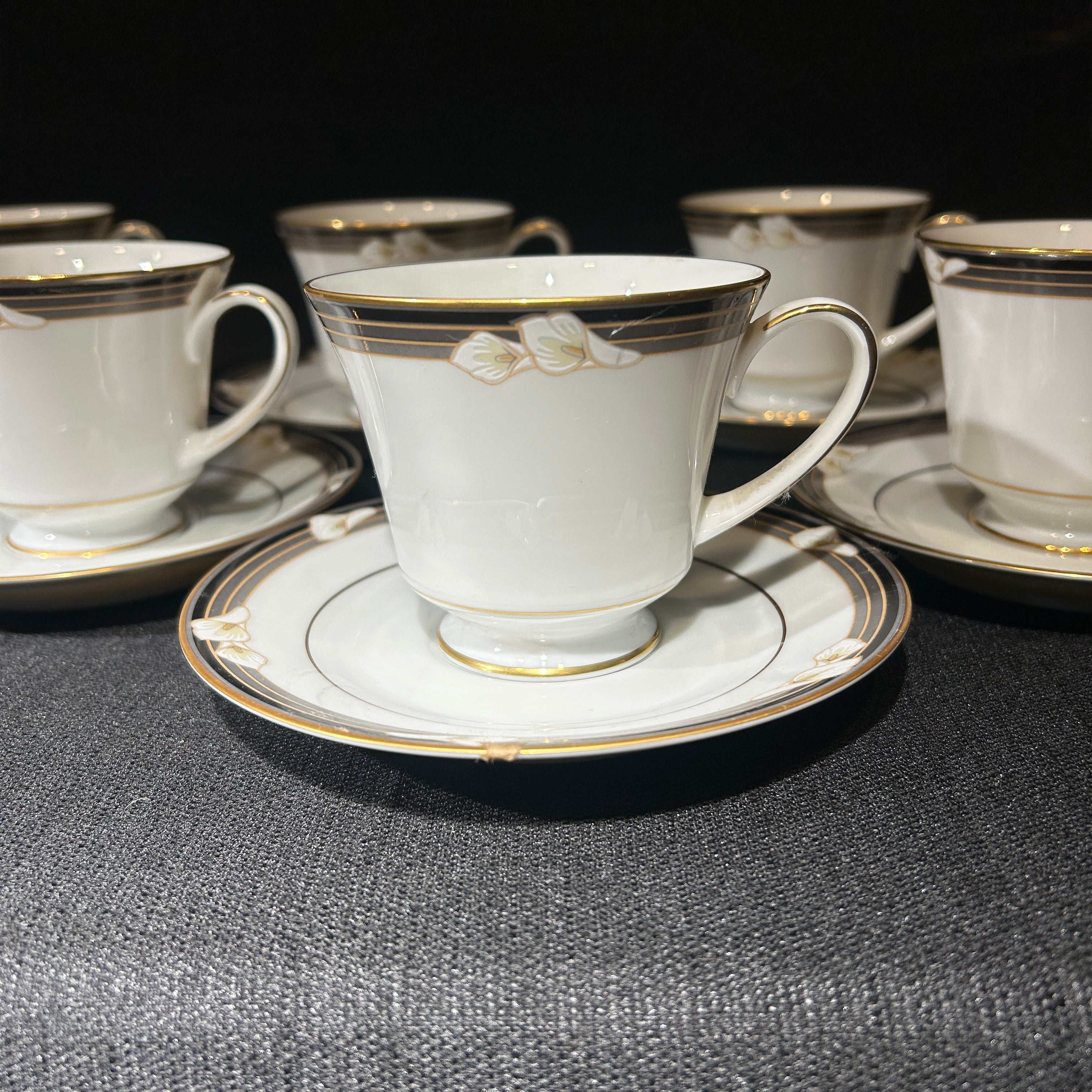 Maravilloso juego de té hecho en Filipinas de porcelana Noritake para 7 personas. Presenta lirios cala blancos sobre bandas negras y grises, con ribetes dorados. Japón, años 70.