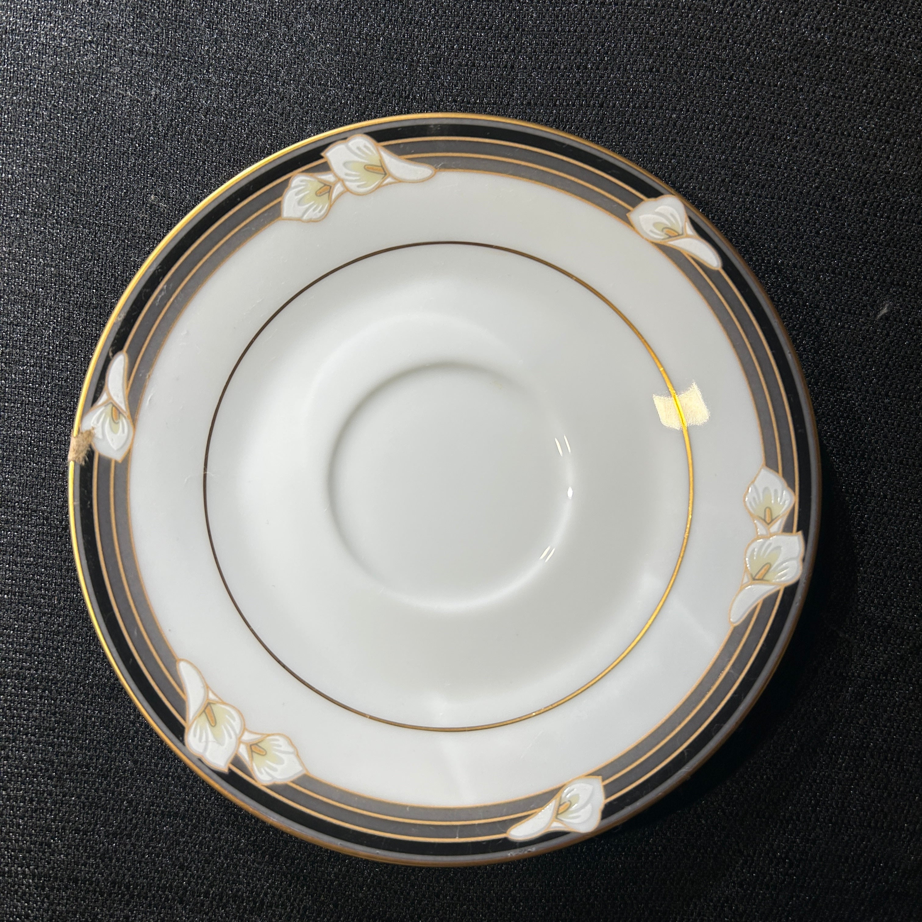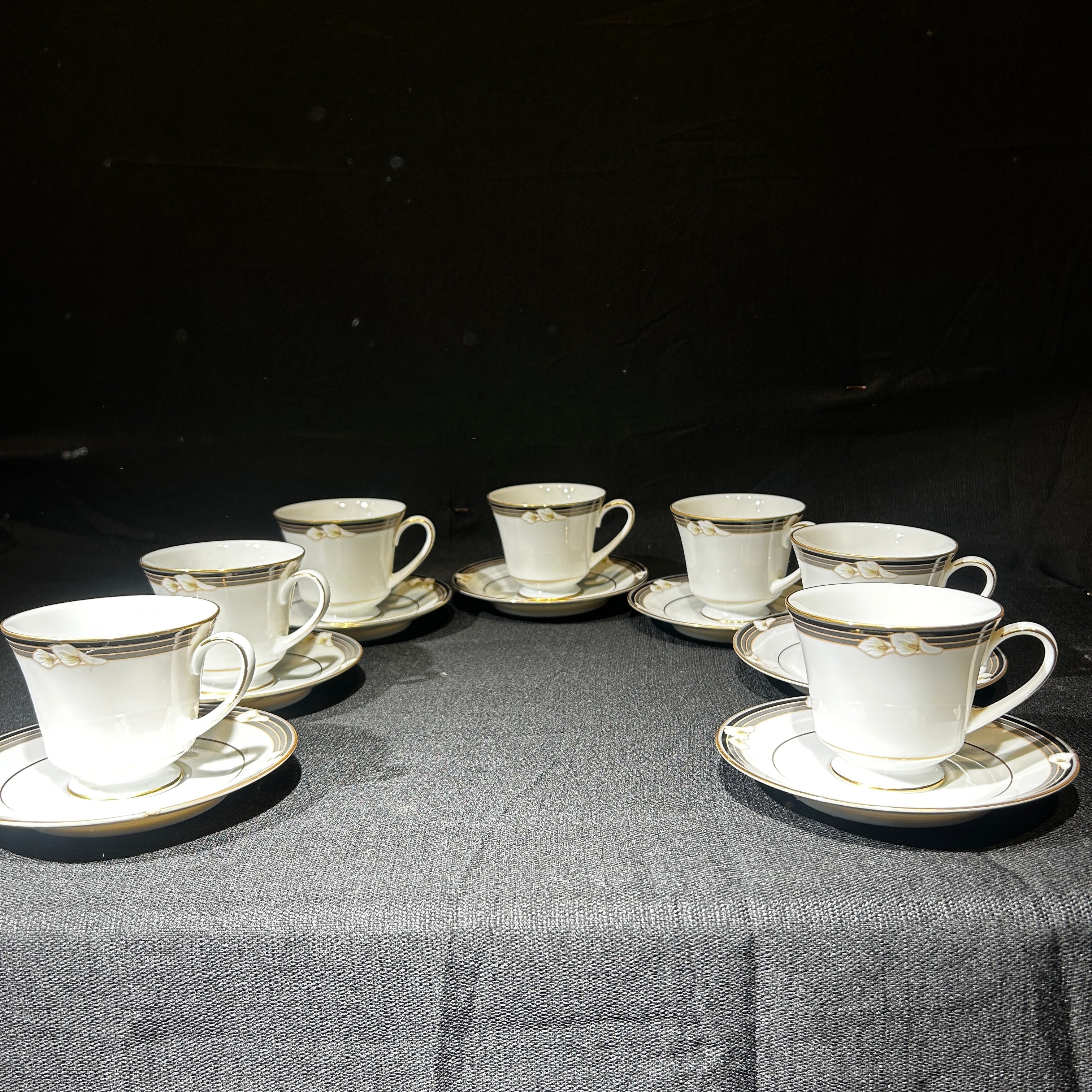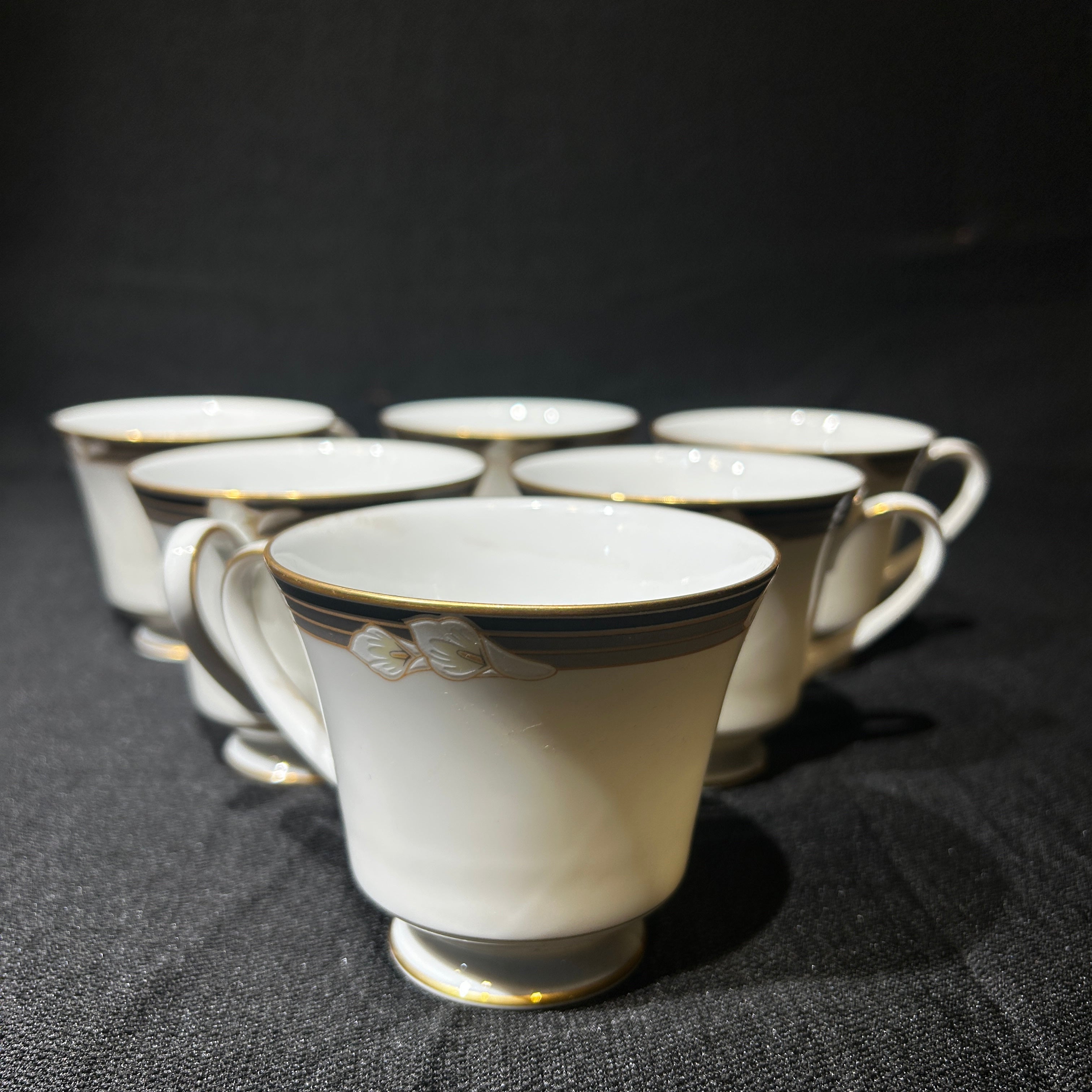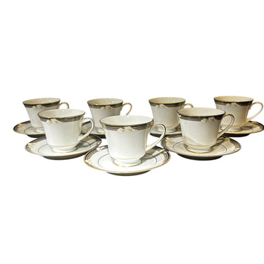 Maravilloso juego de té hecho en Filipinas de porcelana Noritake para 7 personas. Presenta lirios cala blancos sobre bandas negras y grises, con ribetes dorados. Japón, años 70.