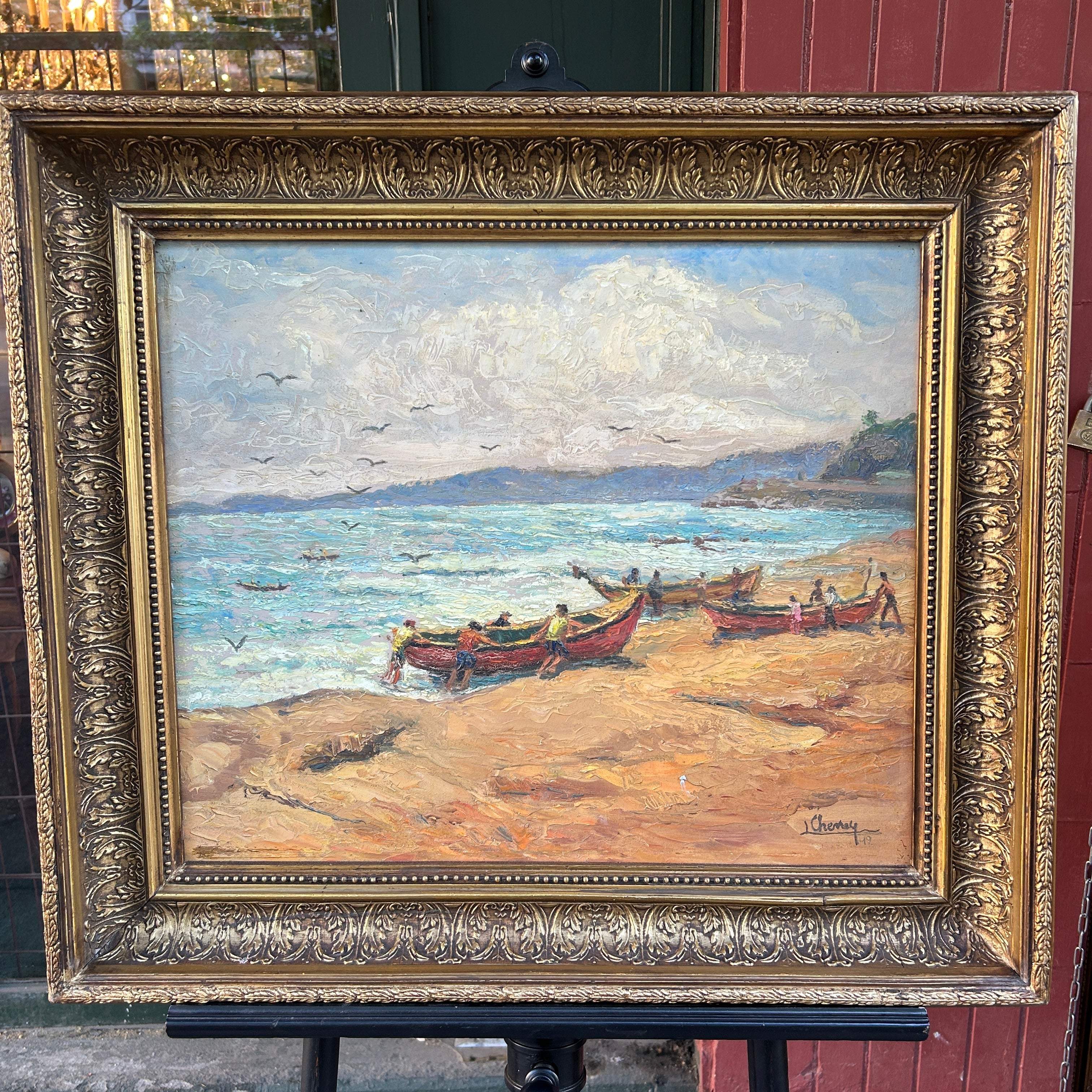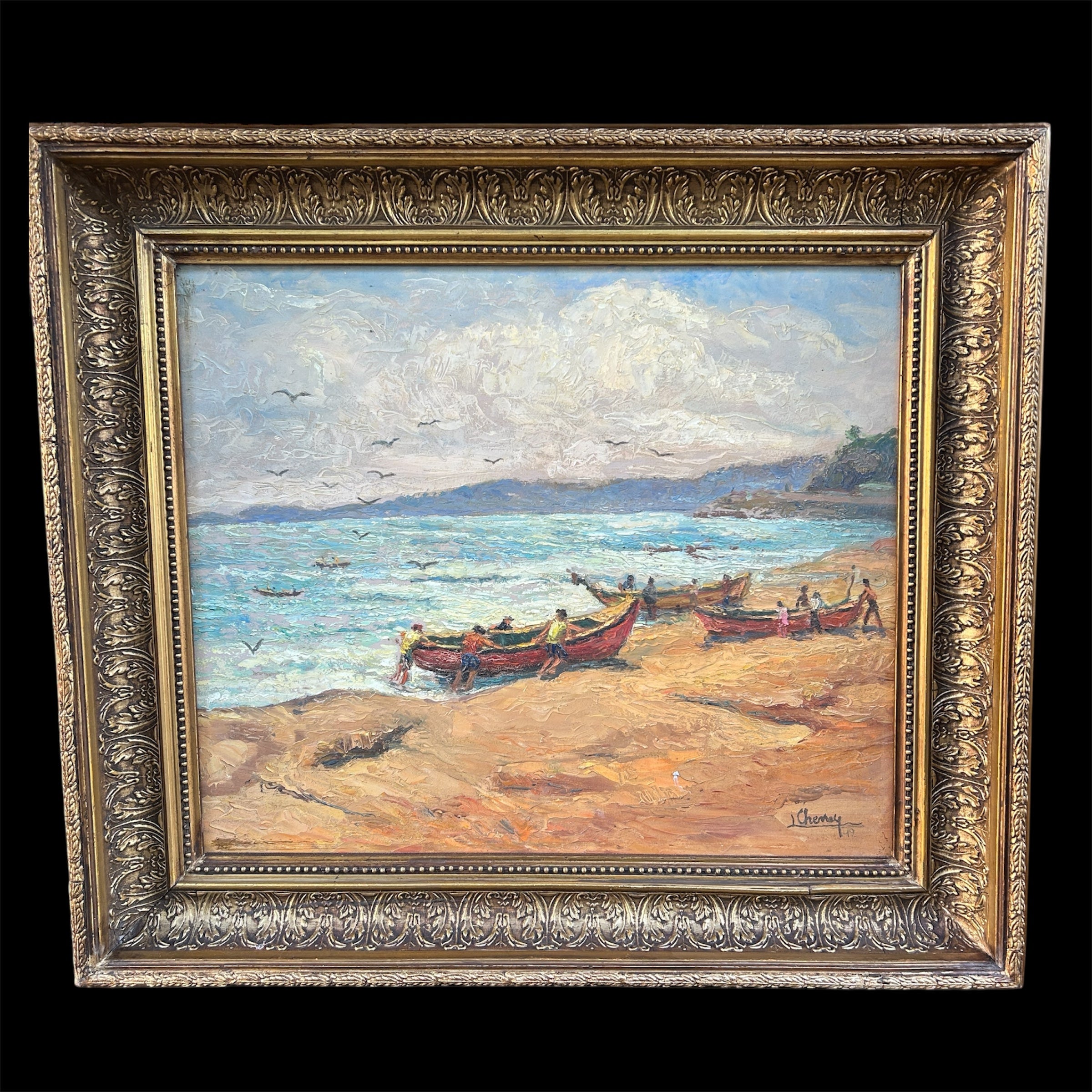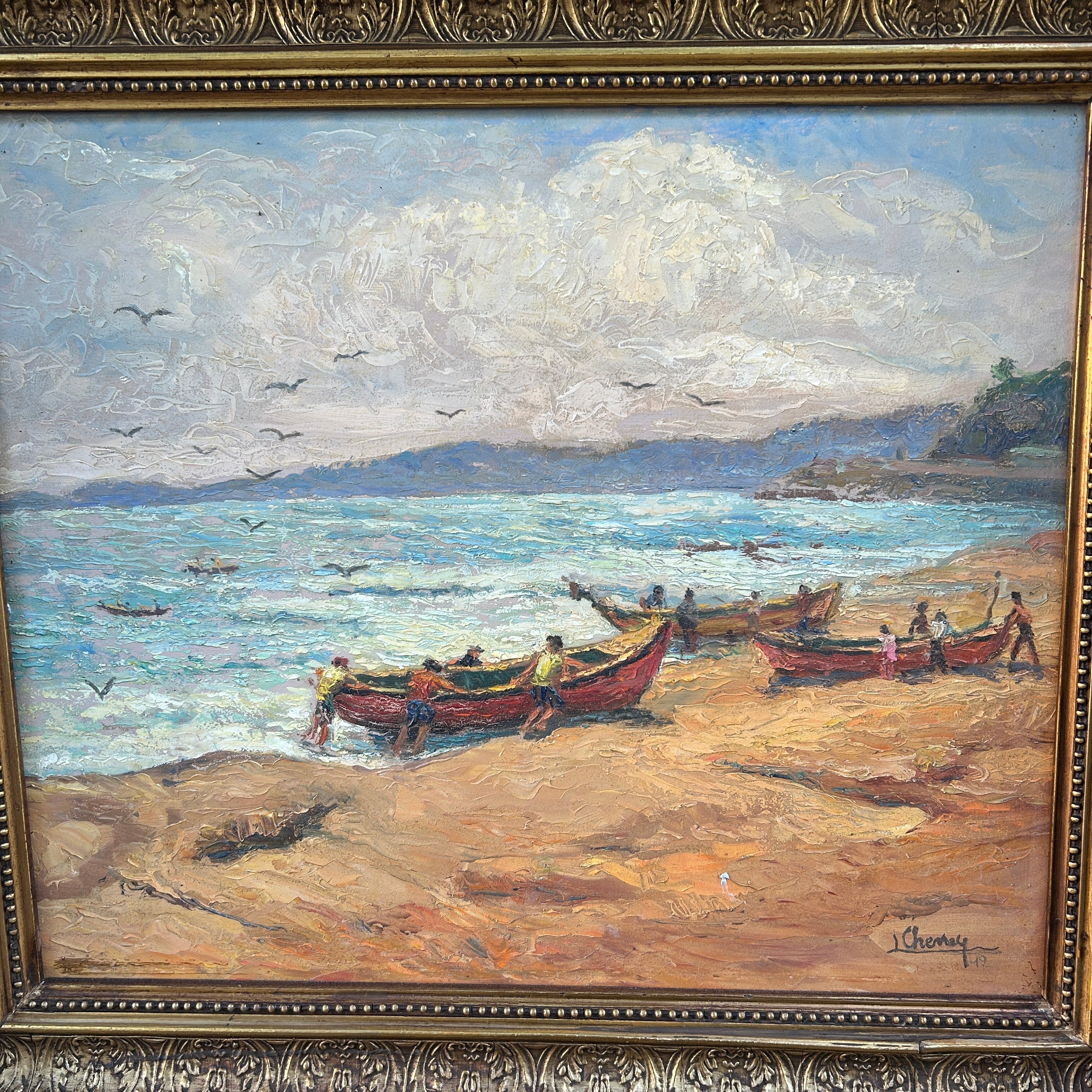 Óleo sobre cartón del artista chileno Ladislao Cheney, pintado en 1949, representando un paisaje costero, en el que tres botes pesqueros llegan a la costa y sus tripulantes tocan tierra, seguramente para bajar la pesca del día.