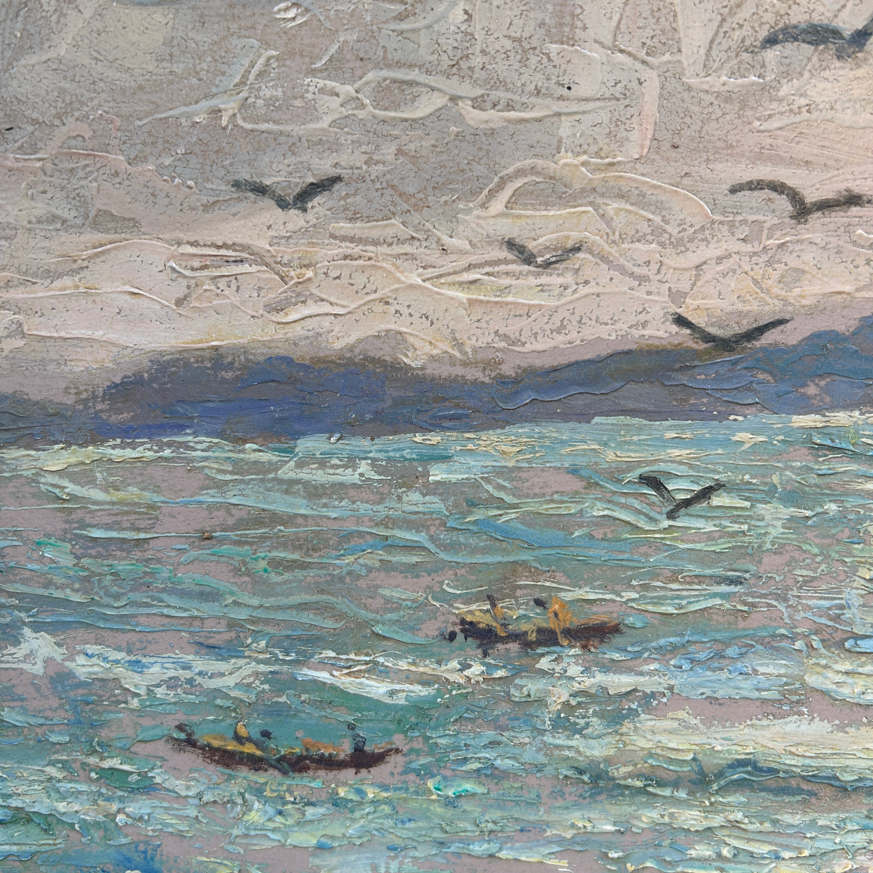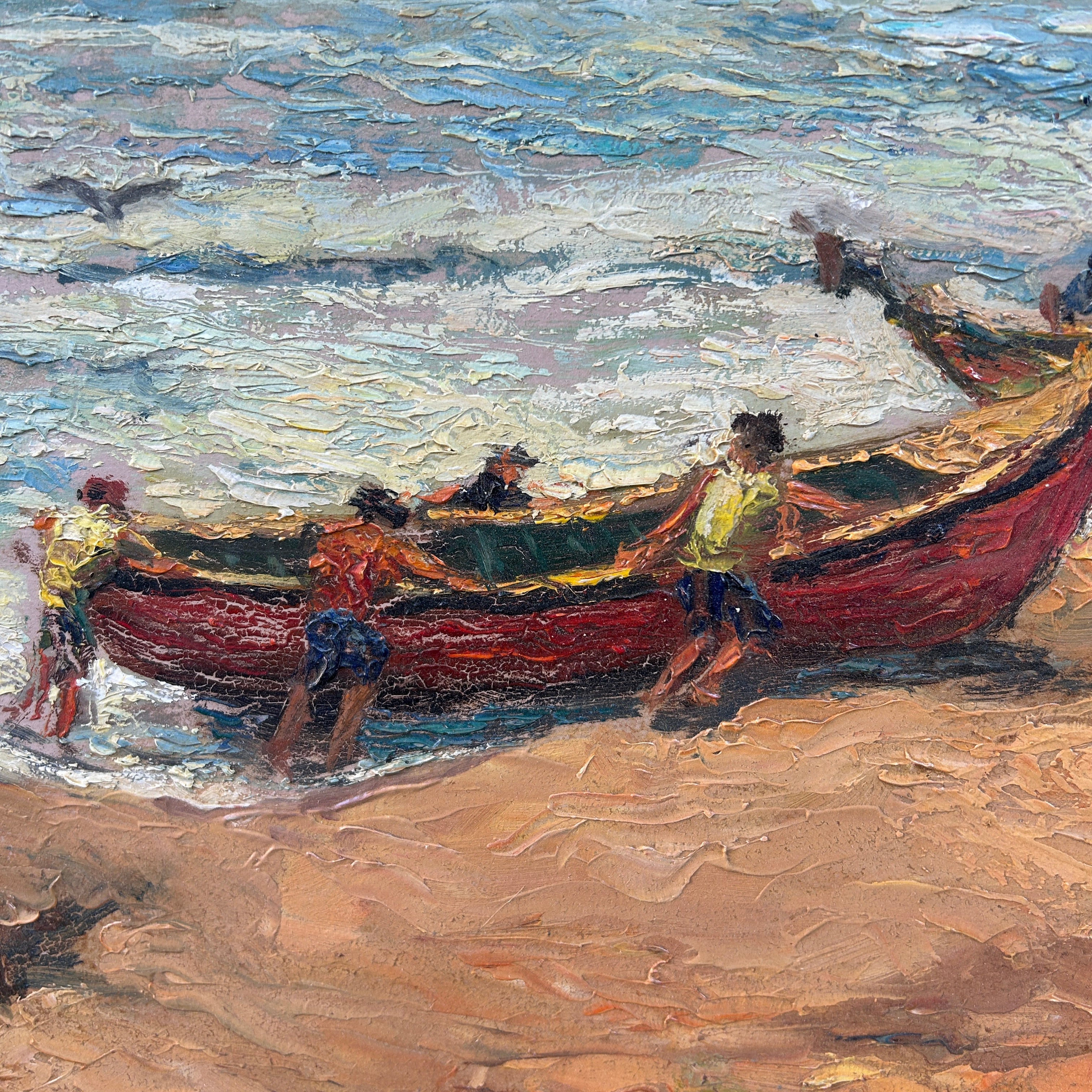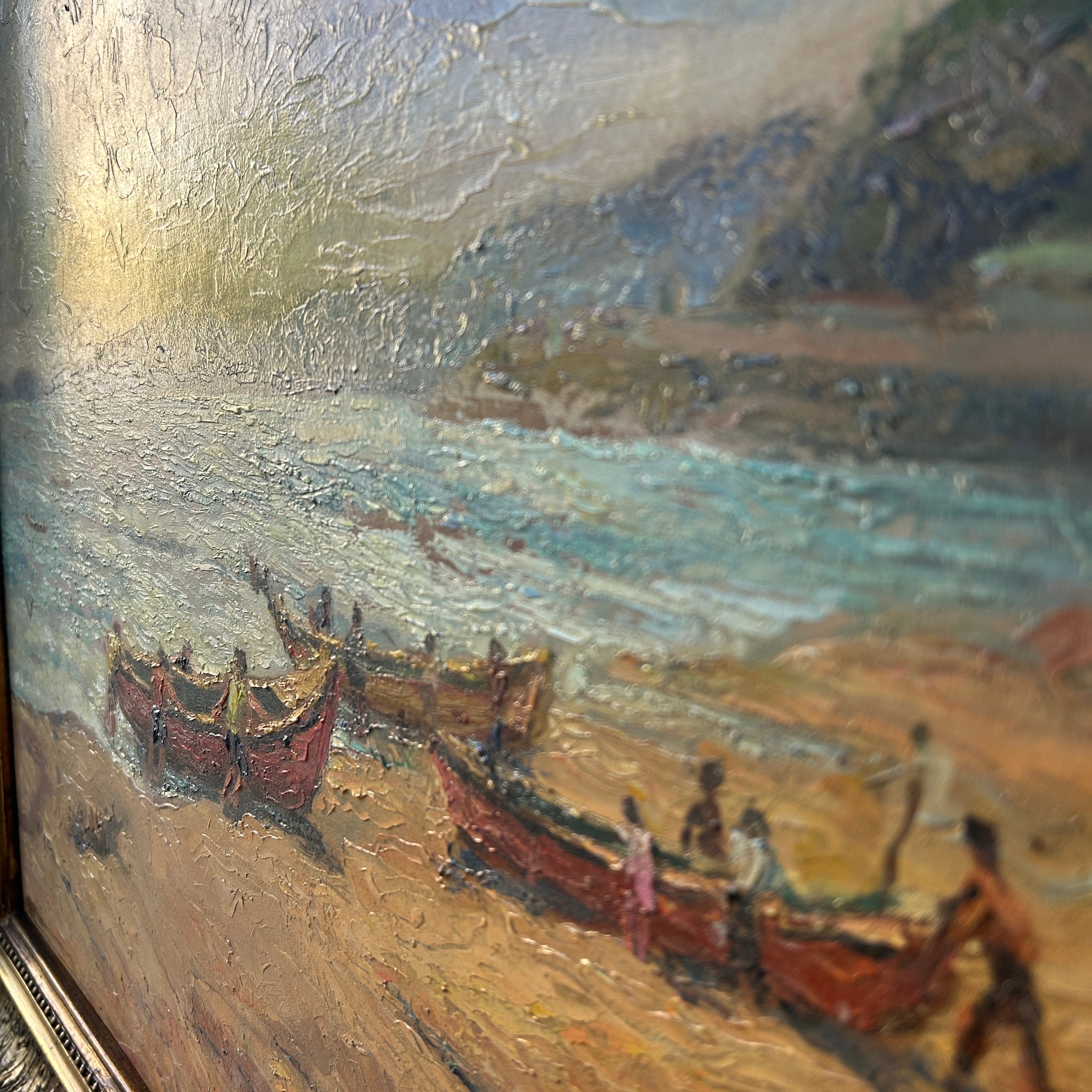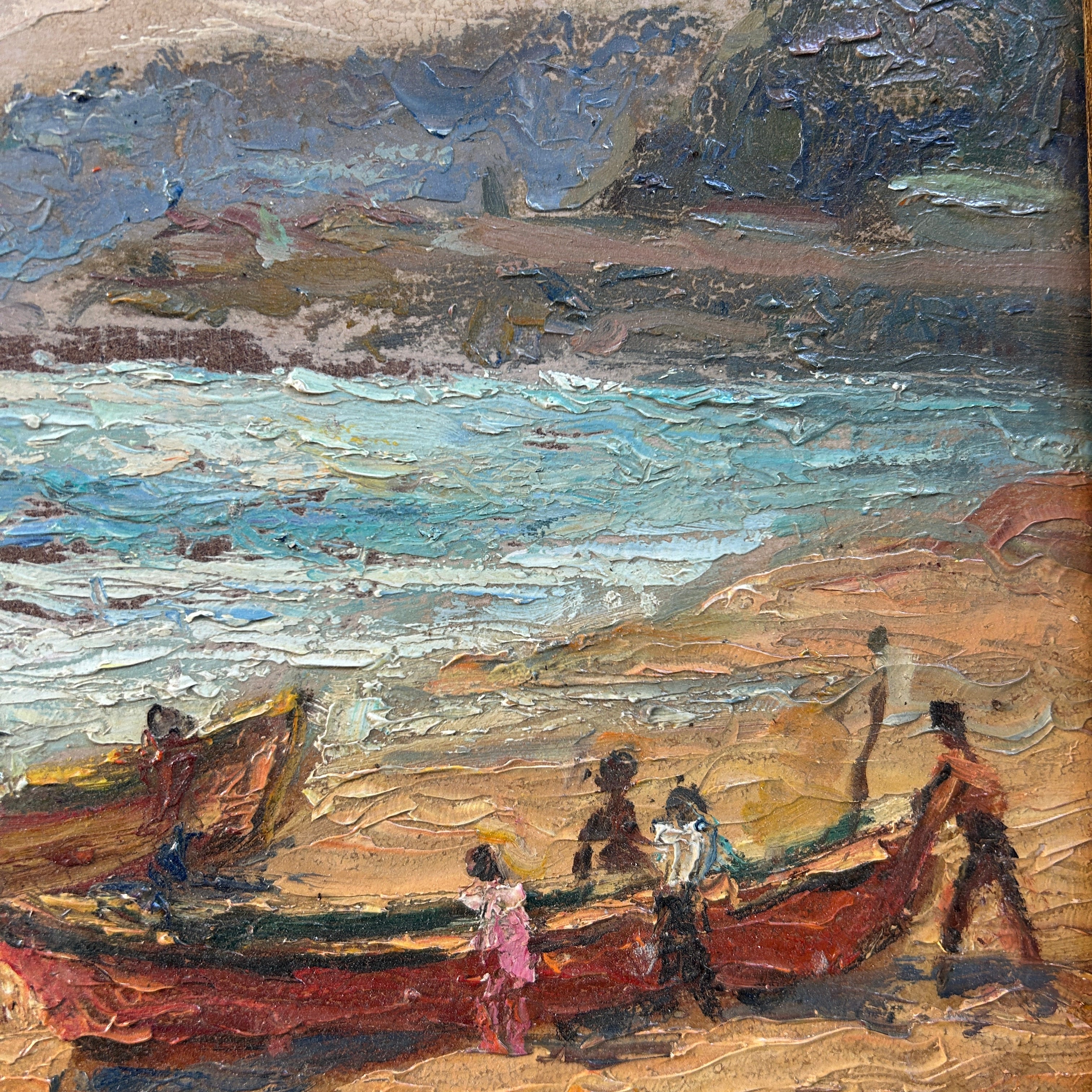 Óleo sobre cartón del artista chileno Ladislao Cheney, pintado en 1949, representando un paisaje costero, en el que tres botes pesqueros llegan a la costa y sus tripulantes tocan tierra, seguramente para bajar la pesca del día.