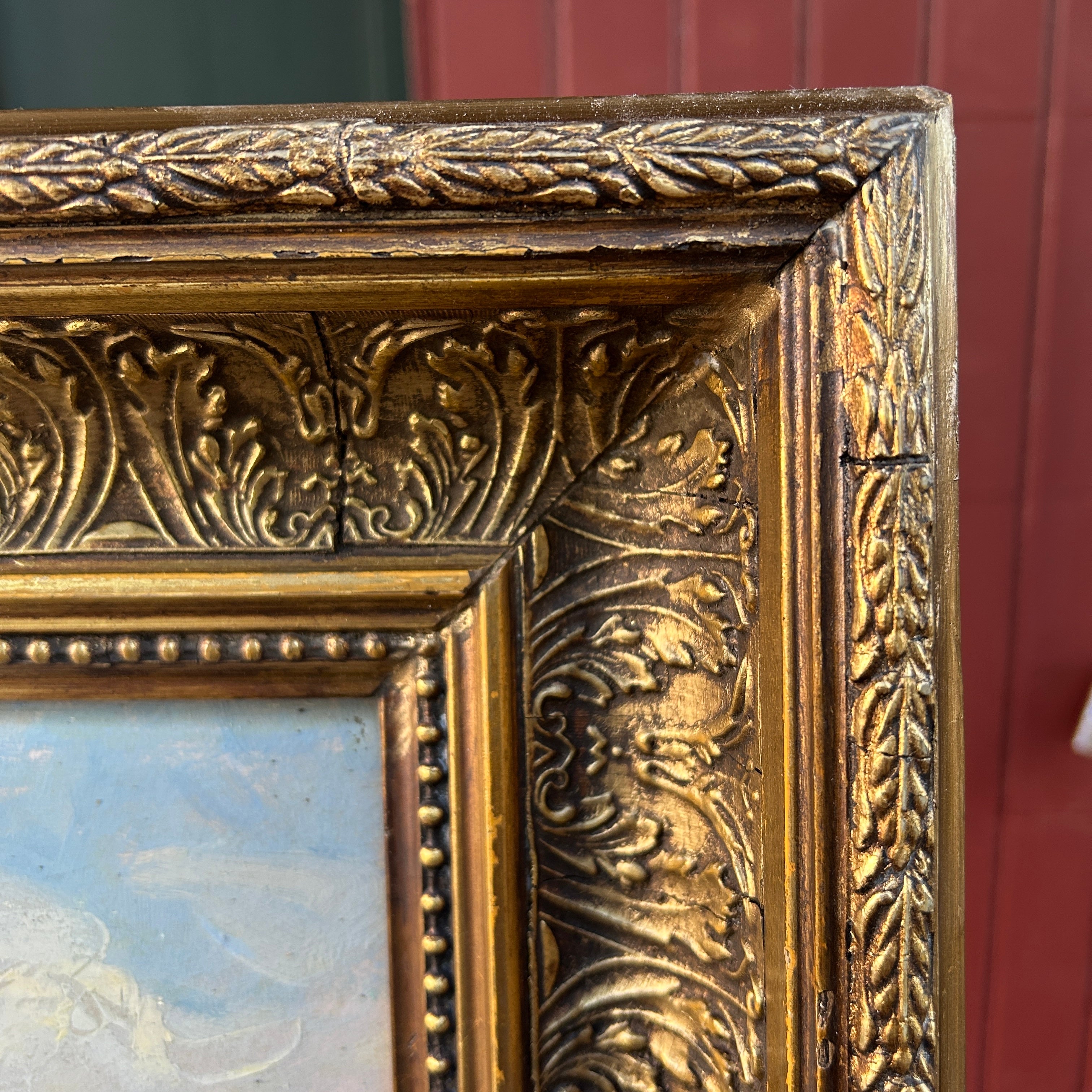 La obra está enmarcada en madera tallada en relieves y pintada de elegante dorado.