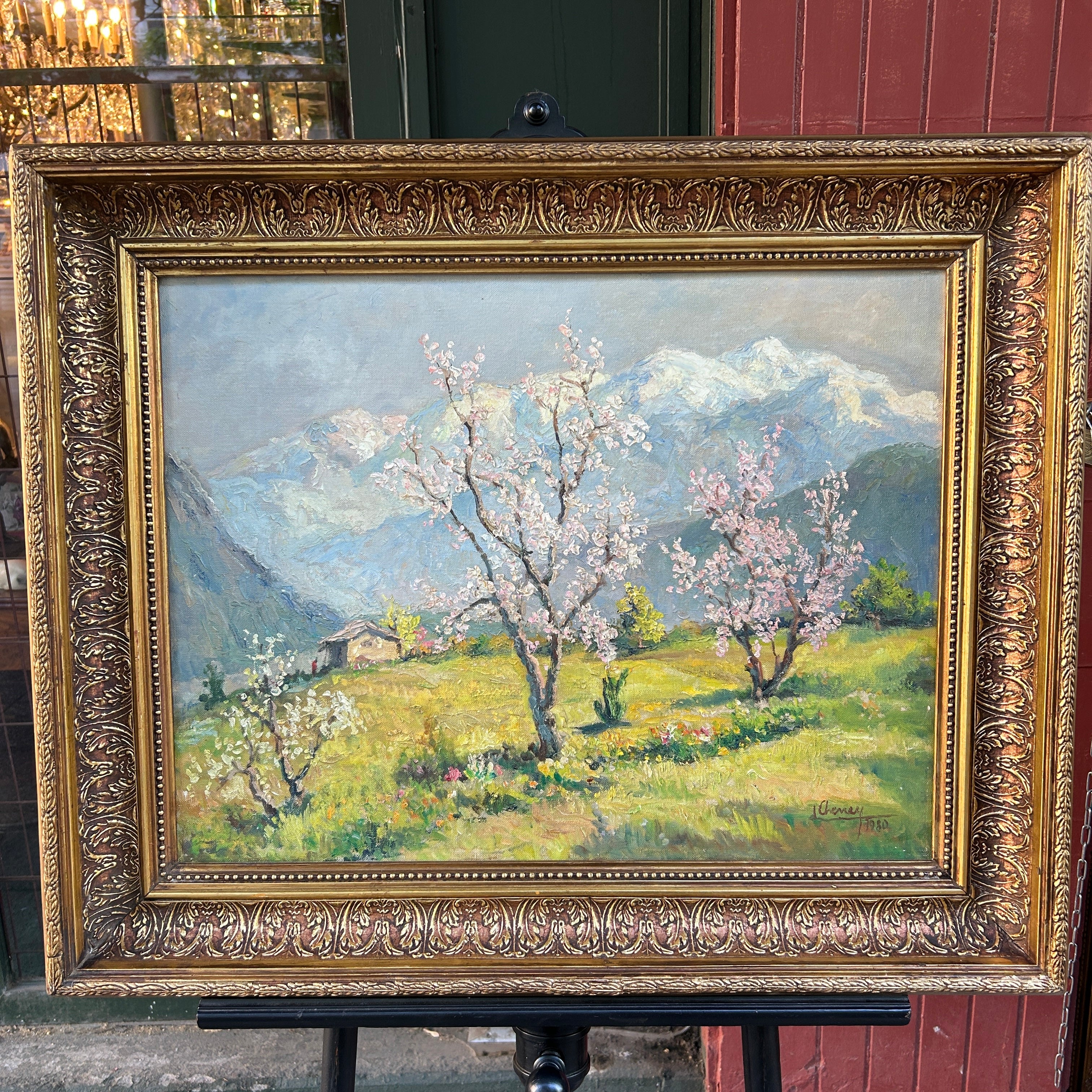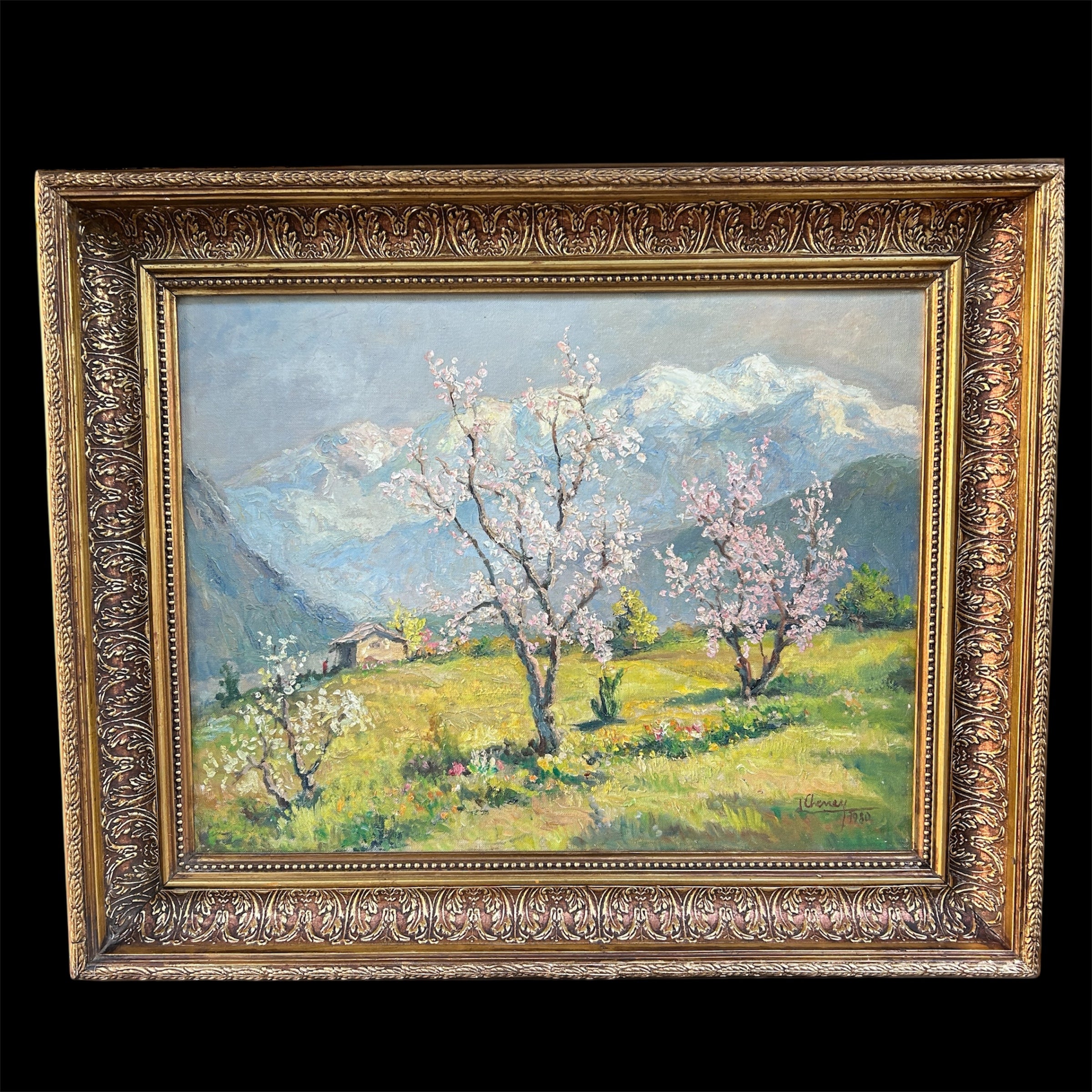 Óleo sobre tela del artista chileno Ladislao Cheney, pintado en 1980, representando un paisaje del cajón del Maipo con la cordillera de fondo, una casita y en primer plano tres cerezos florecidos, que aluden al nombre de la obra Primavera en Guayacán. La obra está enmarcada en madera tallada en relieves y pintado de elegante dorado.