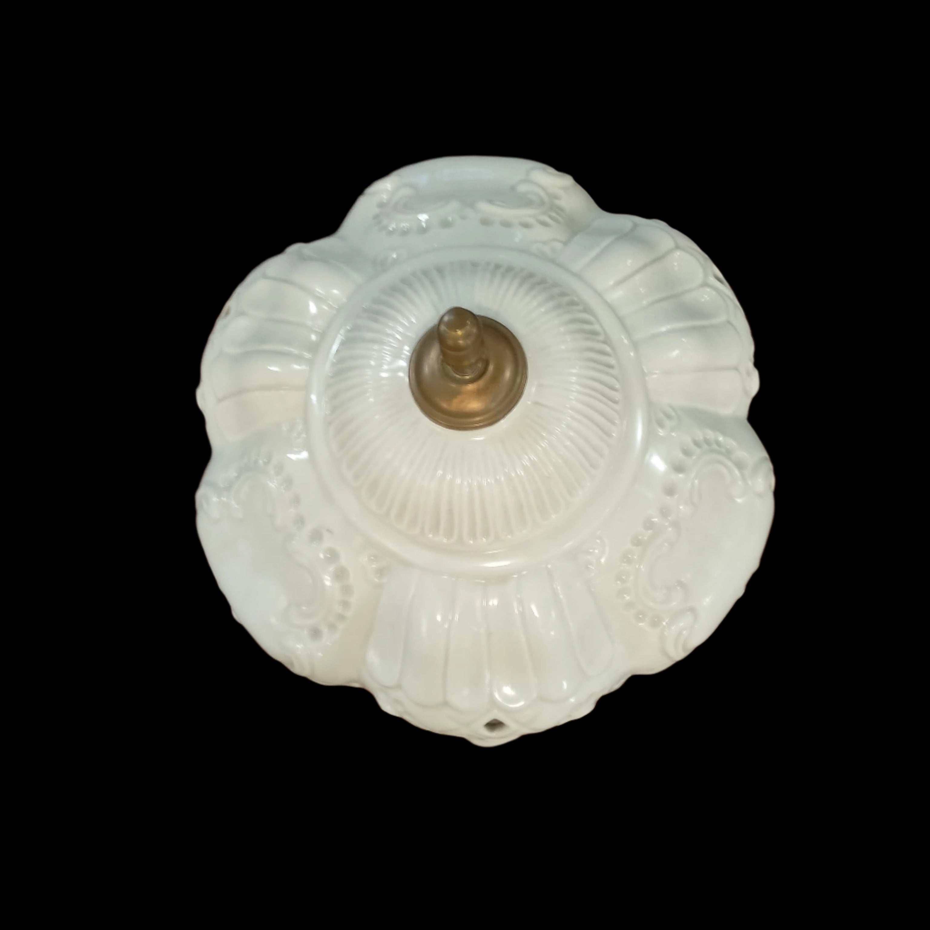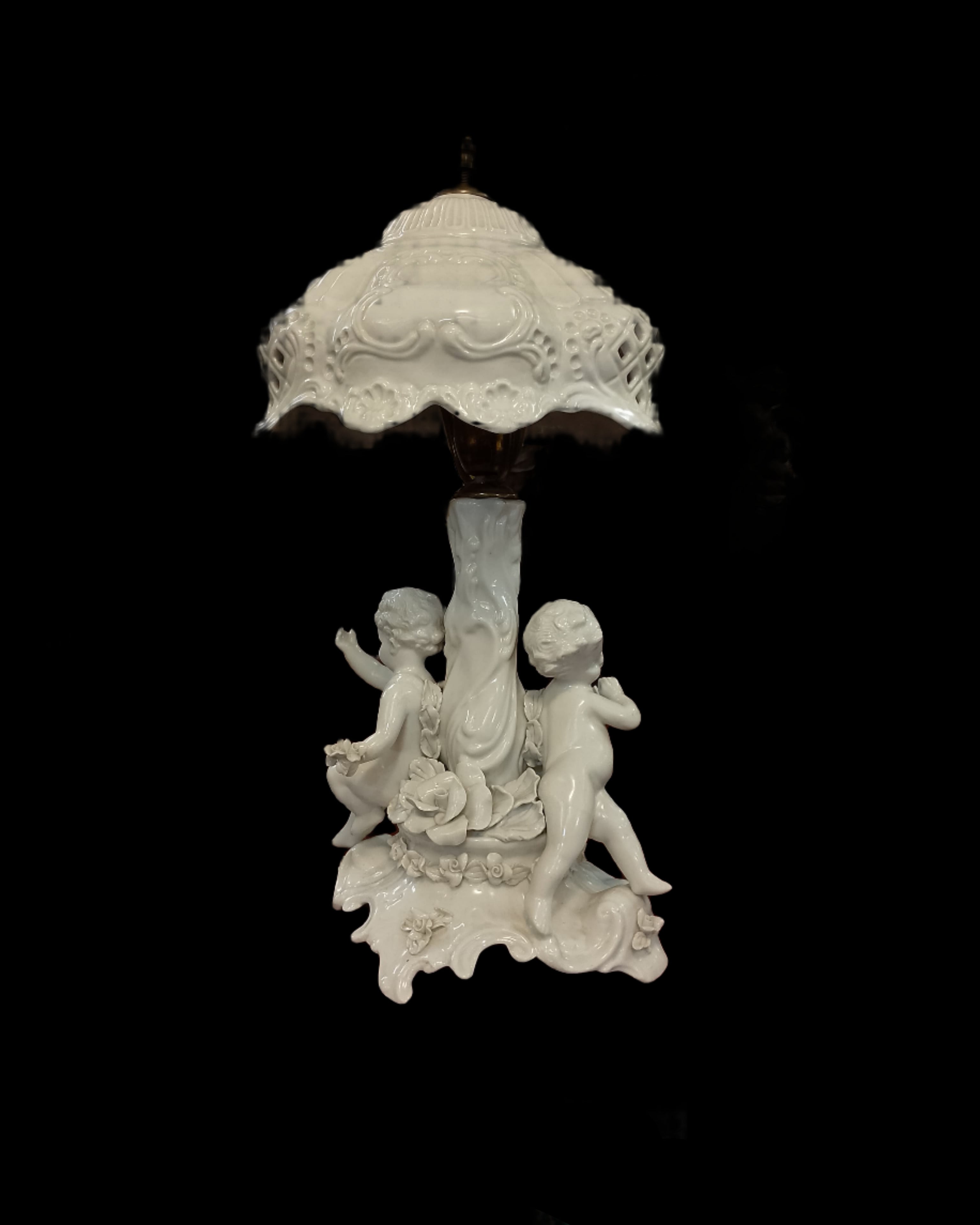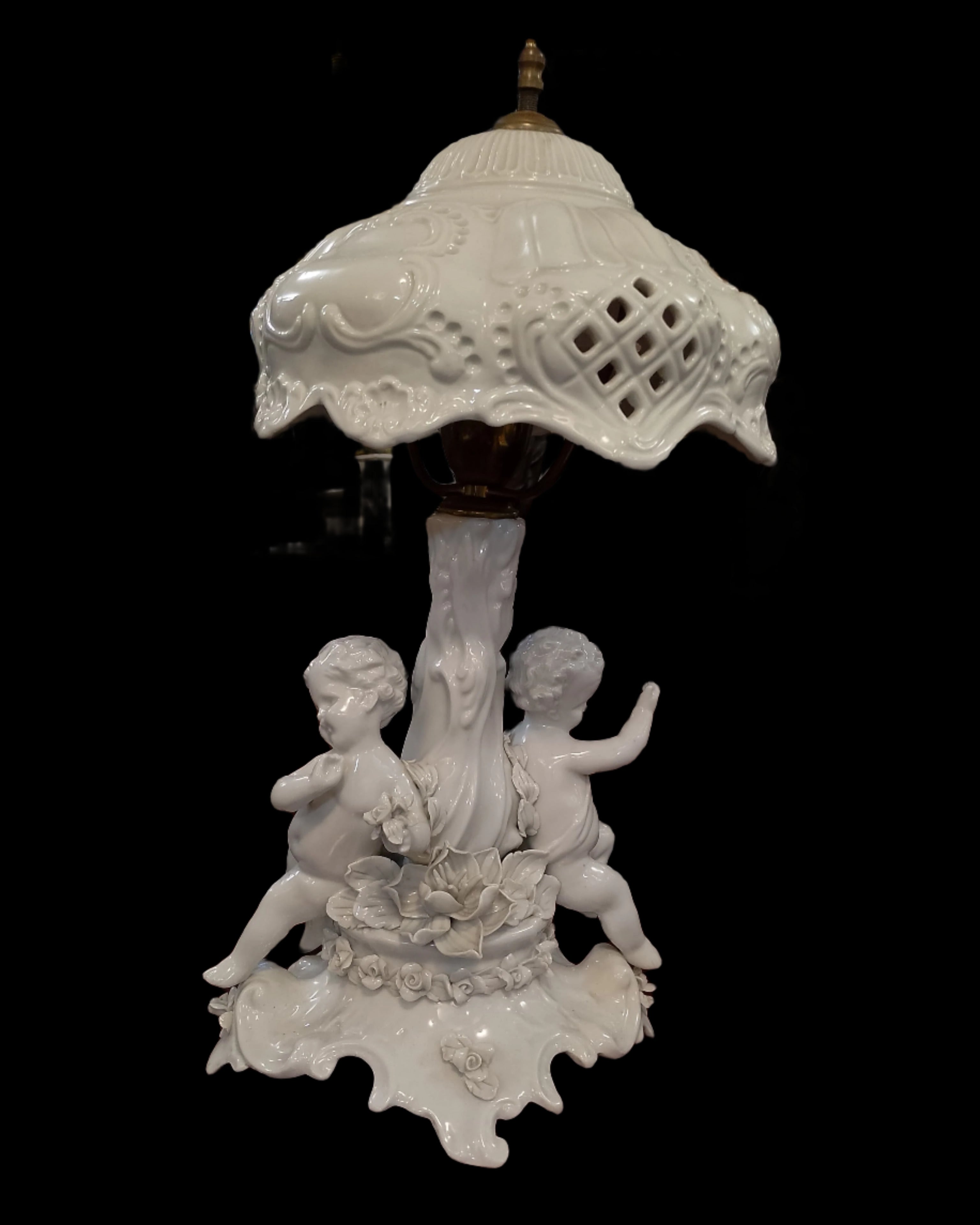 Élégante lampe en biscuit de porcelaine, une céramique non émaillée offrant une finition mate et une texture granuleuse. Son style, orné de figures décoratives de chérubins, est caractéristique de la production française et italienne du milieu du XIXe siècle. L'abat-jour présente un motif ajouré et festonné.