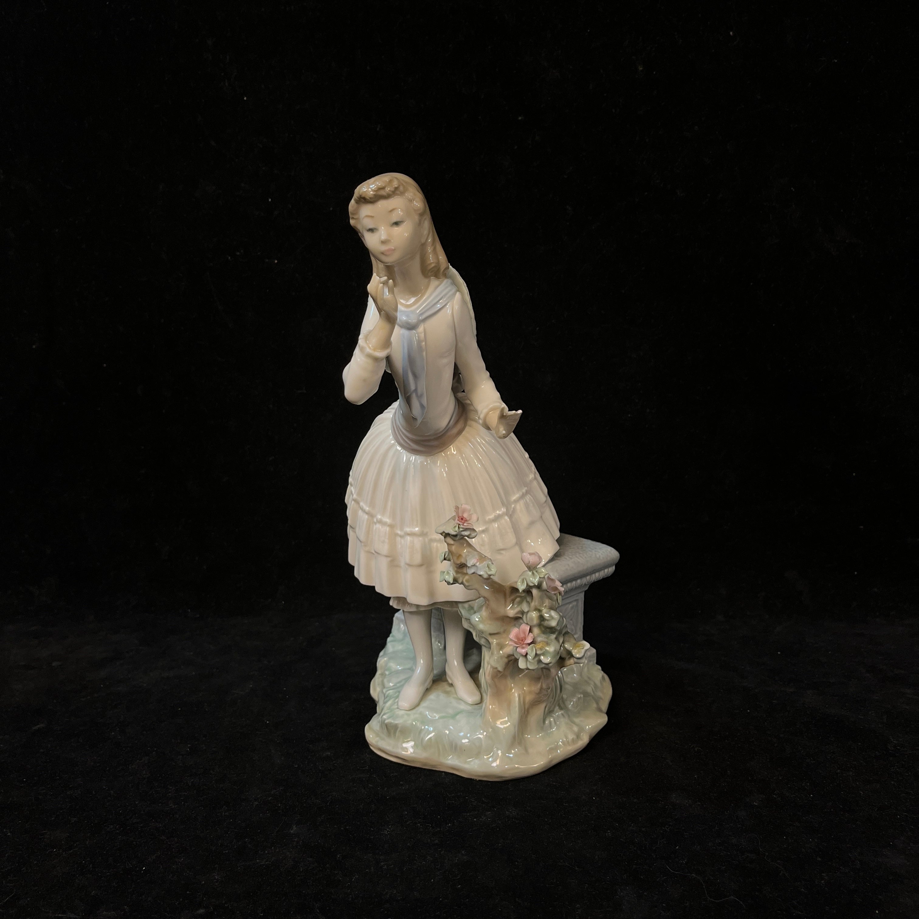 Preciosa figura de la reconocida marca de origen español, Lladró. La figura representa a una joven de pie con una banca a su espalda. Se la ve con un vestido blanco donde destacan los detalles de sus pliegues y un pequeño arbusto a sus pies.