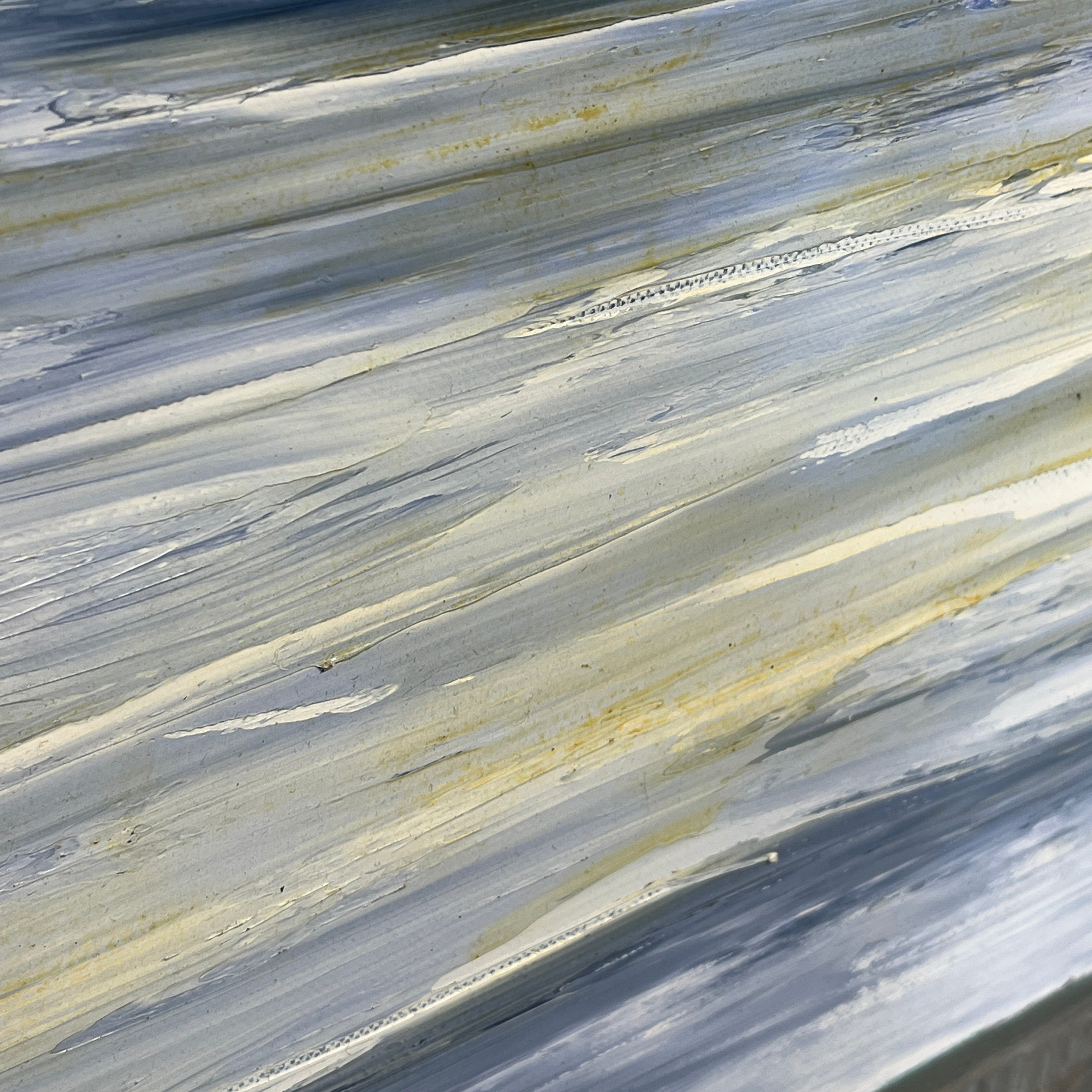 Óleo sobre tela del pintor Luis Márquez P. La obra representa un paisaje en el que se ve un cerro y un pastizal, pintados con trazos expresivos y una mezcla de tonos de verde, que van desde tonos oscuros hasta una combinación con amarillo. La obra sugiere una recorte del paisaje, similar a la vista de un viaje en carretera por Chile.