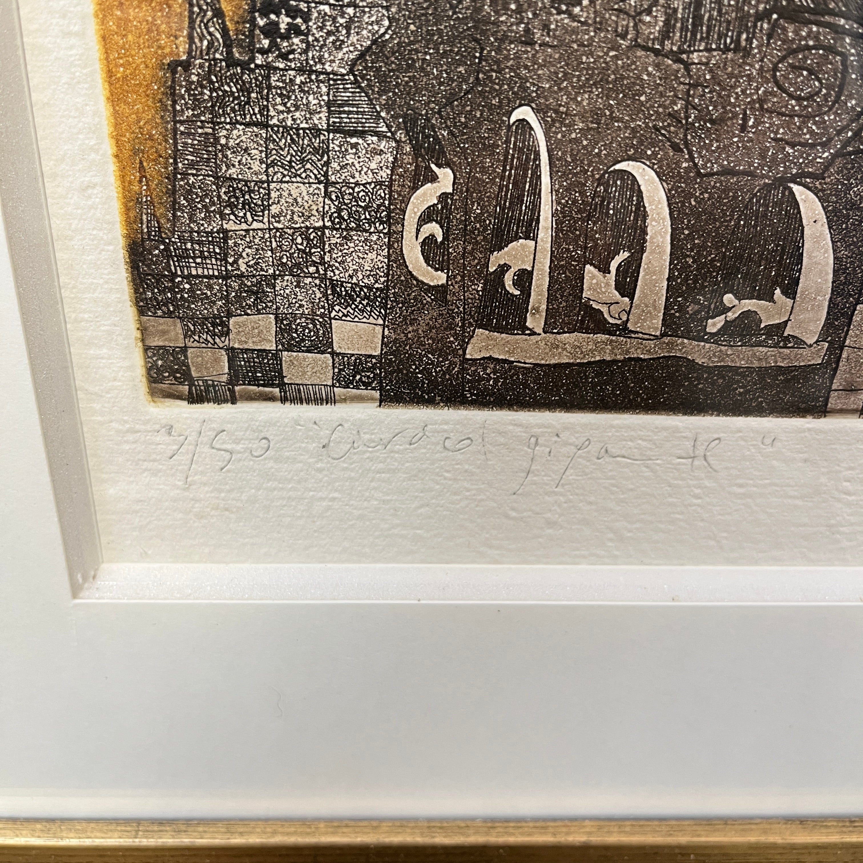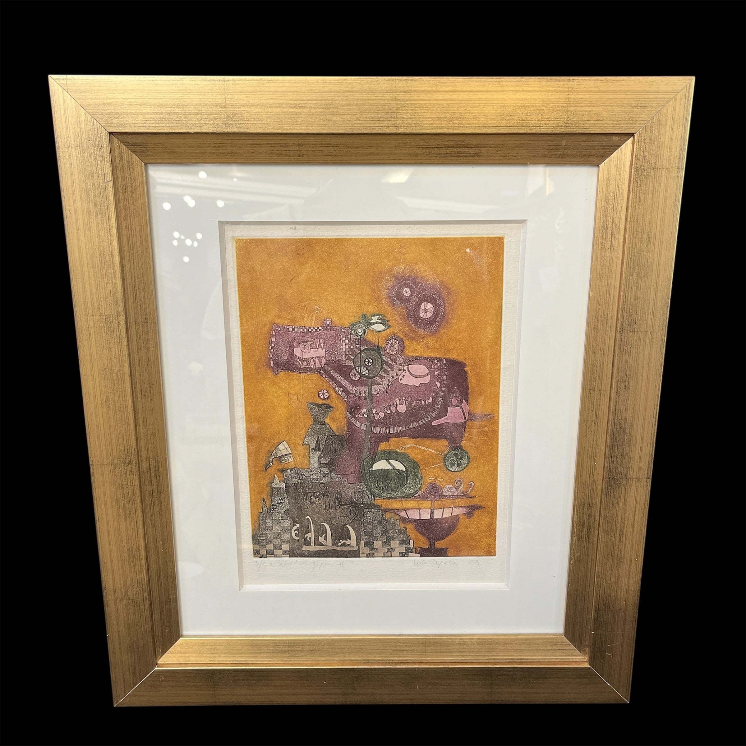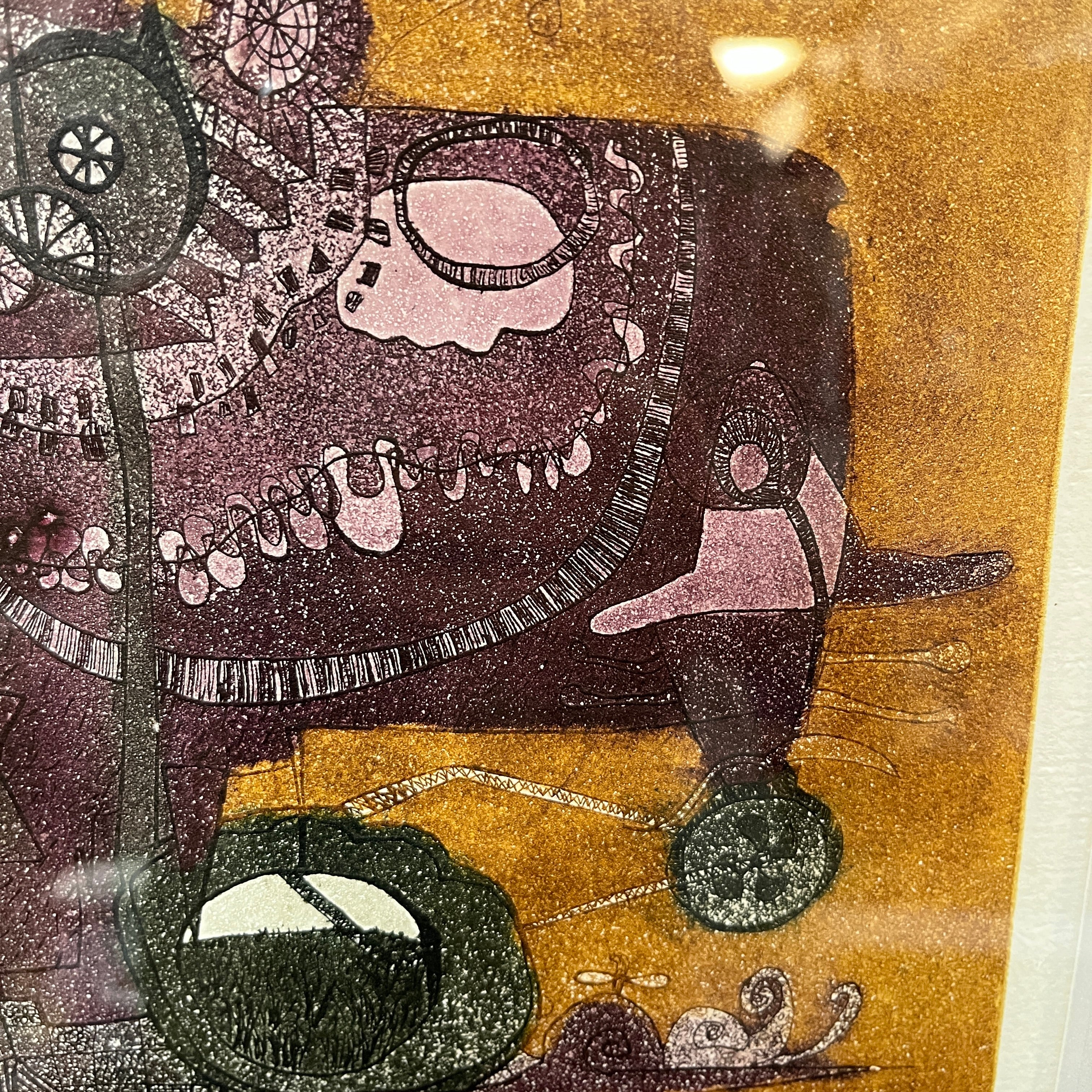Grabado del pintor y grabador chileno, originario de Concepción, Luis Zapata. La obra, titulada Caracol Gigante, hace una construcción con cierto grado de abstracción, uniendo elementos no reconocibles a primera vista. El artista usa colores presentes en algunas de sus demás obras, como el morado y el amarillo, haciendo un buen contraste entre forma y fondo. Al mirar en detalle, la textura de puntillismo del grabado responde a la técnica utilizada por el artista de grabado en metal. La obra está enmarcada en madera de diseño sobrio y acabado dorado.