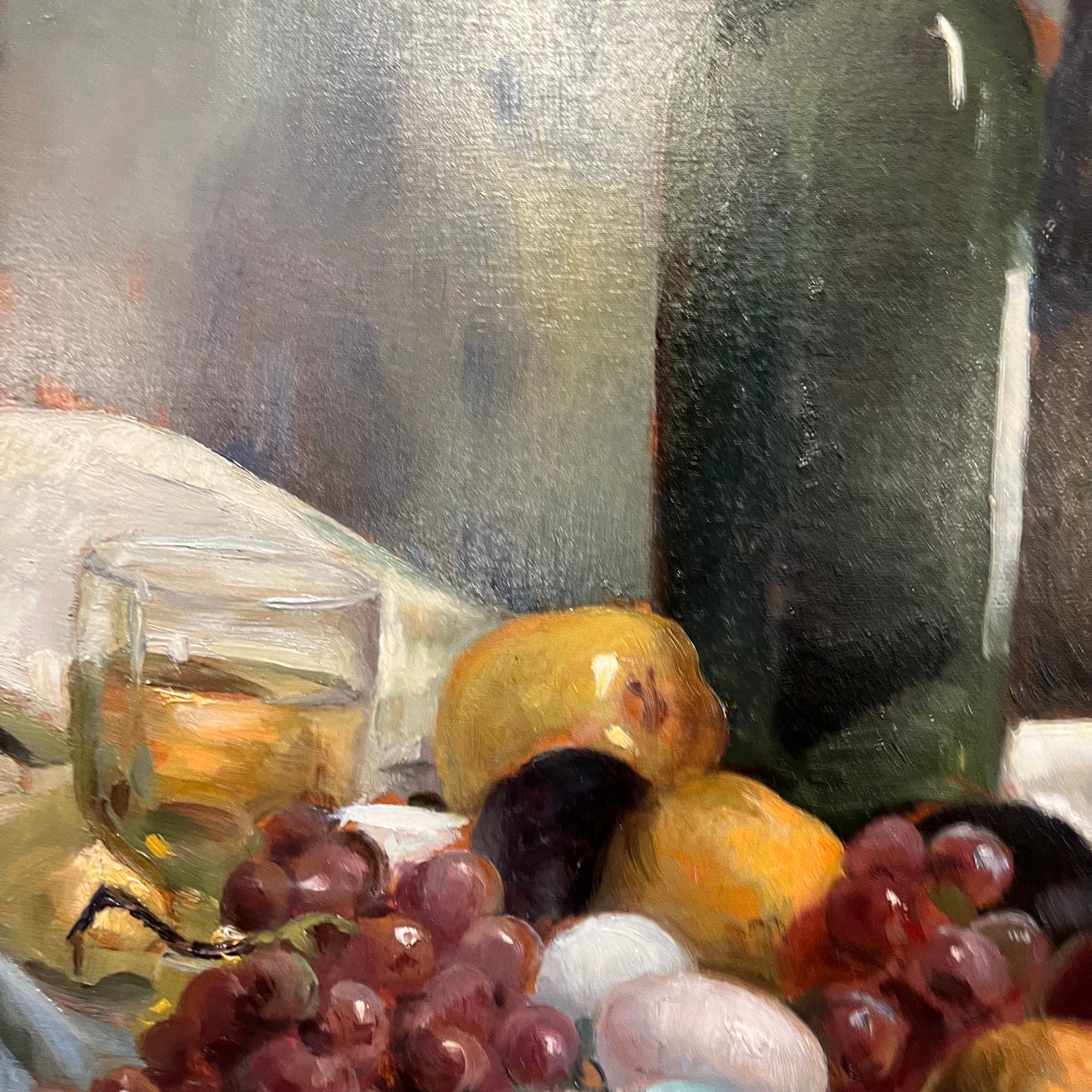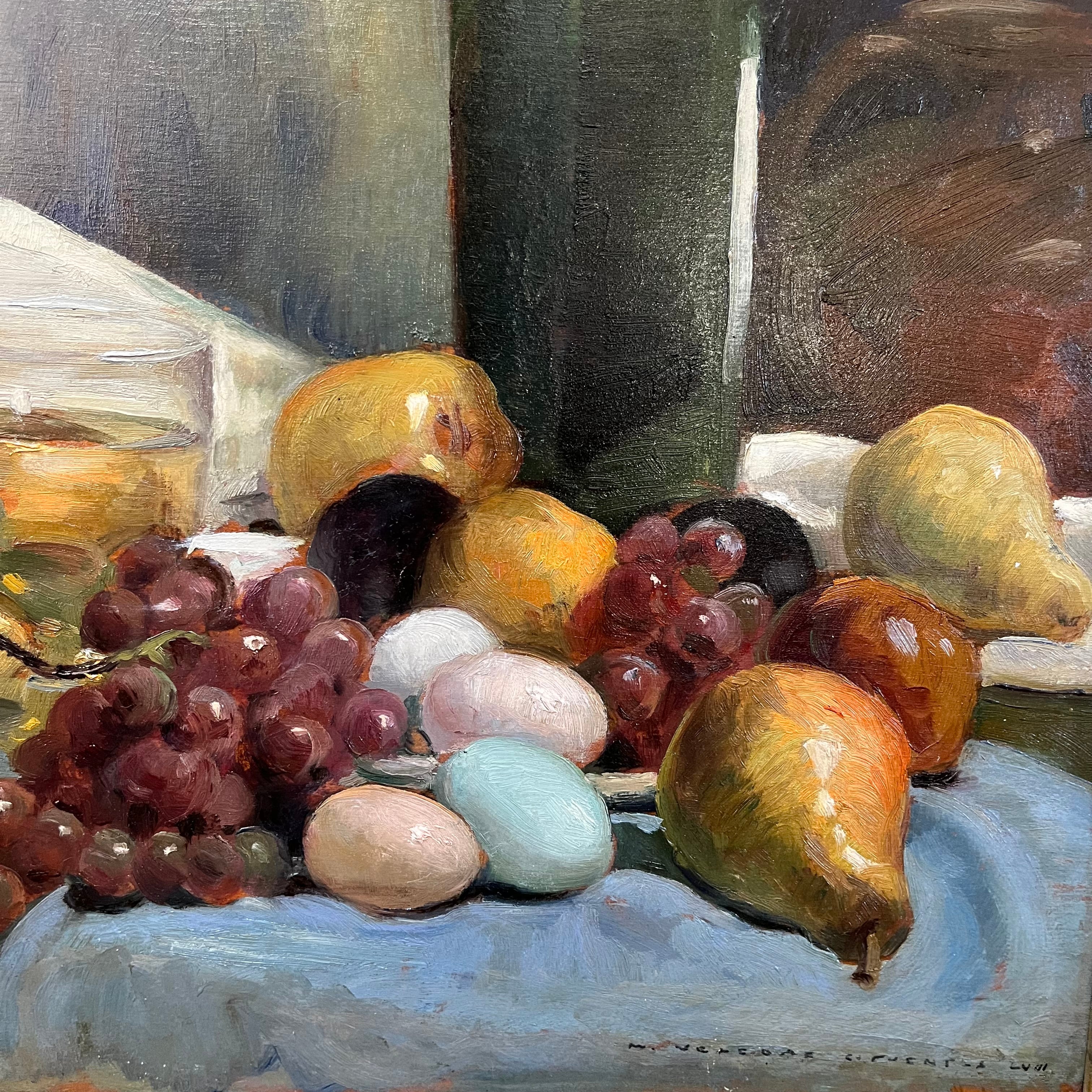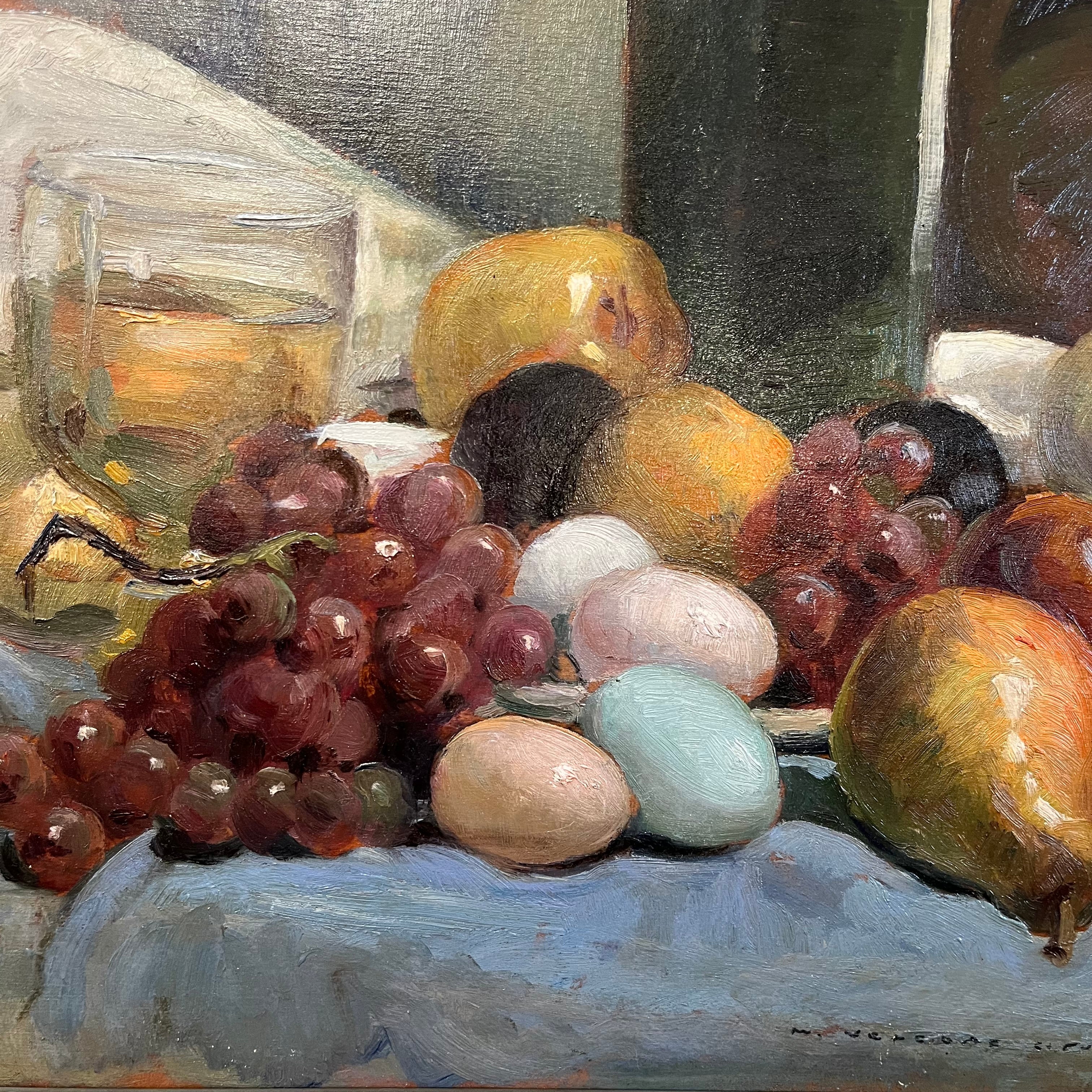 Hermoso bodegón del pintor chileno Manuel Venegas Cifuentes, donde nos encontramos con una combinación de elementos frutas, vinos y coloridos huevos. Se pude apreciar el juego de sombras que entrega un realismo especial a la pintura.