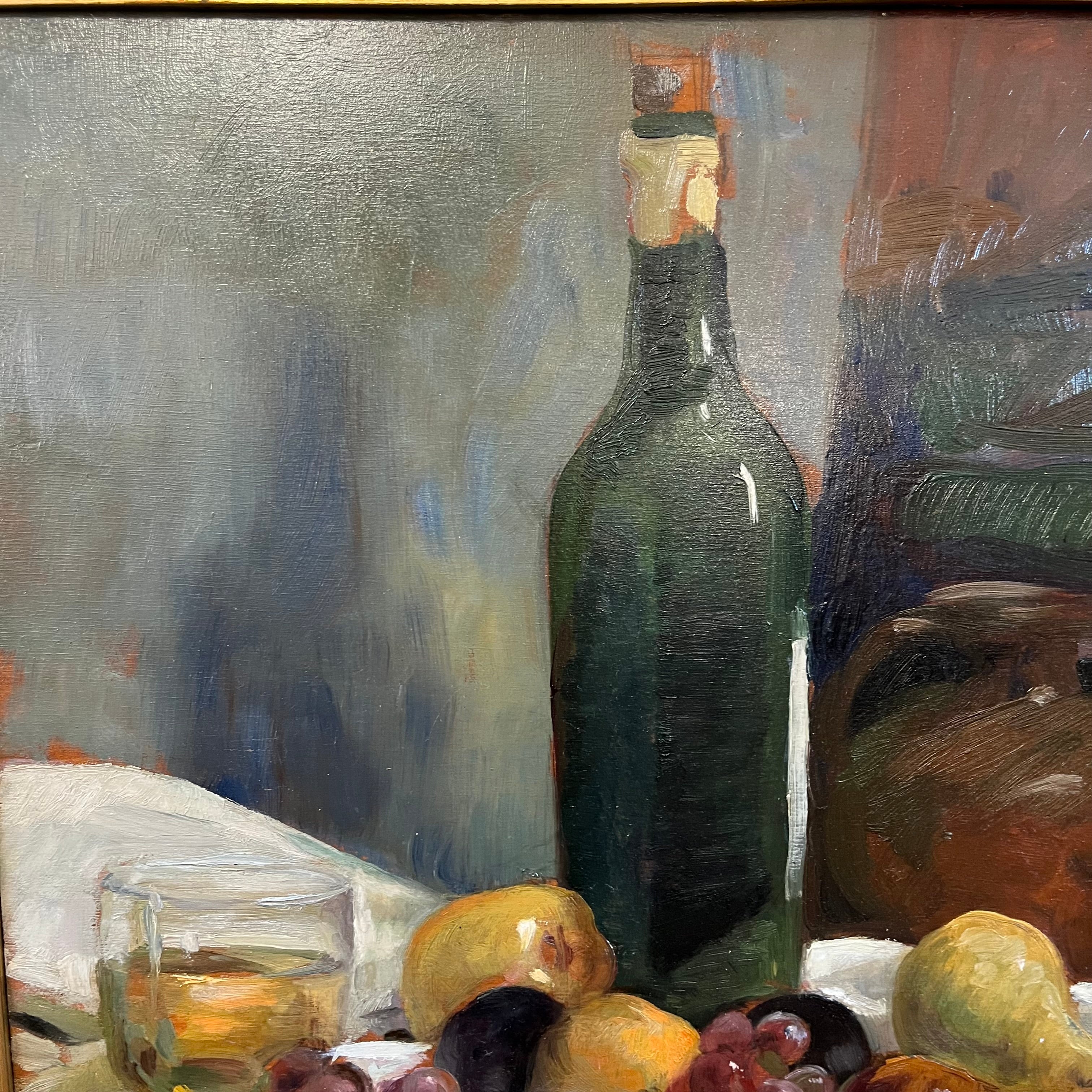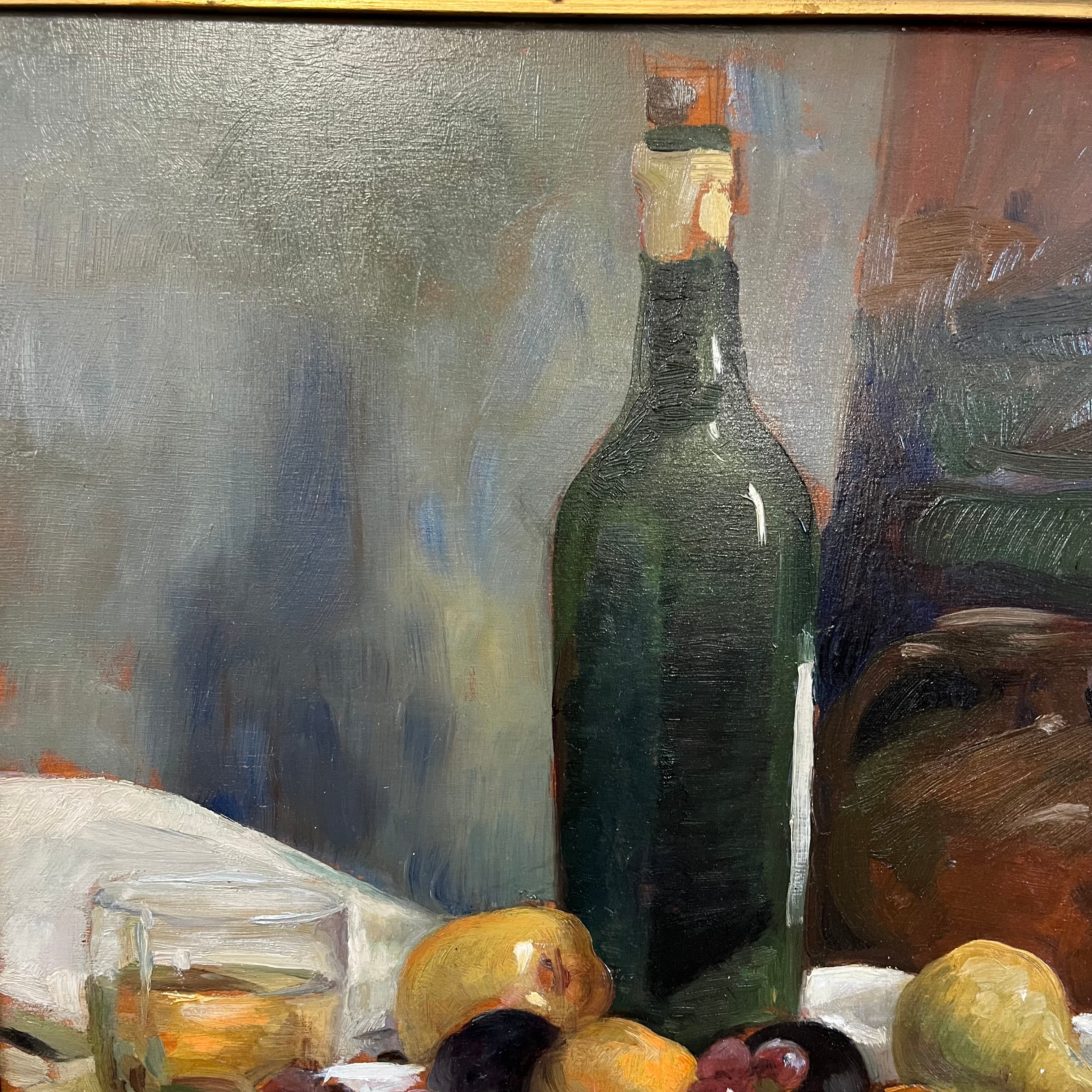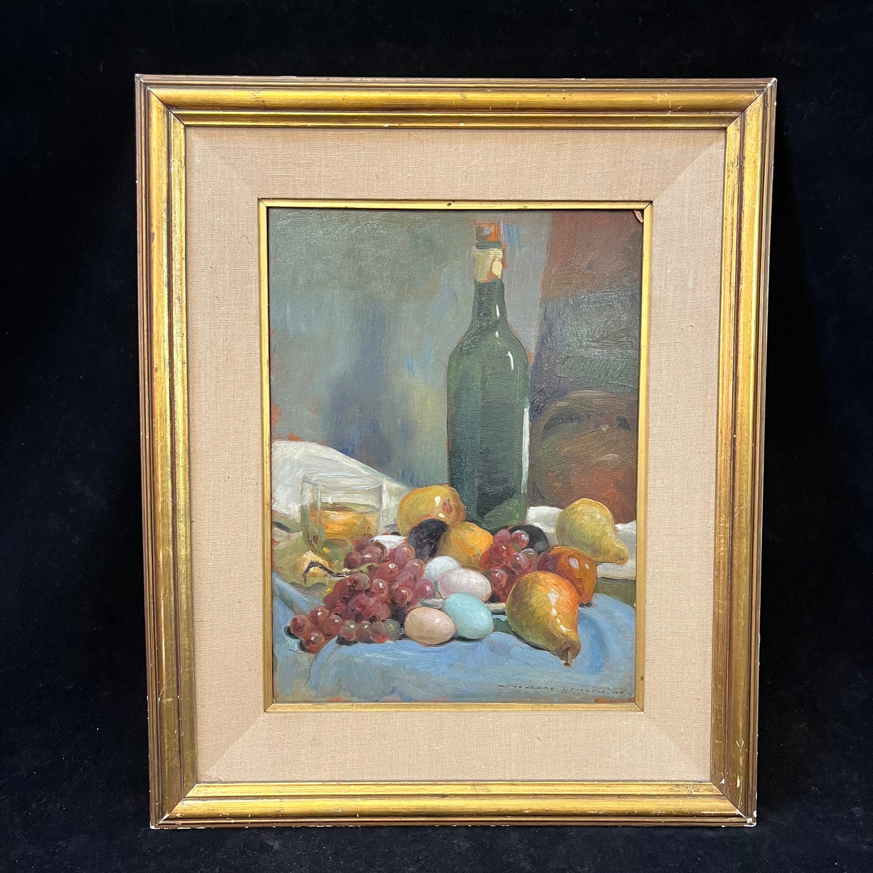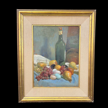 Hermoso bodegón del pintor chileno Manuel Venegas Cifuentes, donde nos encontramos con una combinación de elementos frutas, vinos y coloridos huevos. Se pude apreciar el juego de sombras que entrega un realismo especial a la pintura.