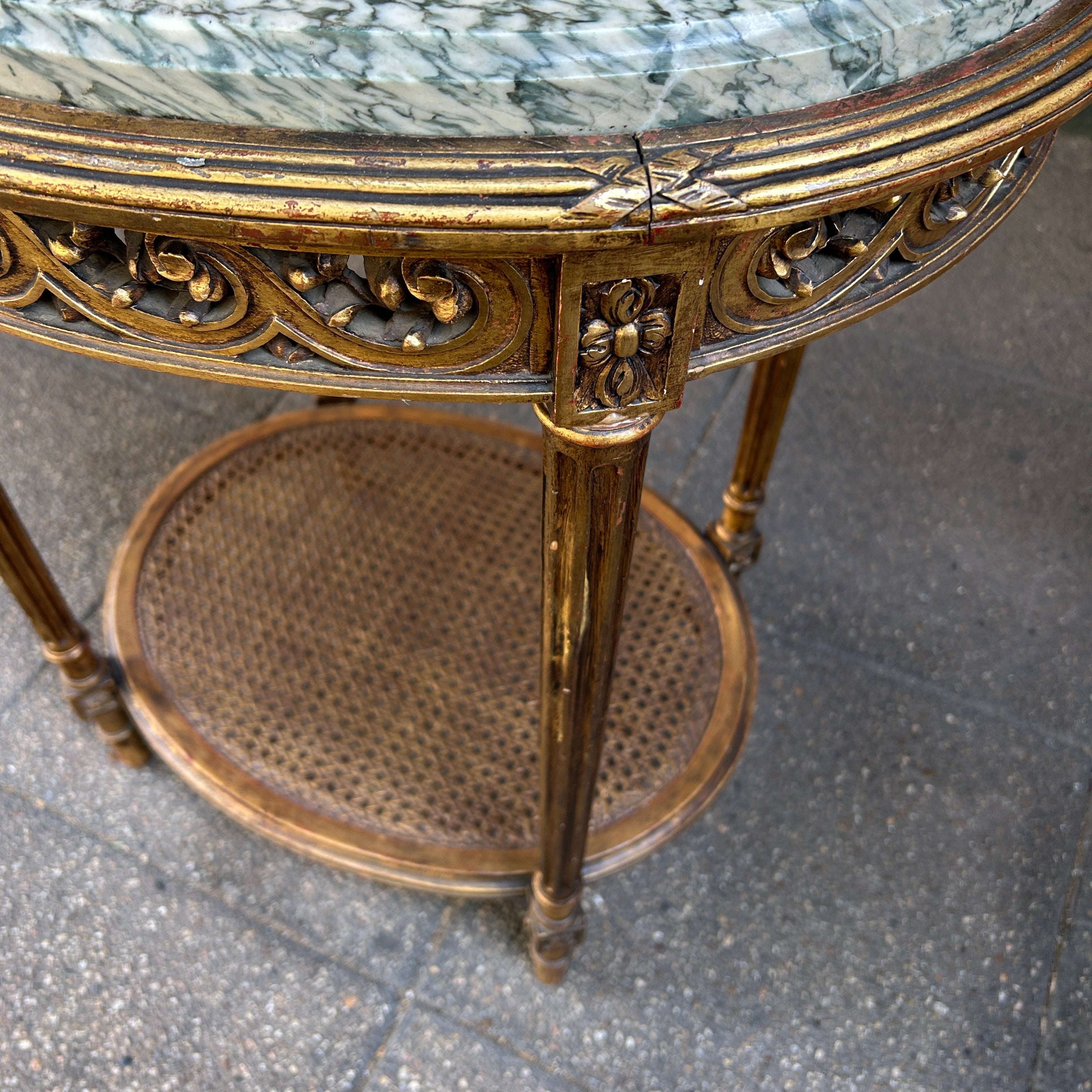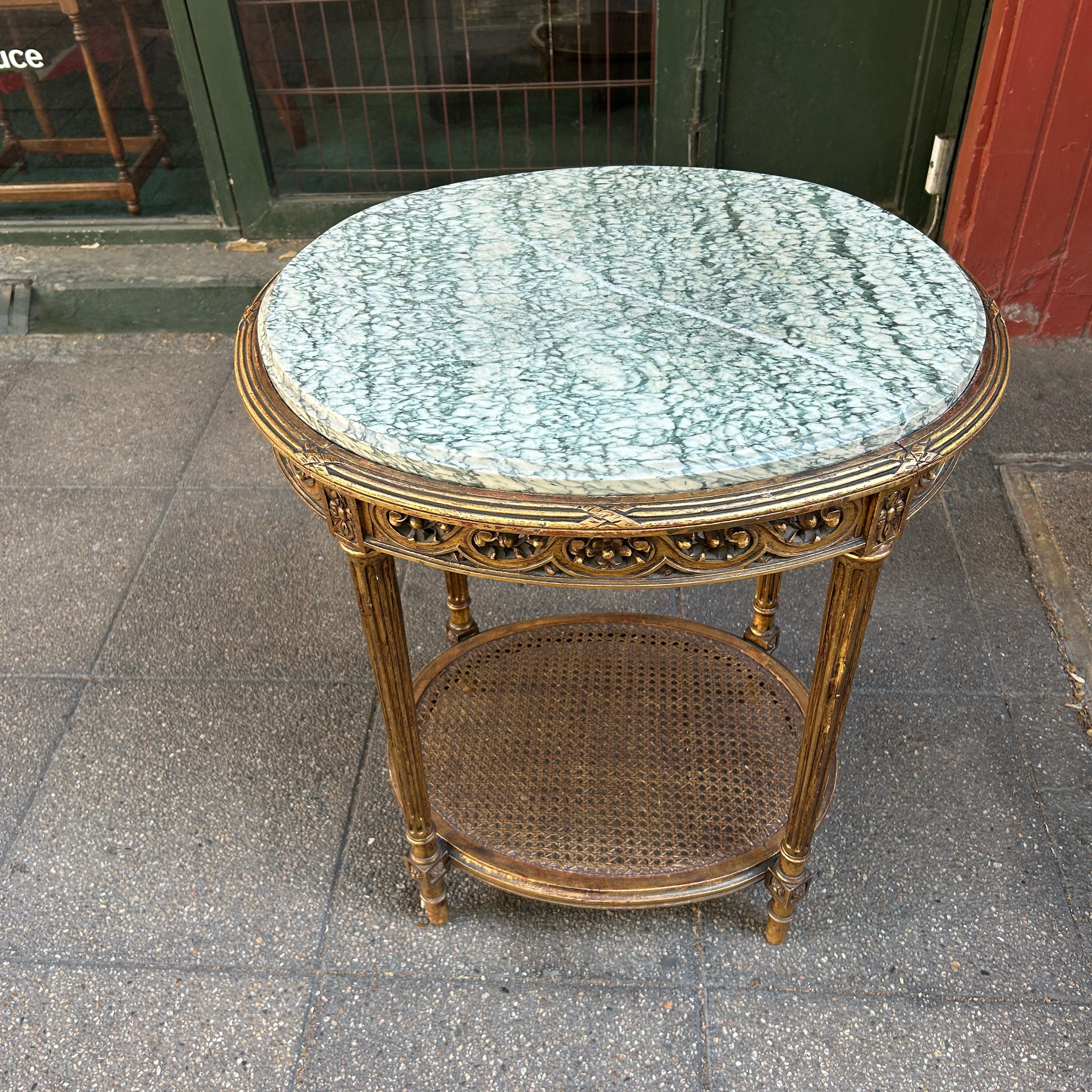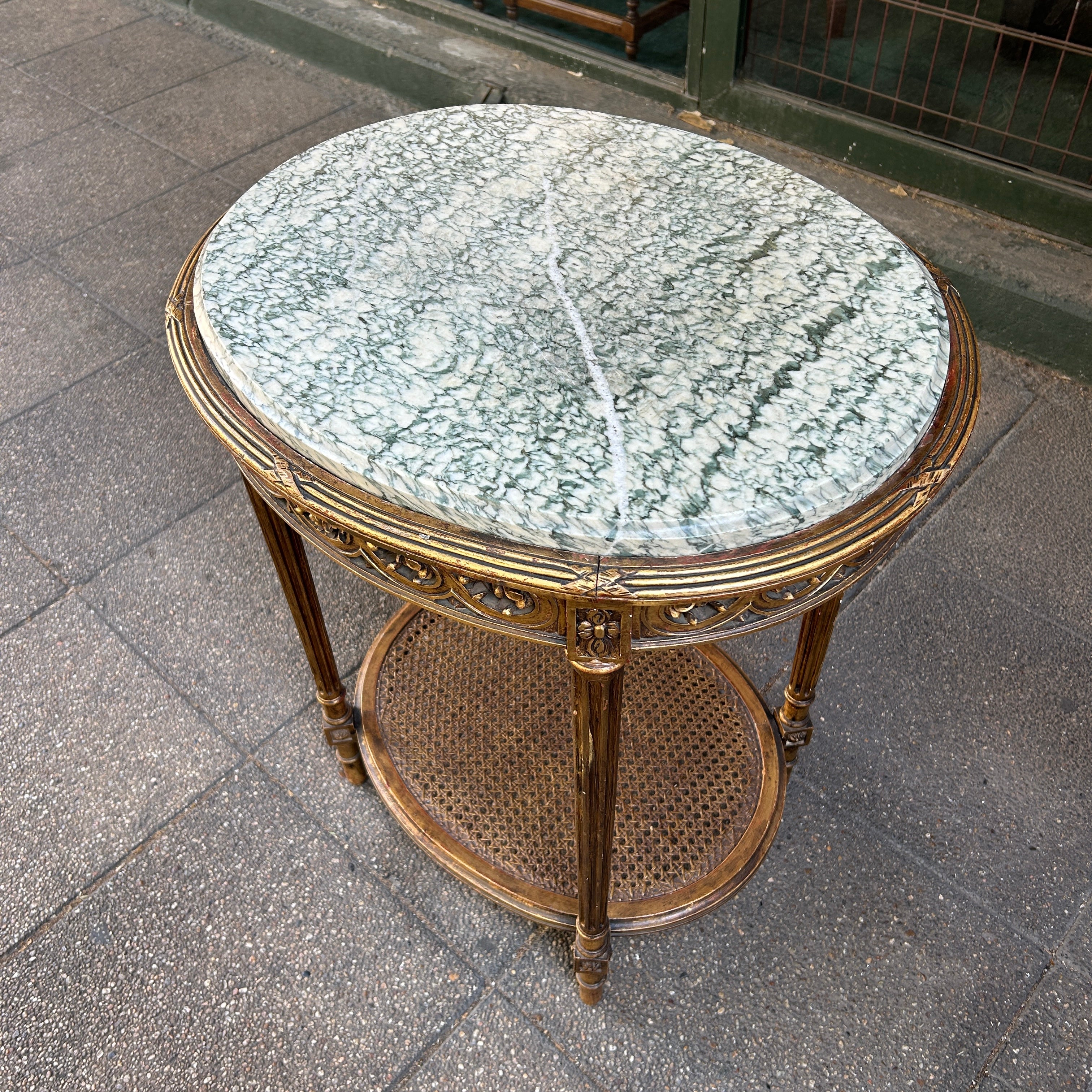 Bella mesa de apoyo francesa estilo Luis XVI, hecha en madera tallada con decorados calados, patas talladas, una bandeja inferior con enjuncado y elegante cubierta de mármol verde veteado.