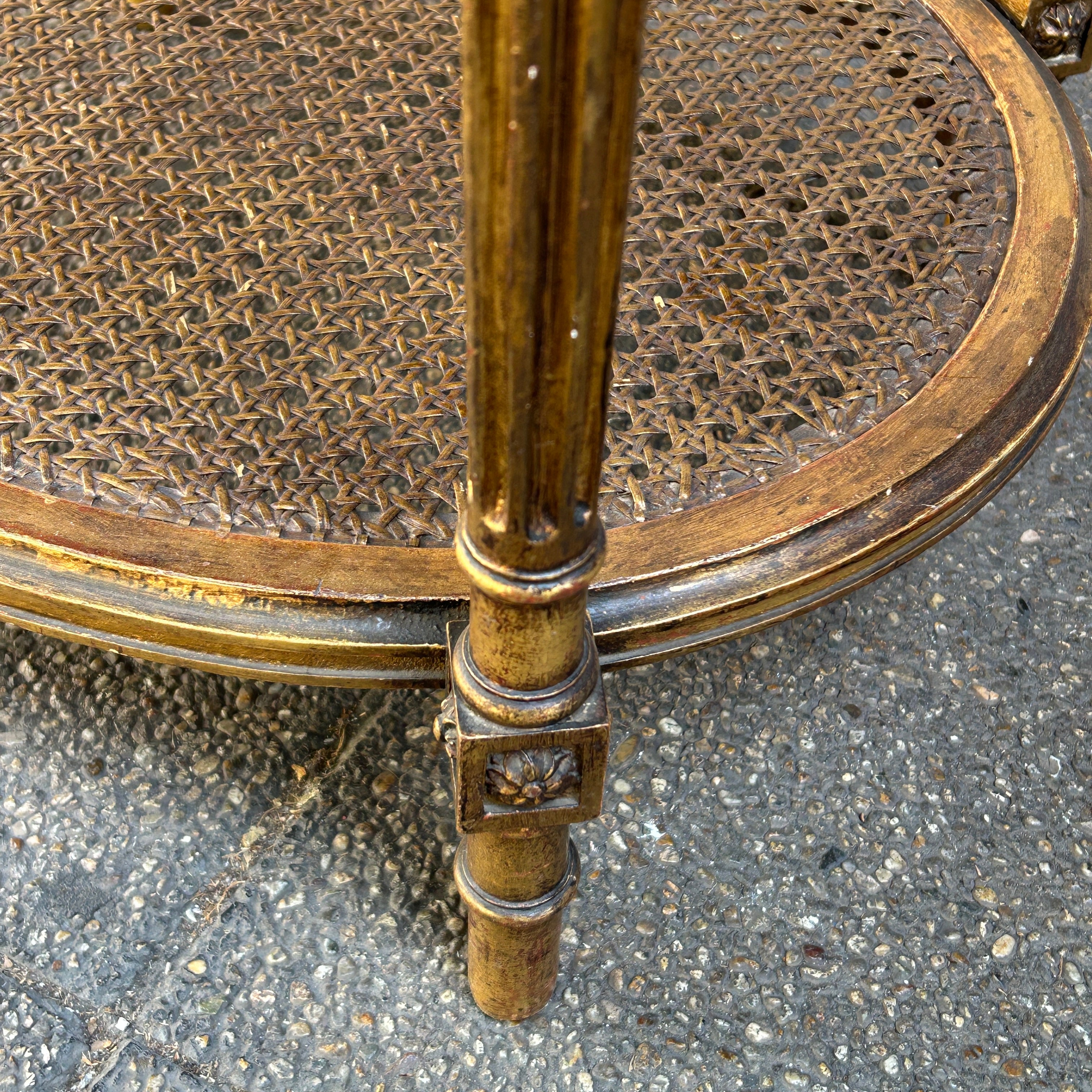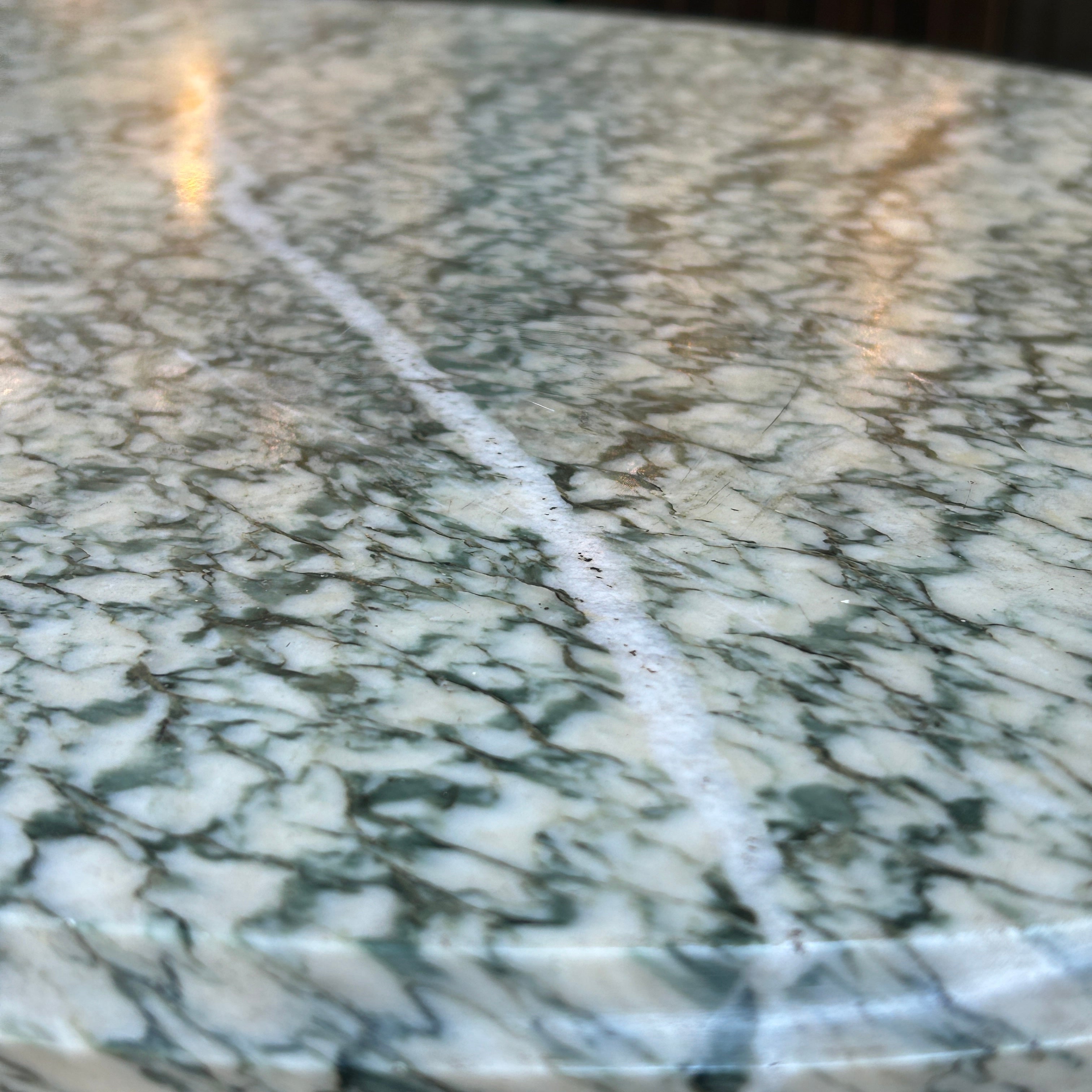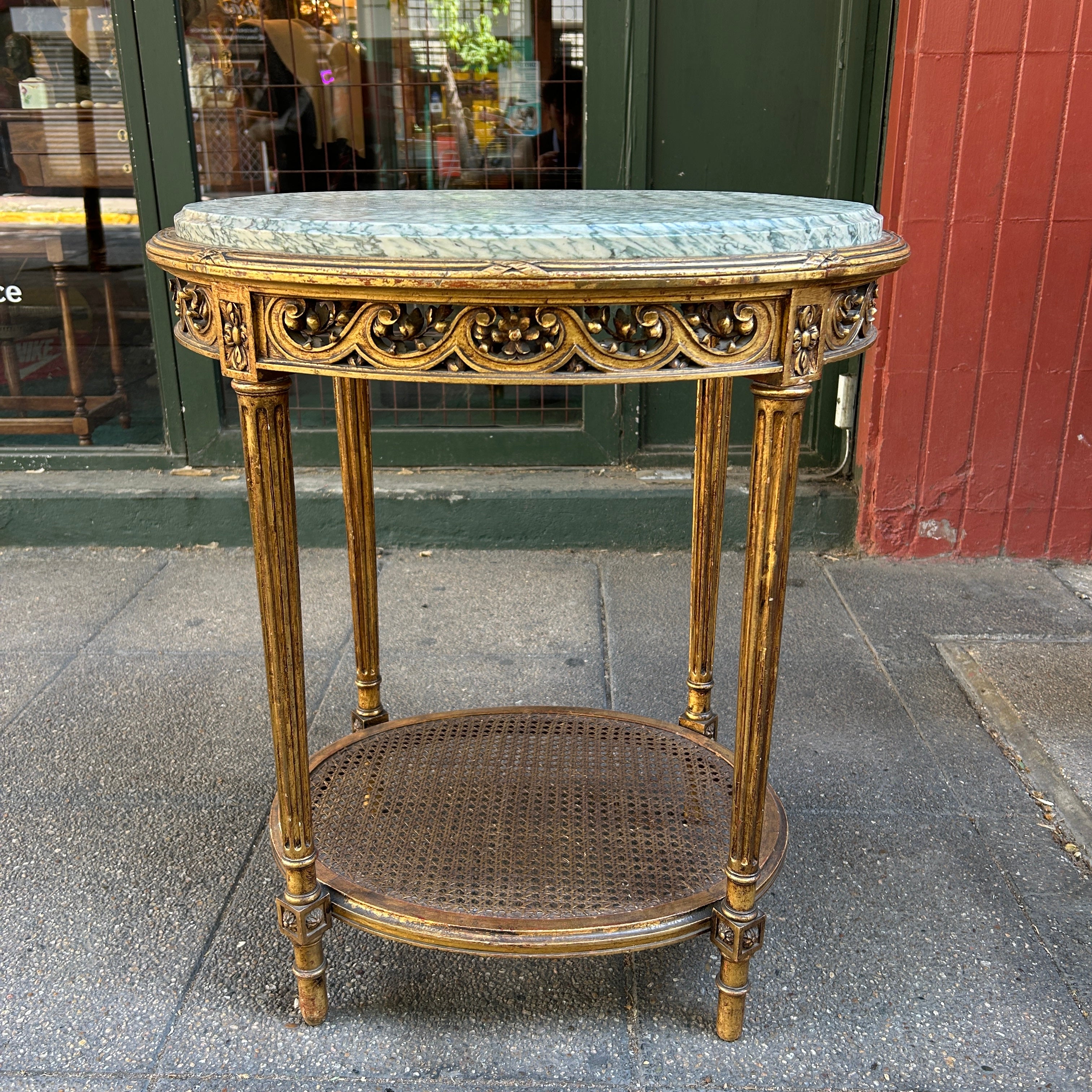 Bella mesa de apoyo francesa estilo Luis XVI, hecha en madera tallada con decorados calados, patas talladas, una bandeja inferior con enjuncado y elegante cubierta de mármol verde veteado.