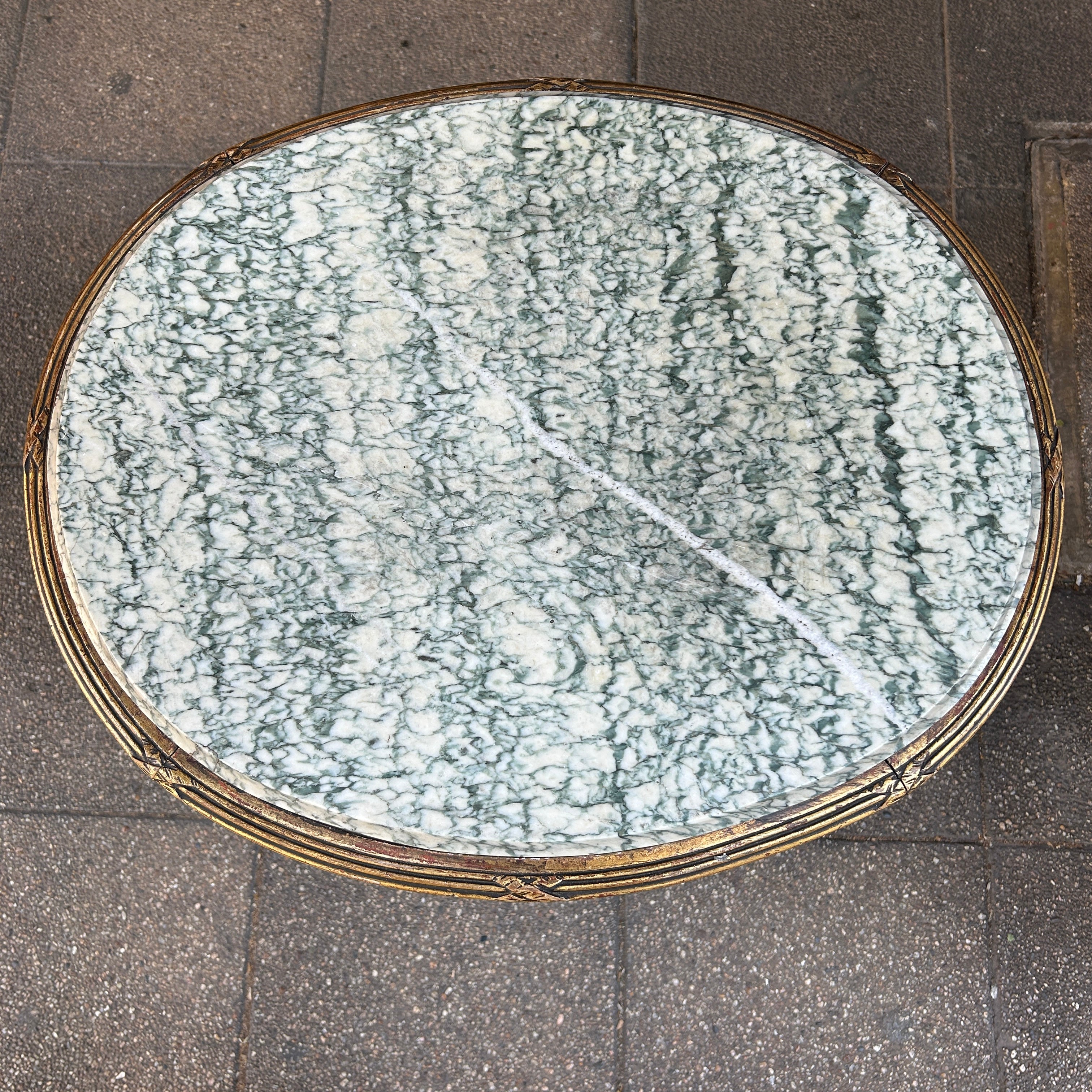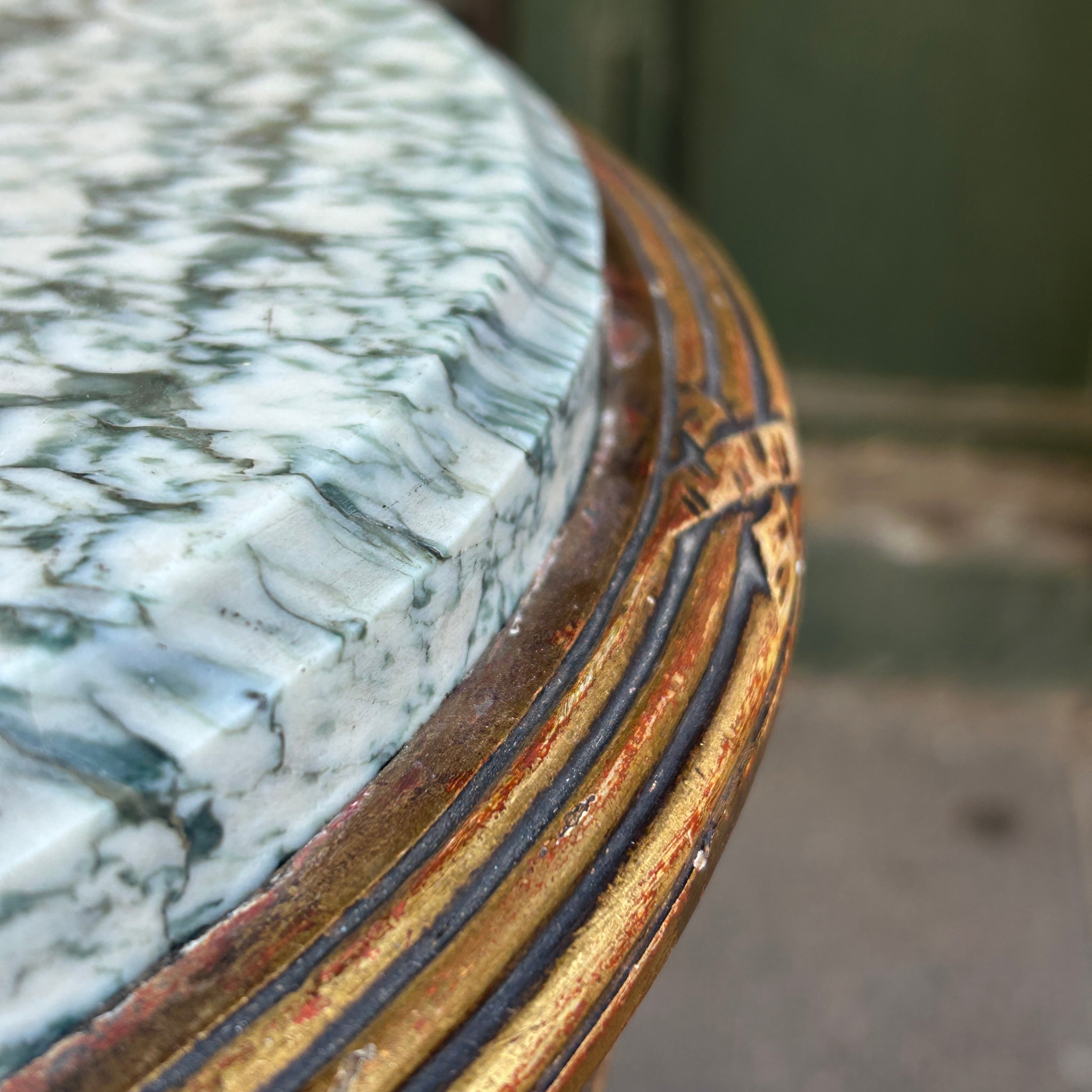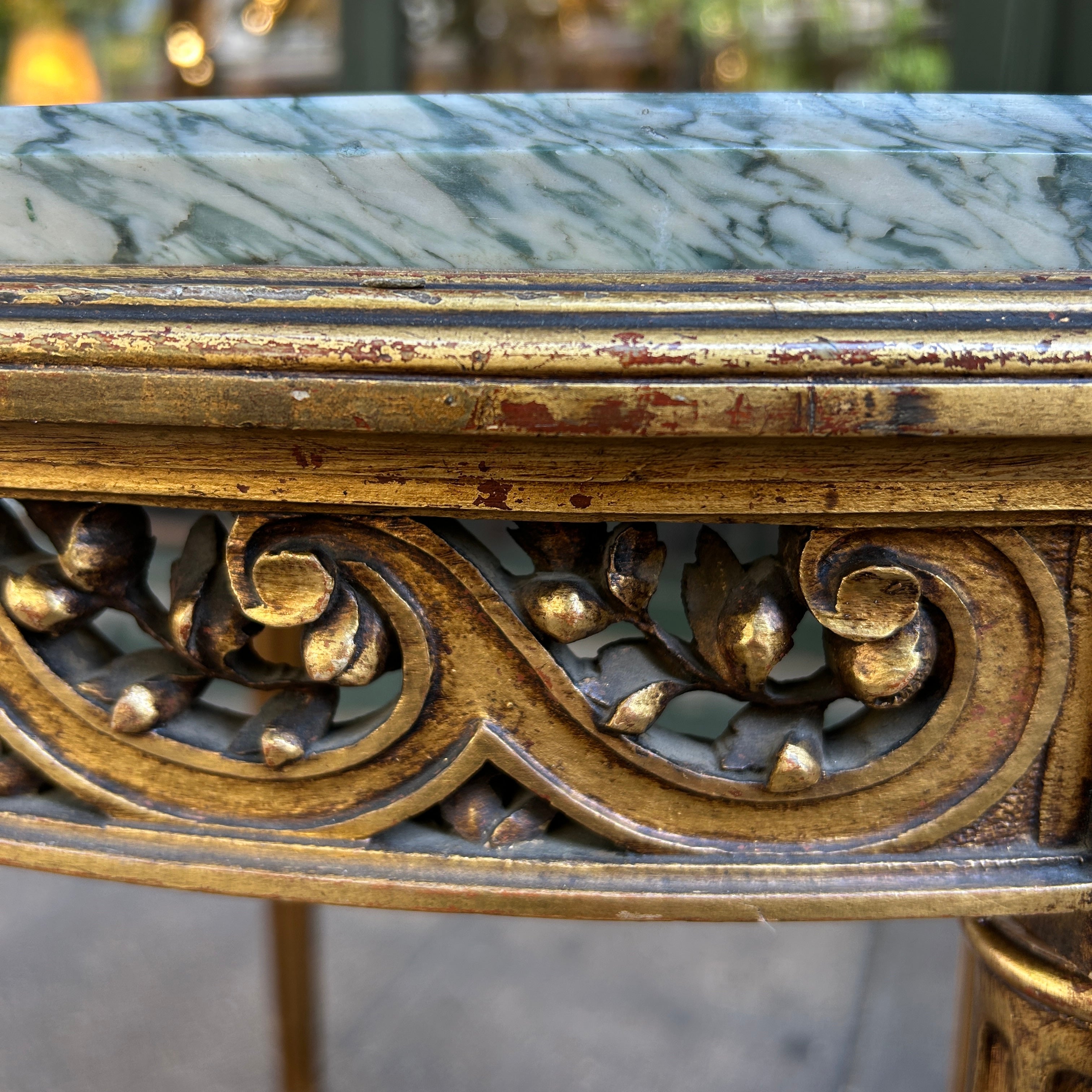 Mesa de apoyo francesa Luis XVI tallado en dorado enjuncado y cubierta de mármol verde veteado