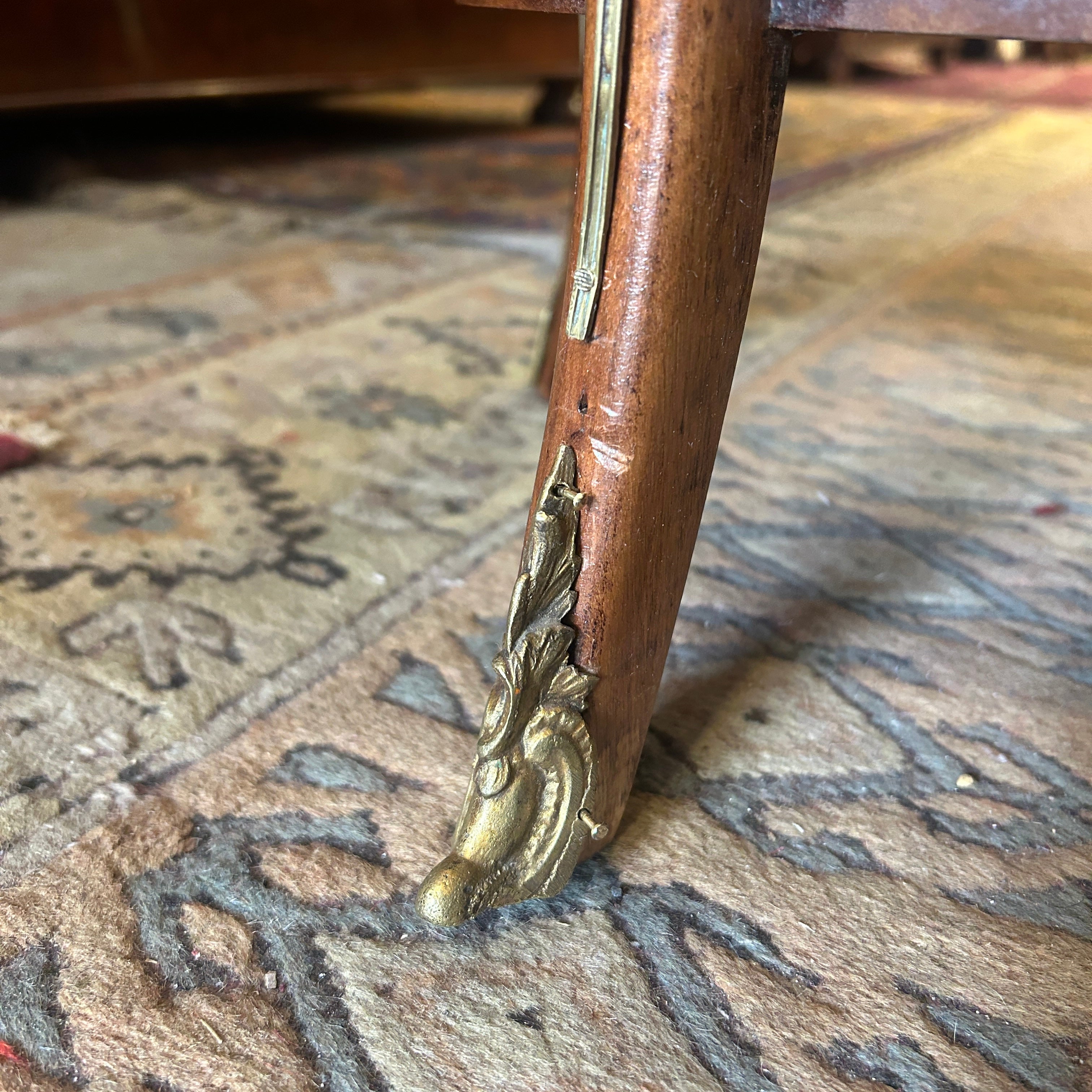 Preciosa mesita lateral gueridón de dos cubiertas con cintillos y aplicaciones de bronce. El cintillo superior es de bronce masiso y los bronces de las patas van hermosamente de pies a cabeza en forma curva.