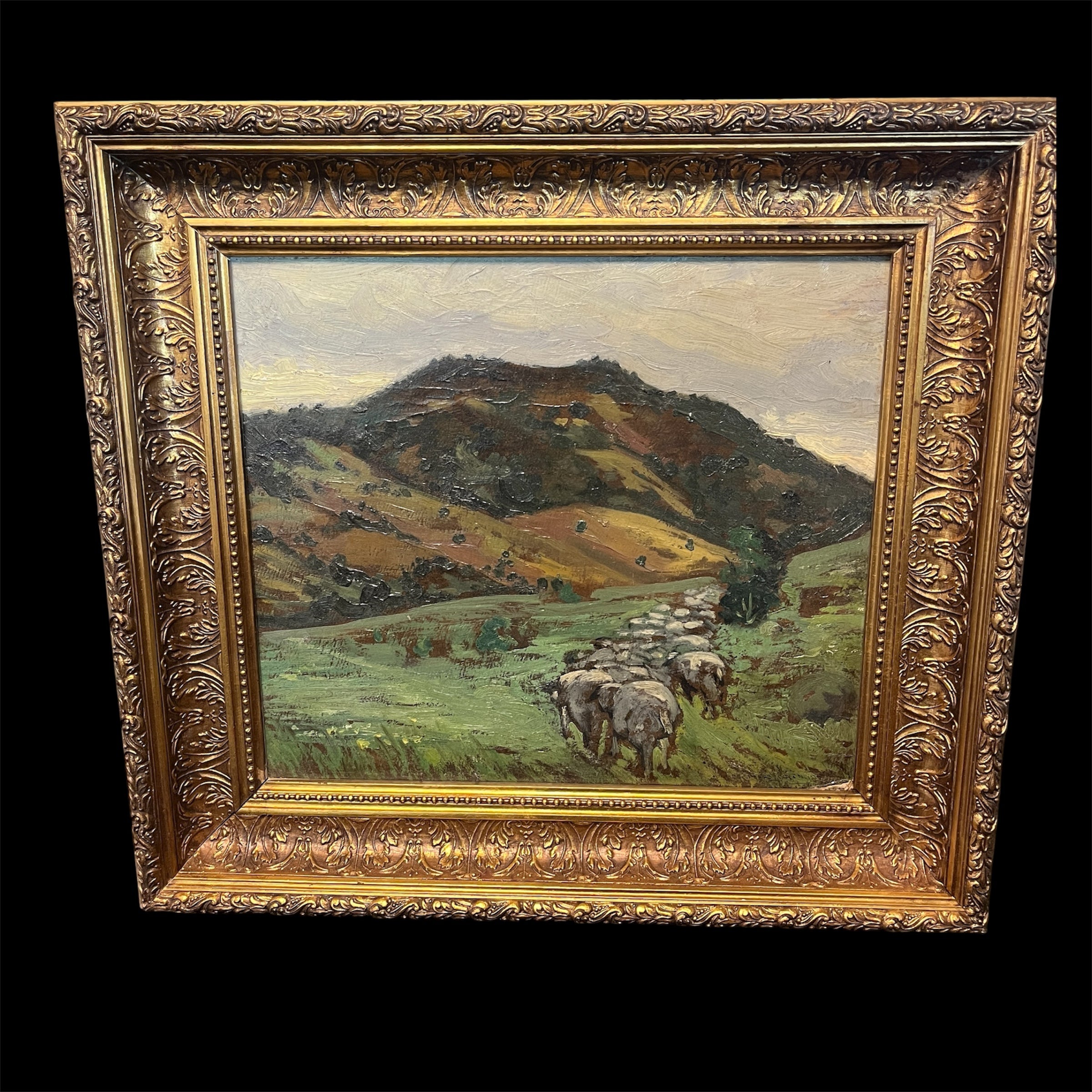 Óleo sobre madera, representando un verde y extenso valle, con un rebaño de ovejas que van en fila, atravesando el paisaje. La obra está enmarcada en madera bellamente tallada de relieves y terminada en dorado.