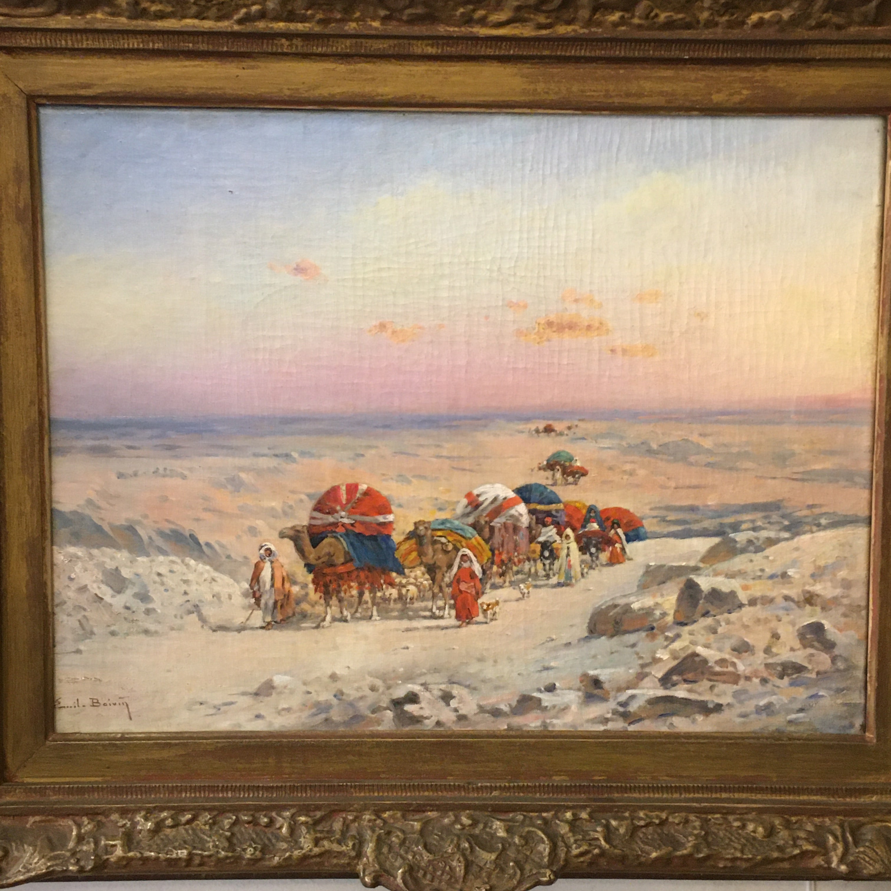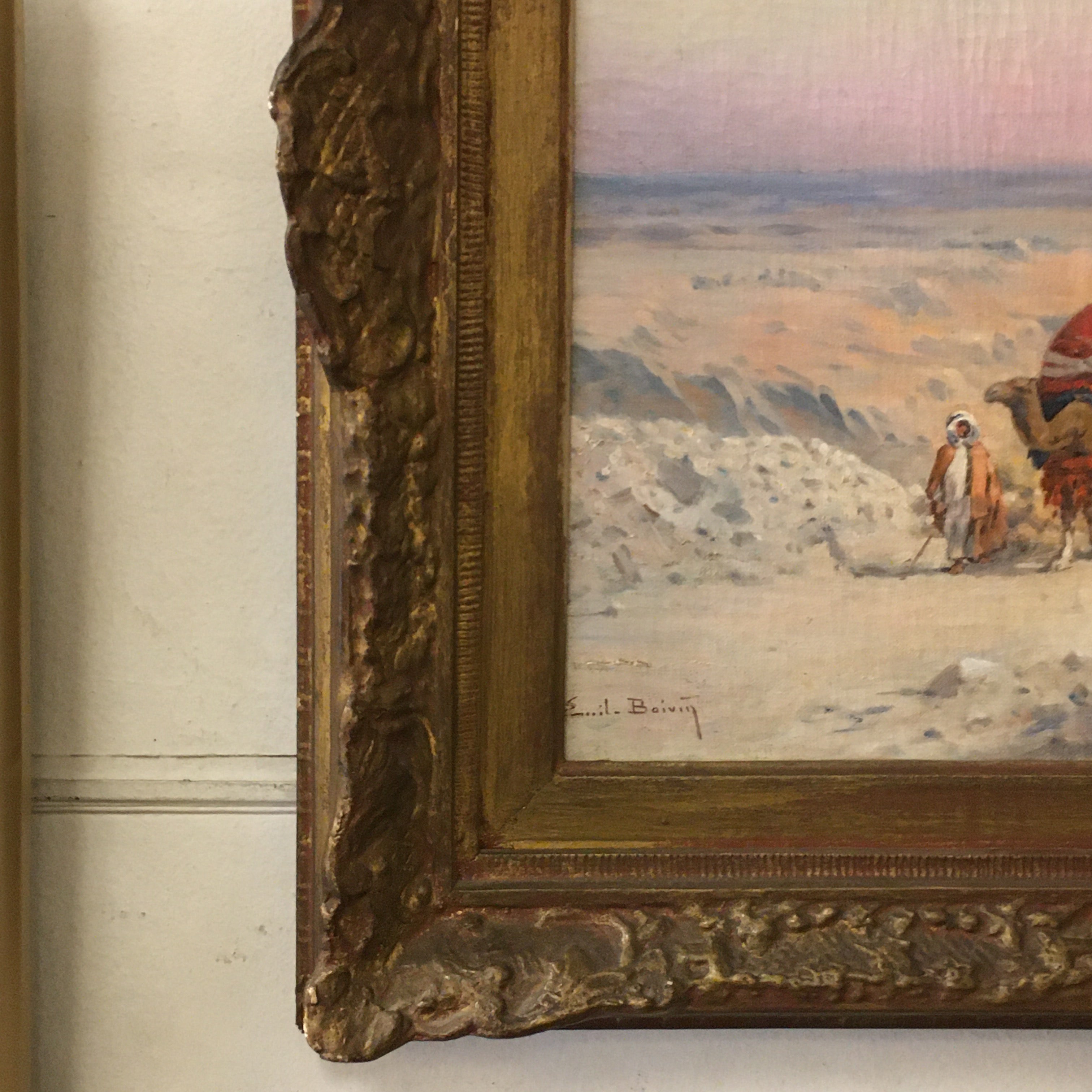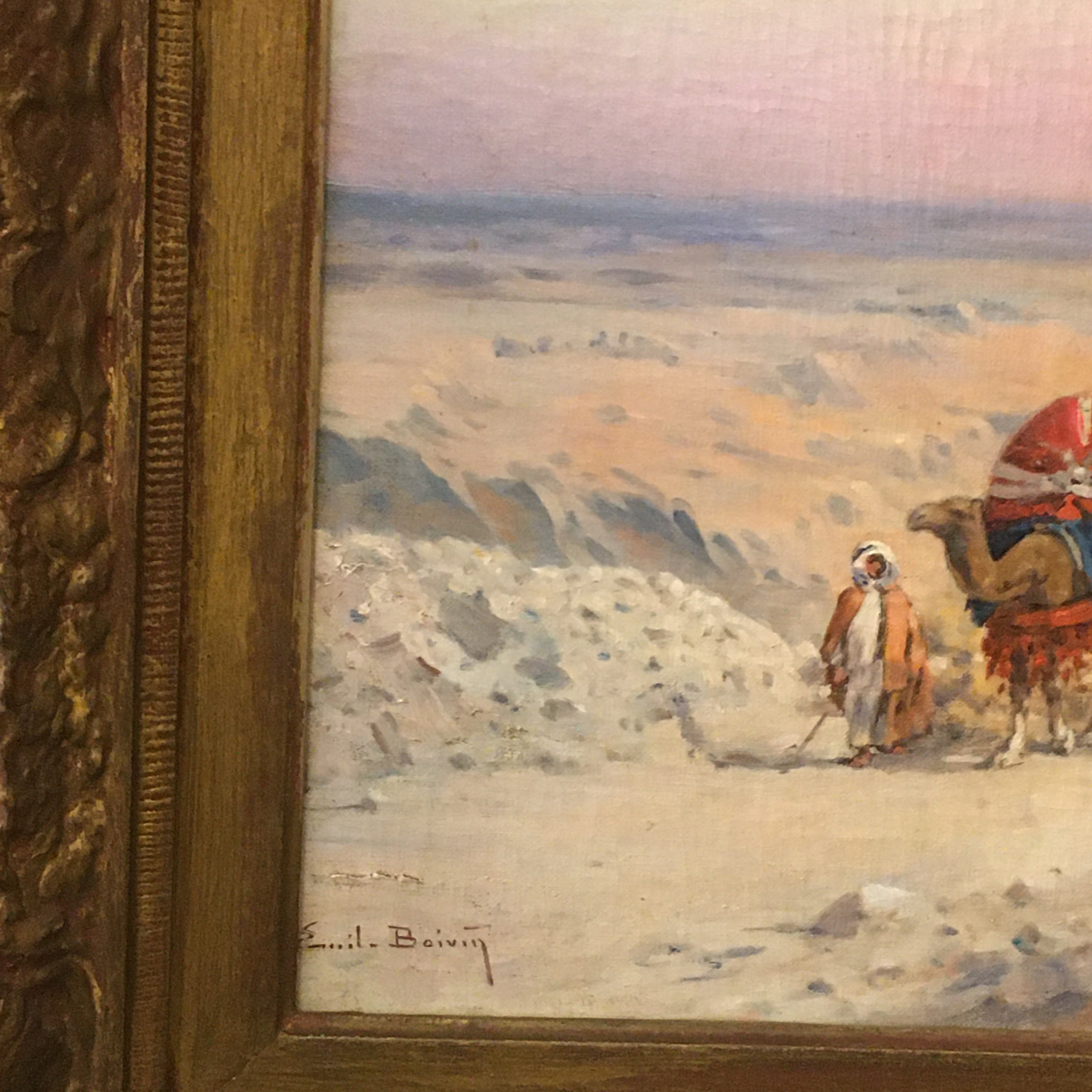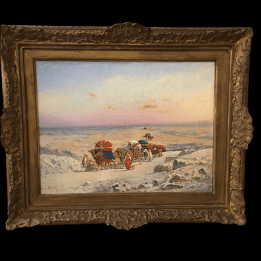 Huile sur toile, d'origine européenne, de l'artiste français Émile Boivin (1846-1920), connu pour ses peintures de paysages et de scènes du Moyen-Orient. L'œuvre représente un paysage désertique traversé par une caravane nomade, transportant tous ses biens sur ses chameaux. L'œuvre capture magnifiquement les couleurs du ciel, dans des tons de bleu et de rose, évoquant un coucher de soleil. On remarque également les couleurs éclatantes des tissus qui habillent la tribu et ses charges sur le sable blanc du désert. L'œuvre est encadrée dans un cadre en bois sculpté orné de décorations en relief, d'une finition dorée reflétant son âge.
