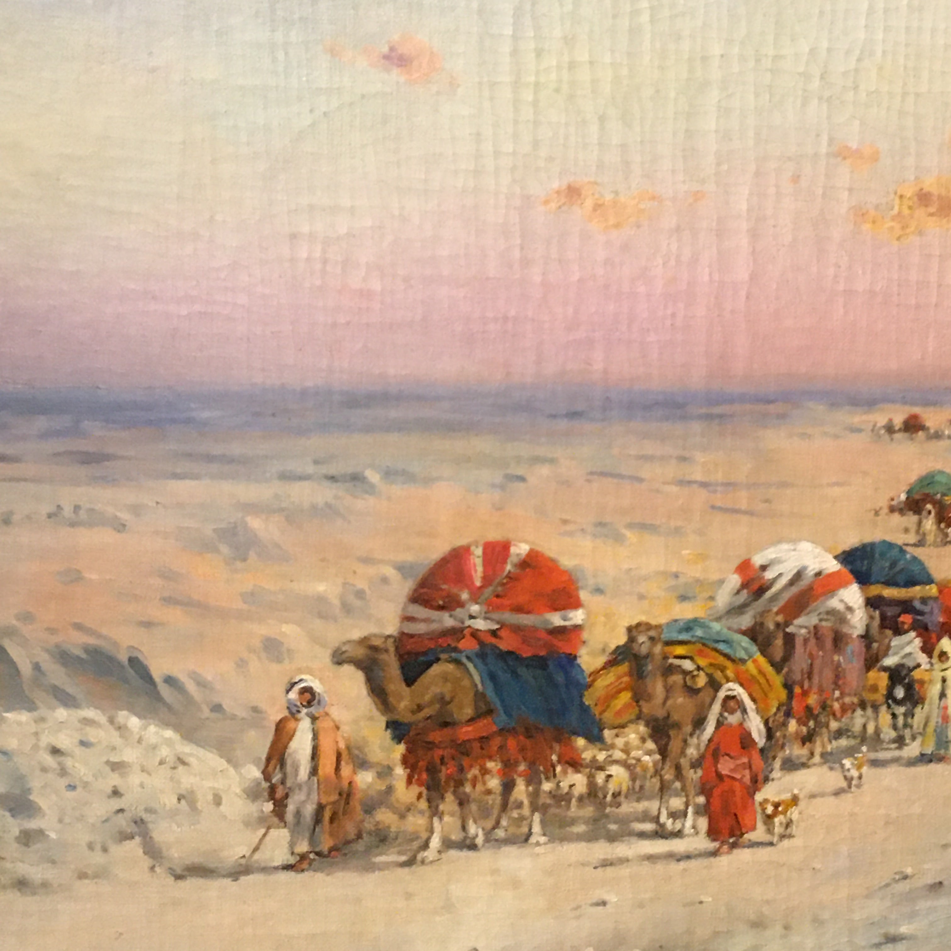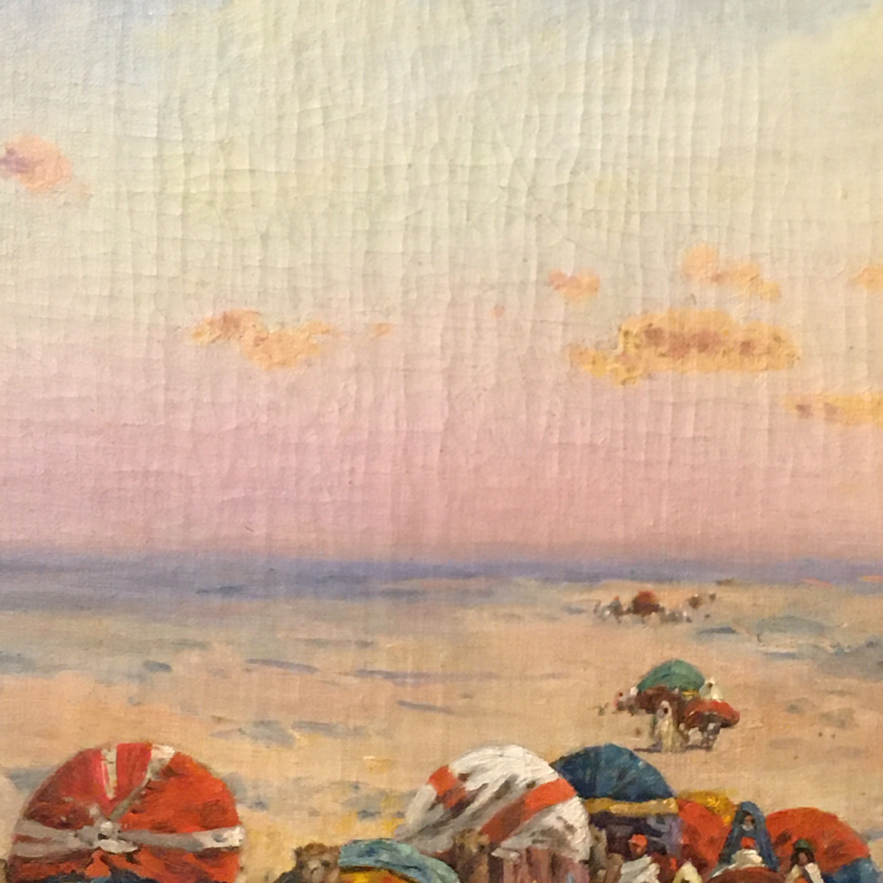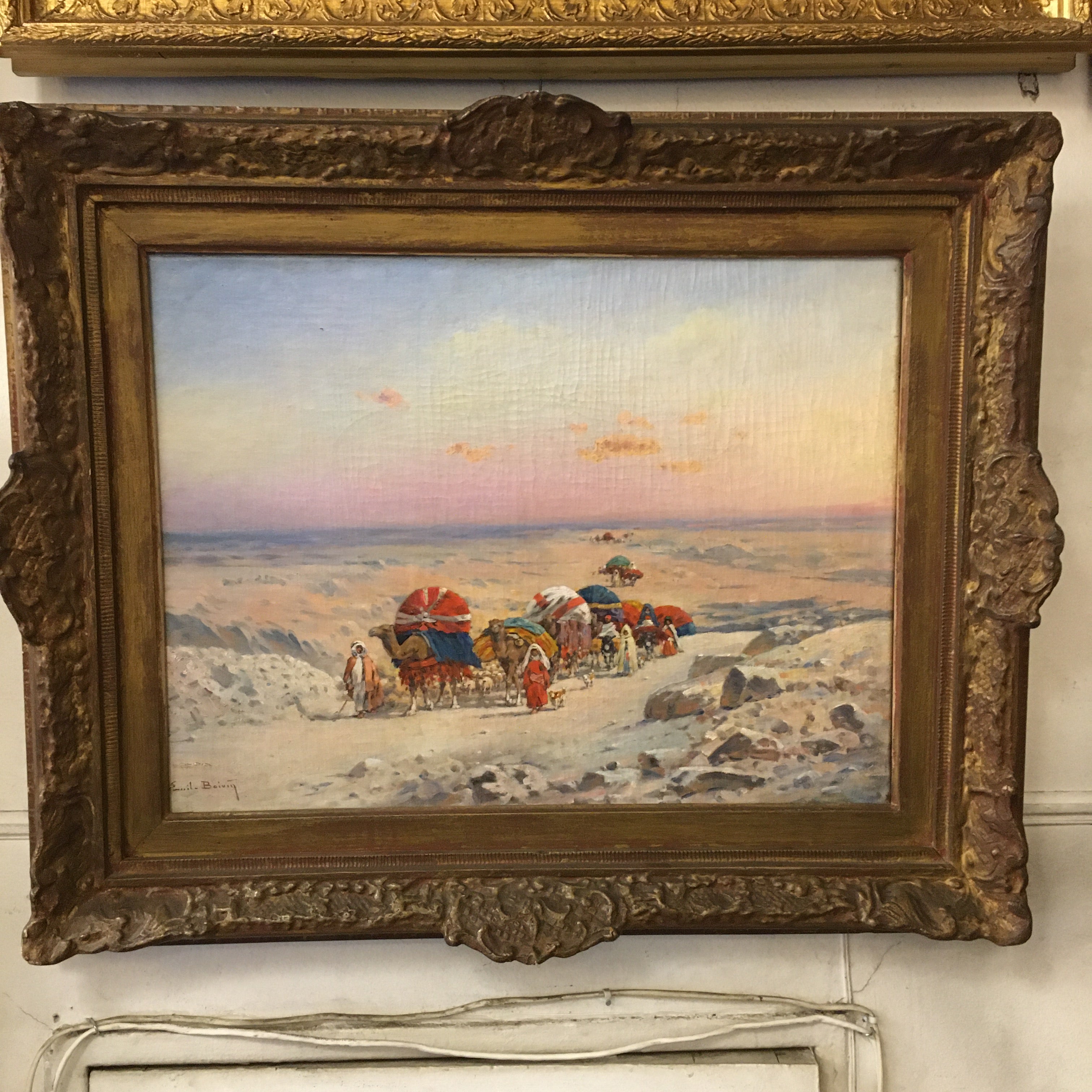 Huile sur toile, d'origine européenne, de l'artiste français Émile Boivin (1846-1920), connu pour ses peintures de paysages et de scènes du Moyen-Orient. L'œuvre représente un paysage désertique traversé par une caravane nomade, transportant tous ses biens sur ses chameaux. L'œuvre capture magnifiquement les couleurs du ciel, dans des tons de bleu et de rose, évoquant un coucher de soleil. On remarque également les couleurs éclatantes des tissus qui habillent la tribu et ses charges sur le sable blanc du désert. L'œuvre est encadrée dans un cadre en bois sculpté orné de décorations en relief, d'une finition dorée reflétant son âge.