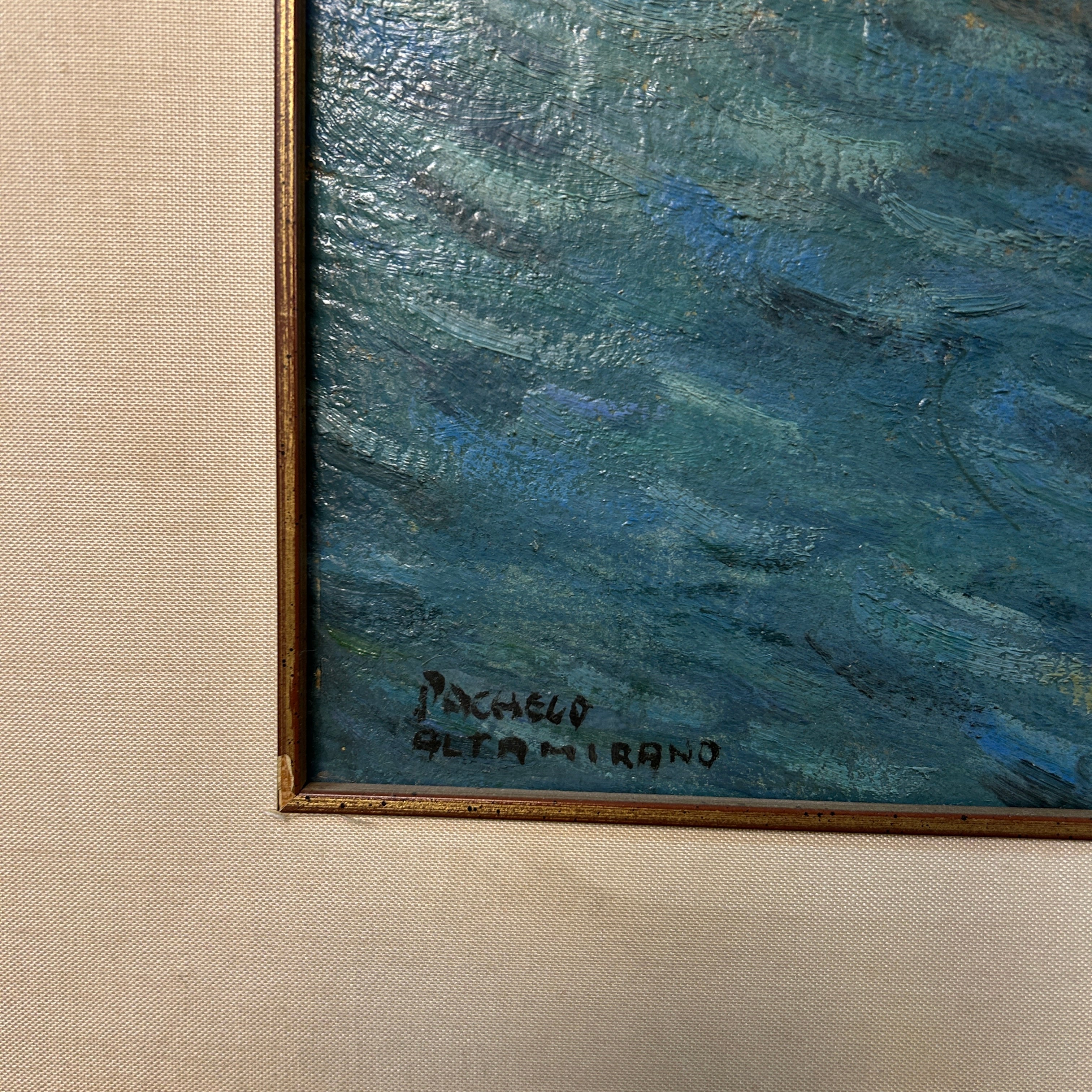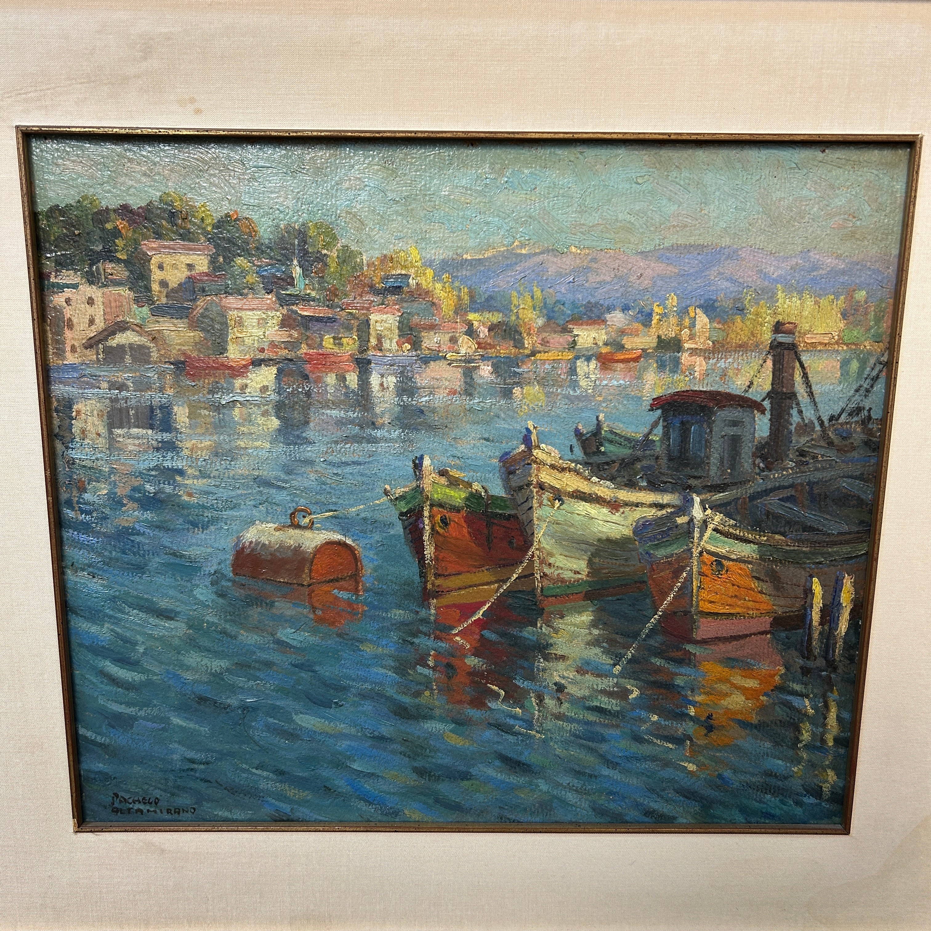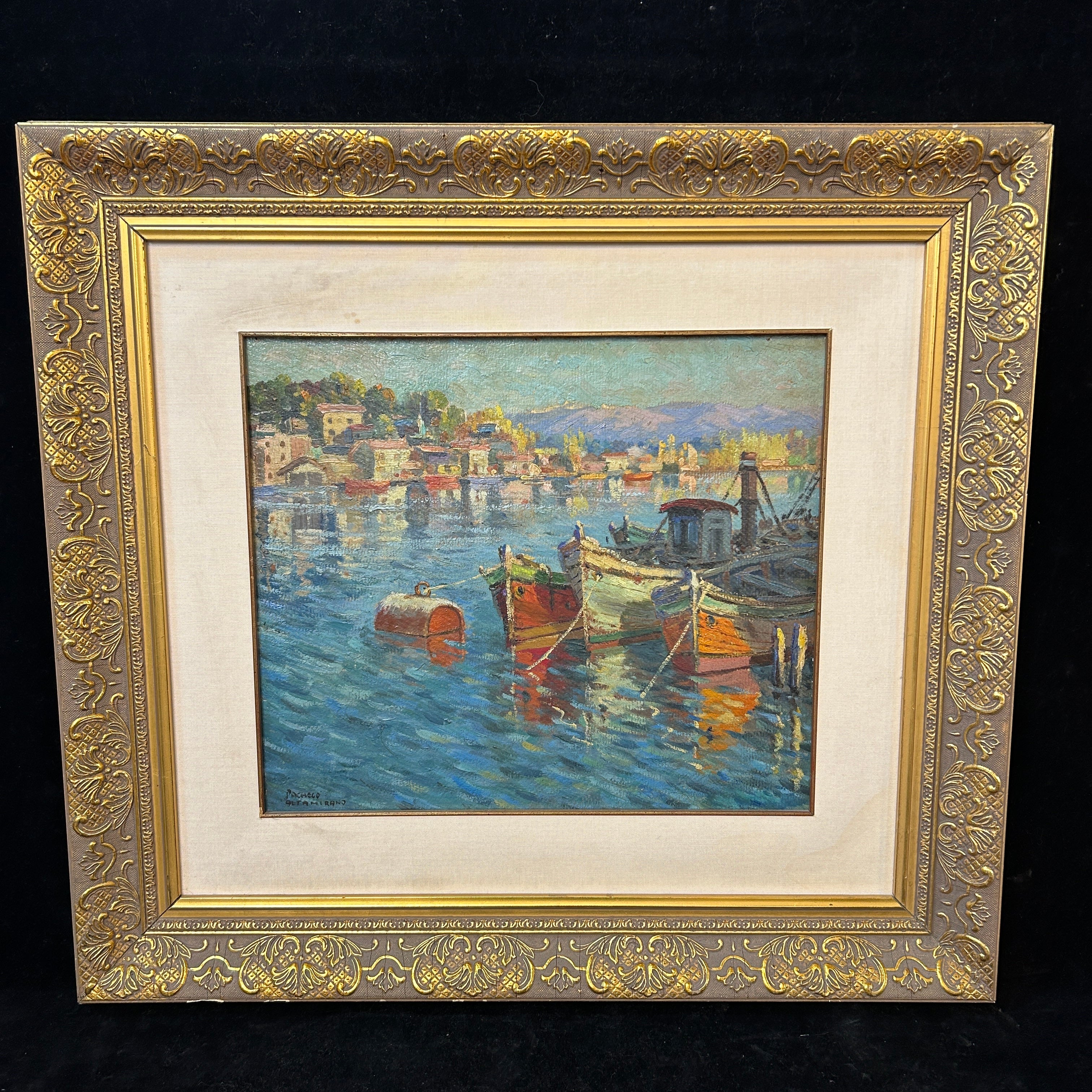 Bellísimo óleo sobre madera del reconocido pintor chileno Arturo Pacheco Altamirano (1905 -1978 ), representando un paisaje costero en el que se ven unos botes amarrados en primer plano, un pequeño puerto de pueblo y las montañas de fondo. Destaca el trabajo de delicados reflejos en el agua, cargados de un estilo impresionista, digno del oficio de este artista. La obra tiene un marco de madera tallada en relieves y terminada de un luminoso dorado, con paspartú en tela blanca.