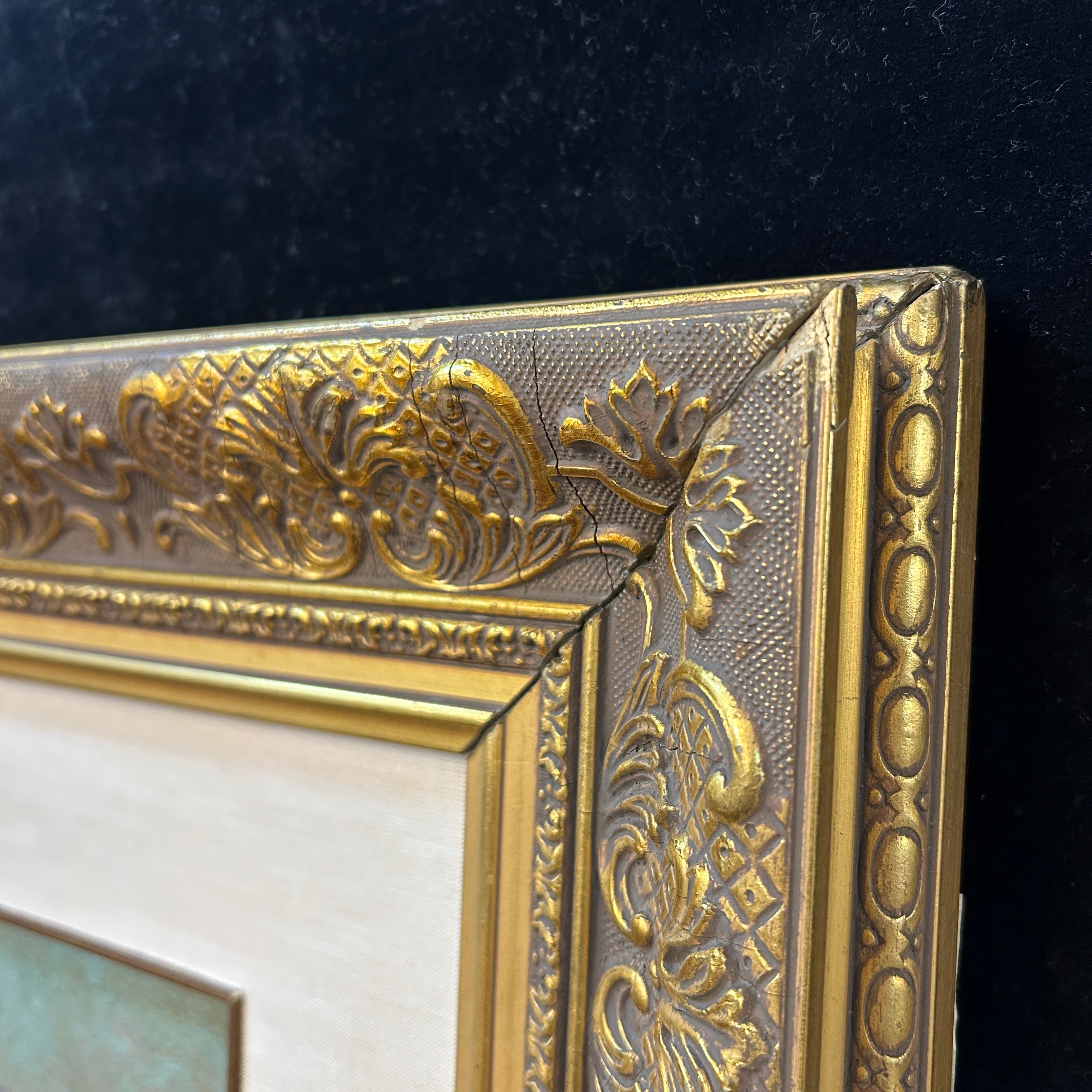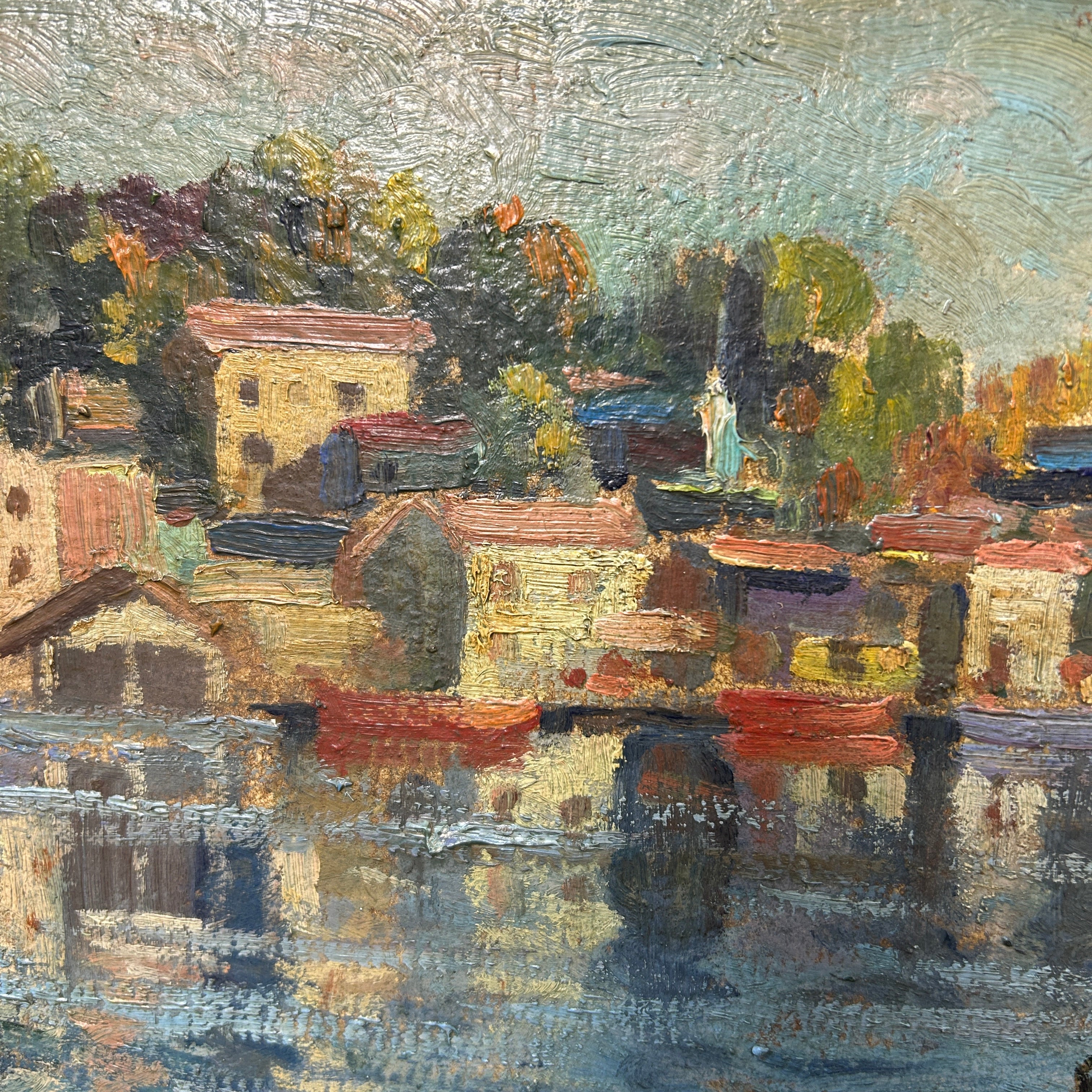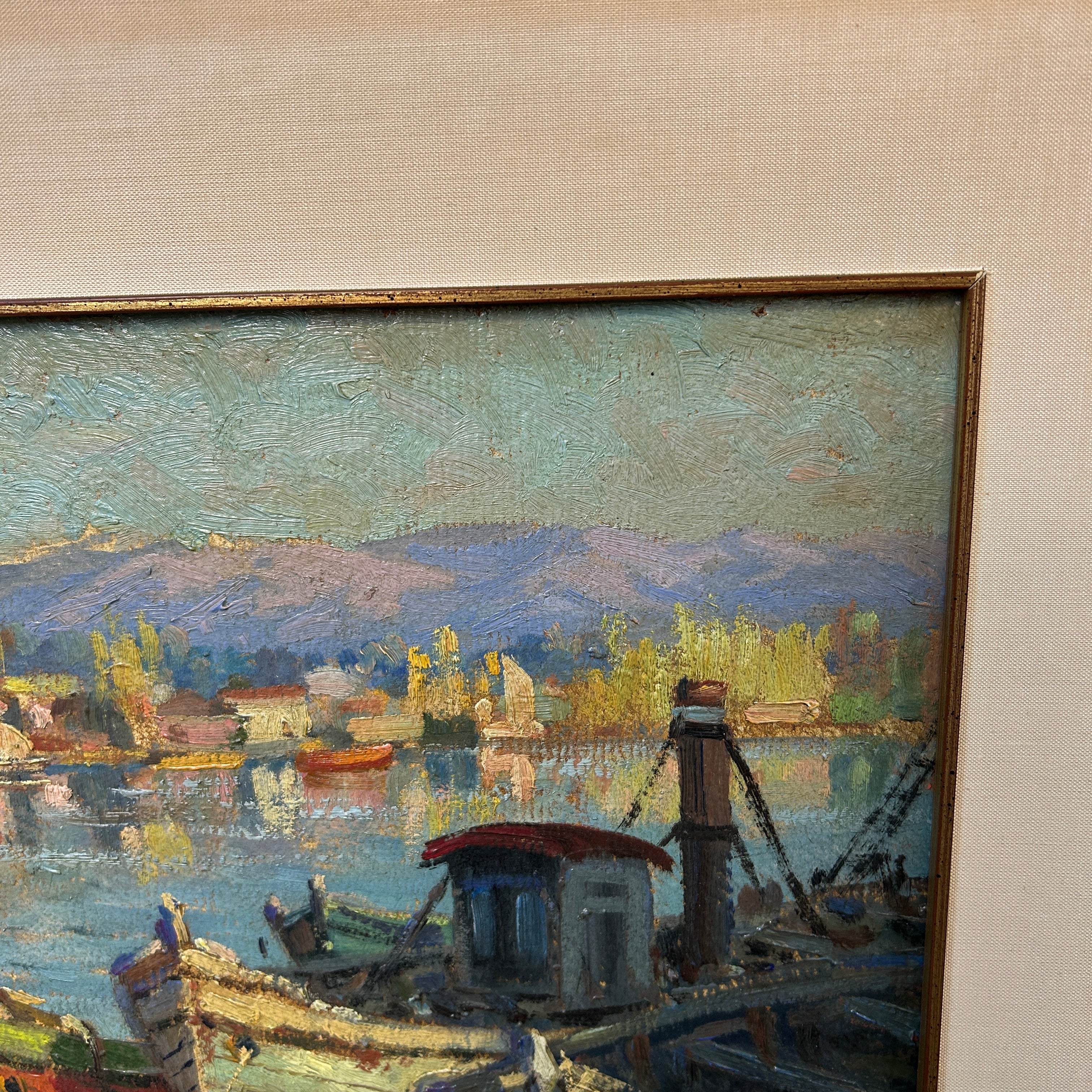 Bellísimo óleo sobre madera del reconocido pintor chileno Arturo Pacheco Altamirano (1905 -1978 ), representando un paisaje costero en el que se ven unos botes amarrados en primer plano, un pequeño puerto de pueblo y las montañas de fondo. Destaca el trabajo de delicados reflejos en el agua, cargados de un estilo impresionista, digno del oficio de este artista. La obra tiene un marco de madera tallada en relieves y terminada de un luminoso dorado, con paspartú en tela blanca.
