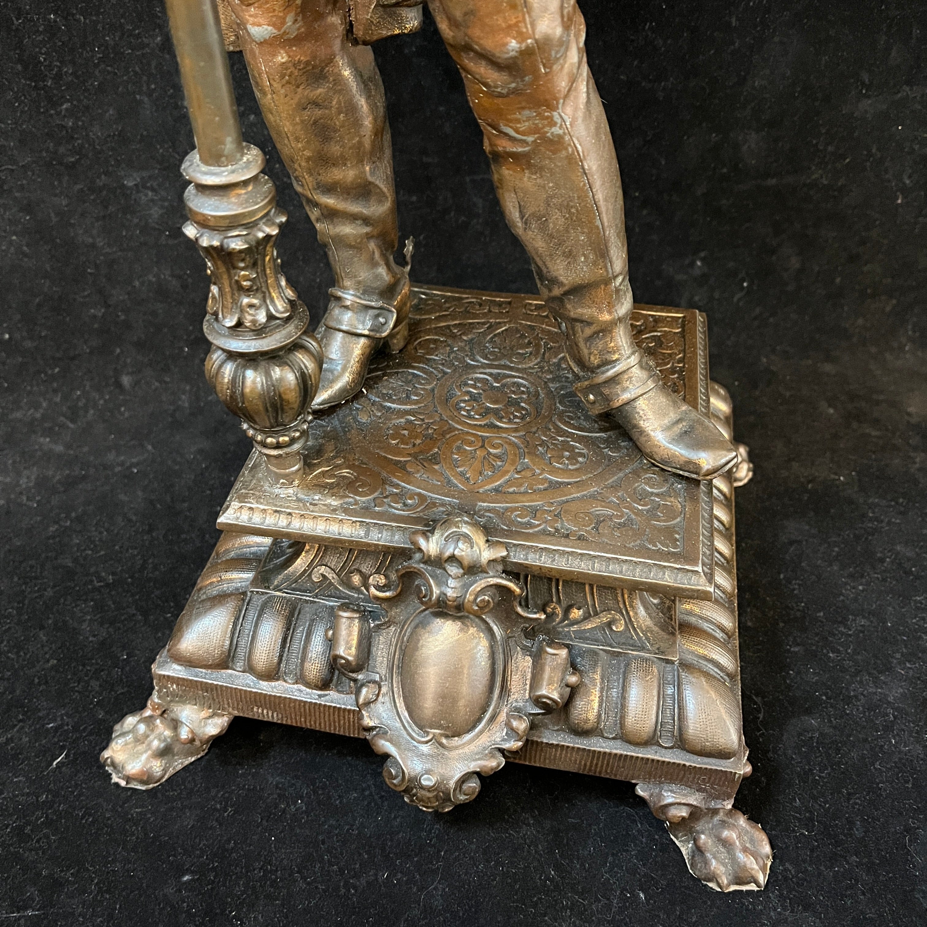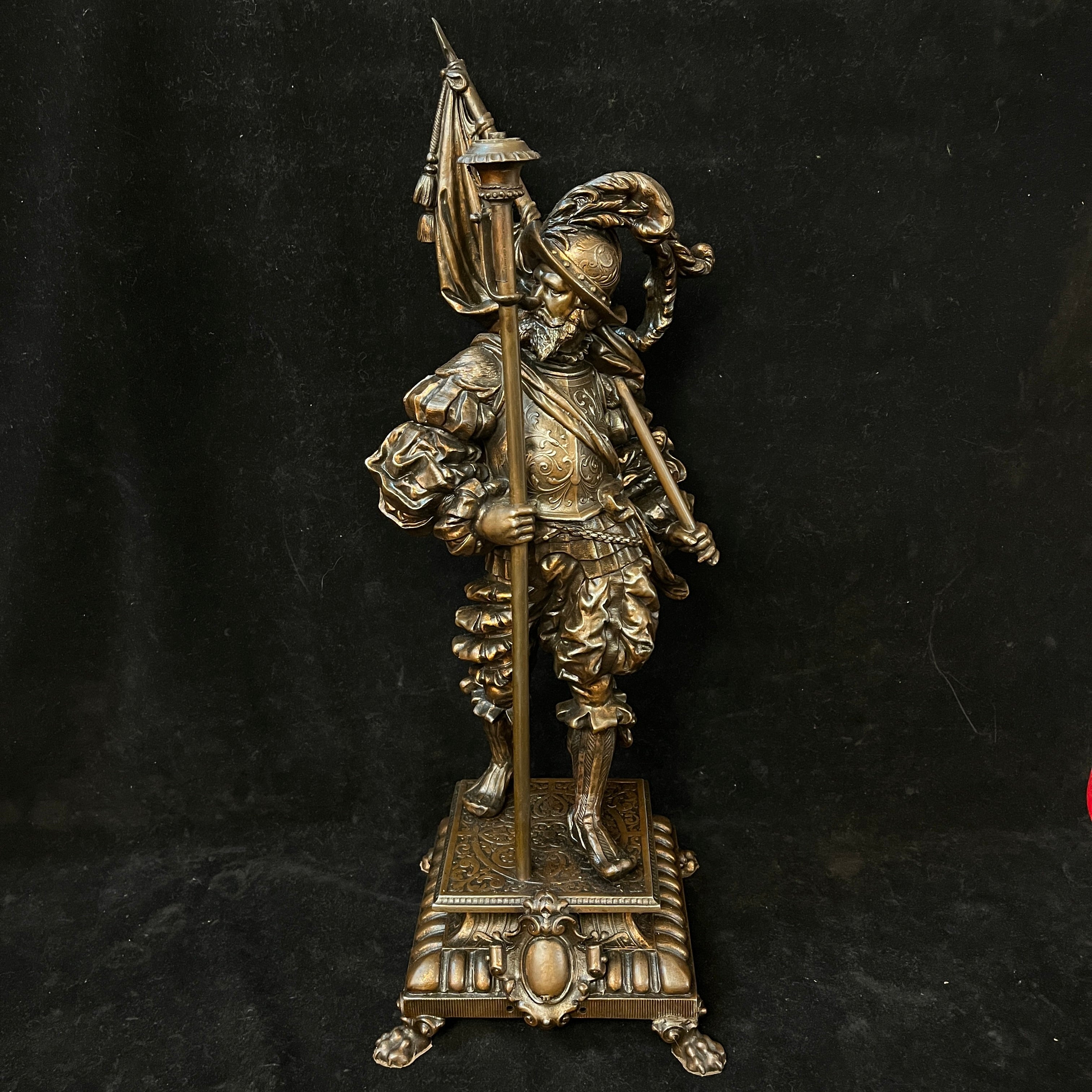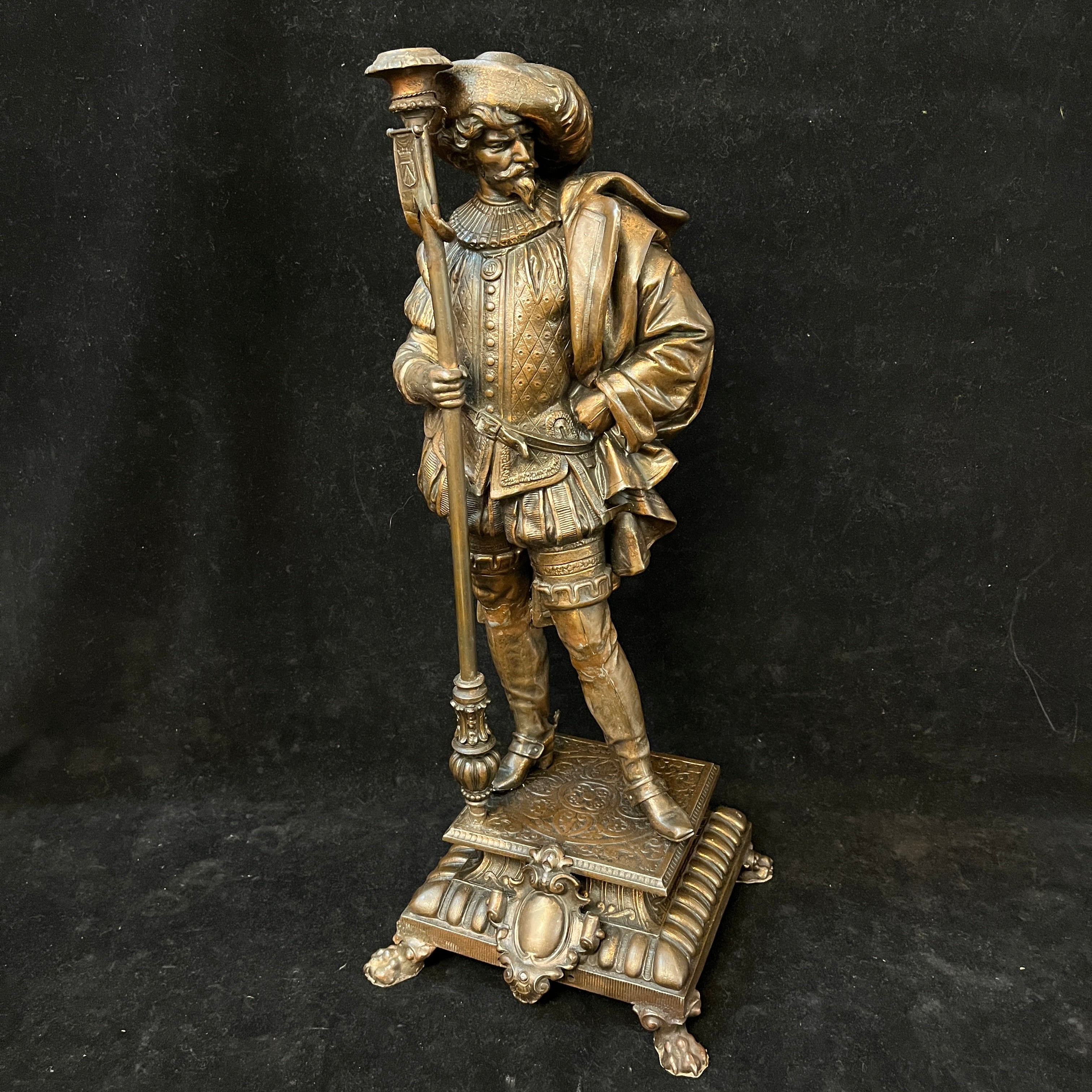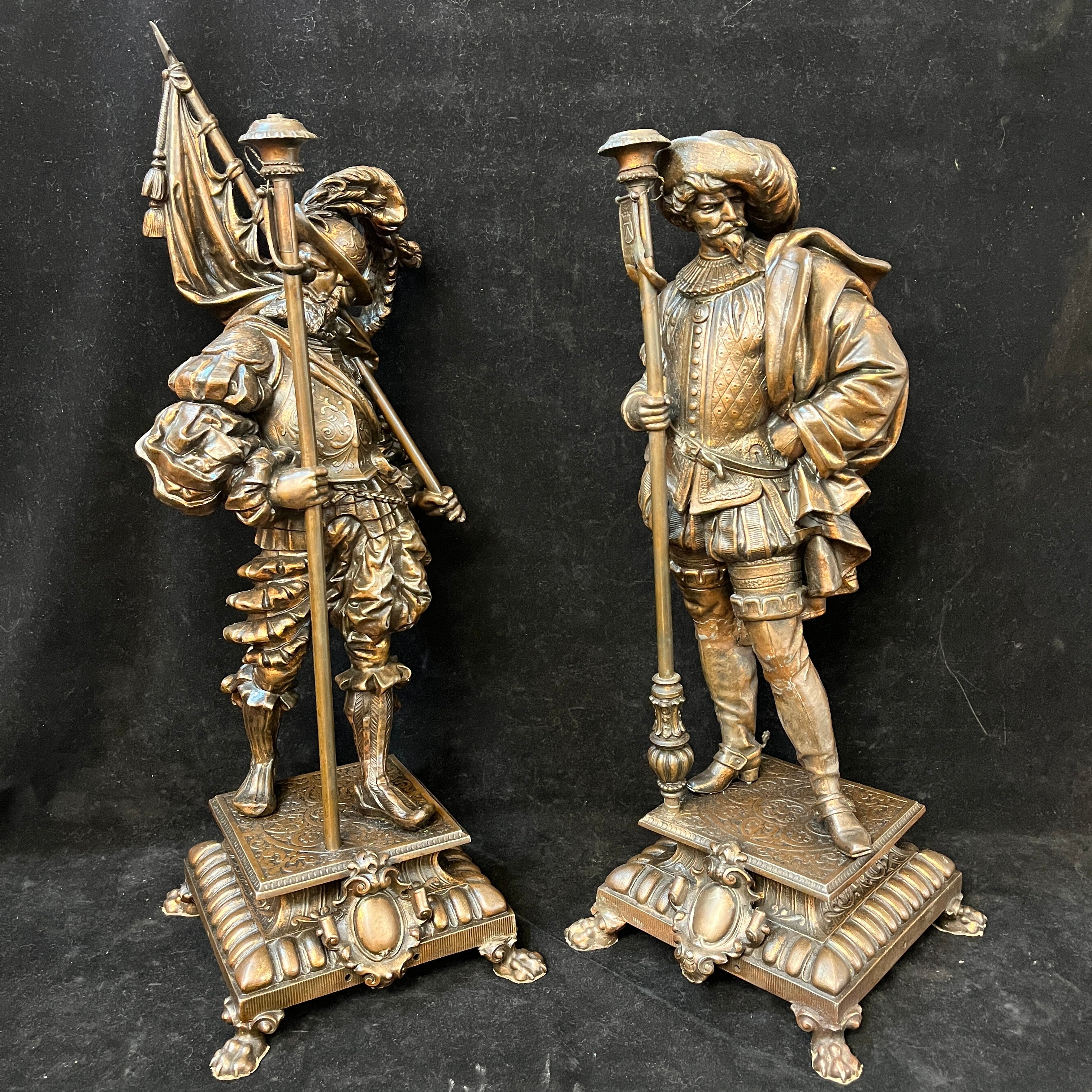 Preciosa pareja de figuras de peltre, antiguamente lámparas de gas, montadas sobre bases cuadradas del mismo metal, con patas de león. Ambas representan soldados de tercio español, con sus respectivas vestiduras, armas y armaduras. Francia, principios s.XX.