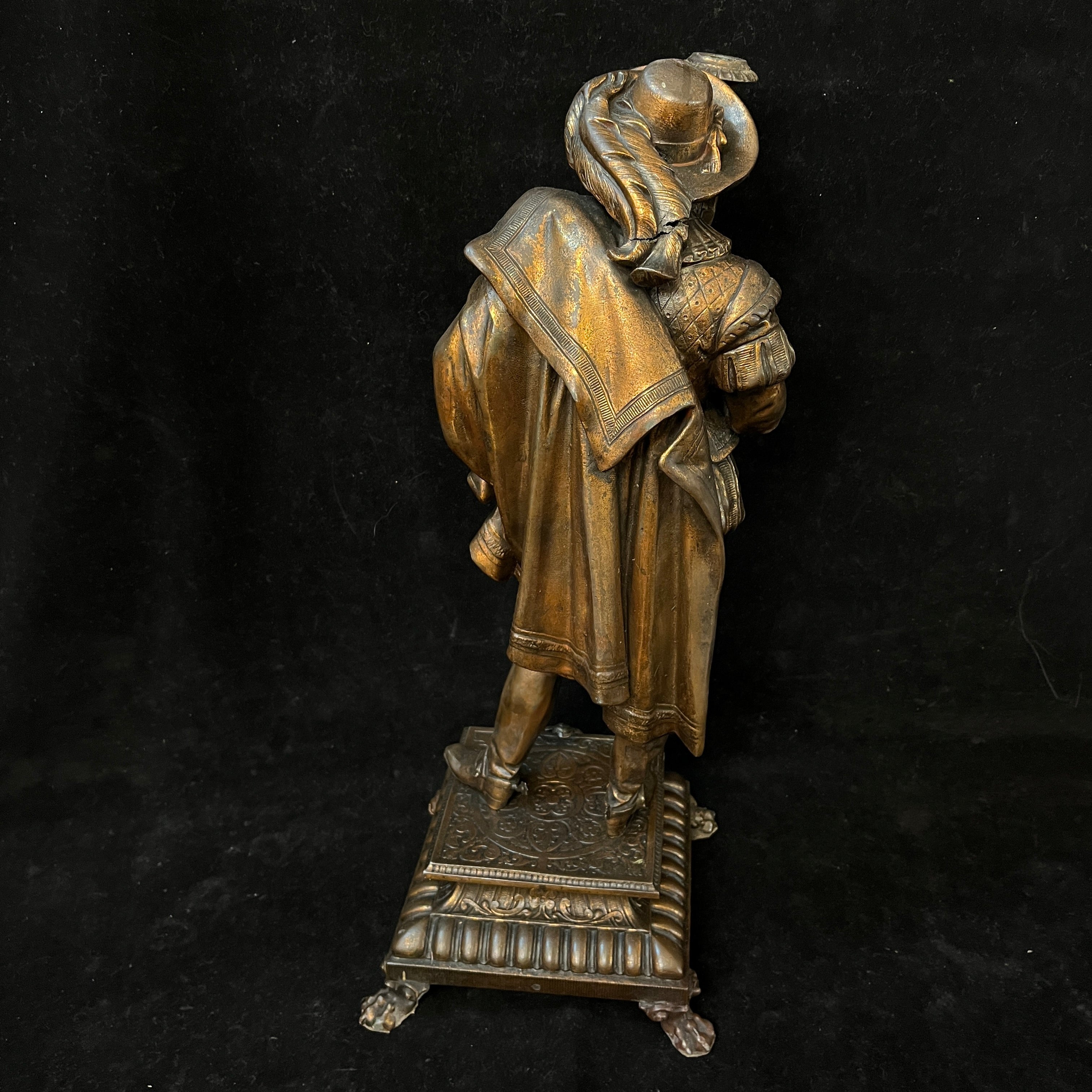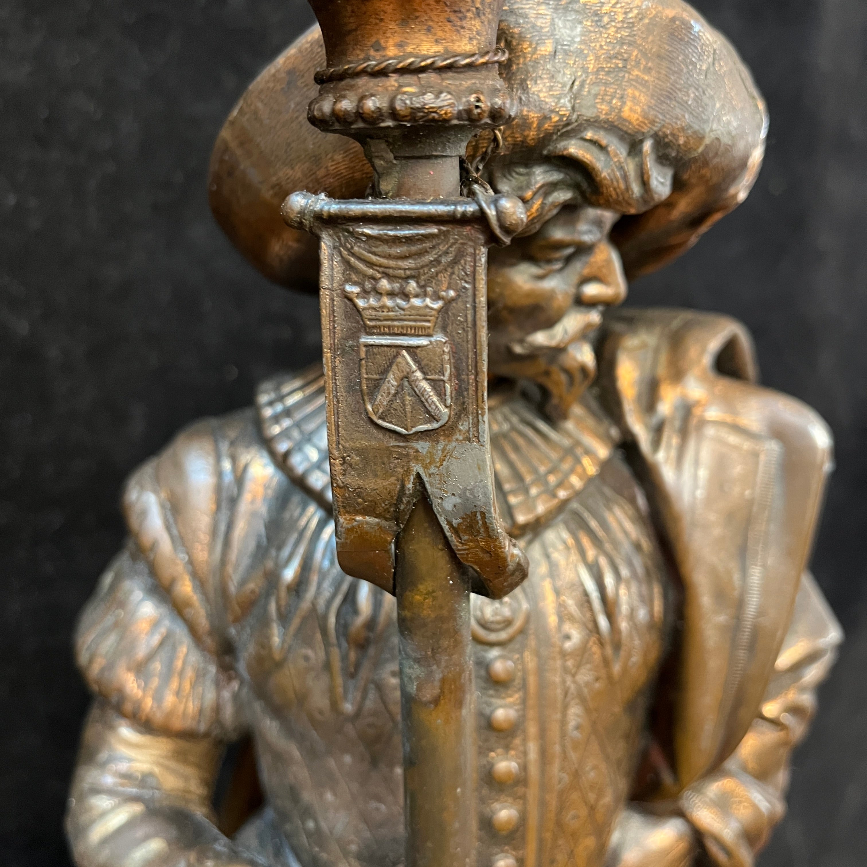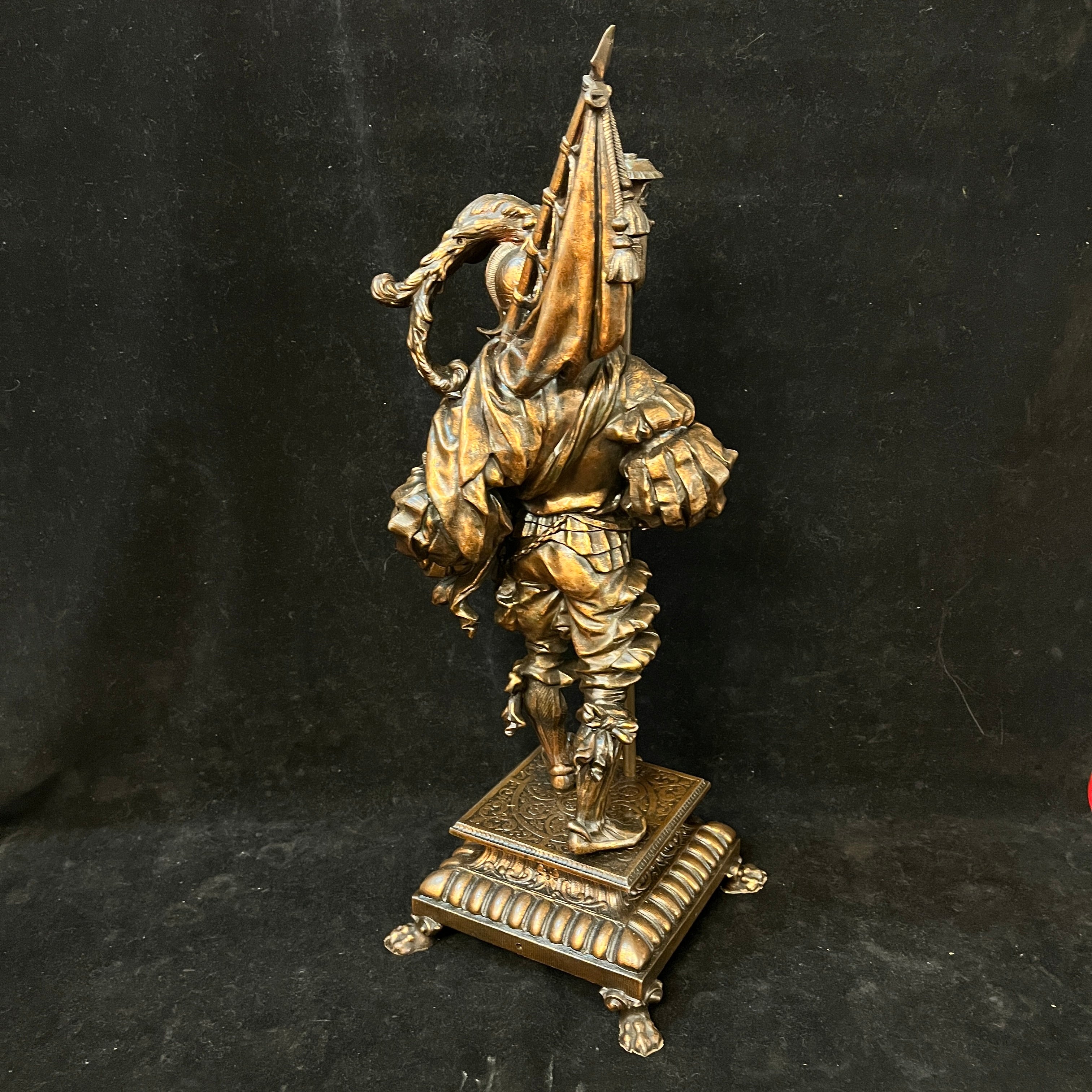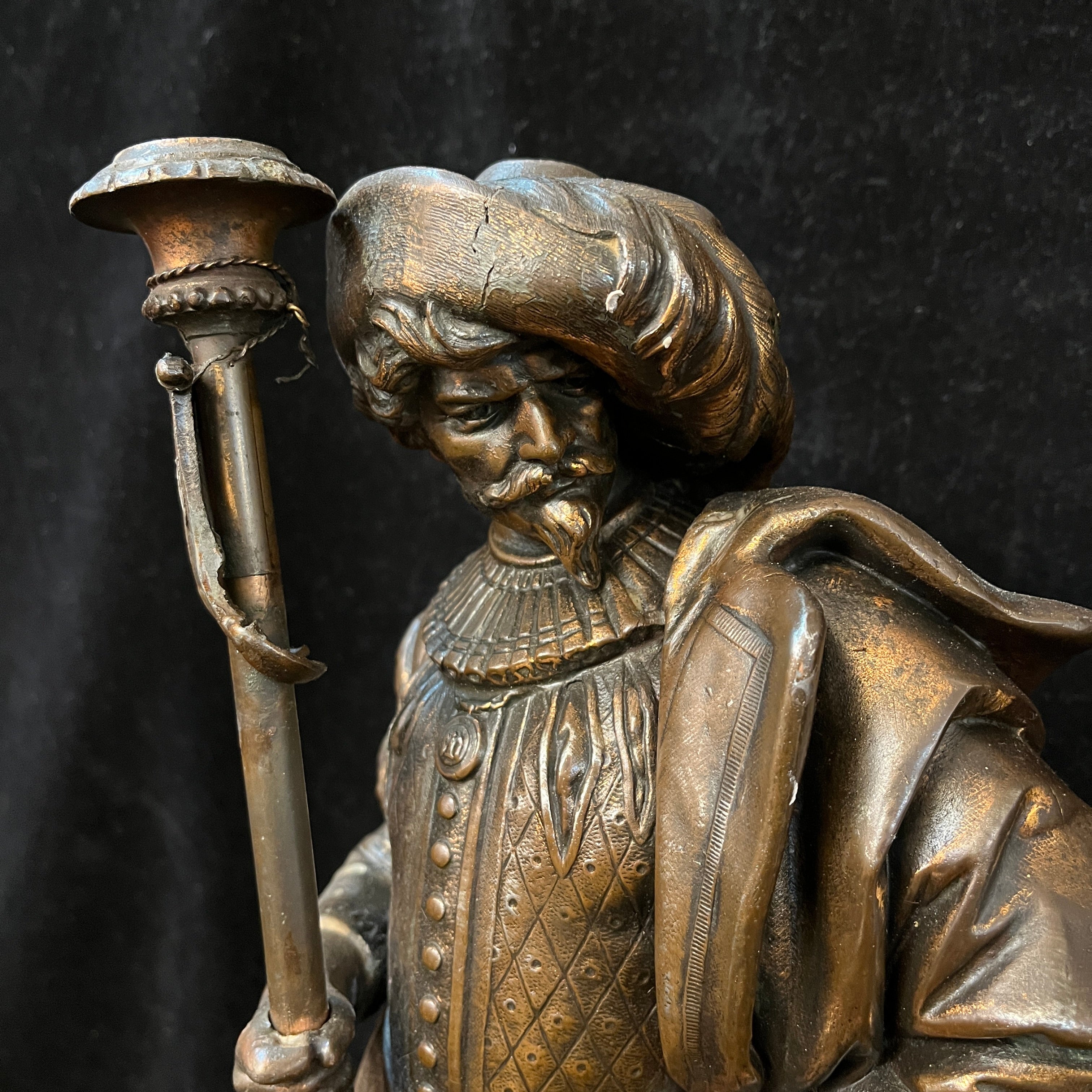Preciosa pareja de figuras de peltre, antiguamente lámparas de gas, montadas sobre bases cuadradas del mismo metal, con patas de león. Ambas representan soldados de tercio español, con sus respectivas vestiduras, armas y armaduras. Francia, principios s.XX.