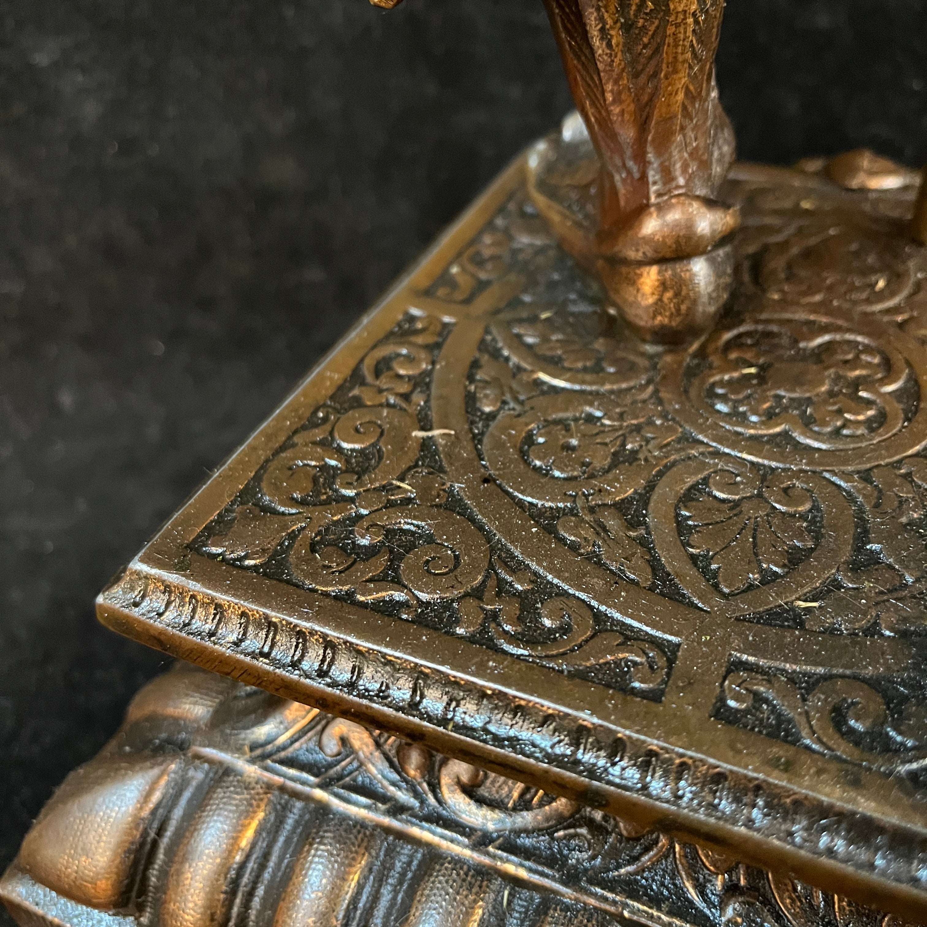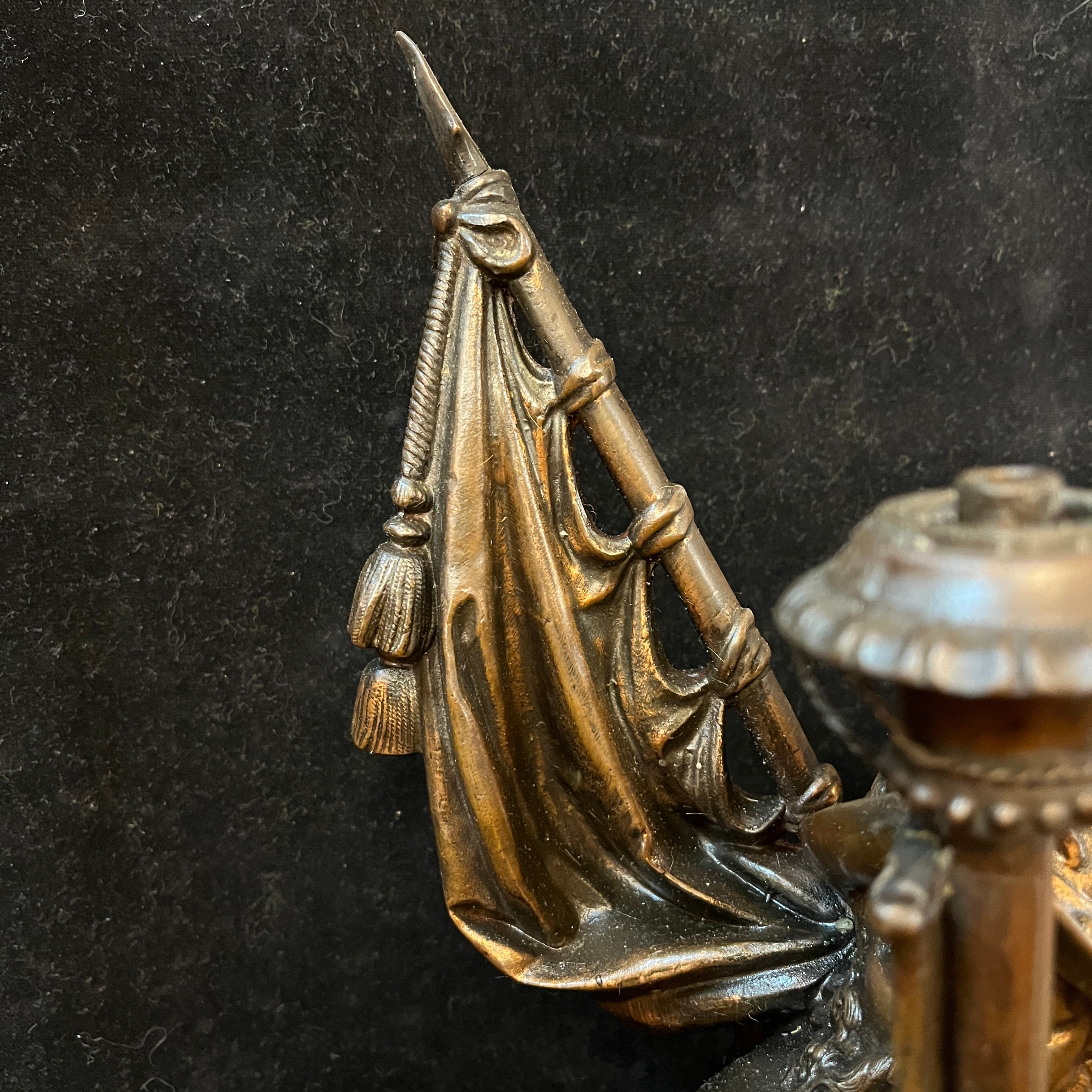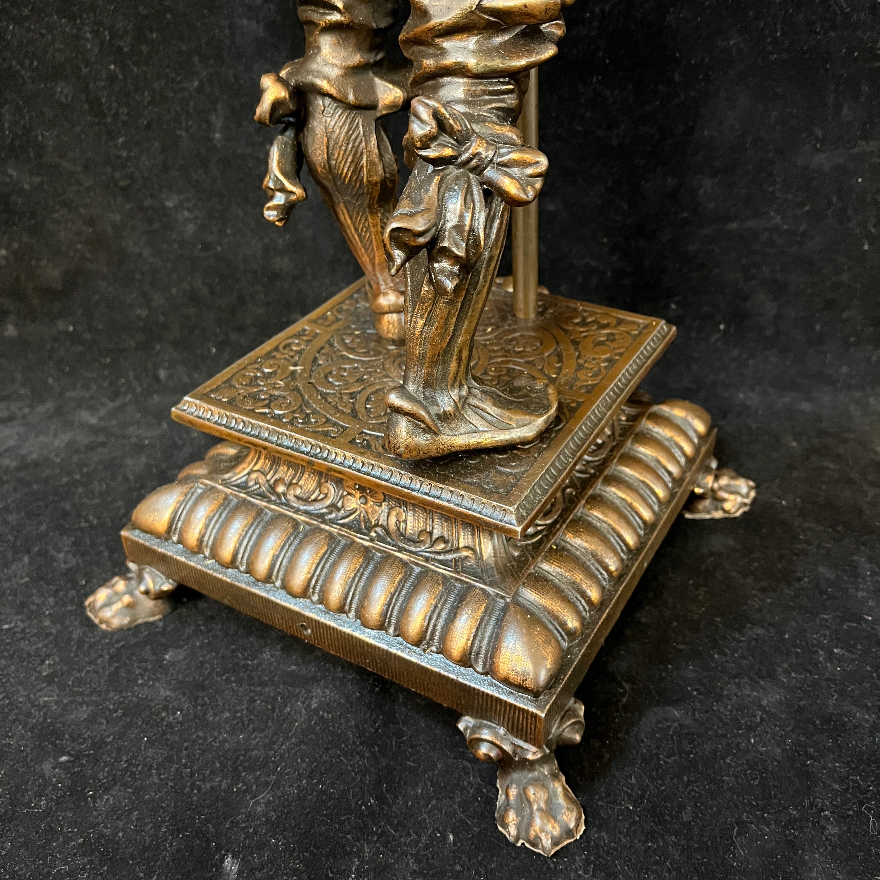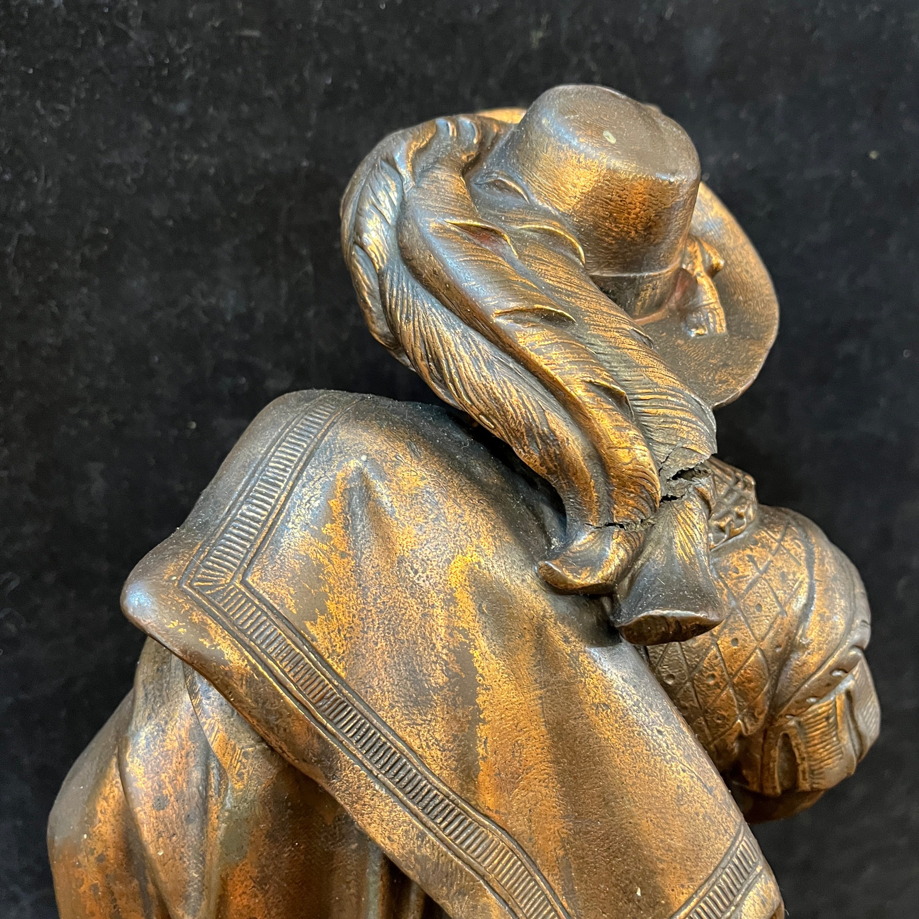 Preciosa pareja de figuras de peltre, antiguamente lámparas de gas, montadas sobre bases cuadradas del mismo metal, con patas de león. Ambas representan soldados de tercio español, con sus respectivas vestiduras, armas y armaduras. Francia, principios s.XX.