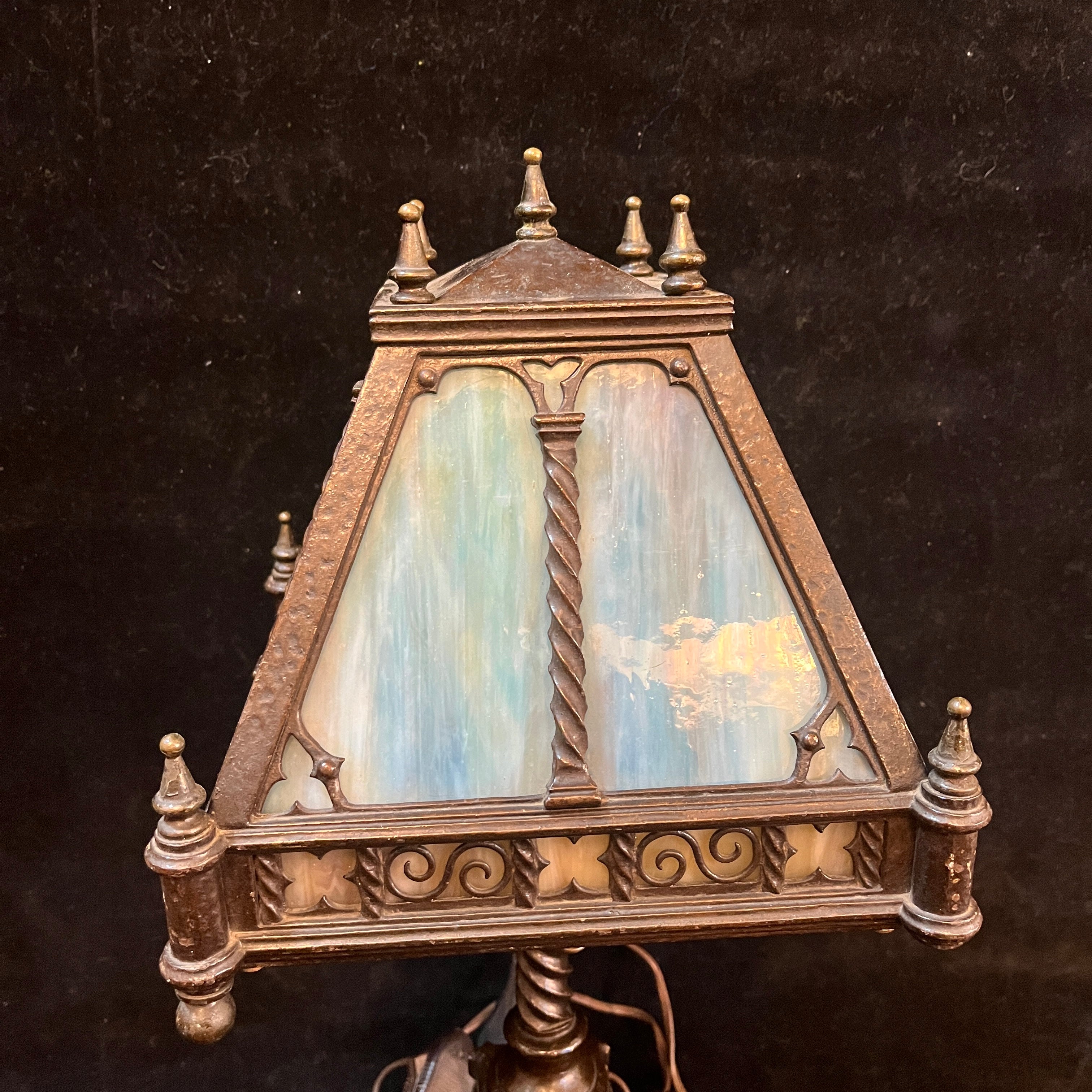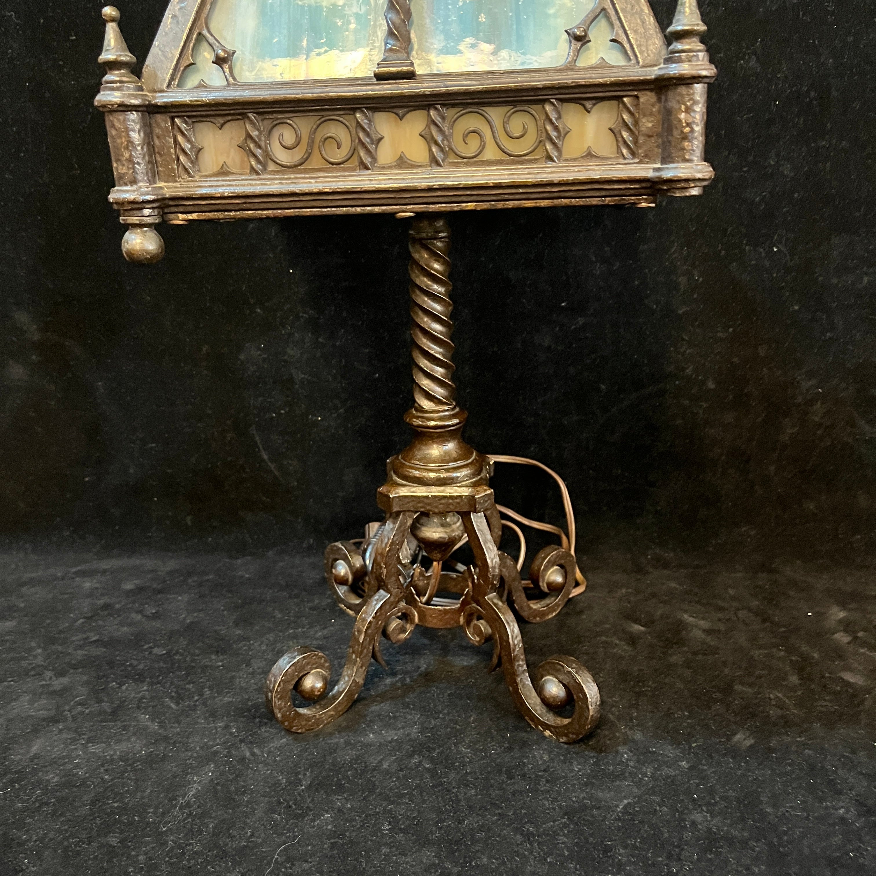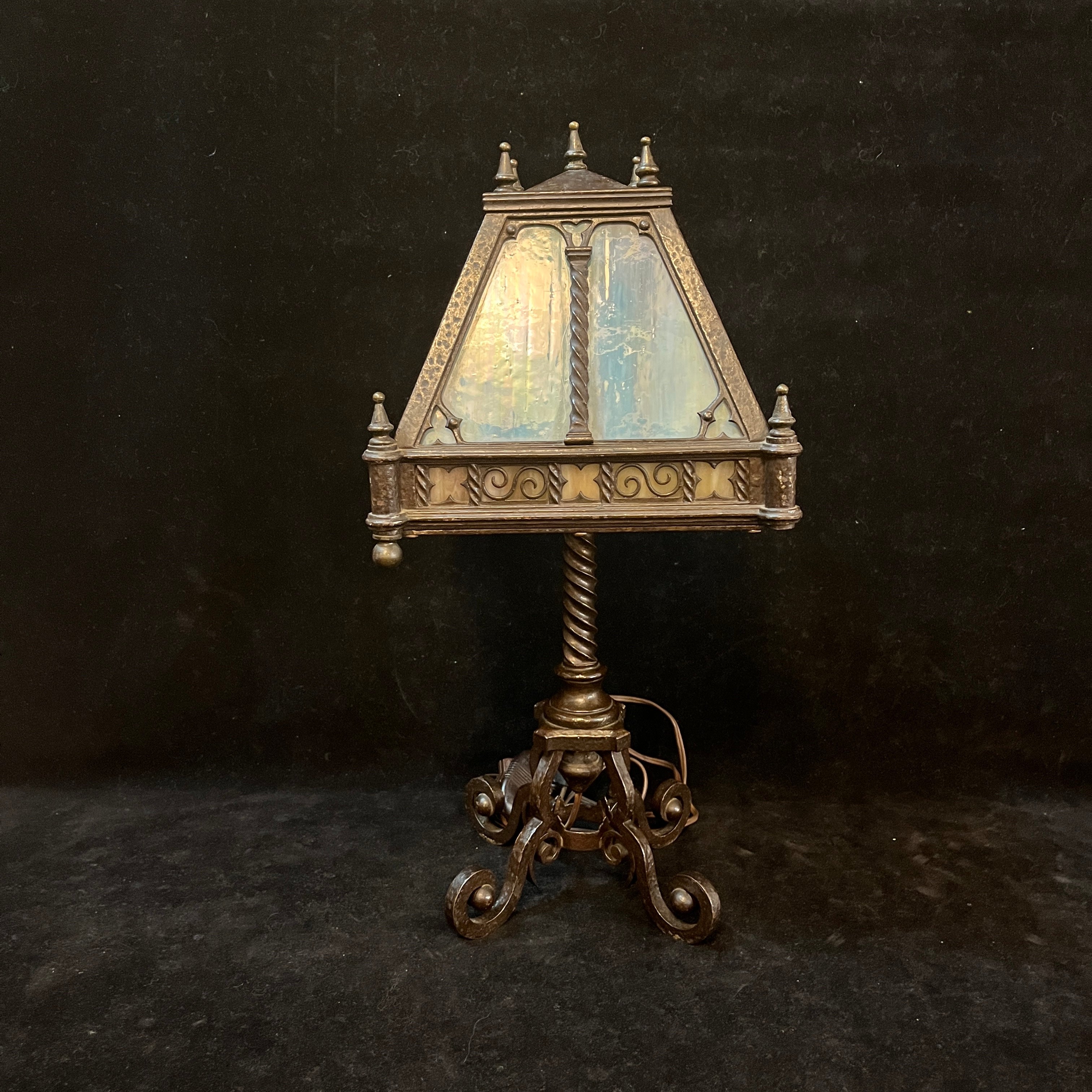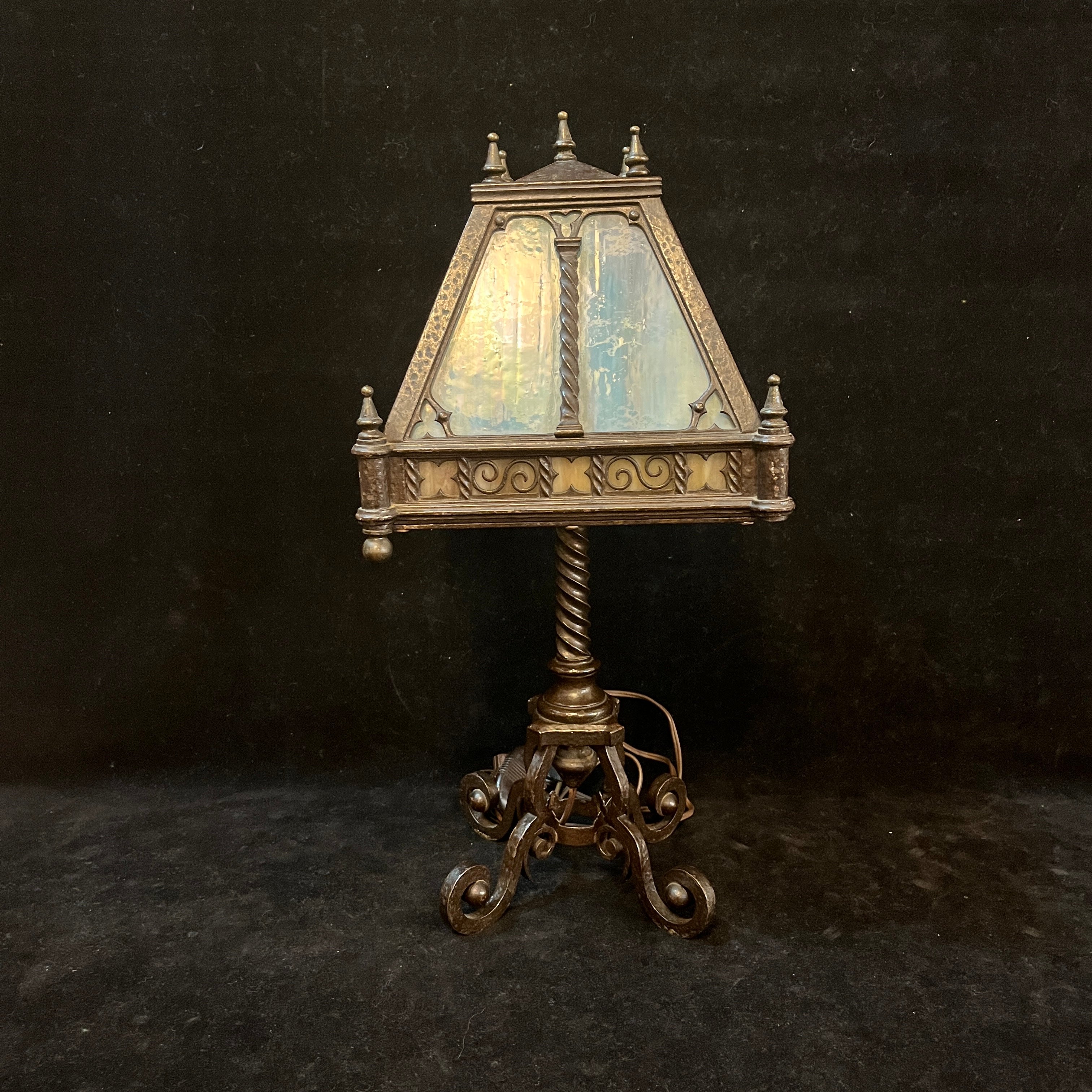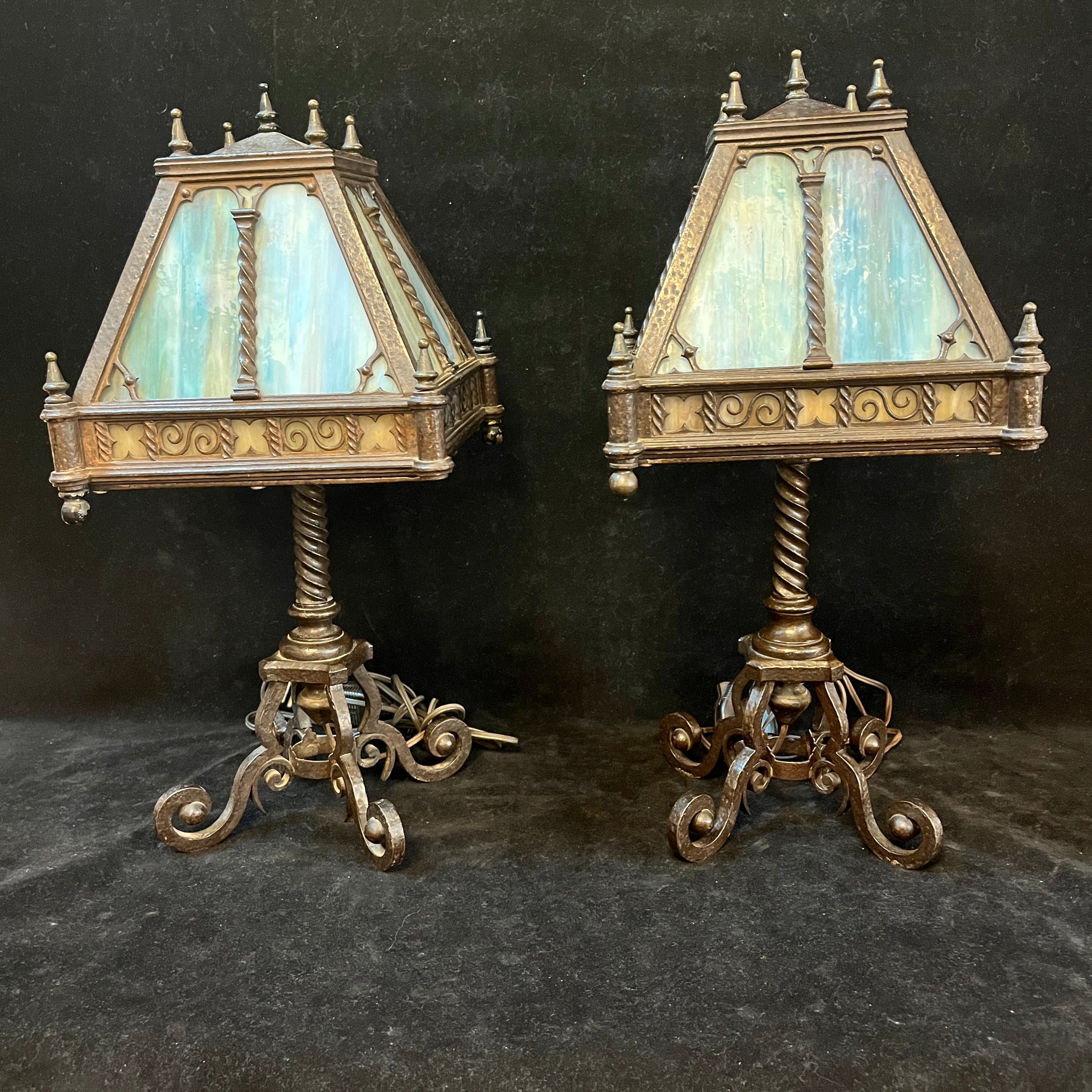 Elegante juego de dos lámparas de fierro forjado, de origen alemán, con pantalla en estilo de Ópalo, en tonos celestes, verdes y morados. Las piezas tienen bellos decorados en su pantalla y unas patas forjadas en curvas.