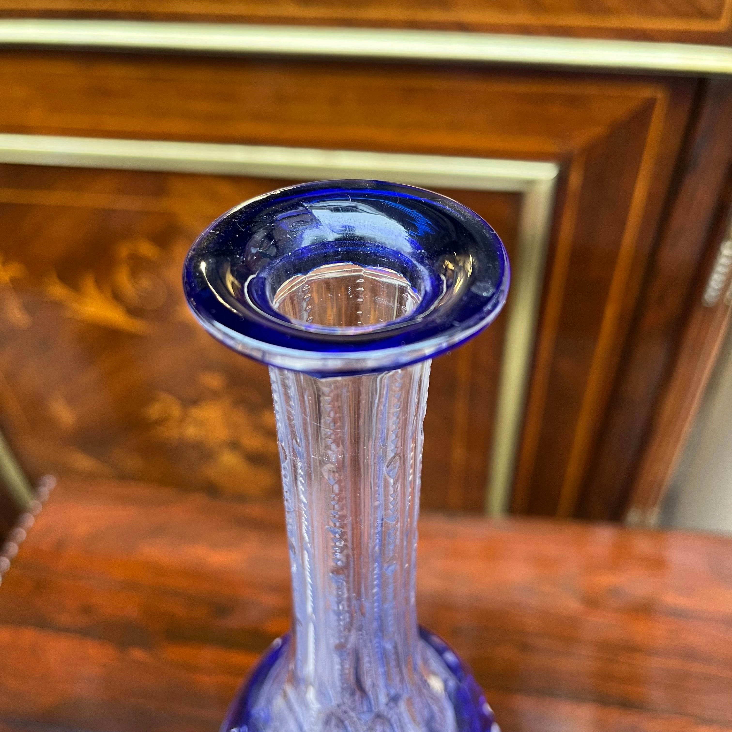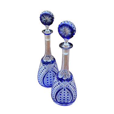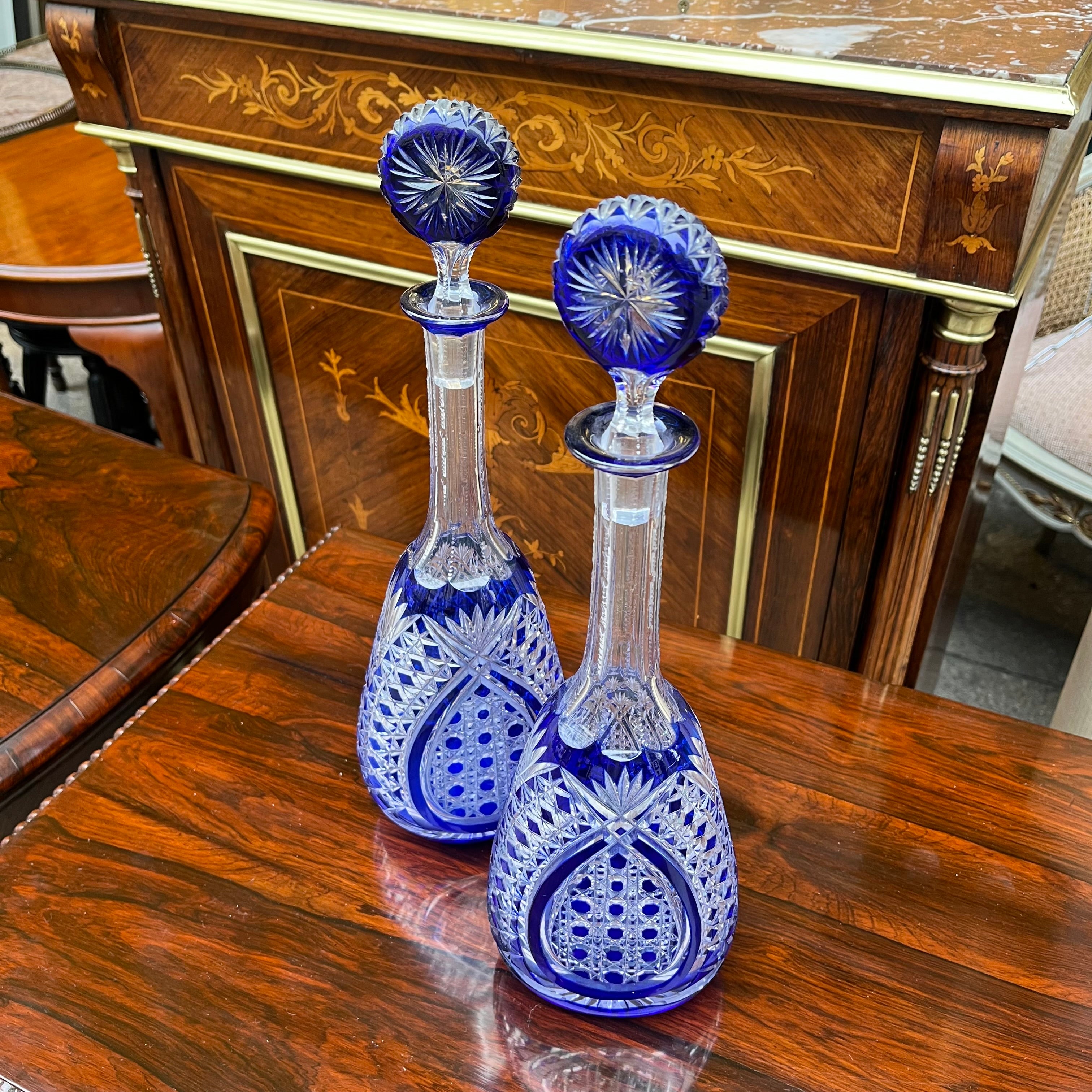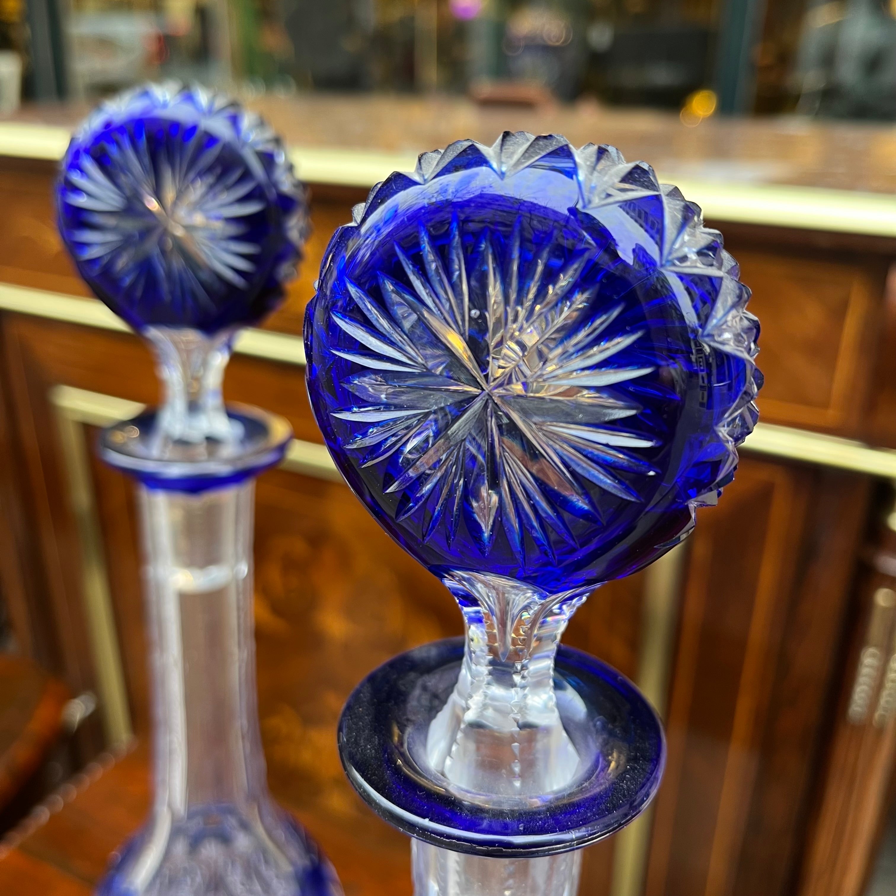 Une belle paire de bouteilles, d'origine européenne, en cristal bleu moulé. De style bohème, elles présentent un fin motif géométrique sculpté, un long col aux bords sculptés et un couvercle rond en verre orné d'un motif floral.