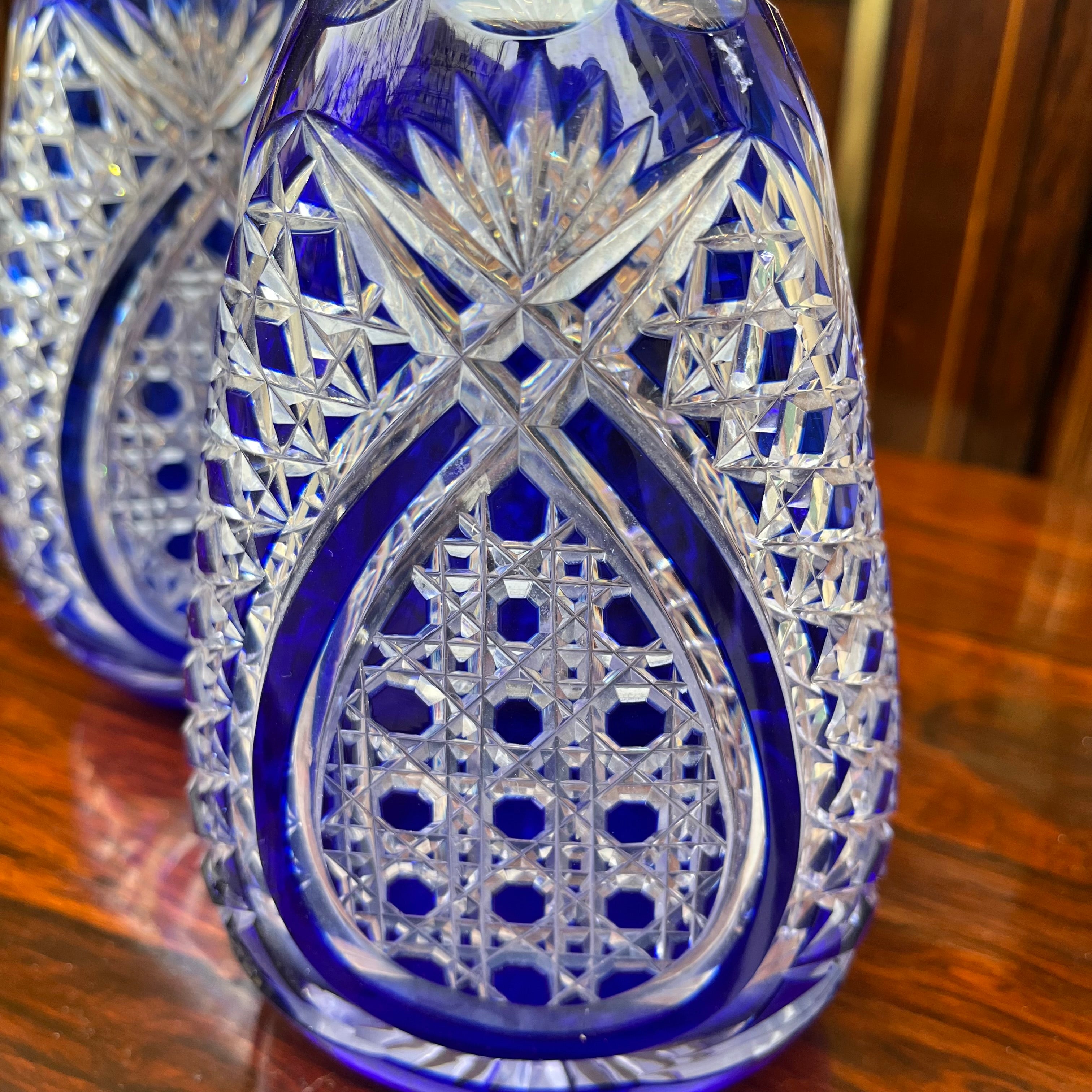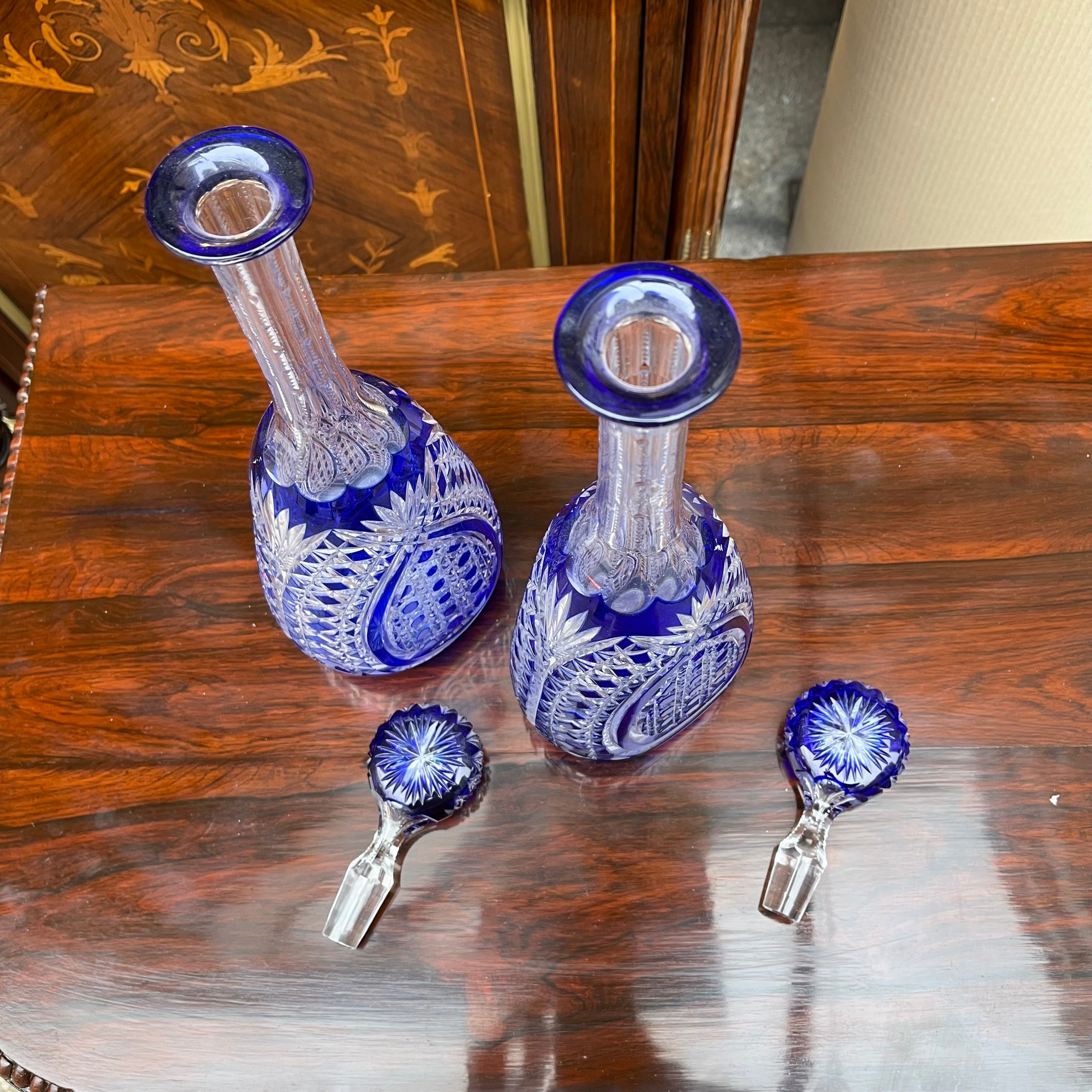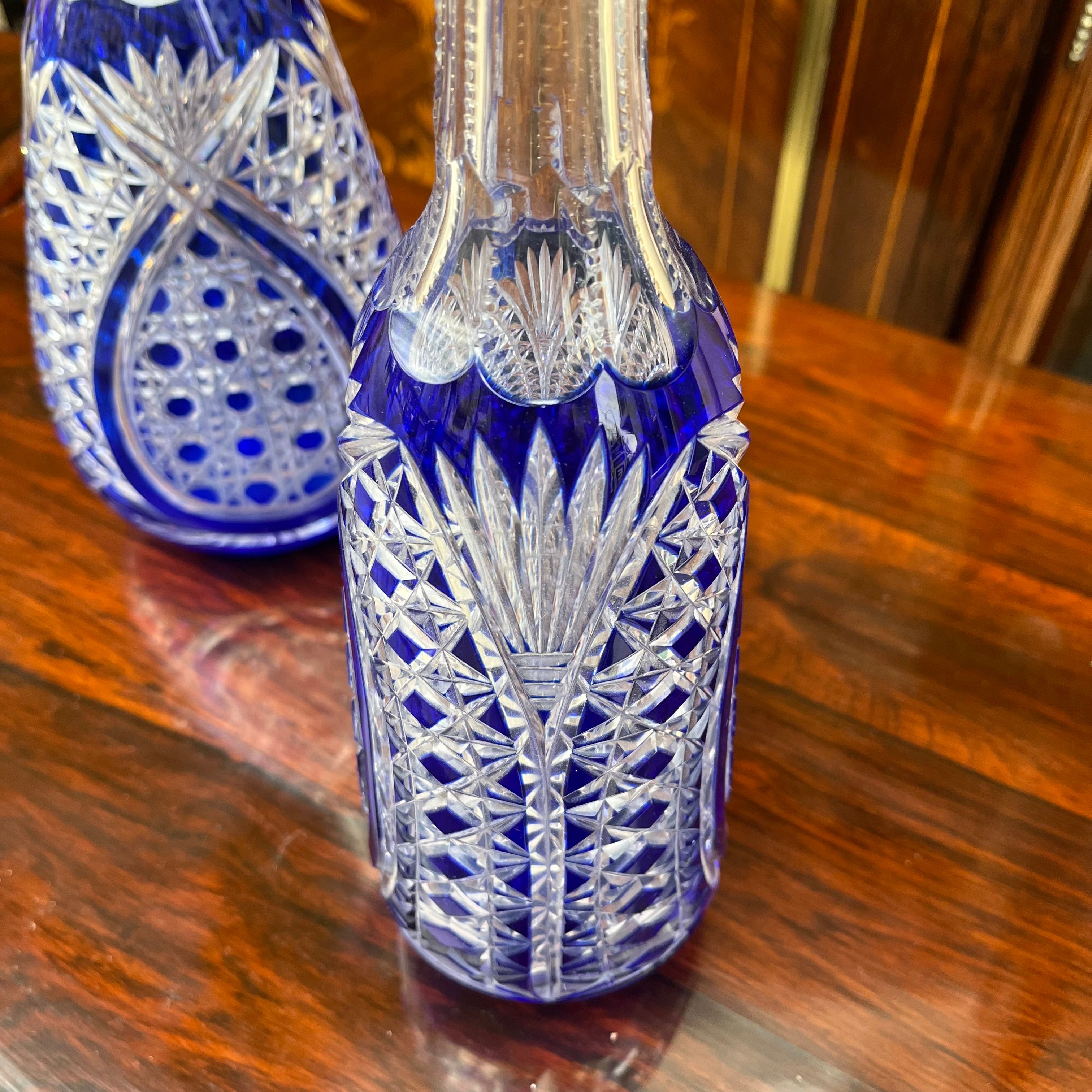 Une belle paire de bouteilles, d'origine européenne, en cristal bleu moulé. De style bohème, elles présentent un fin motif géométrique sculpté, un long col aux bords sculptés et un couvercle rond en verre orné d'un motif floral.
