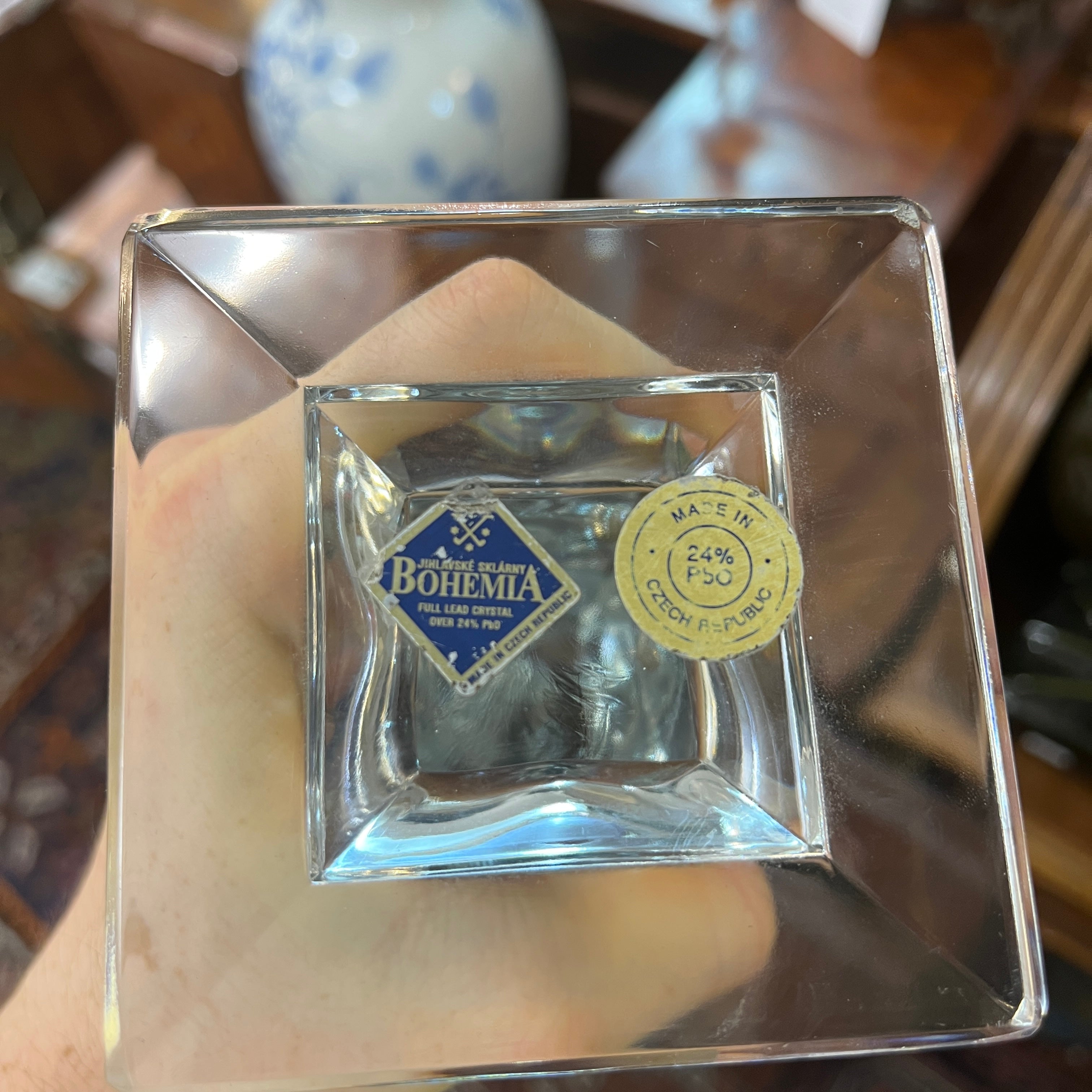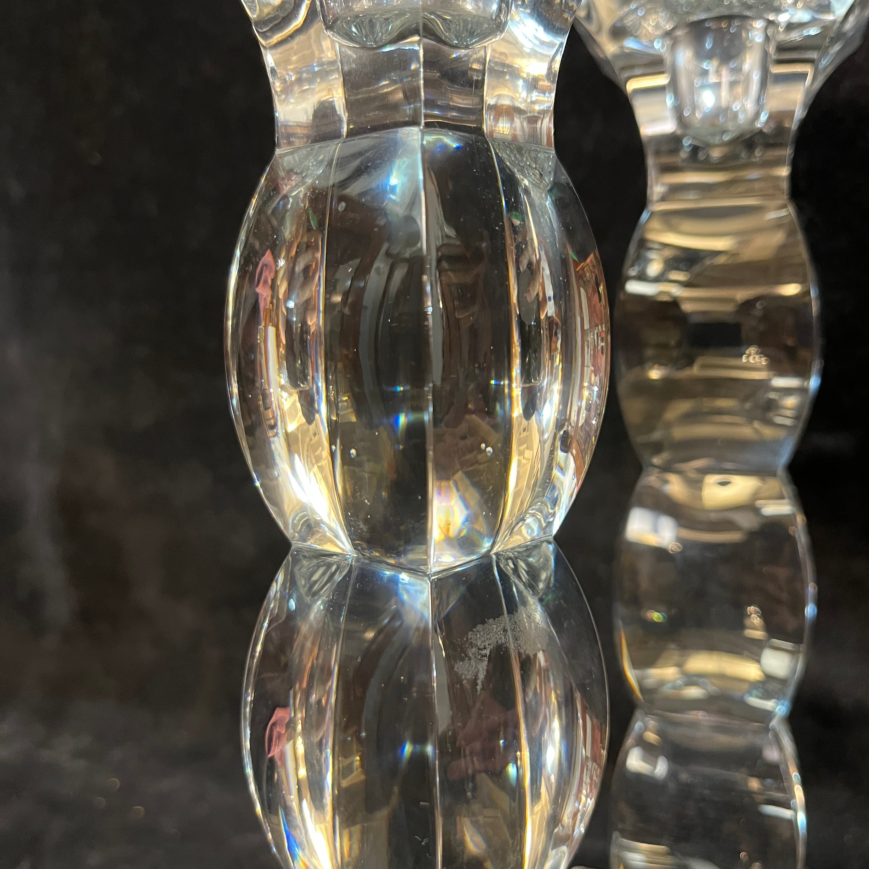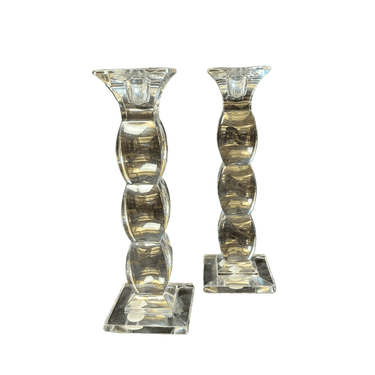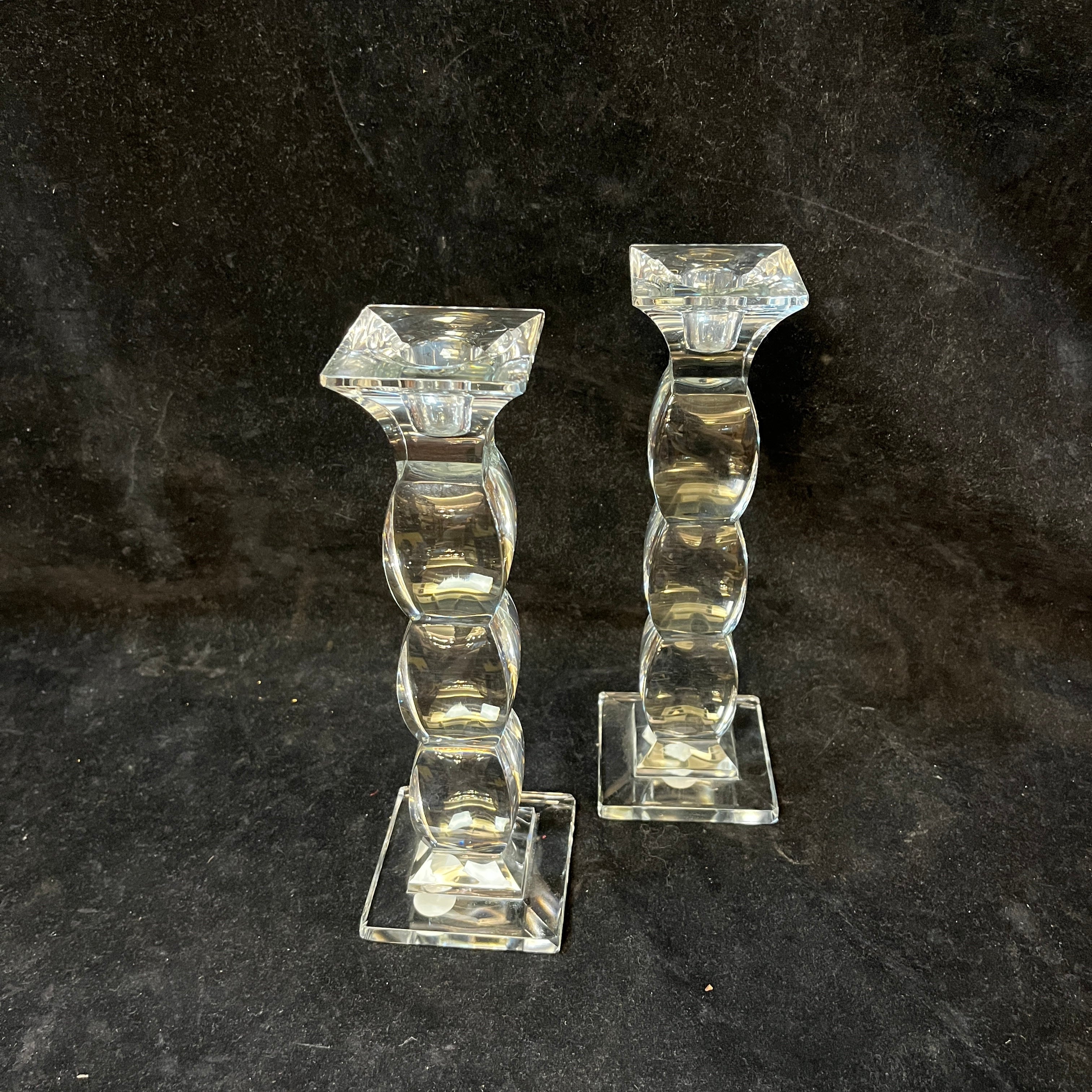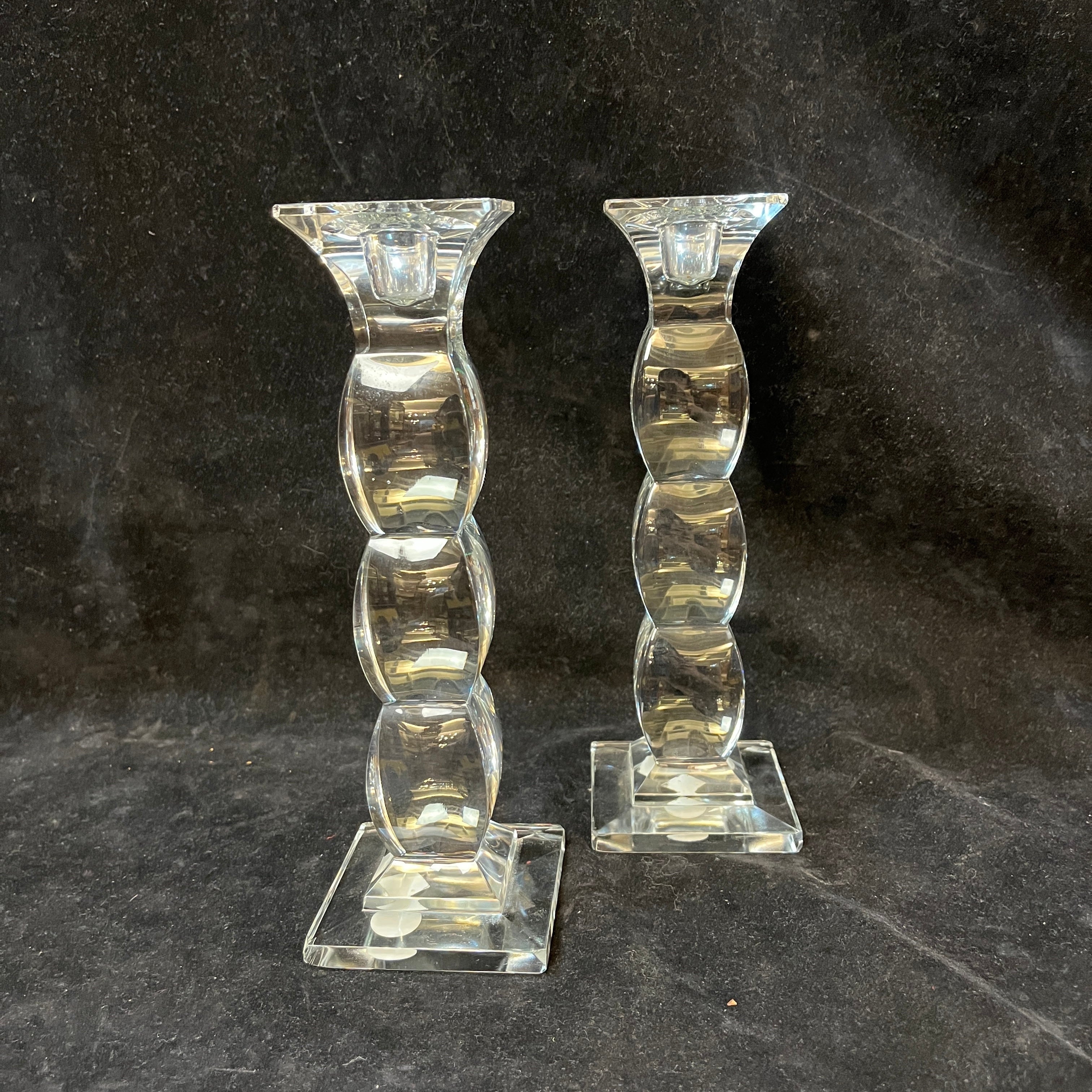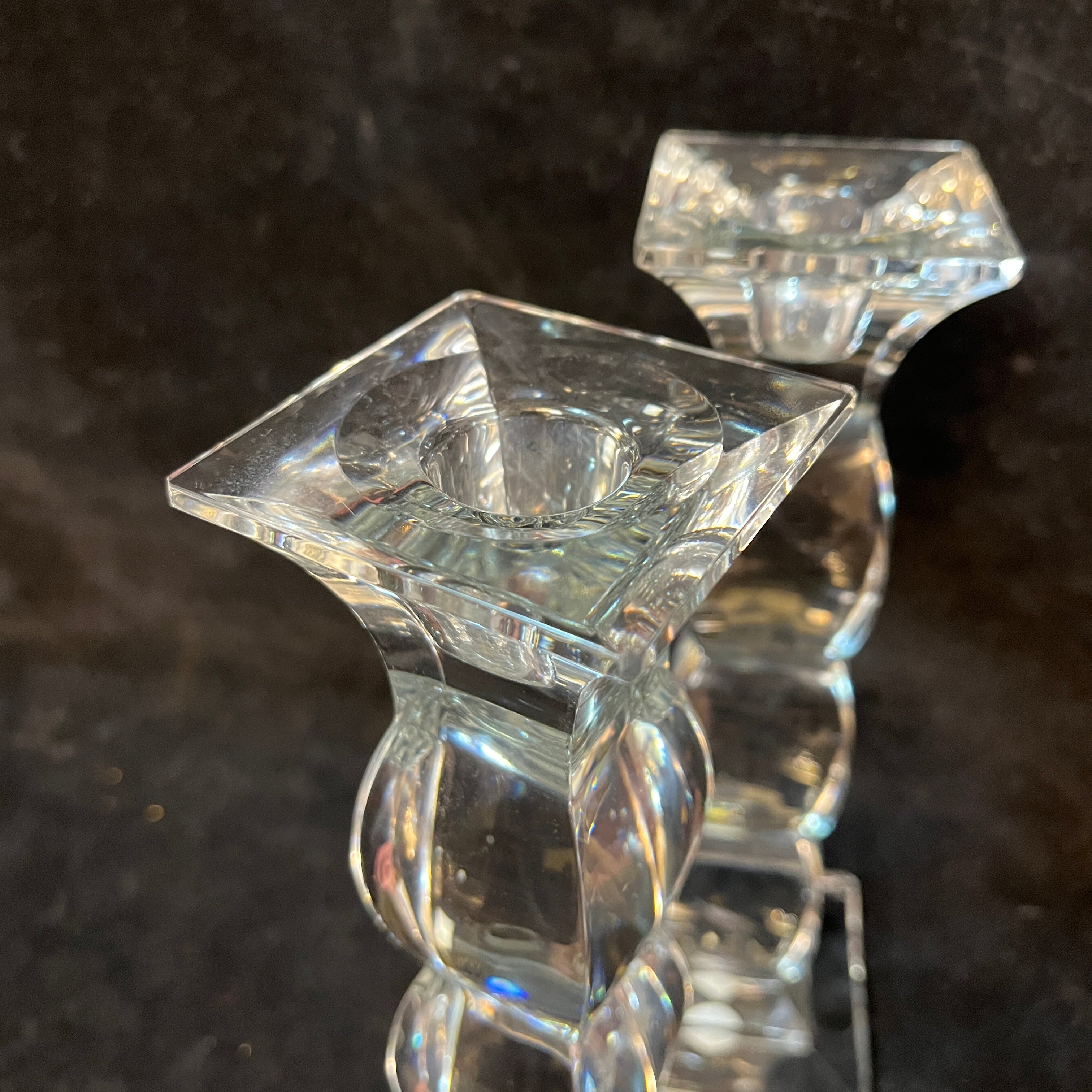 Bellísima pareja de candelabros de origen checo, hechos de cristal de Bohemia, con un diseño curvo en su cuerpo, terminando en extremos cuadrados, tanto en su base como en el portavelas. En su base encuentran los sellos de fabricación checa.