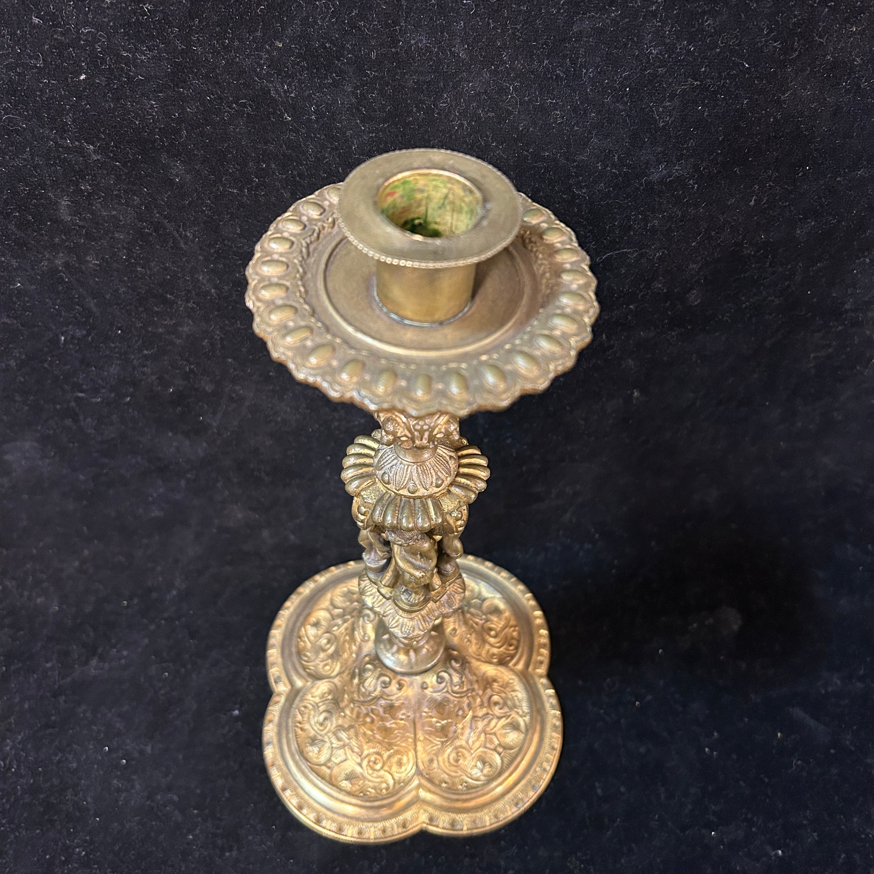Pareja de bellos candelabros rusos en bronce, con mangos con relieves detallados y figuras talladas con motivos de de femineidad y cosecha.